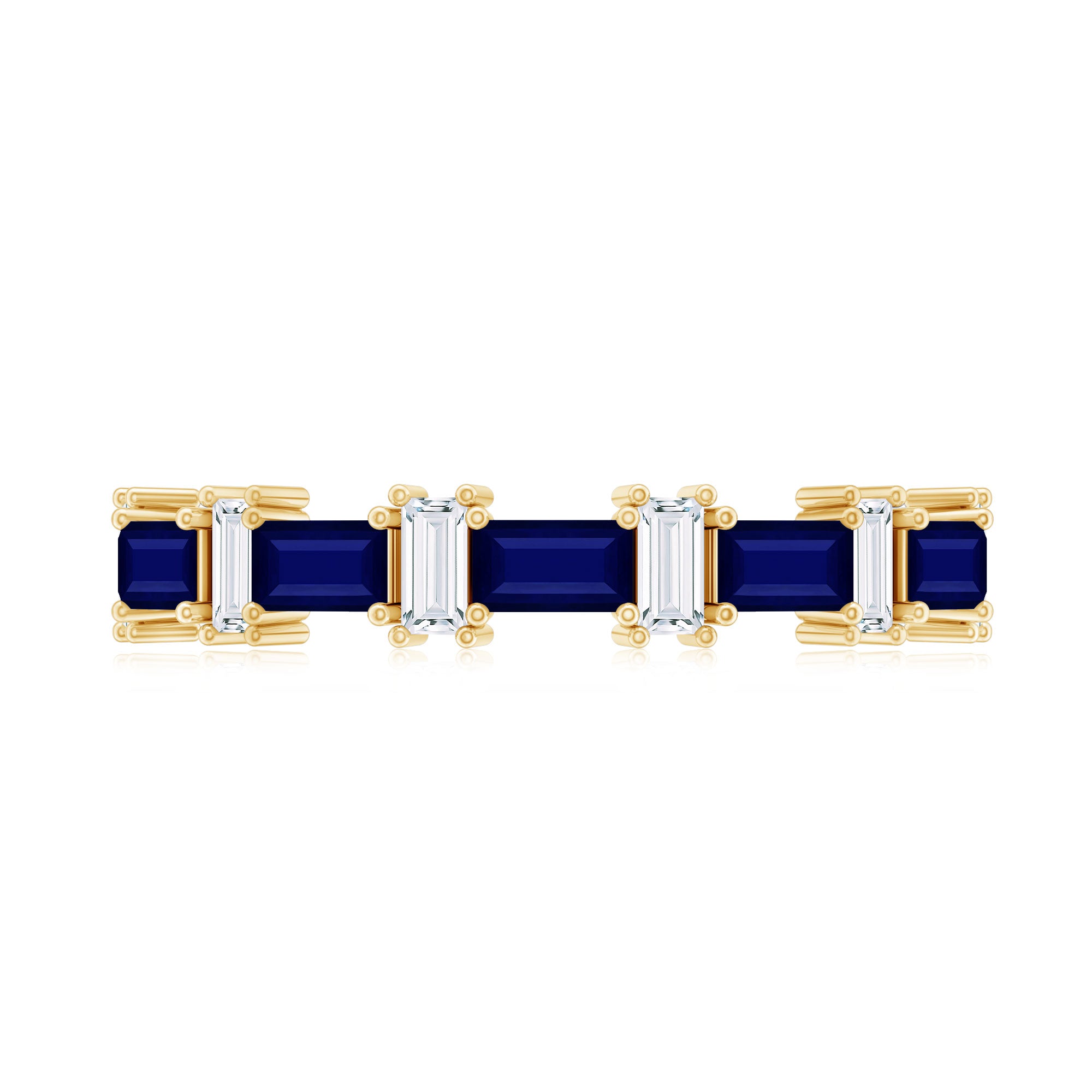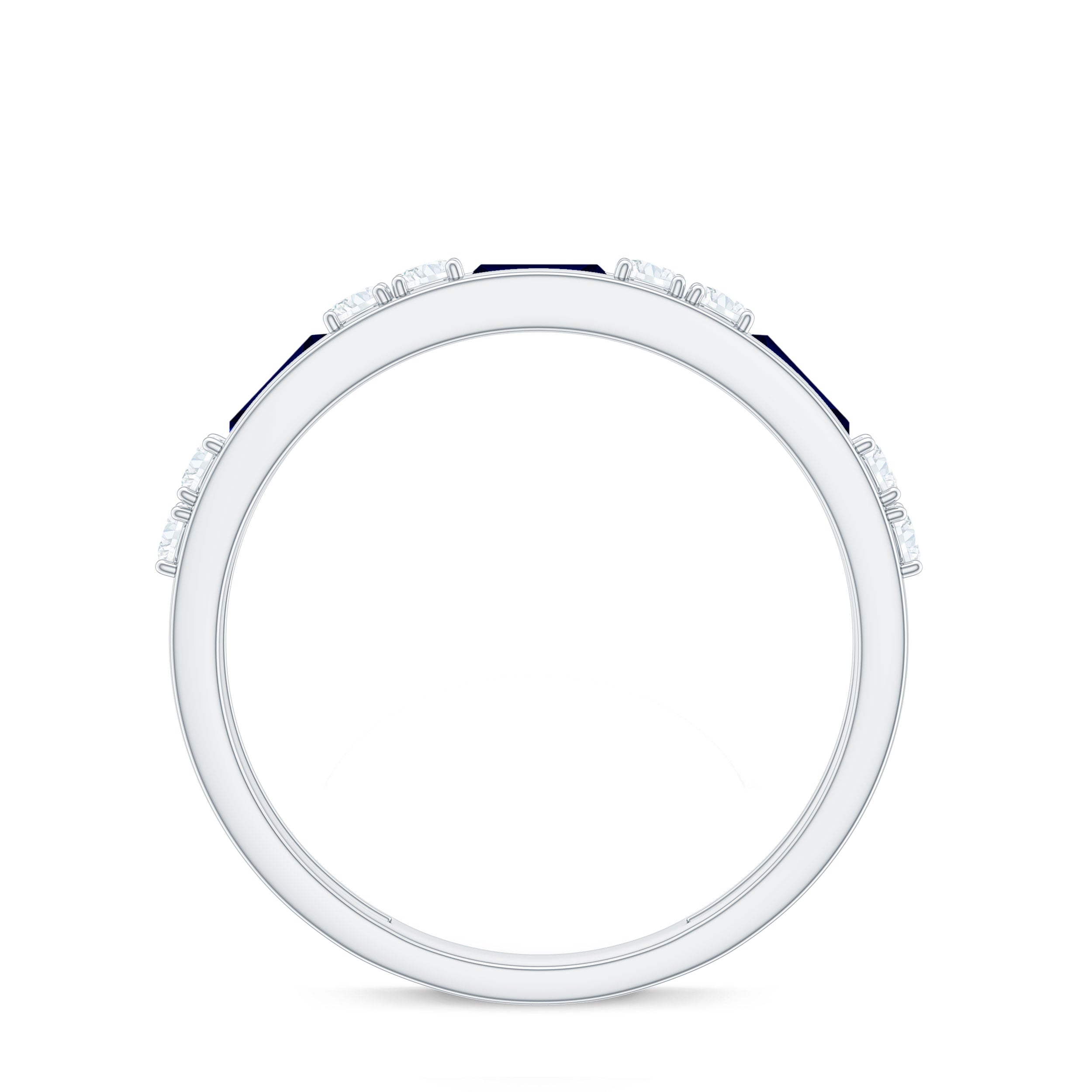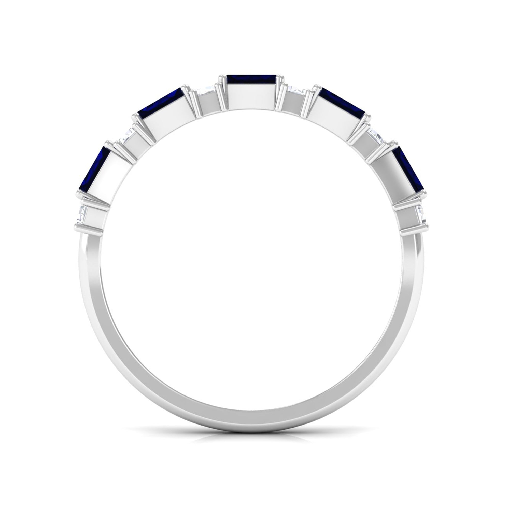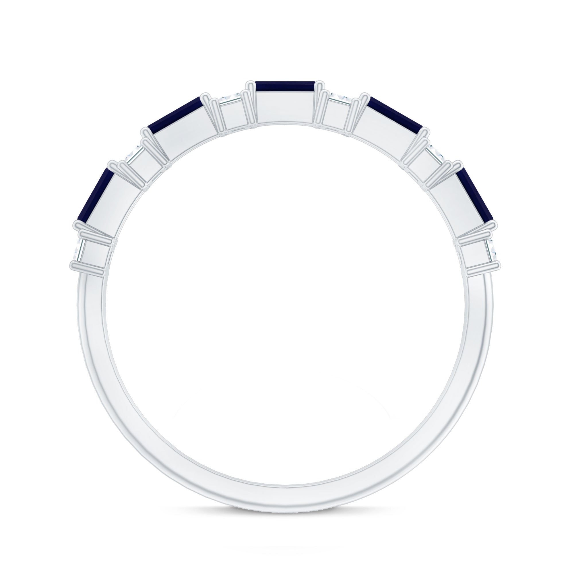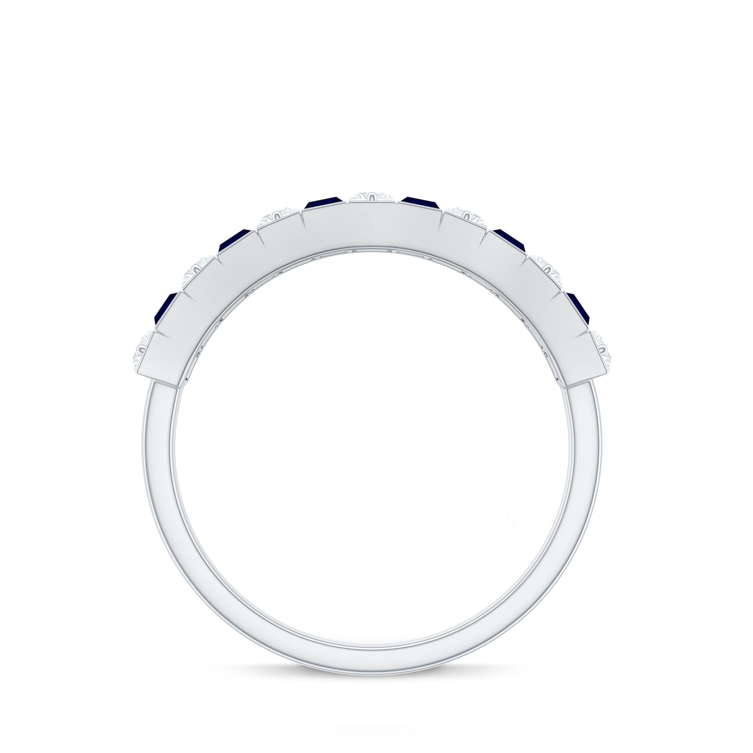 East to West eternity bands have stones arranged horizontally, often used for elongated shapes like emerald, radiant, or pear-cut stones.