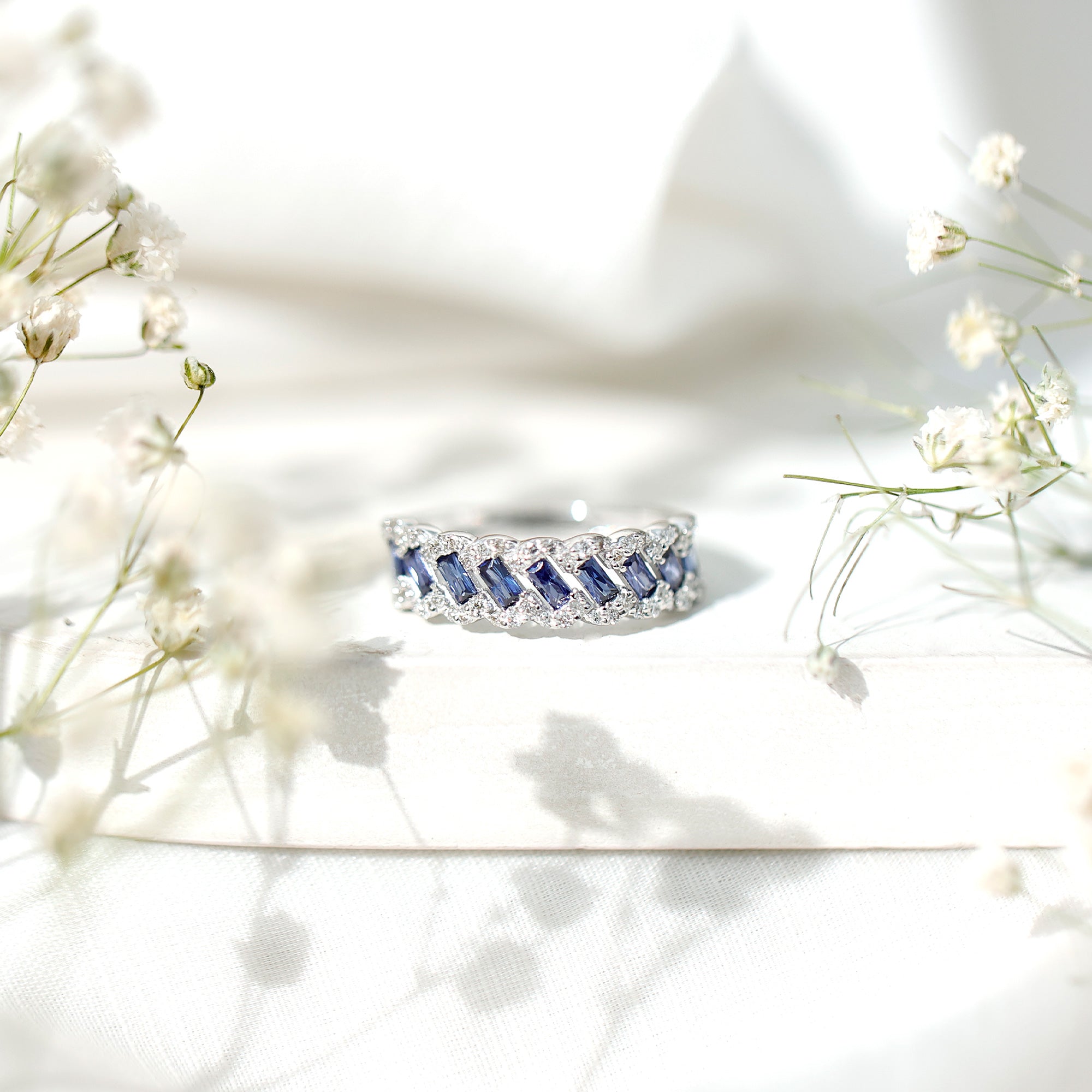 Eternity rings often have more gemstones, though they're smaller than those in typical engagement rings. Surprisingly, they may not always be more expensive. The cost depends on factors like size, weight, cut, and carat of the diamond and colored gemstone, which can be adjusted to fit your budget. You have the flexibility to decide how much you want to spend on an eternity ring, whether it's comparable to a solitaire or more budget-friendly.