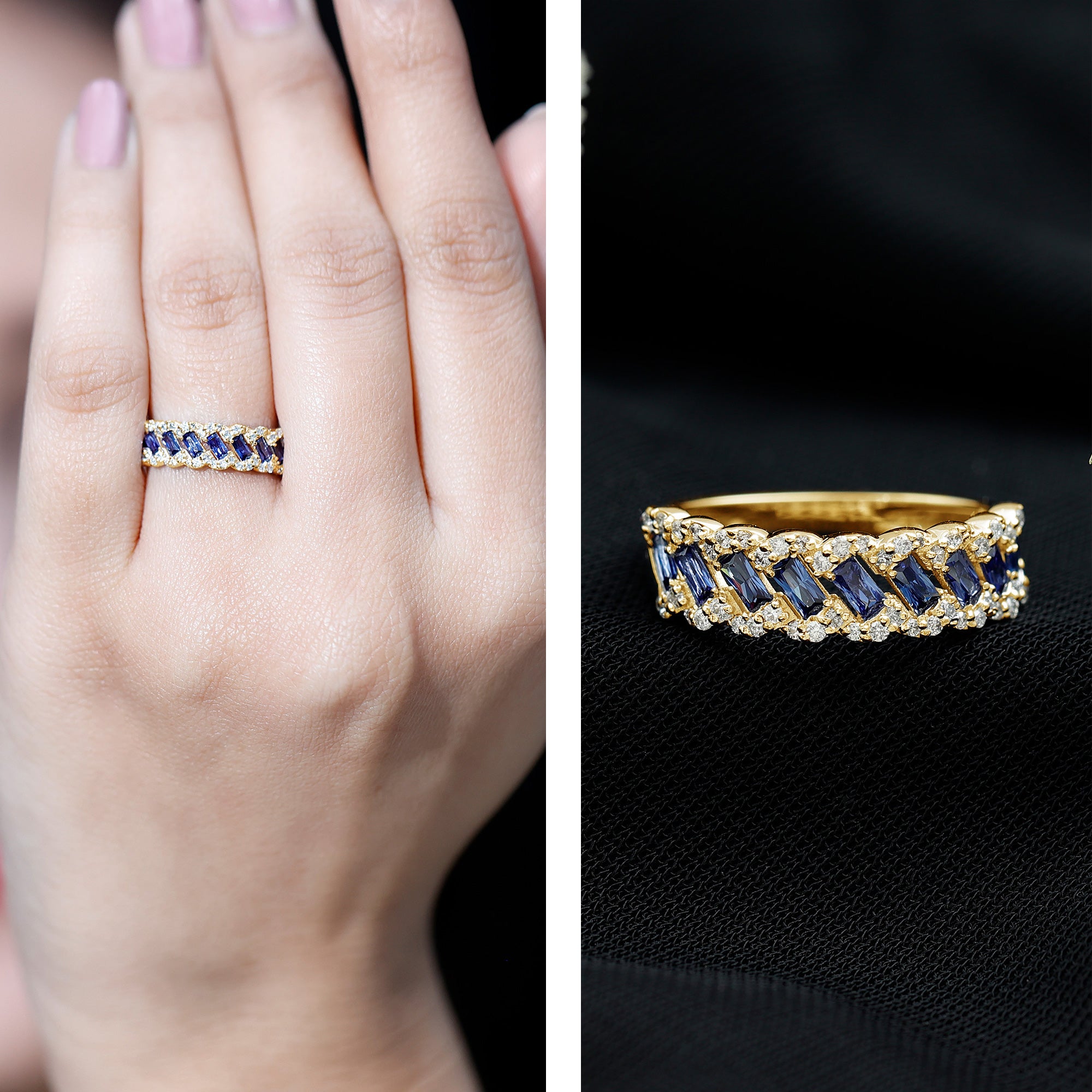 East to West eternity bands have stones arranged horizontally, often used for elongated shapes like emerald, radiant, or pear-cut stones.