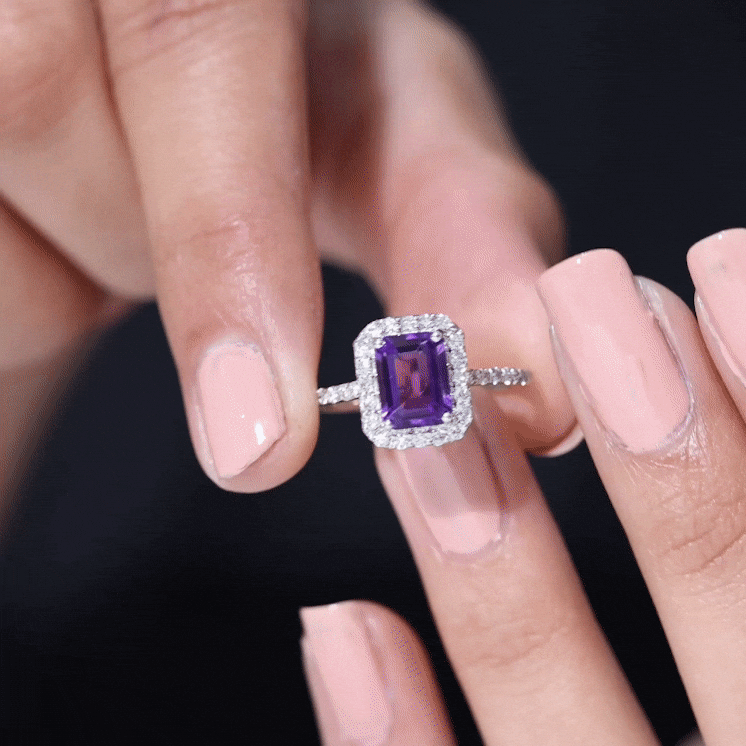 February birthstone jewelry features amethyst, the purple gemstone associated with peace, clarity, and protection.