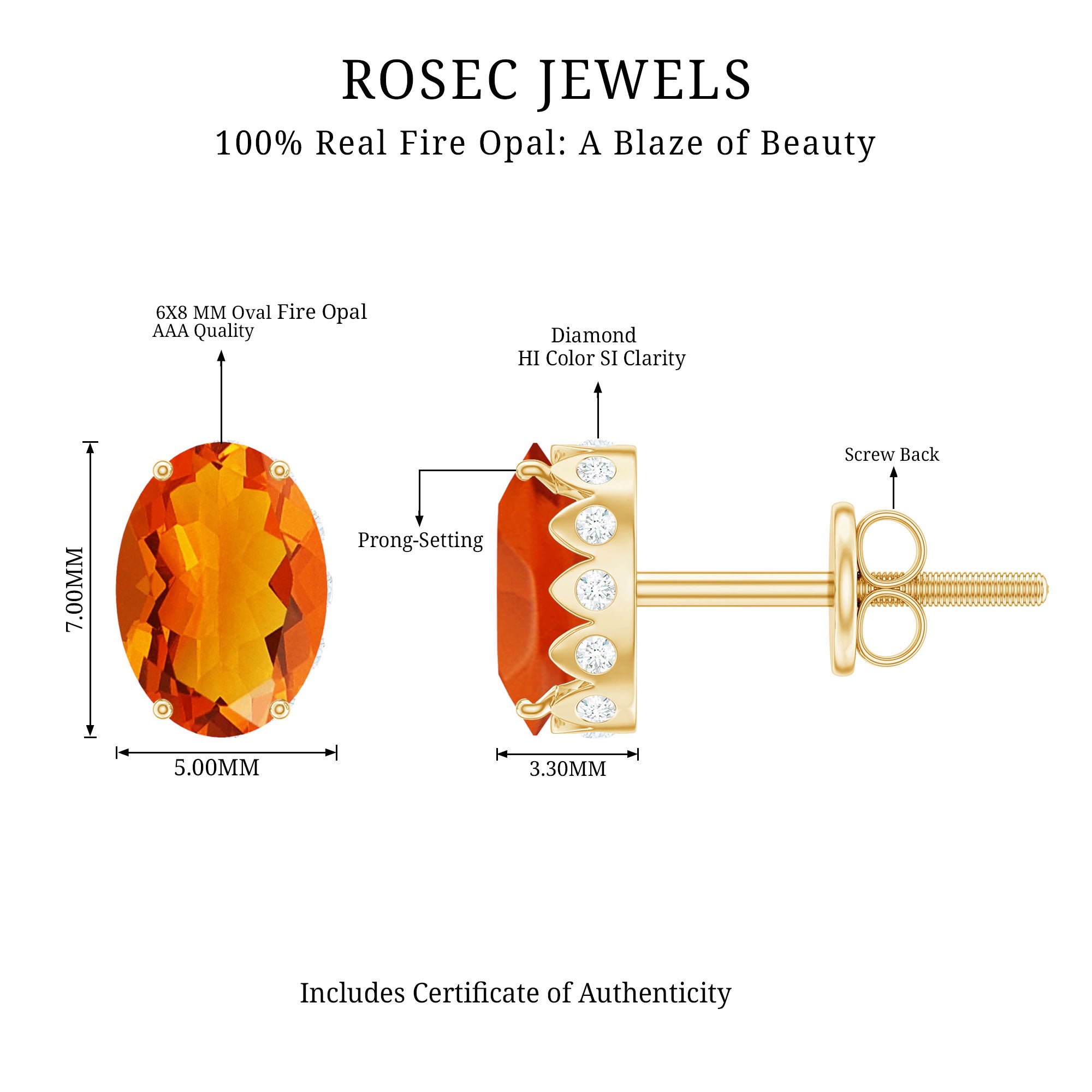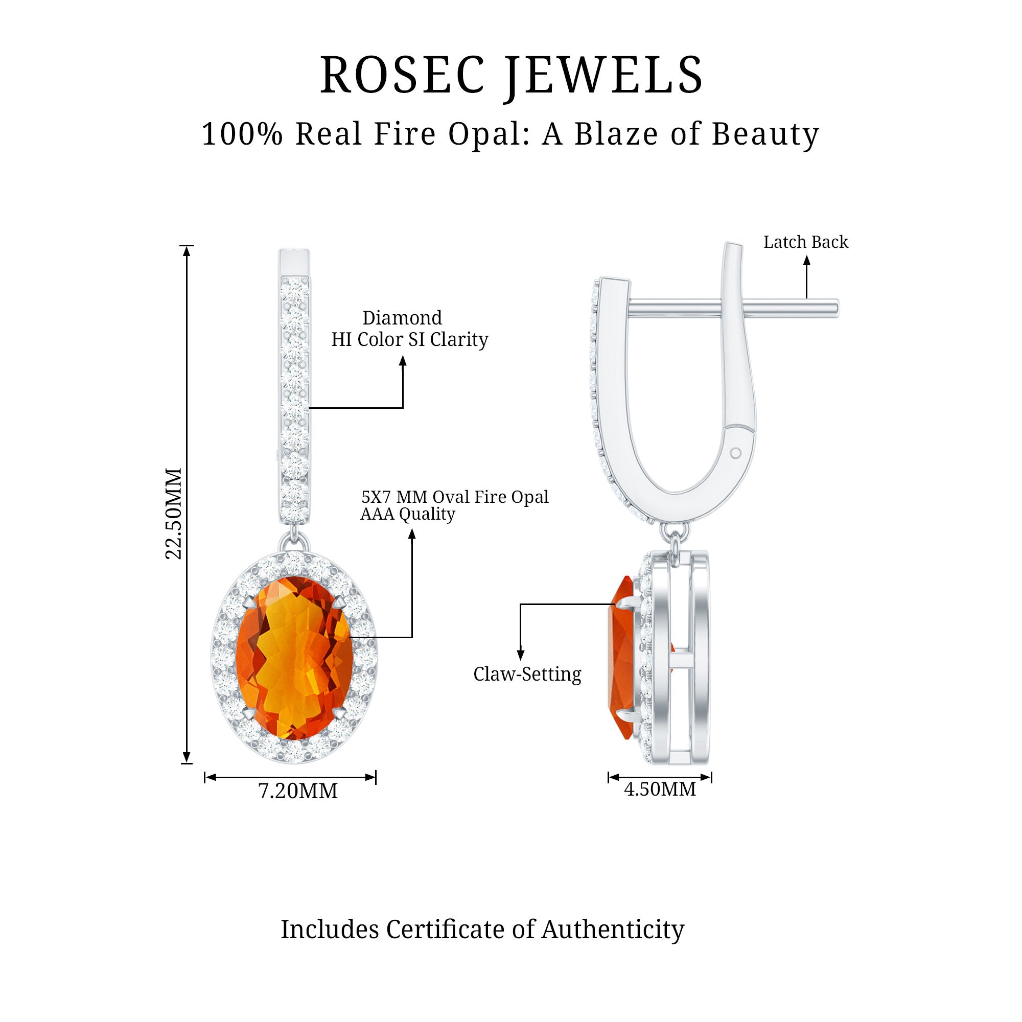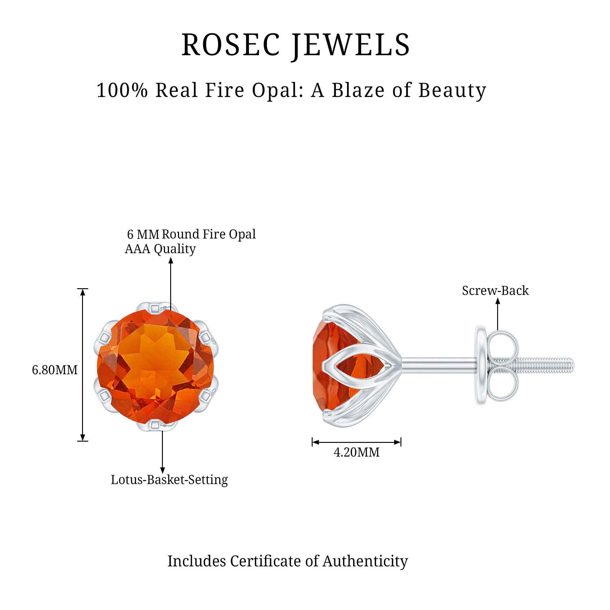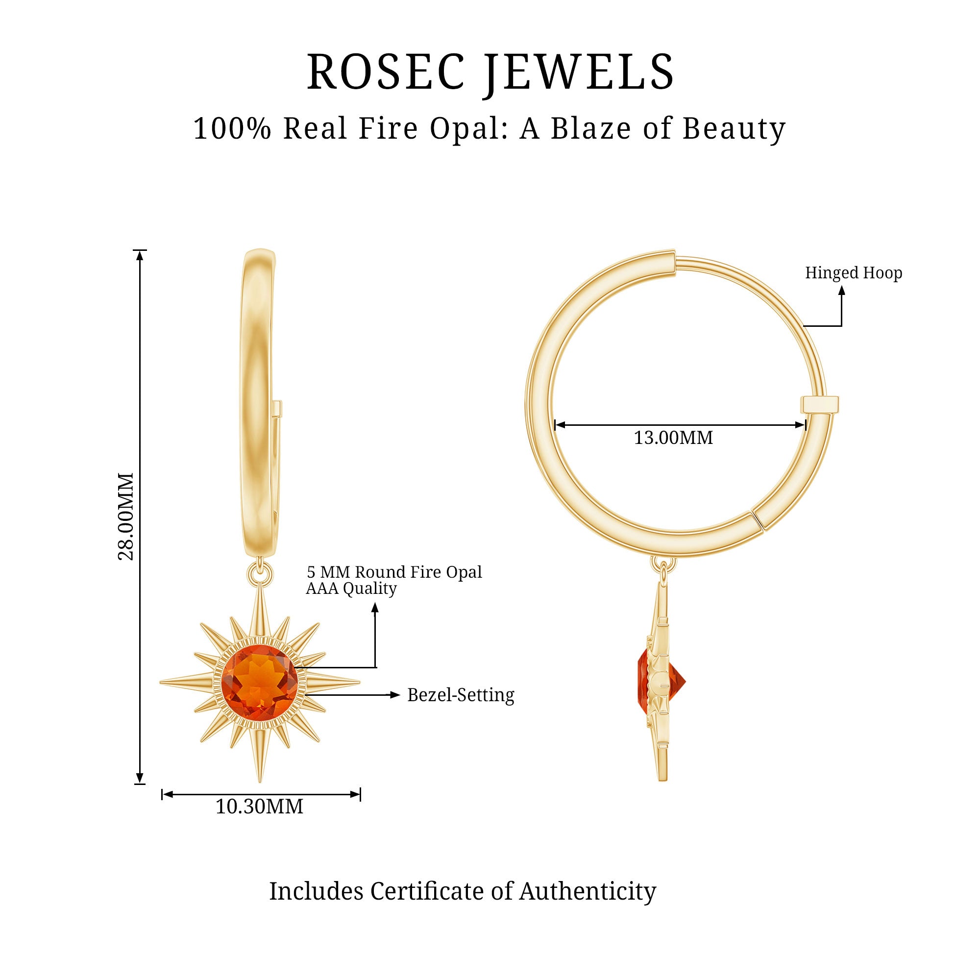 Precious Metals: Rosec Jewels provide genuine gold opal earrings with a hallmark on the metals. In gold, our red opal earrings for women come in all three colors of gold(Yellow, White, and Rose). we are also providing the fire opal earrings in sterling silver with the stamp of purity.