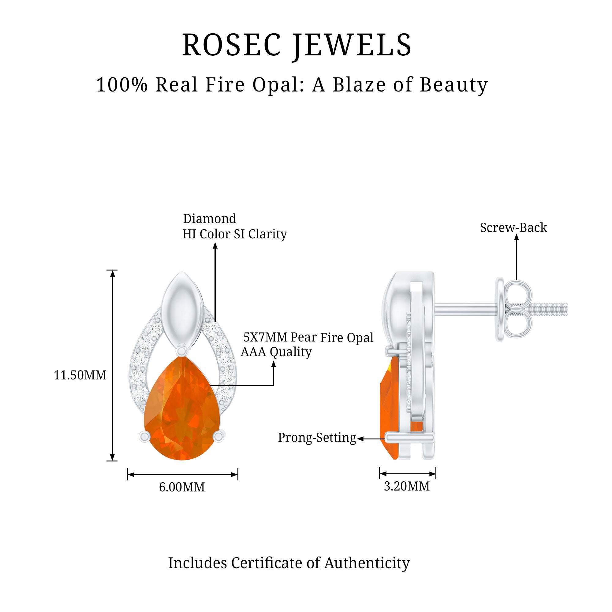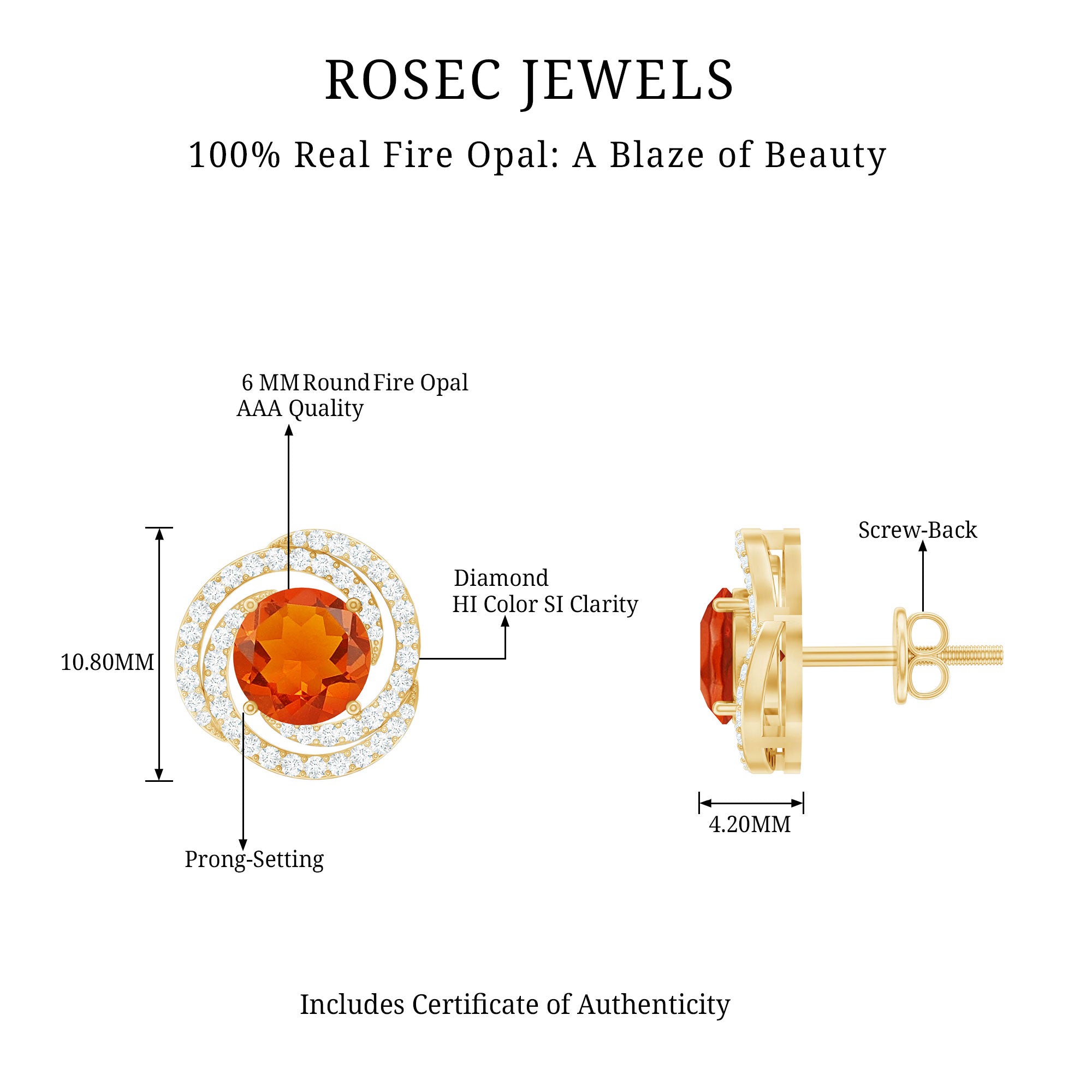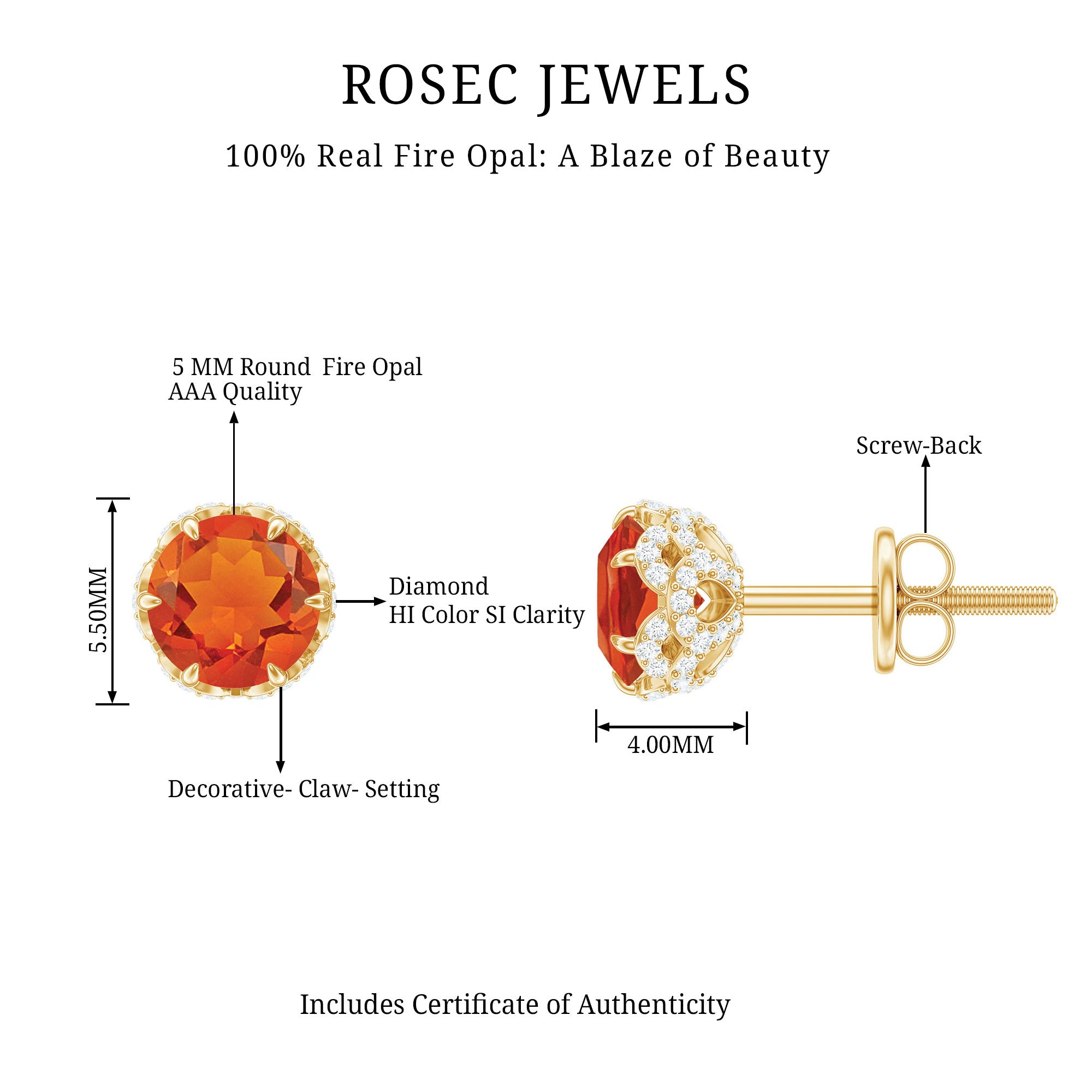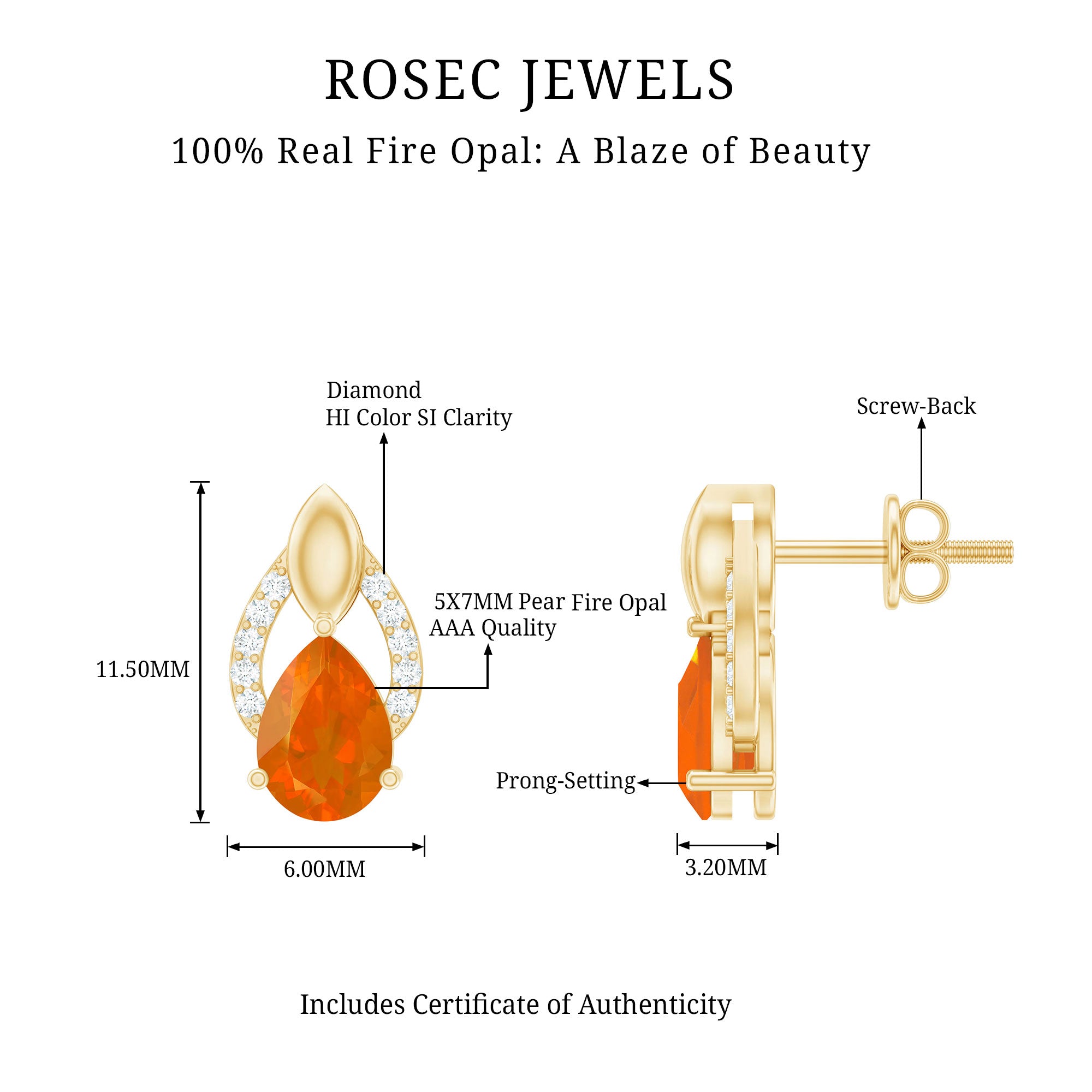 Color: At Rosec Jewels, our earrings feature the finest fire opals that exhibit a spectrum. Our fire opals have a rich and saturated color that showcases from vivid reds to bright oranges.