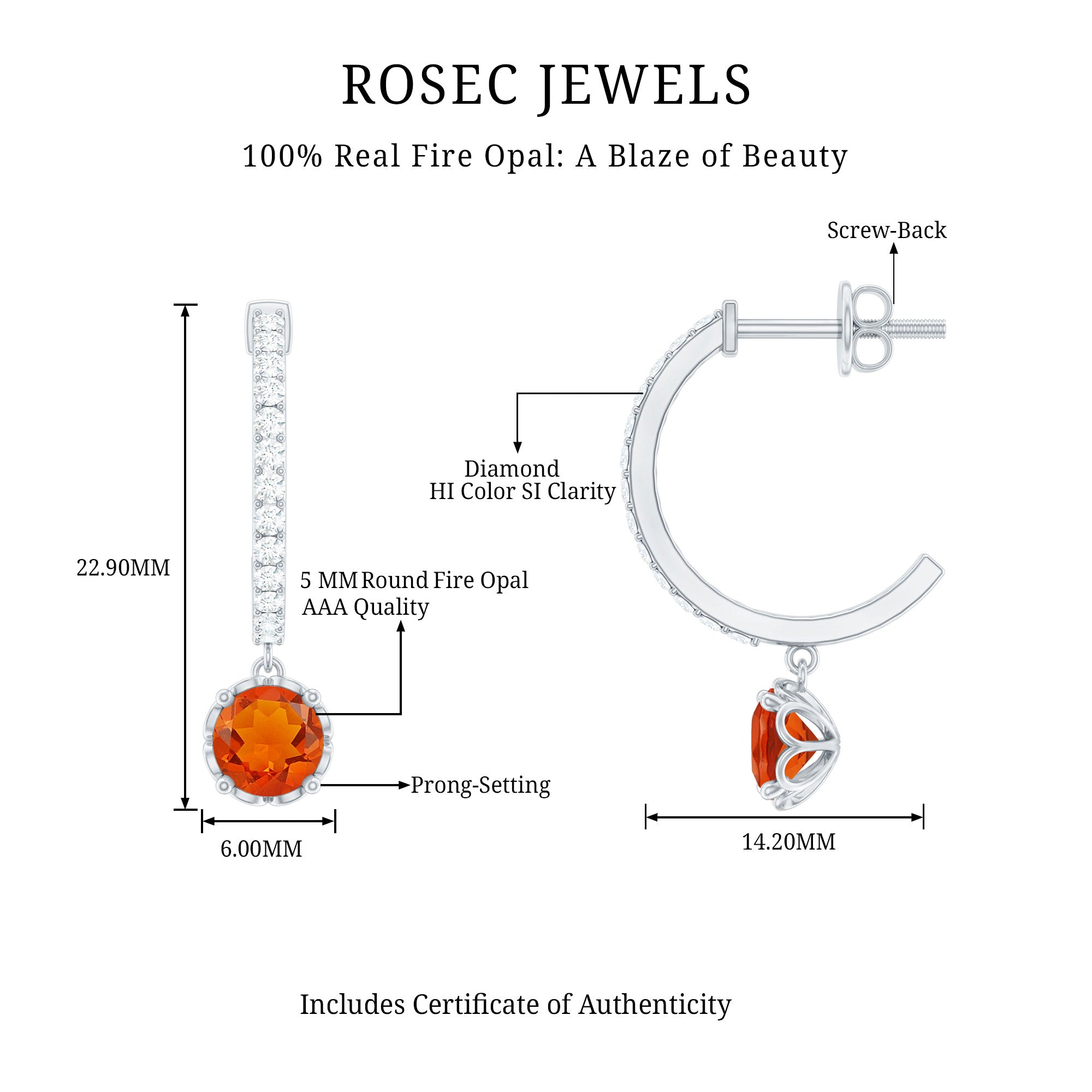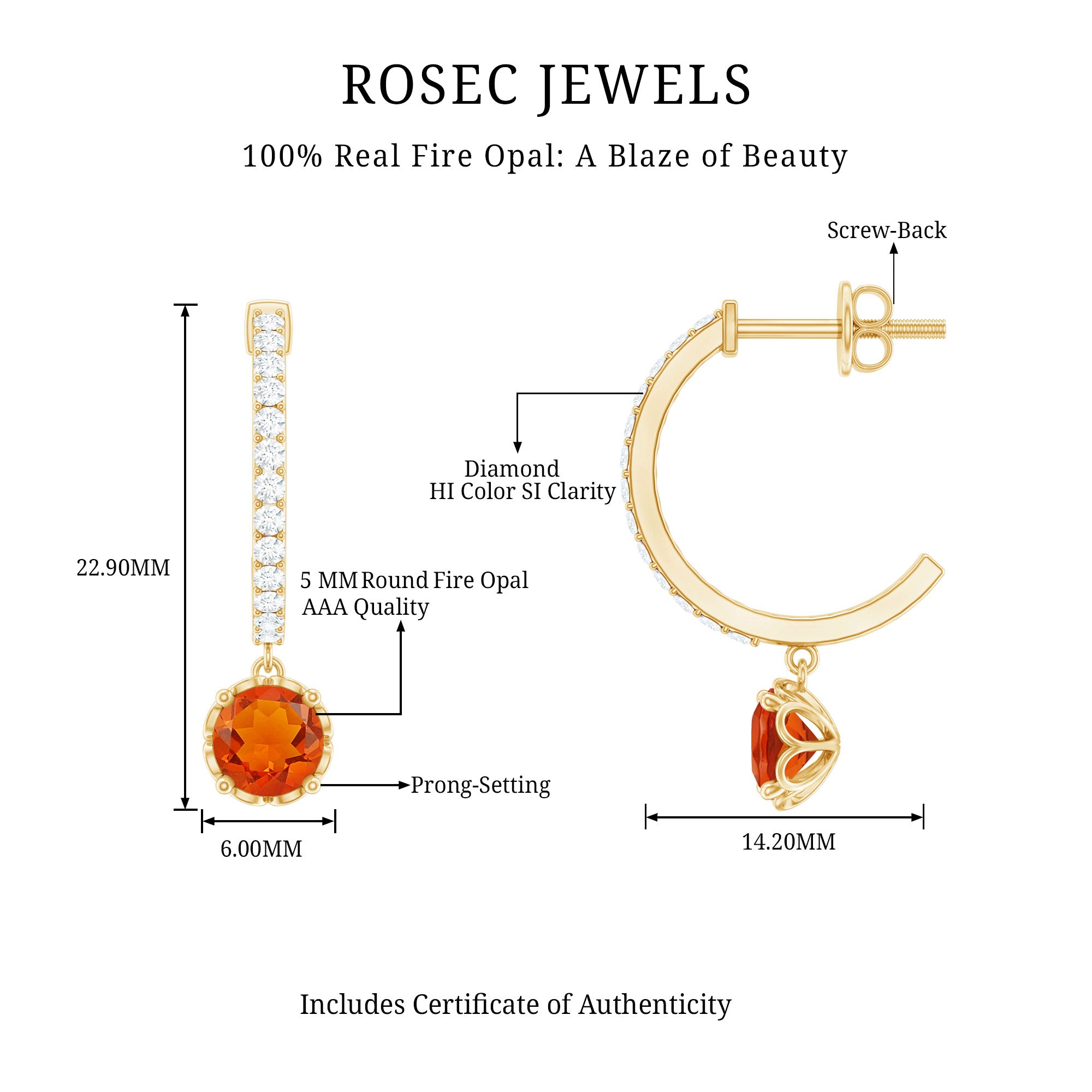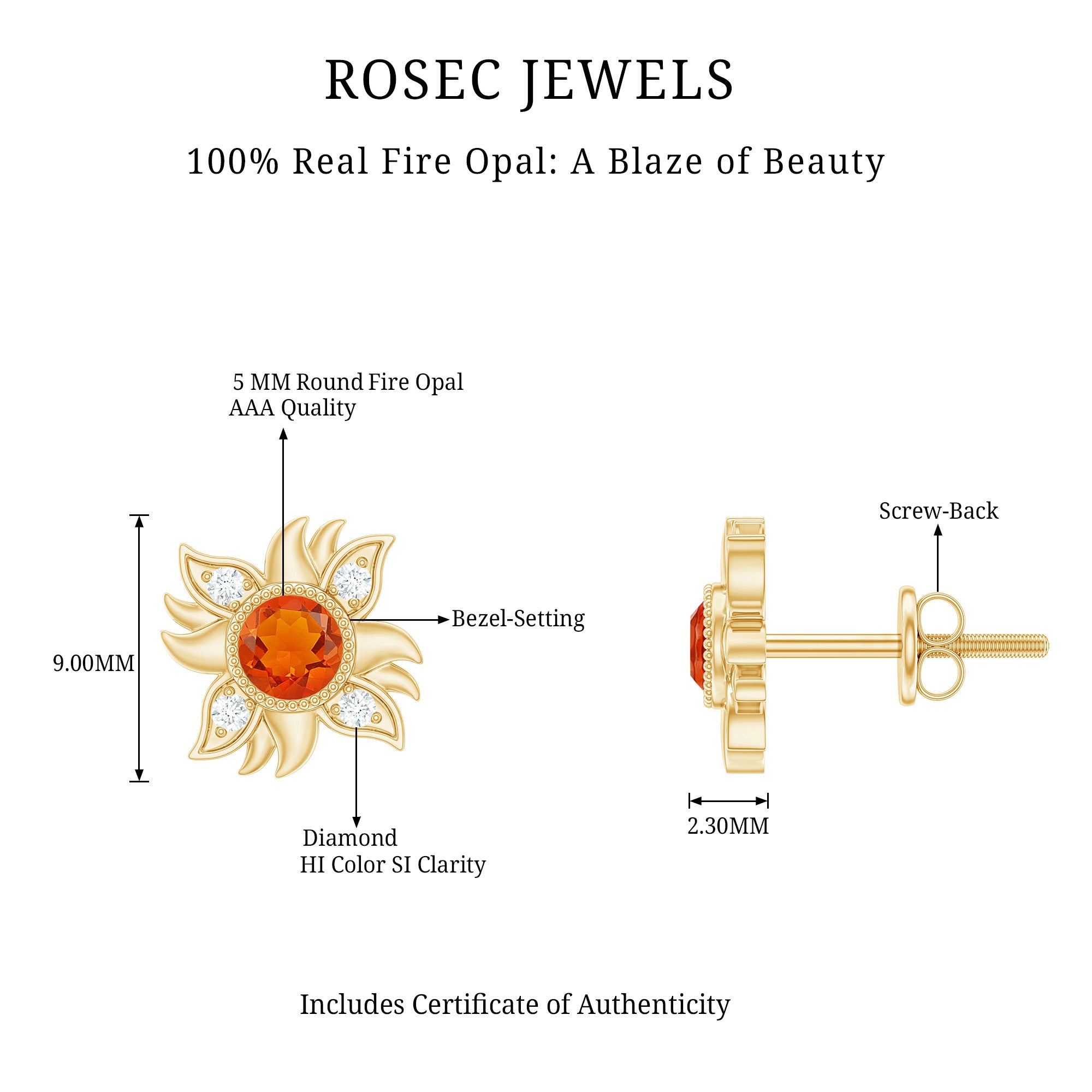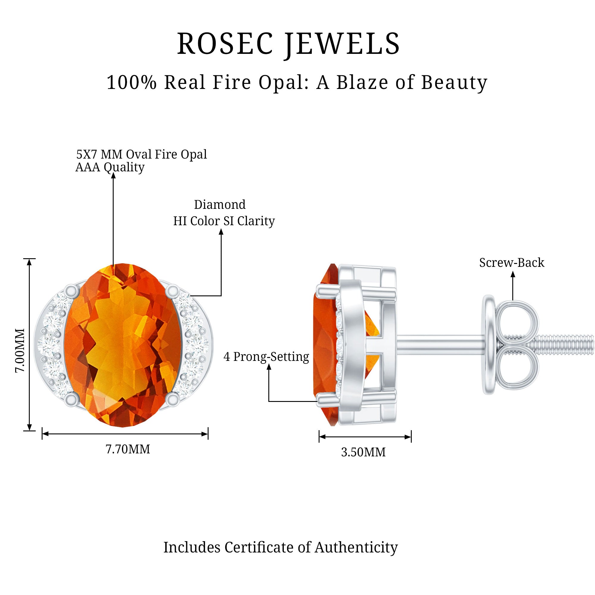 Color: At Rosec Jewels, our earrings feature the finest fire opals that exhibit a spectrum. Our fire opals have a rich and saturated color that showcases from vivid reds to bright oranges.