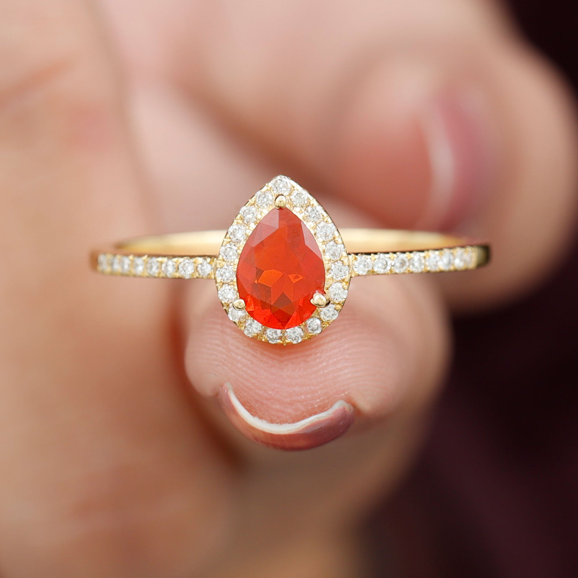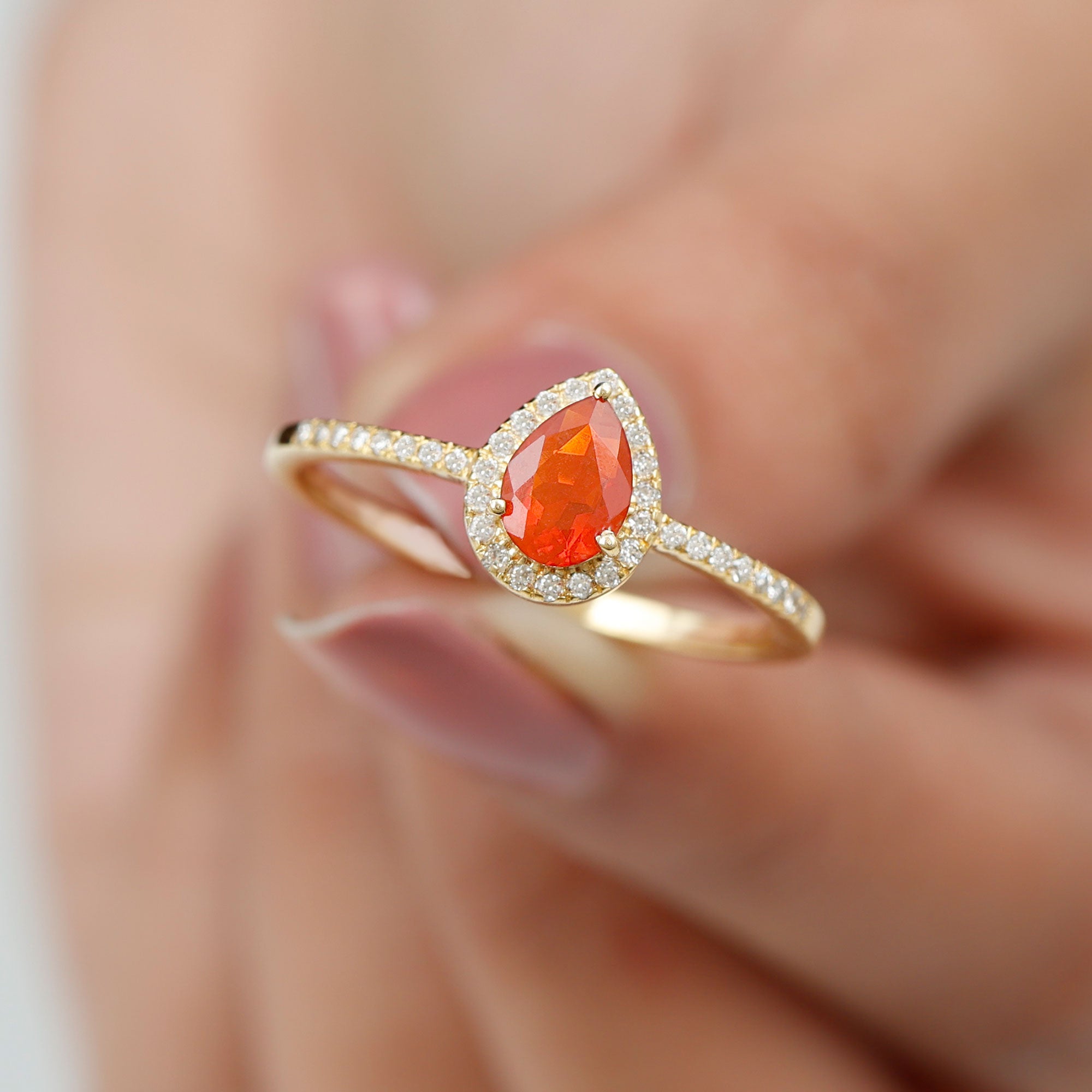 Pear: The pear cut of fire opal rings is a timeless classic. This cut can reveal 71 facets of the stone to enhance its beauty and shape. The teardrop shape also lengthens the appearance of your fire opal. An oval-cut fire opal ring will make your fingers look slender.