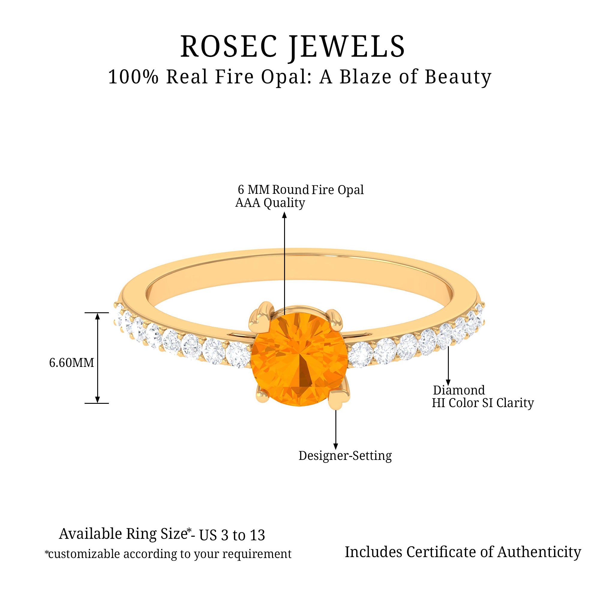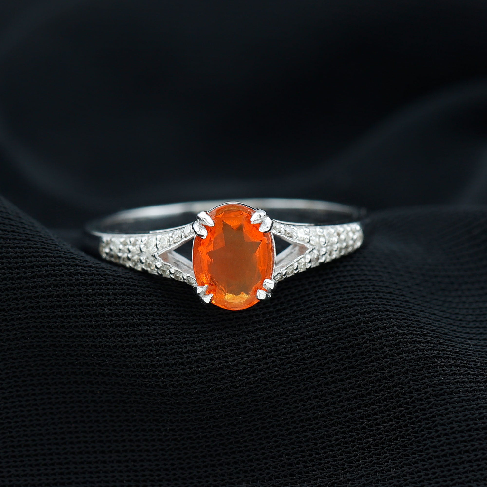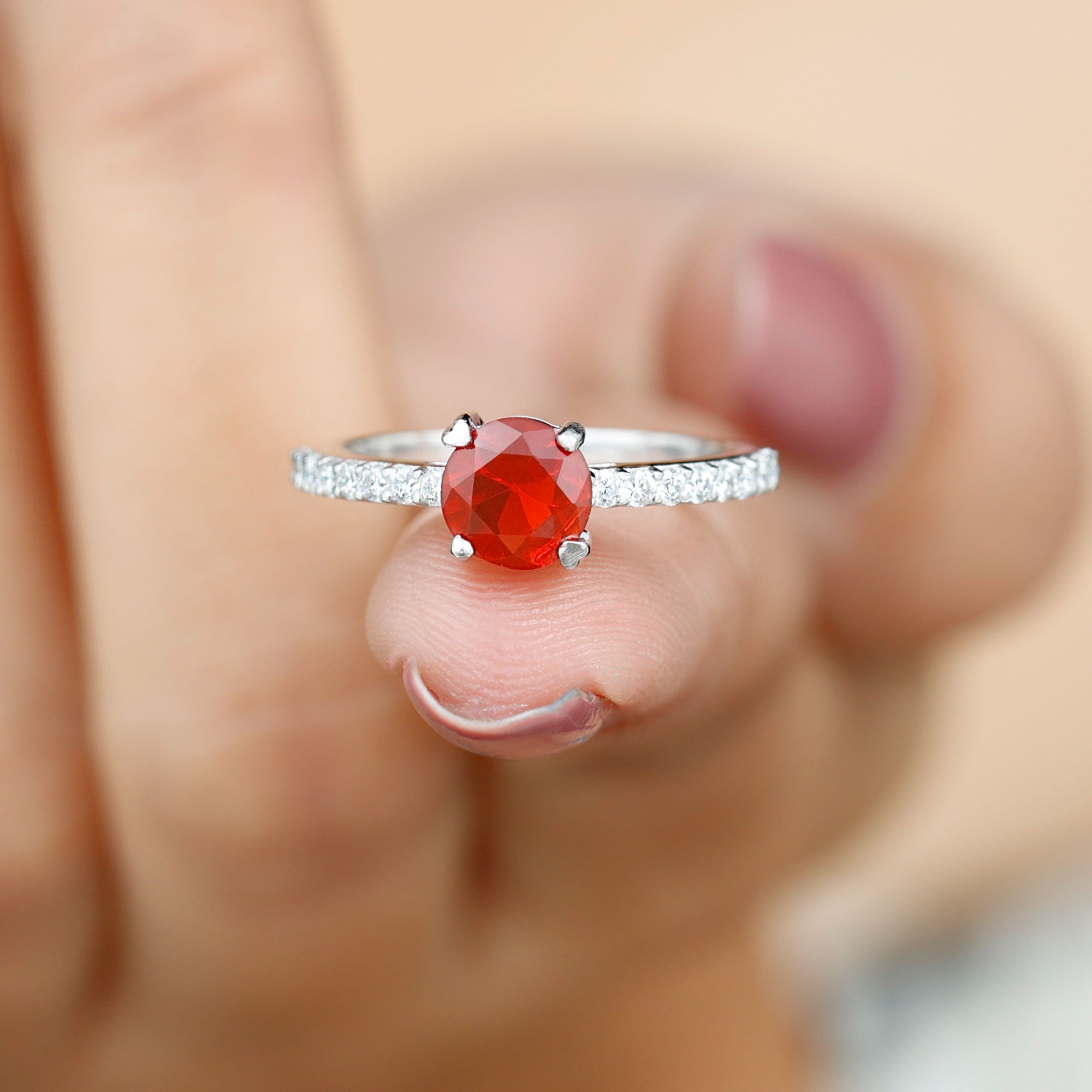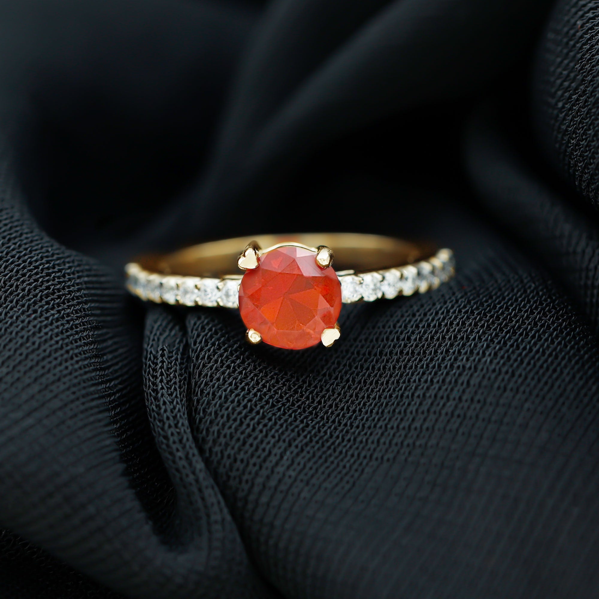Features a center fire opal stone which takes all the attention with their fiery hues. The solitaire opal can be of any shape such as brilliant round, pear, heart, emerald cut and many more. This solitaire style adds the sophisticated touch to the ring.