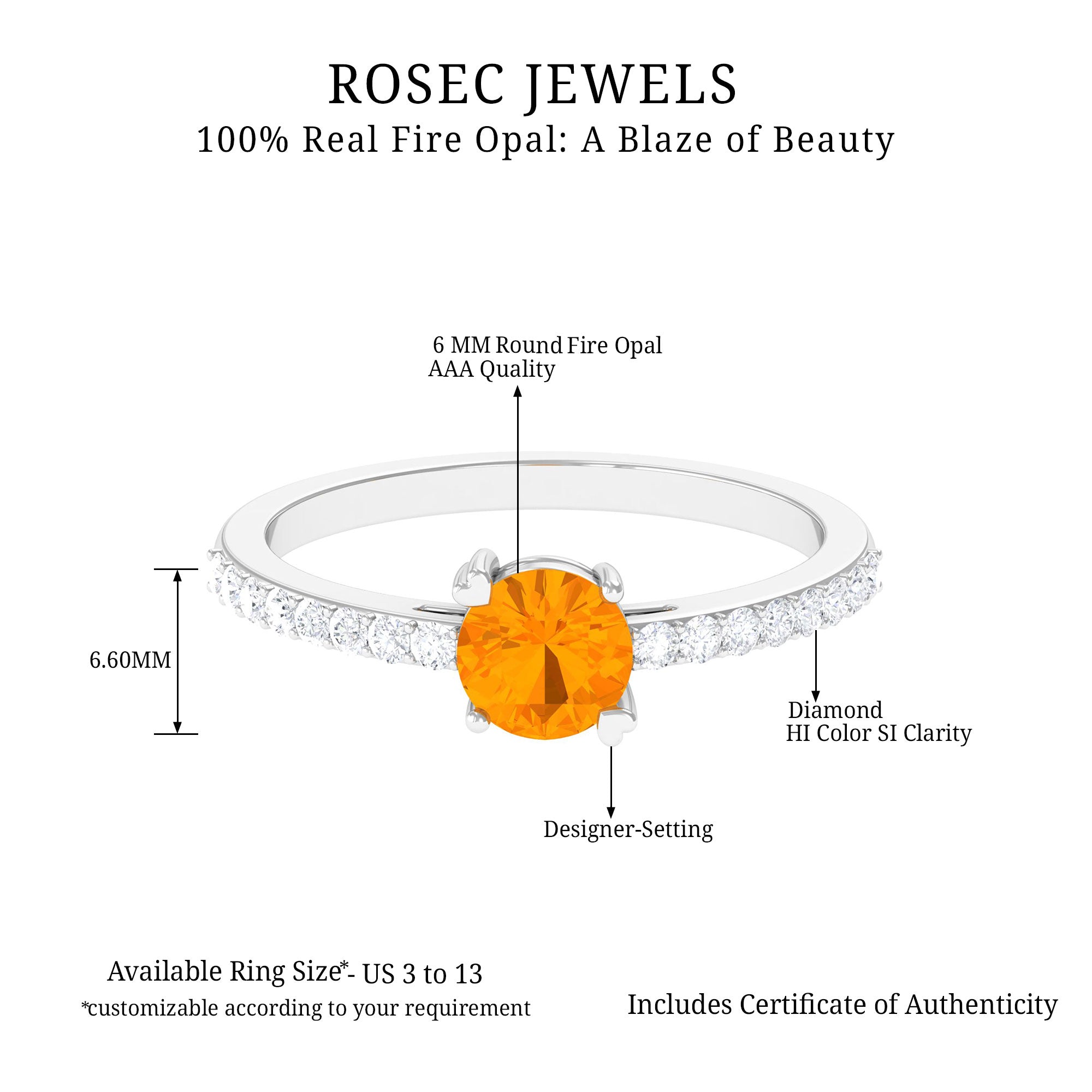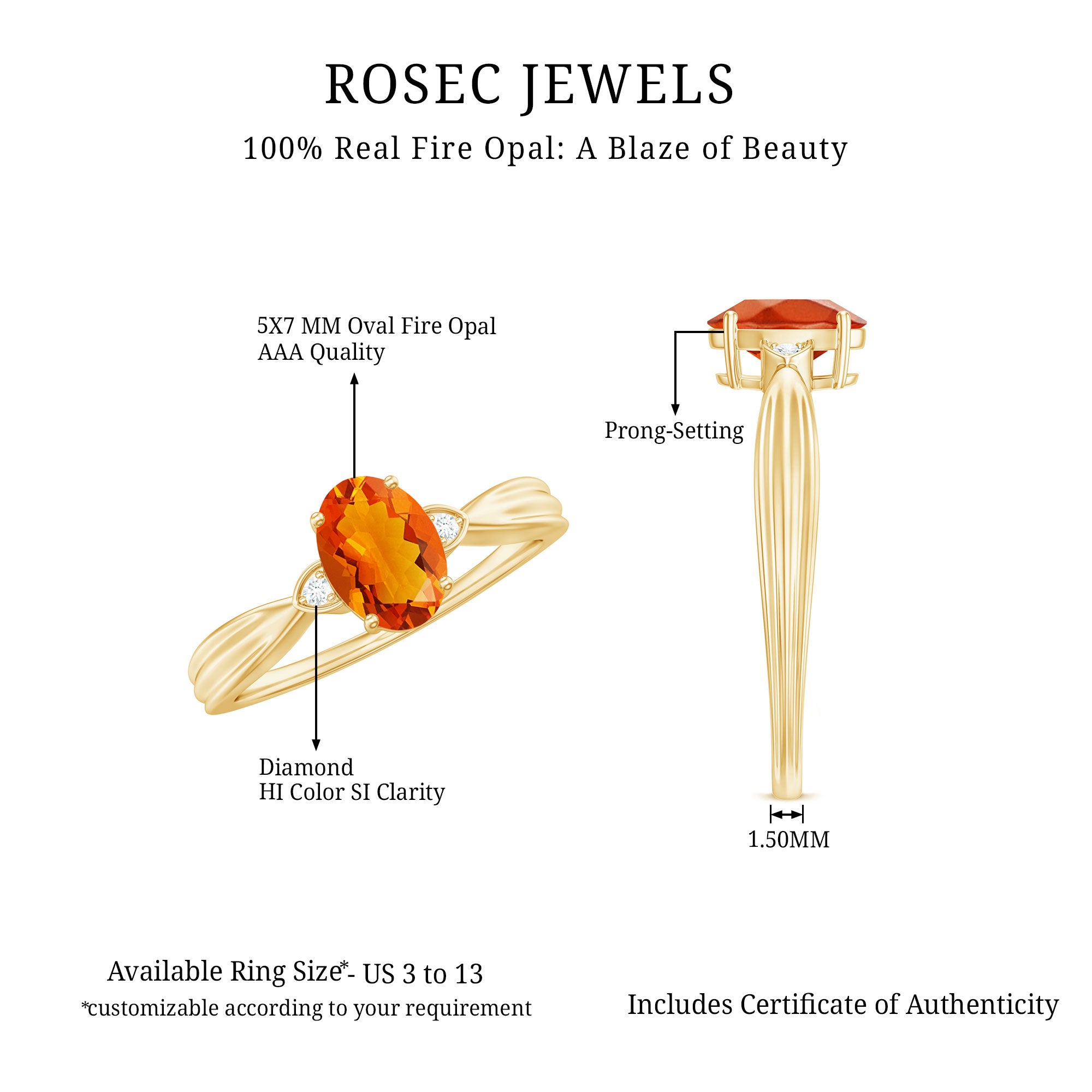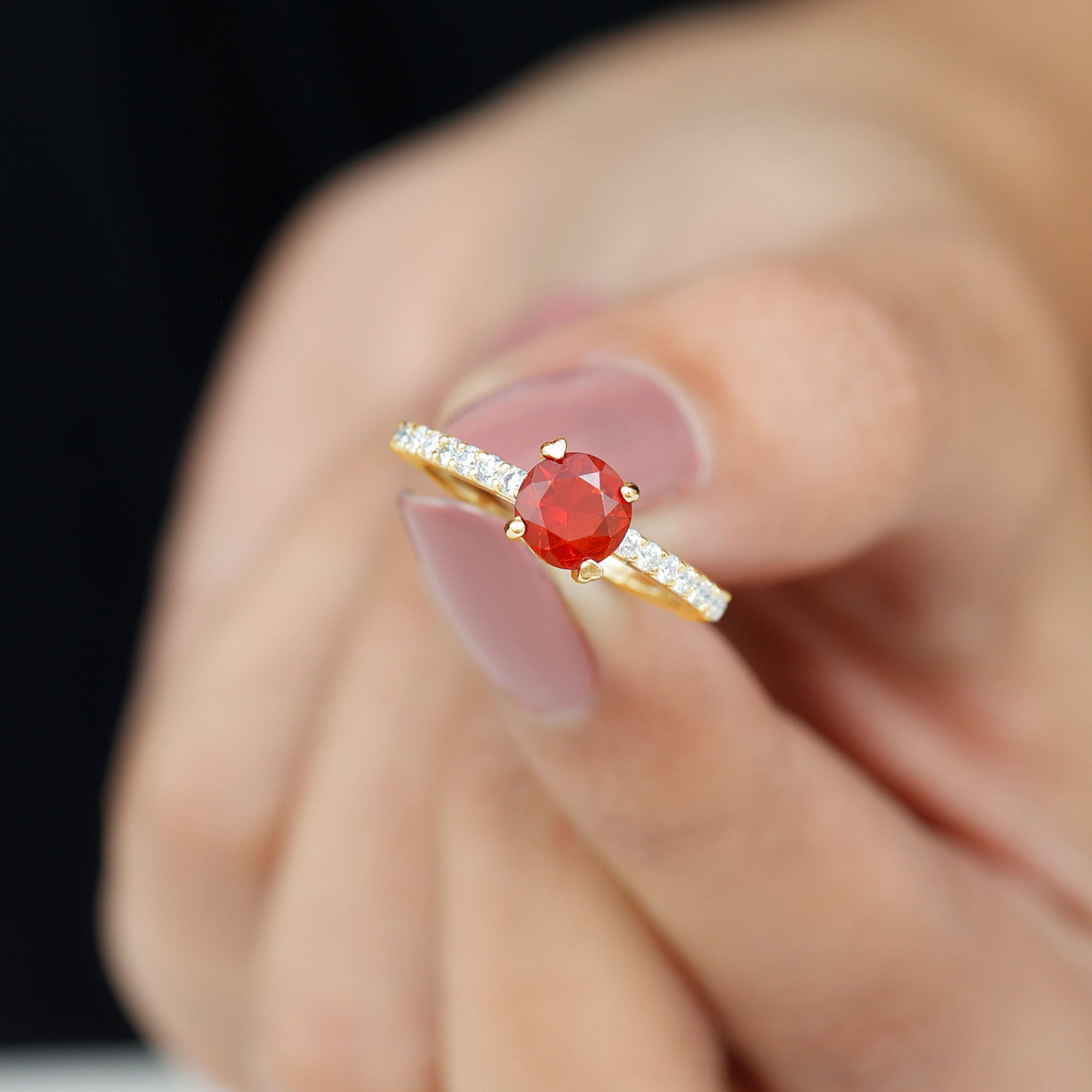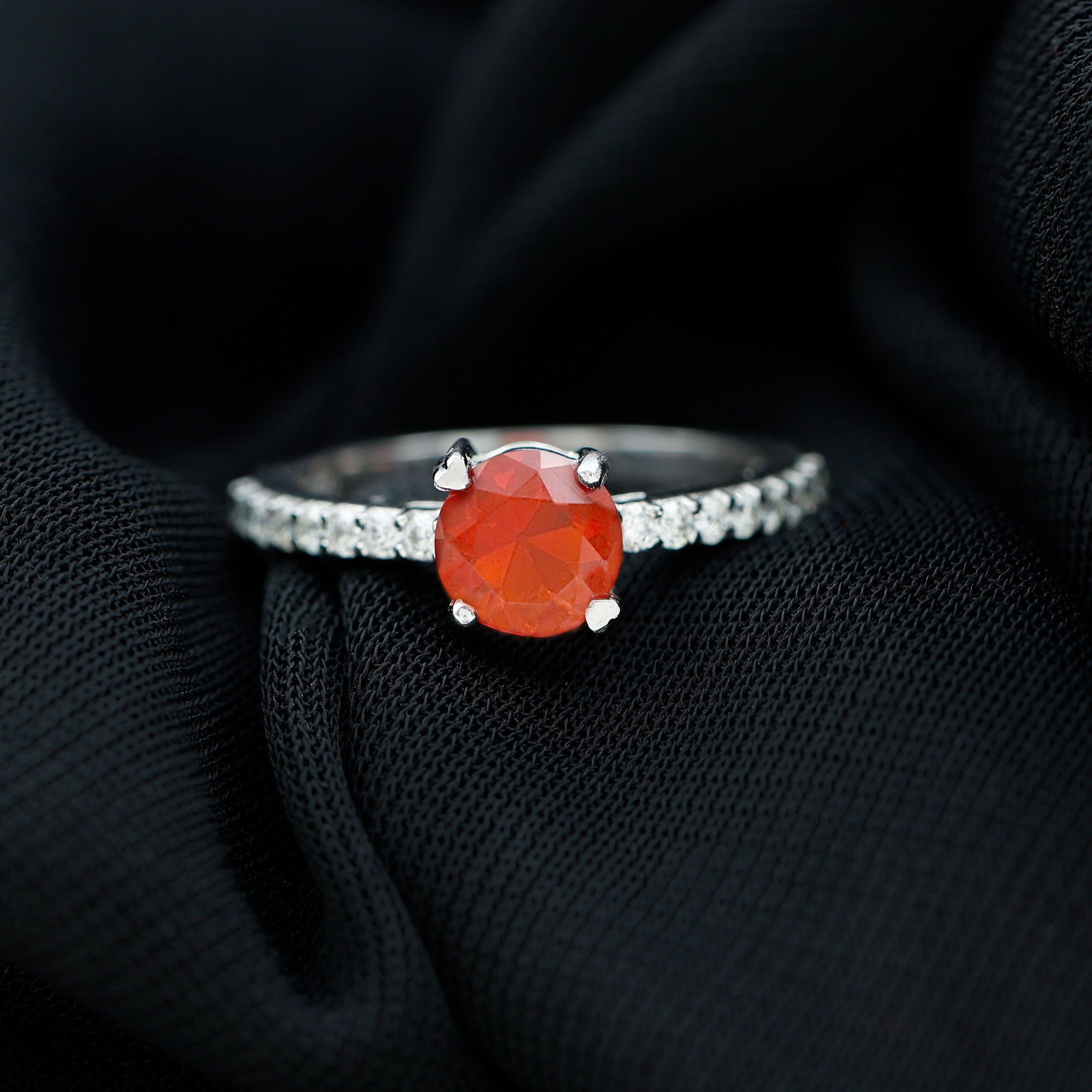 Features a center fire opal stone which takes all the attention with their fiery hues. The solitaire opal can be of any shape such as brilliant round, pear, heart, emerald cut and many more. This solitaire style adds the sophisticated touch to the ring.