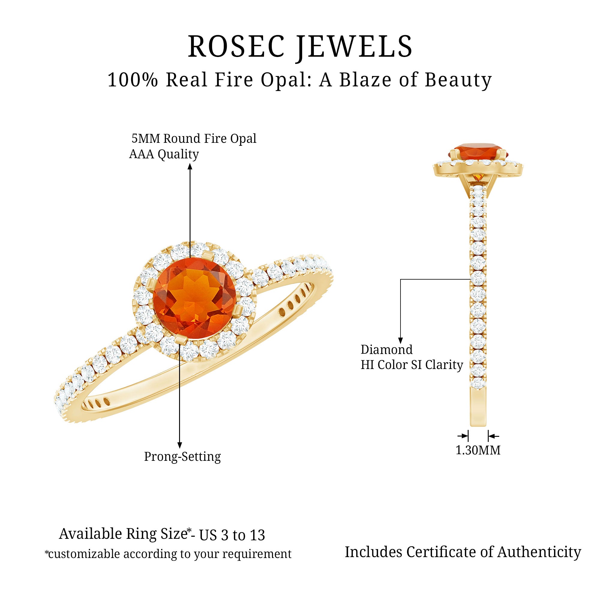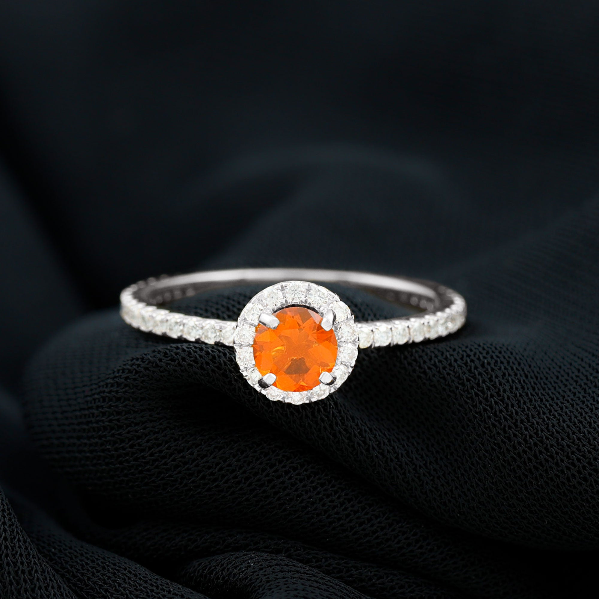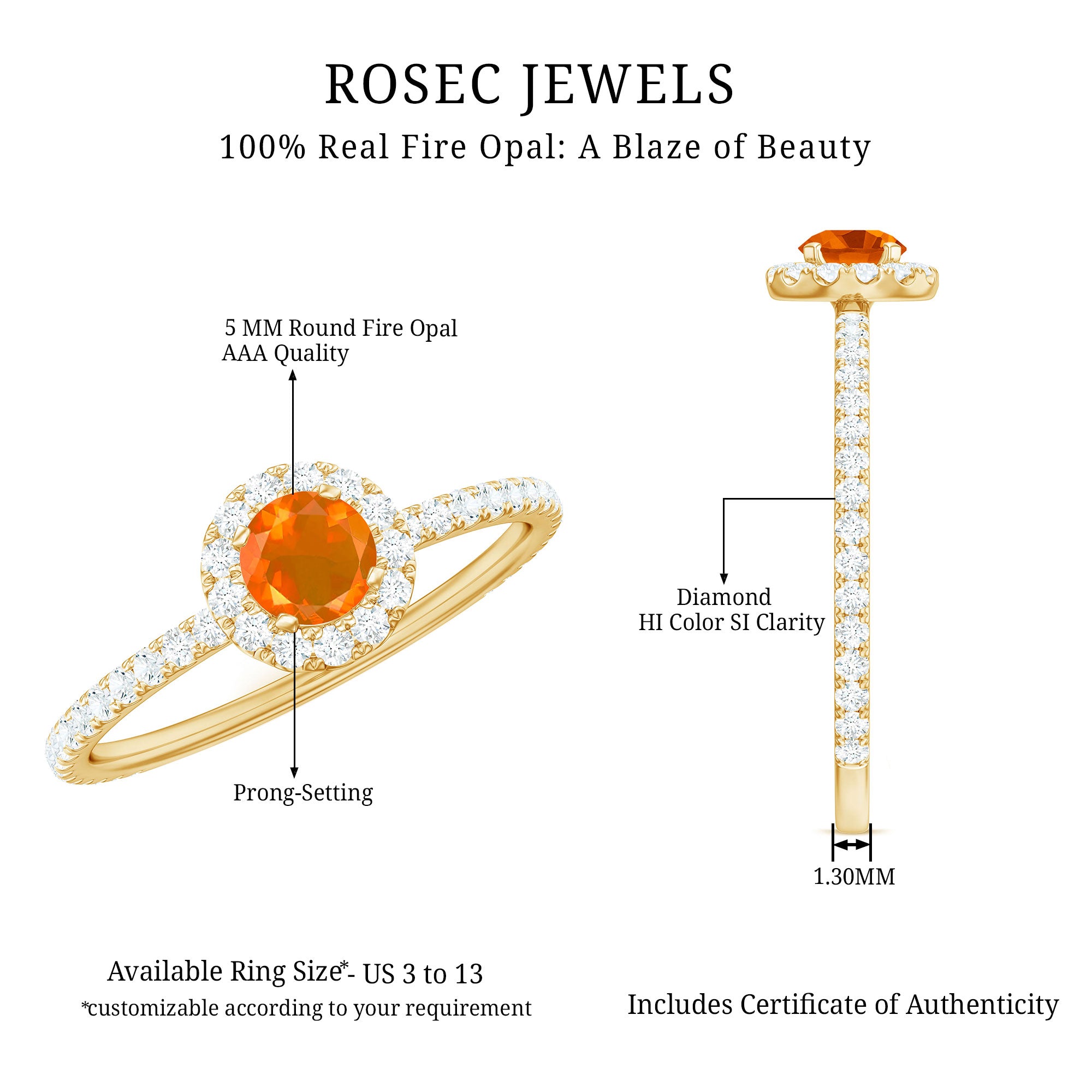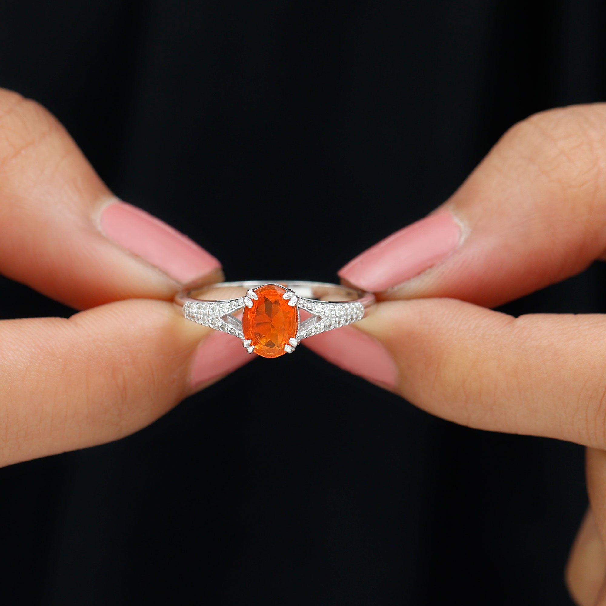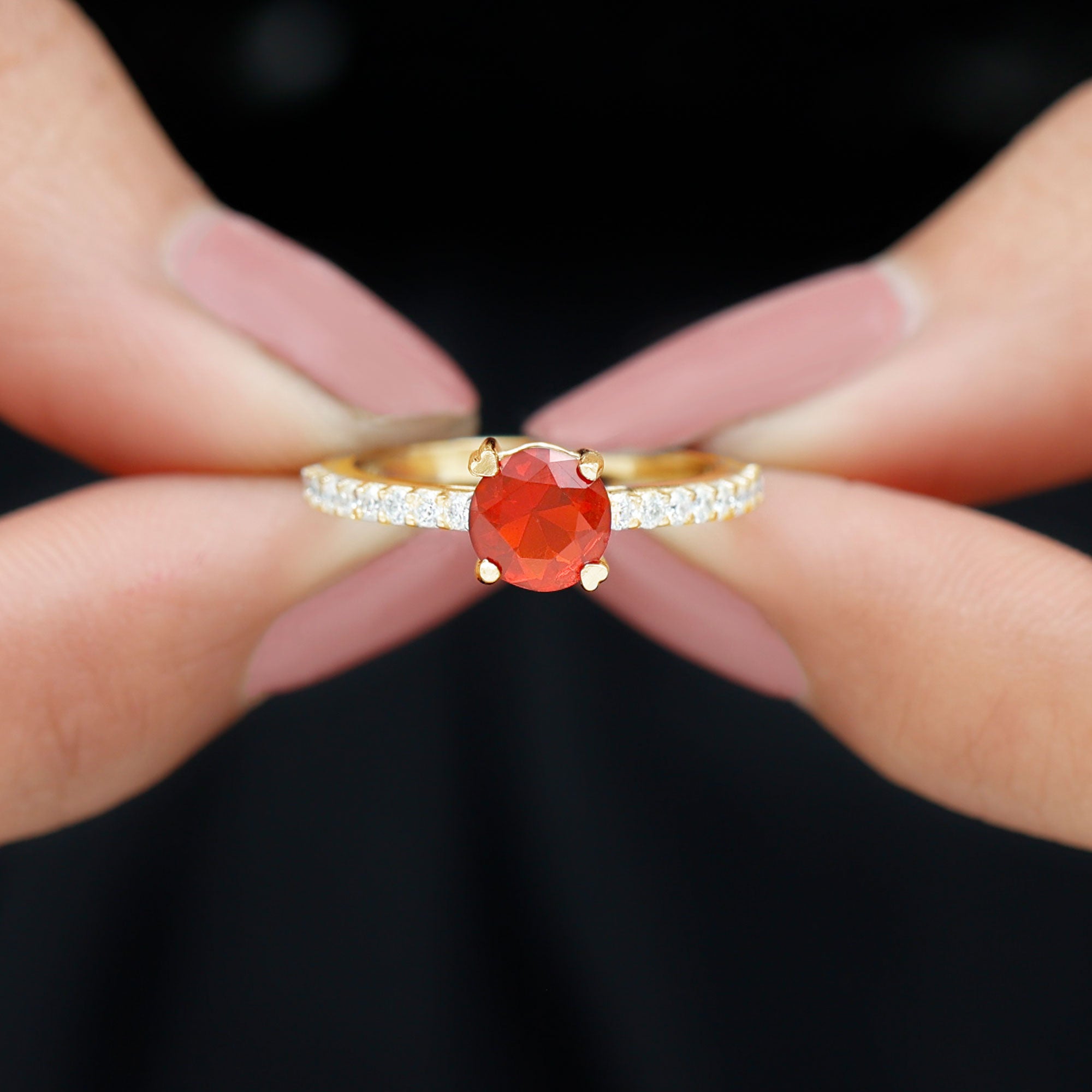Features a center fire opal stone which takes all the attention with their fiery hues. The solitaire opal can be of any shape such as brilliant round, pear, heart, emerald cut and many more. This solitaire style adds the sophisticated touch to the ring.