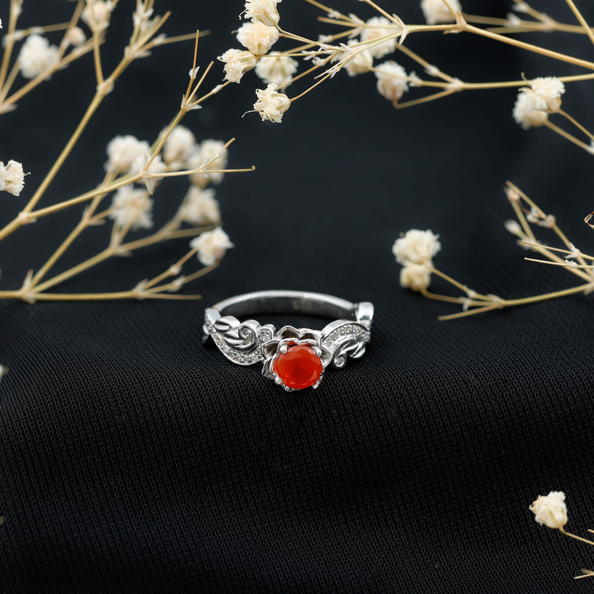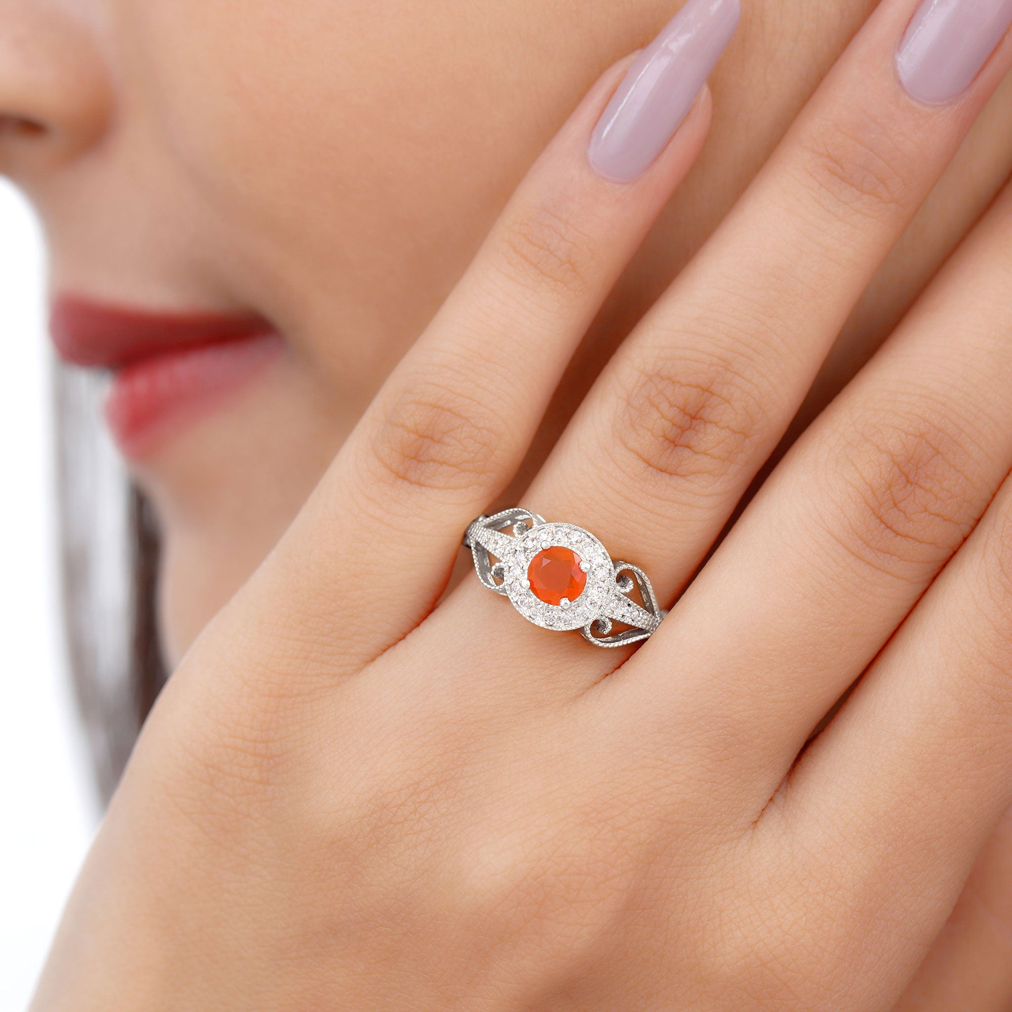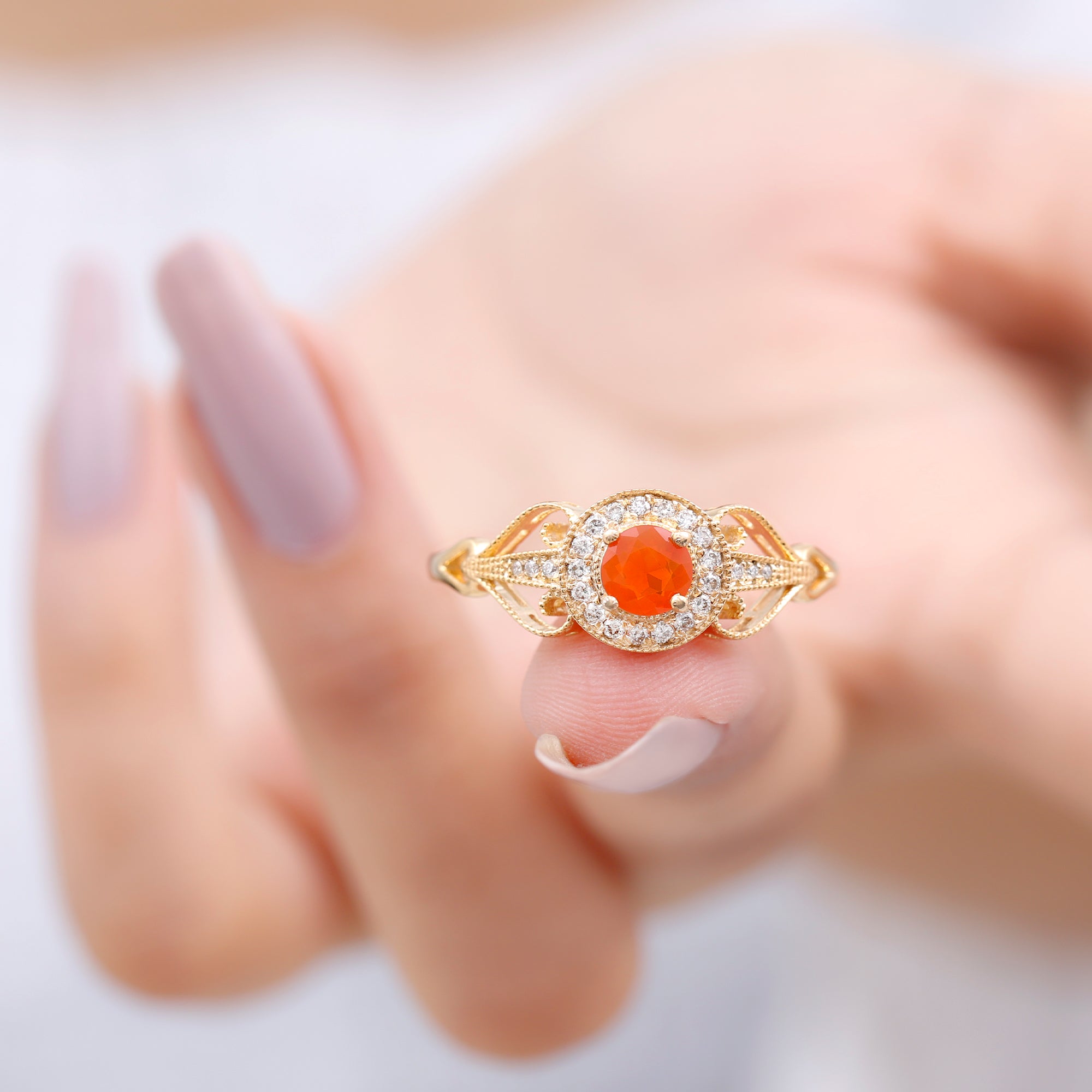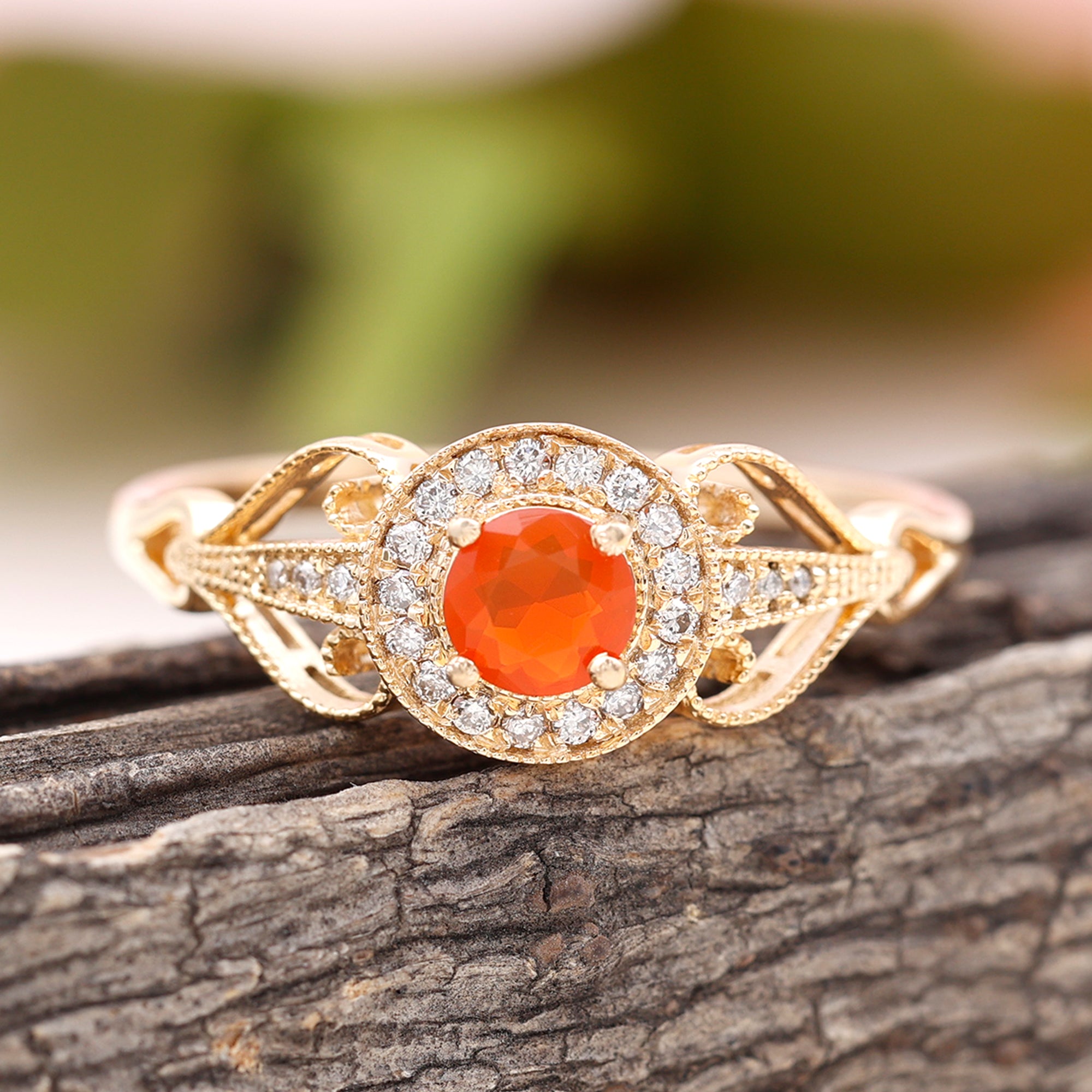 A vintage inspired fire opal rings may give the impression of being several decades old, despite its contemporary creation. Mexican opal rings exudes the aura of antique artistry, drawing inspiration from the intricate designs of the Art Deco, Edwardian, and Victorian Eras. More of the details such as filigree, milgrain, and antique motifs, which are prominent design elements from those eras, along with other ornate engravings and embellishments.