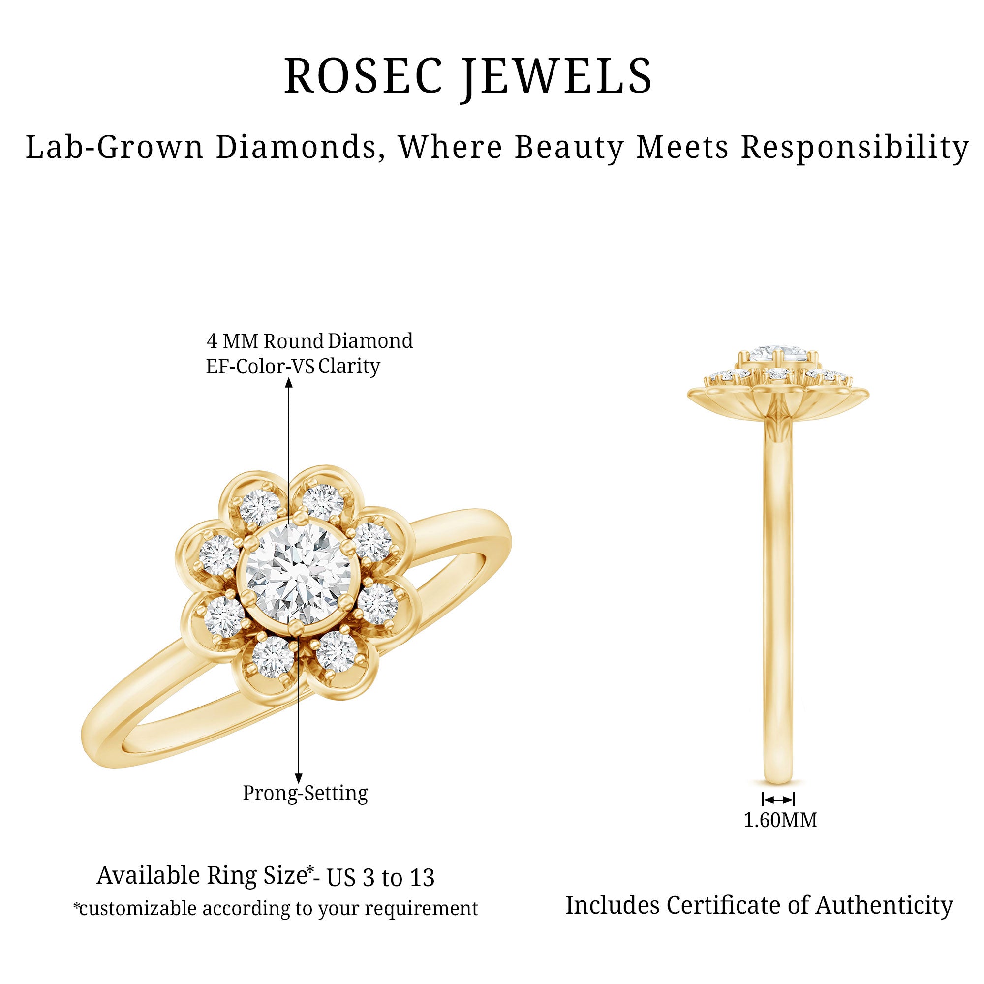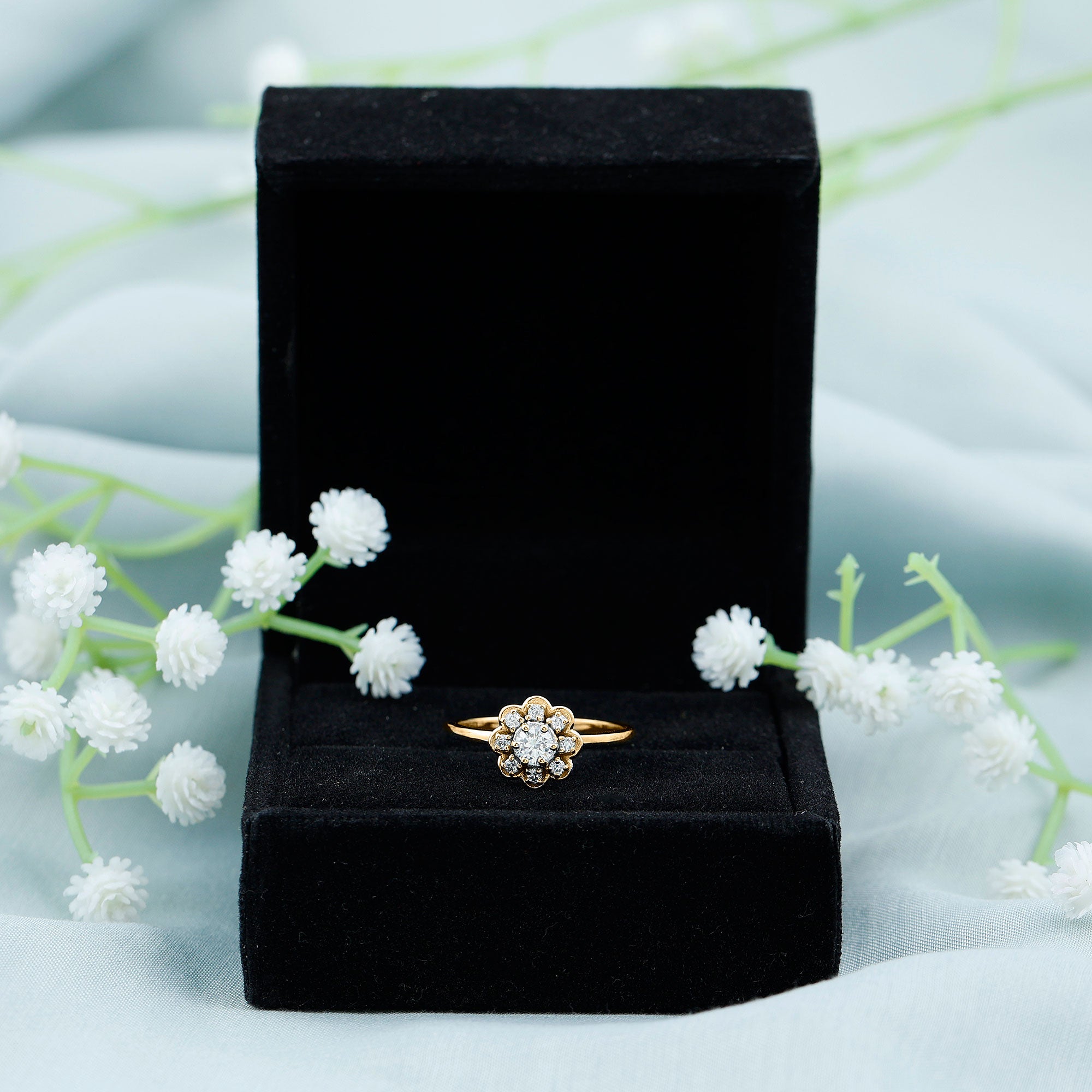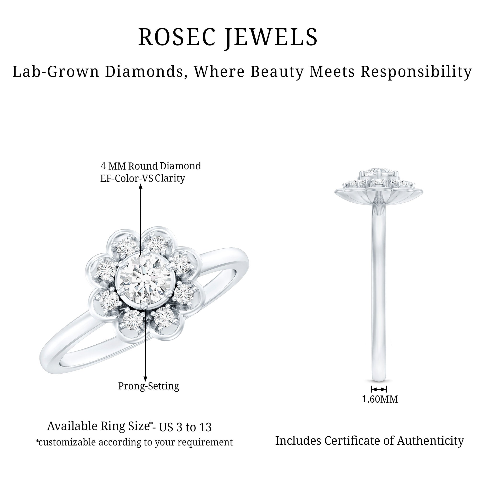 Flower Rings:- Our flower rings are inspired by nature's beauty, and are a good companion for every occasion like engagement, anniversary, birthday, and cocktail parties. Right from majestic solitaire flower rings to halo and eternity flower rings, each piece is specially designed to cater to different tastes and personalities. Even, Rosec Jewels offer you options in choosing the right gemstone for your flower ring, including diamonds, rubies, emeralds, sapphires, aquamarine, and other variety of colored gemstones.