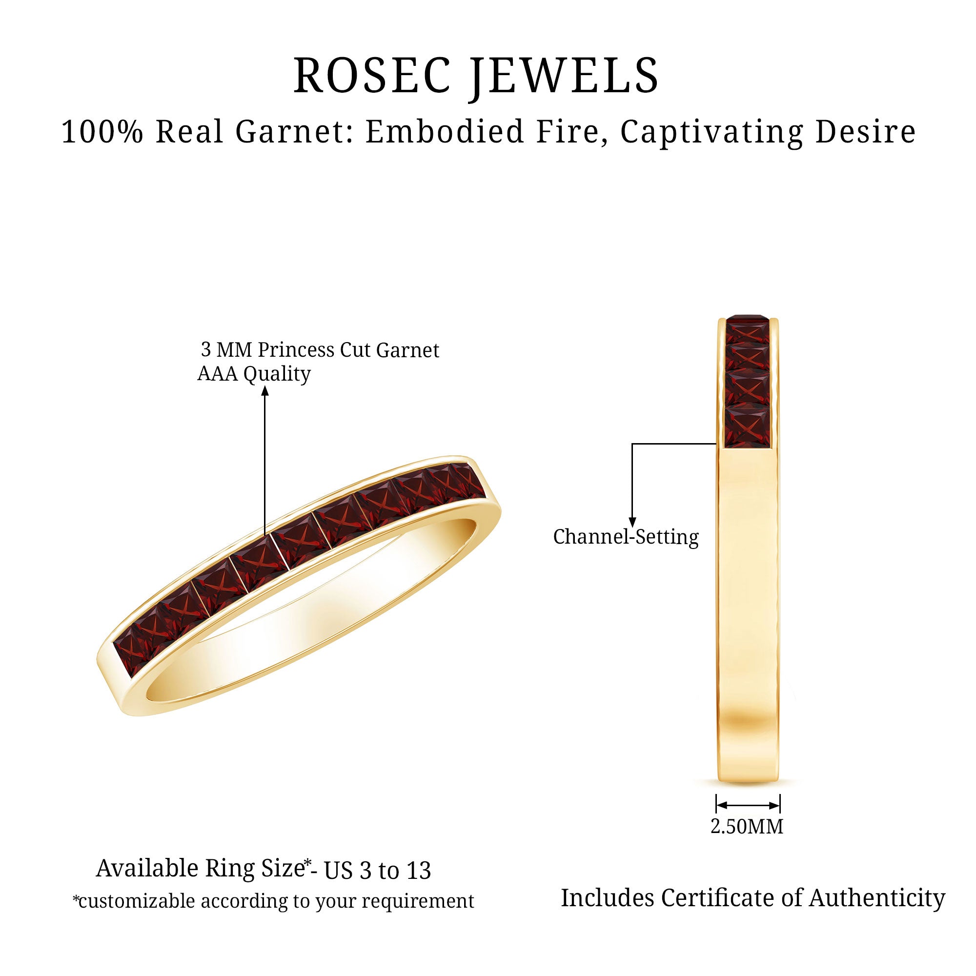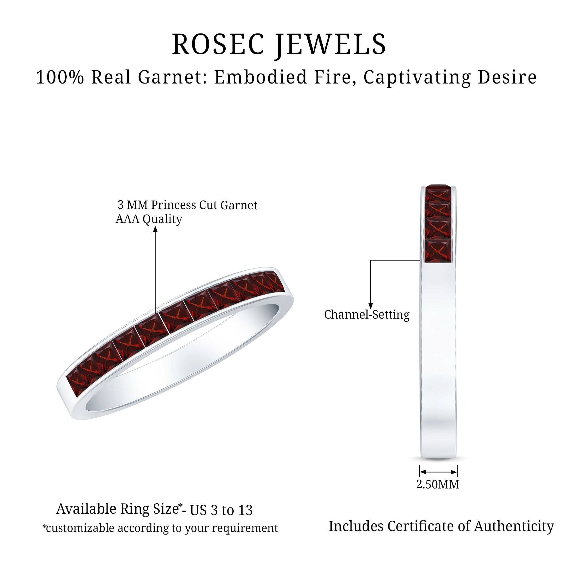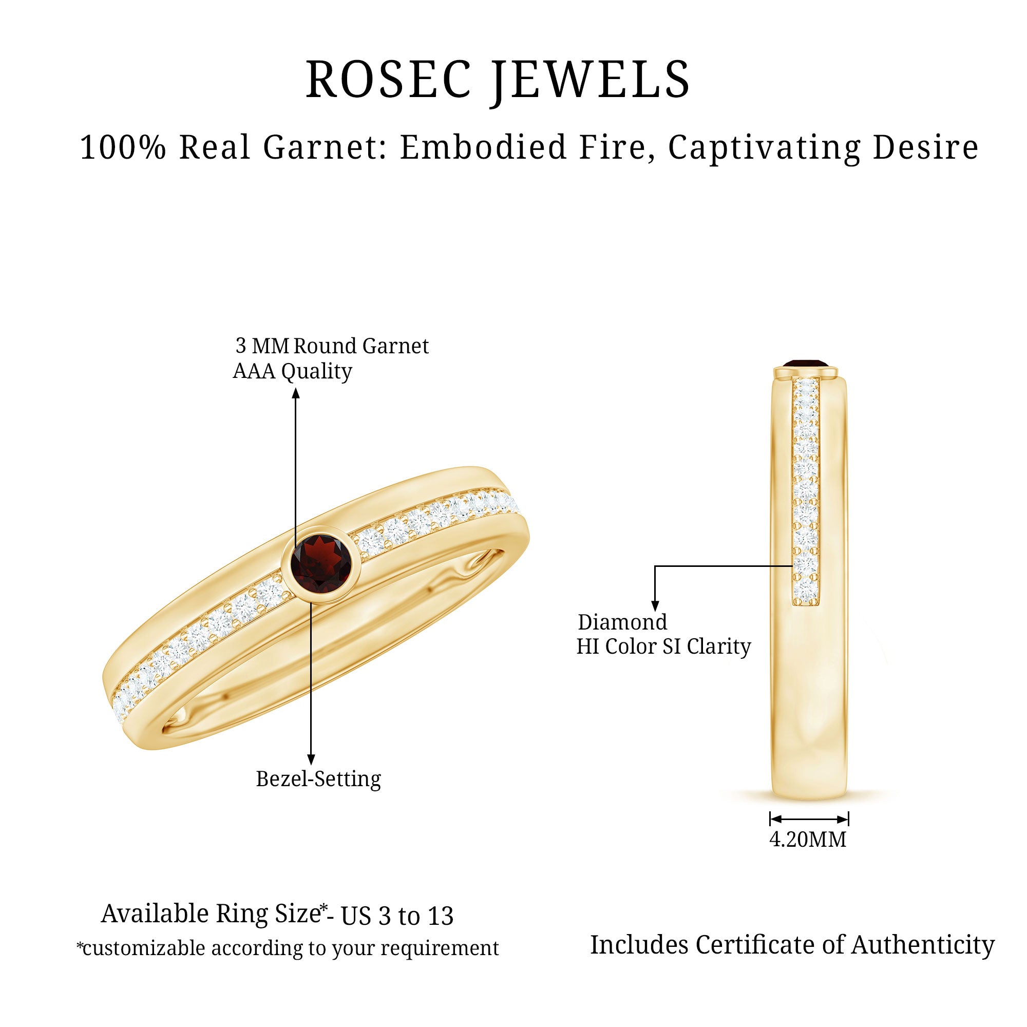 Rosec Jewels’ Garnet wedding rings featuring natural garnets, the member of silicate family of minerals and are widely cherished for their wide spectrum of colors of almost all the shades. This fantastic diversity in color helps jewelers to favor garnets while handcrafting garnet bands for men. Our artisans are also after curating January birthstone rings for wedding that are an enchanting beauty.