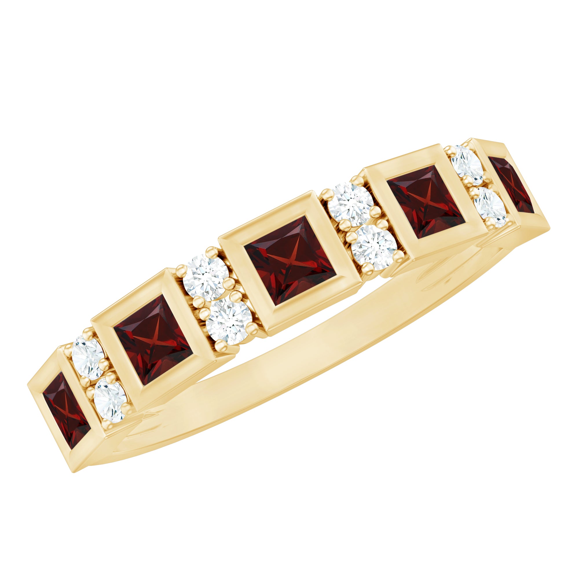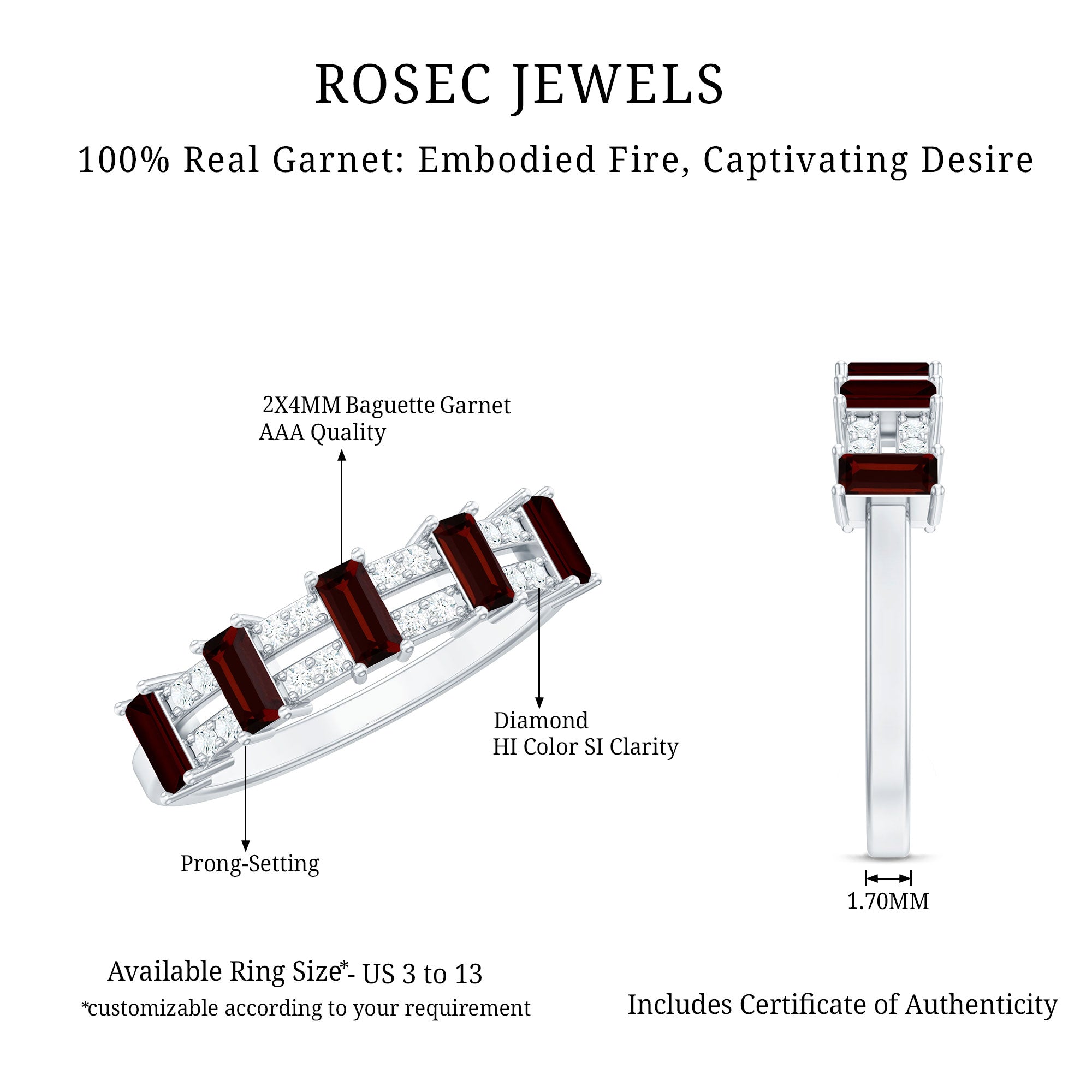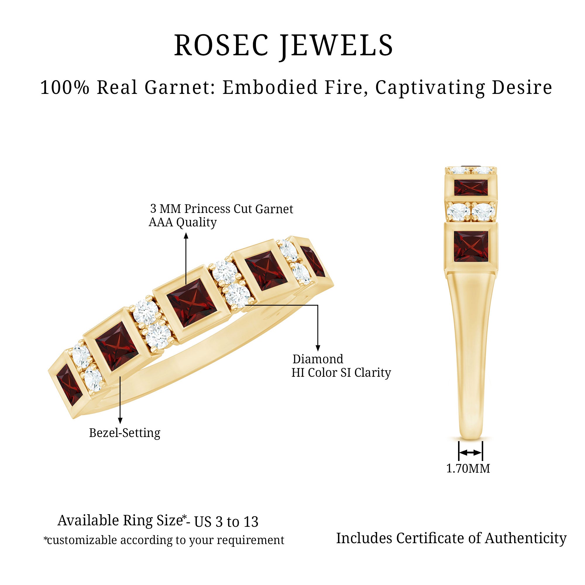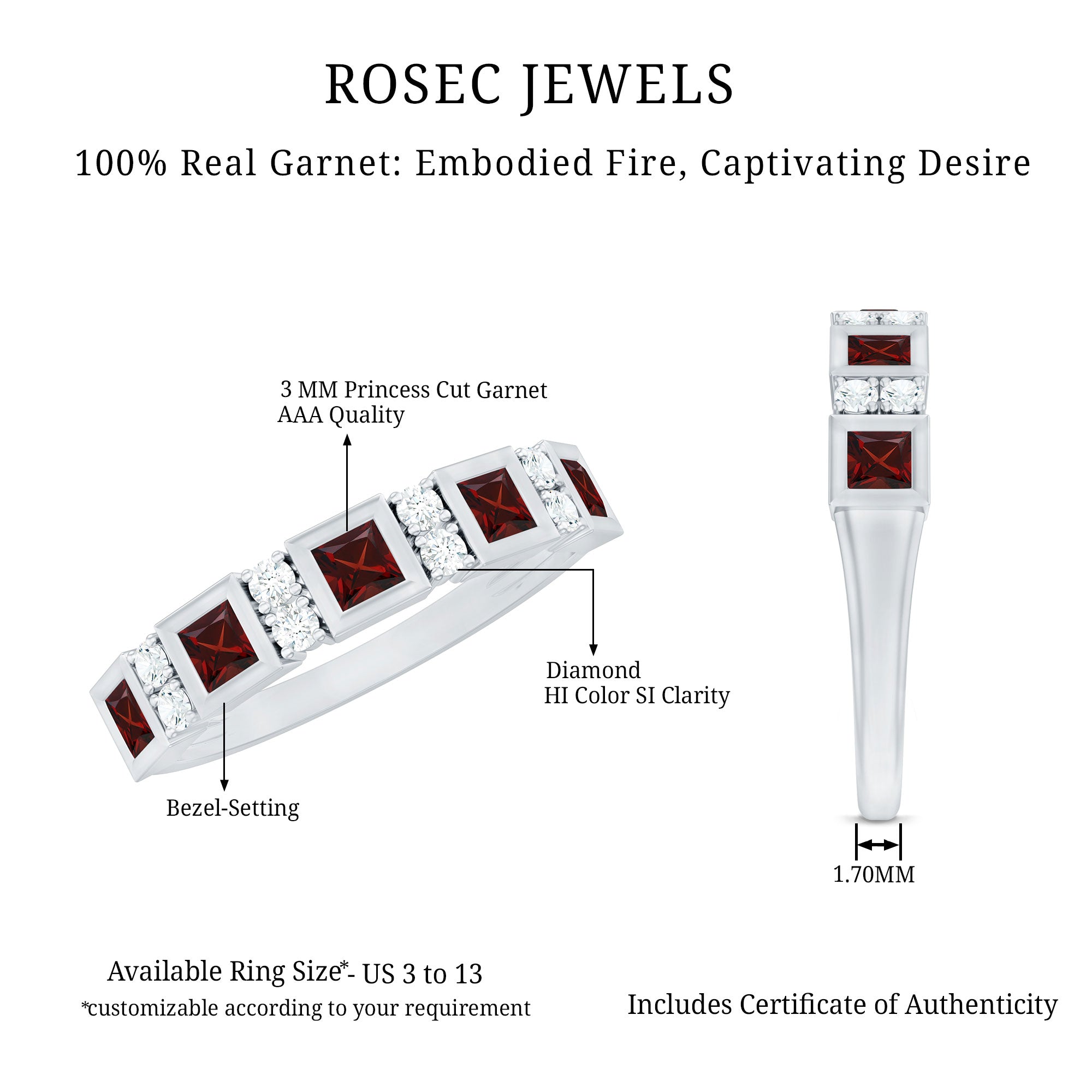 Rosec Jewels’ Garnet wedding rings featuring natural garnets, the member of silicate family of minerals and are widely cherished for their wide spectrum of colors of almost all the shades. This fantastic diversity in color helps jewelers to favor garnets while handcrafting garnet bands for men. Our artisans are also after curating January birthstone rings for wedding that are an enchanting beauty.