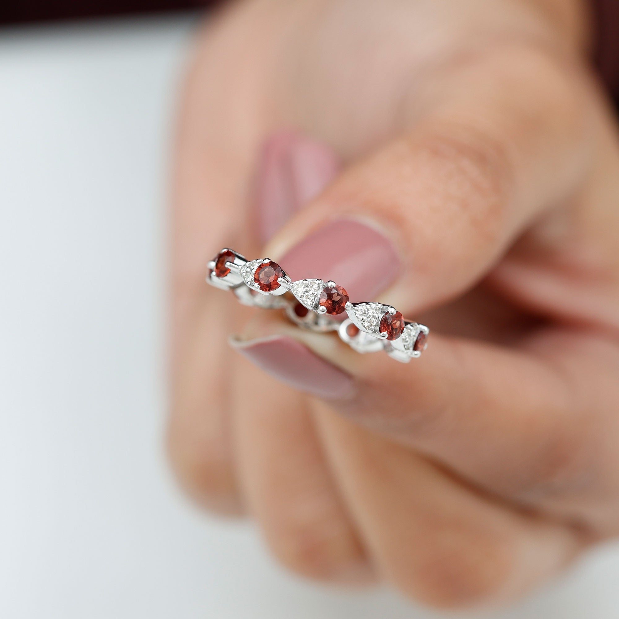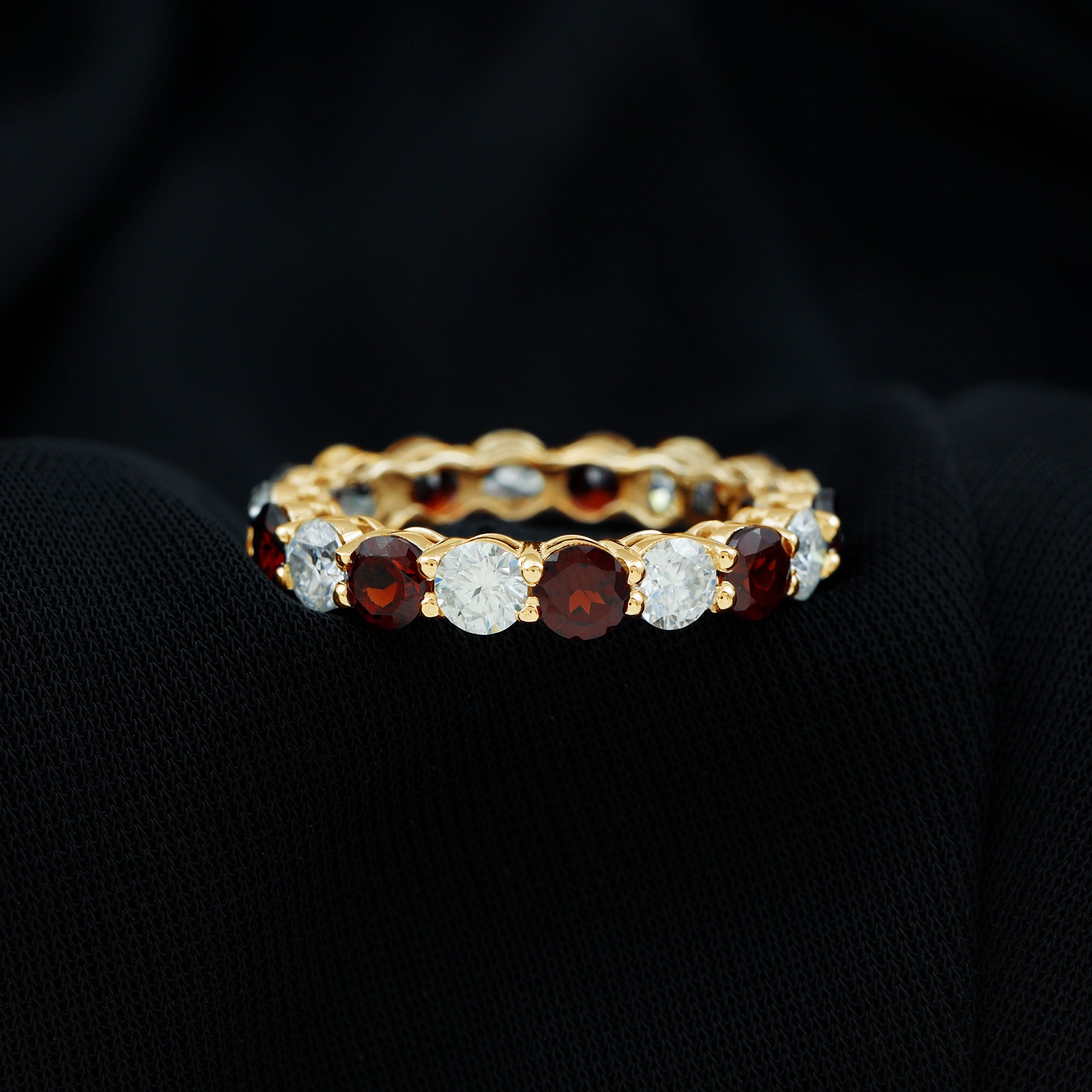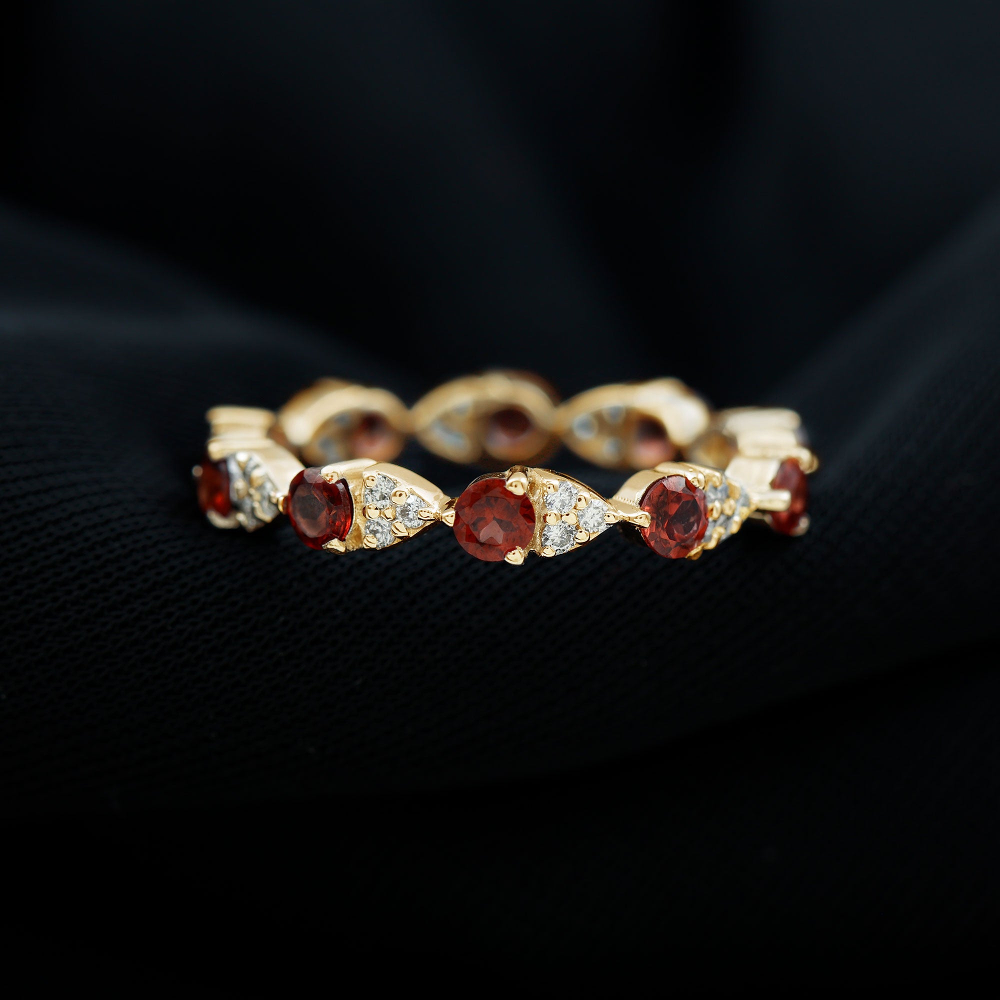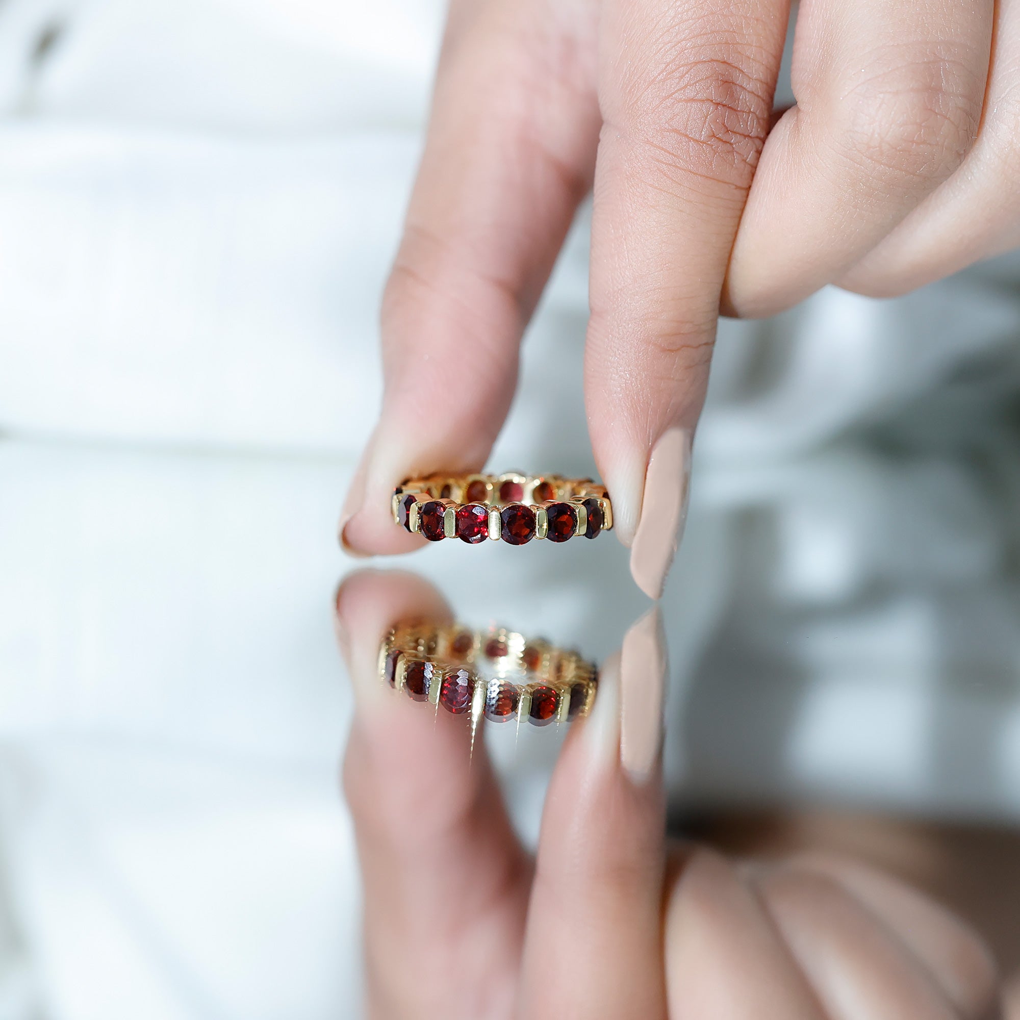 • Garnet Eternity Rings: - An eternity ring showcases a continuous circle of garnets, providing a vibrant burst of color for those seeking more than a solitaire style. With its bold red hue, a garnet eternity ring becomes a classic yet striking accessory in your jewelry collection. Moreover, a garnet and diamond ring in an eternity style offers a unique blend of color and sparkle, making it a truly exotic choice. Beyond its aesthetic appeal, this style symbolizes a love that transcends boundaries, making it a meaningful option for a garnet wedding ring.