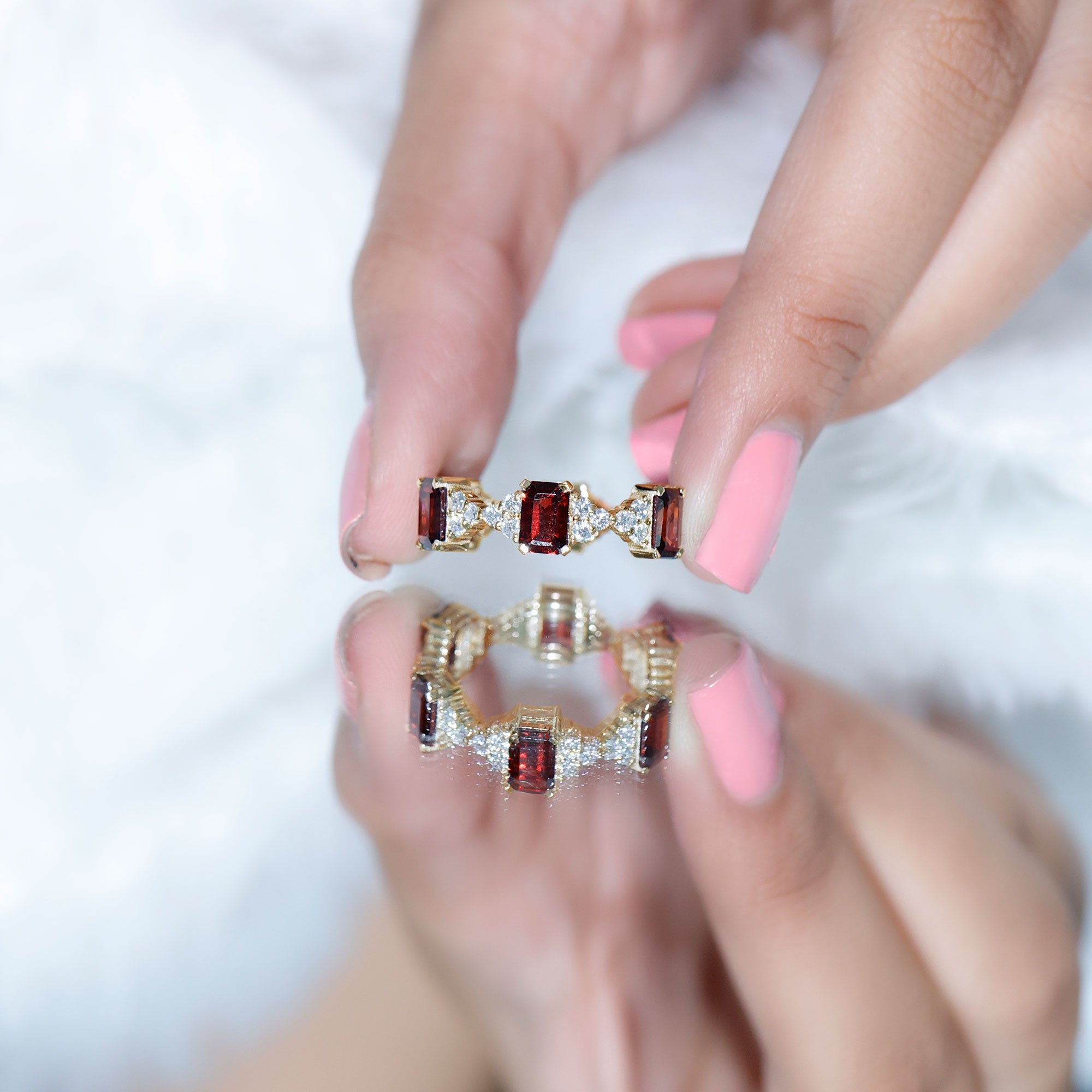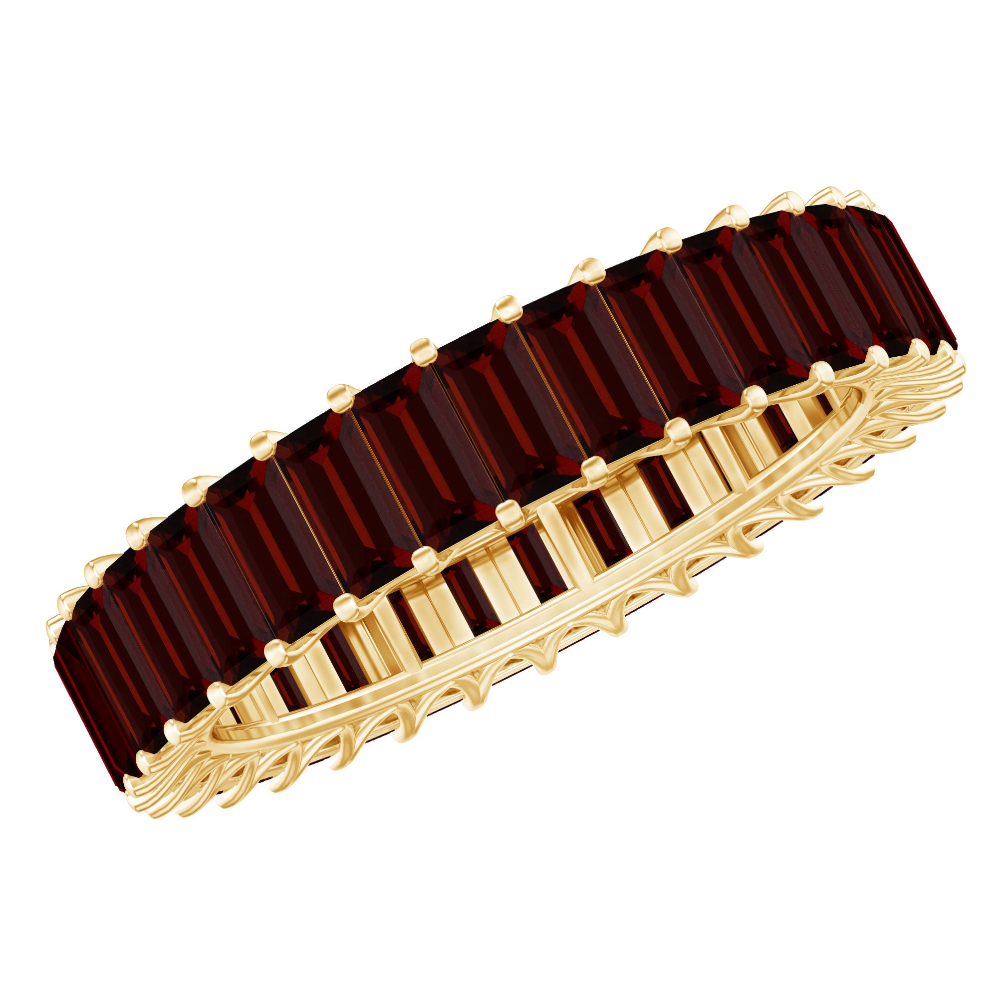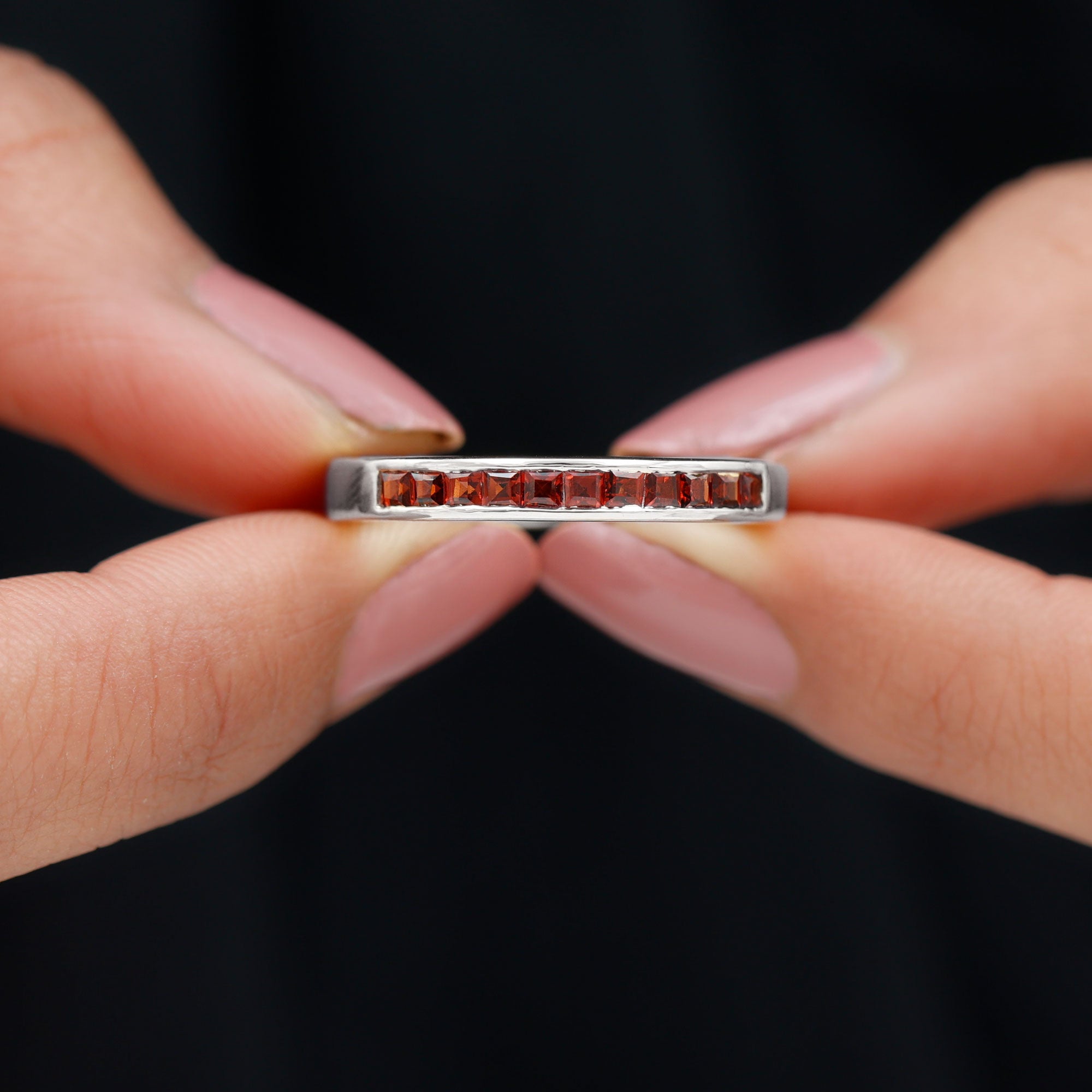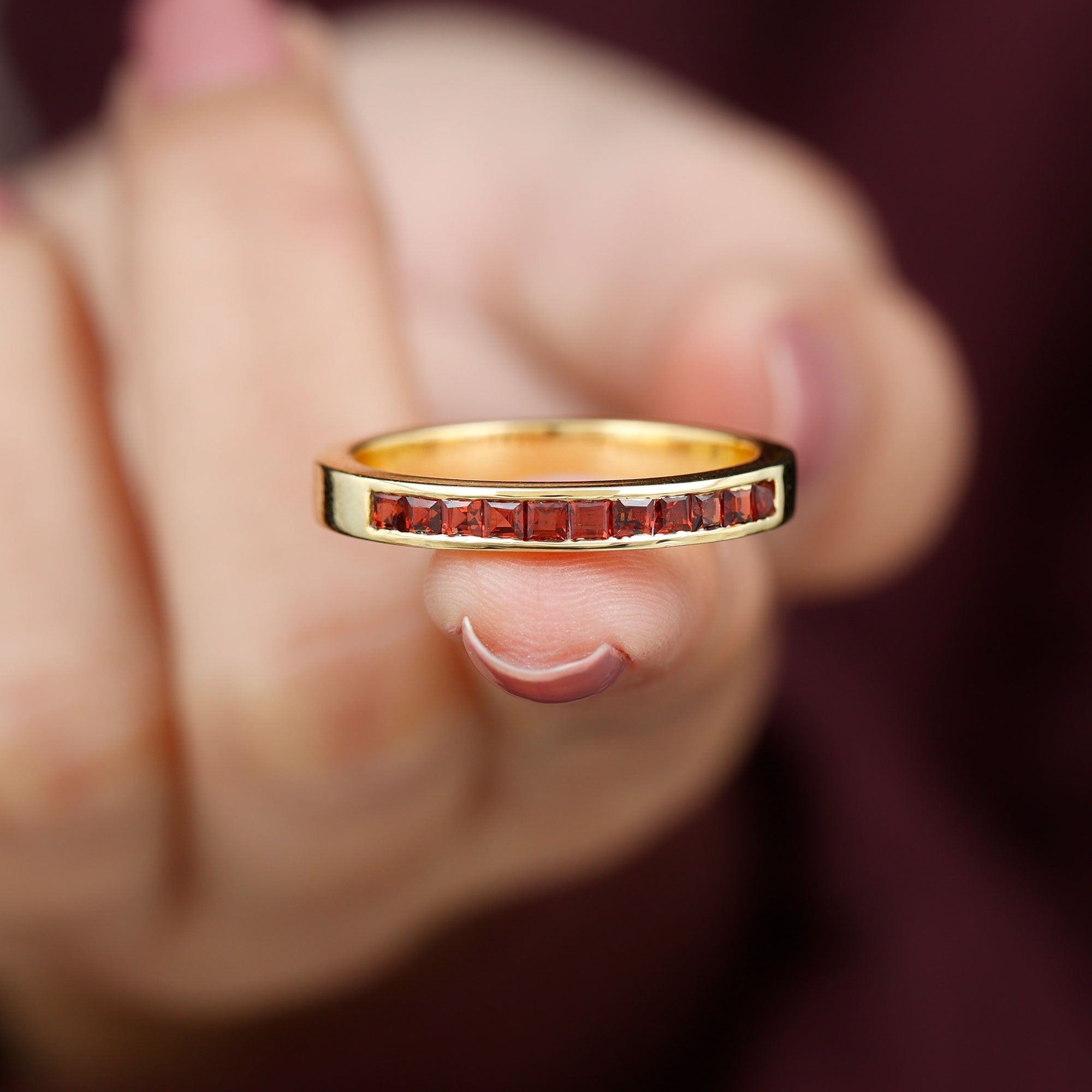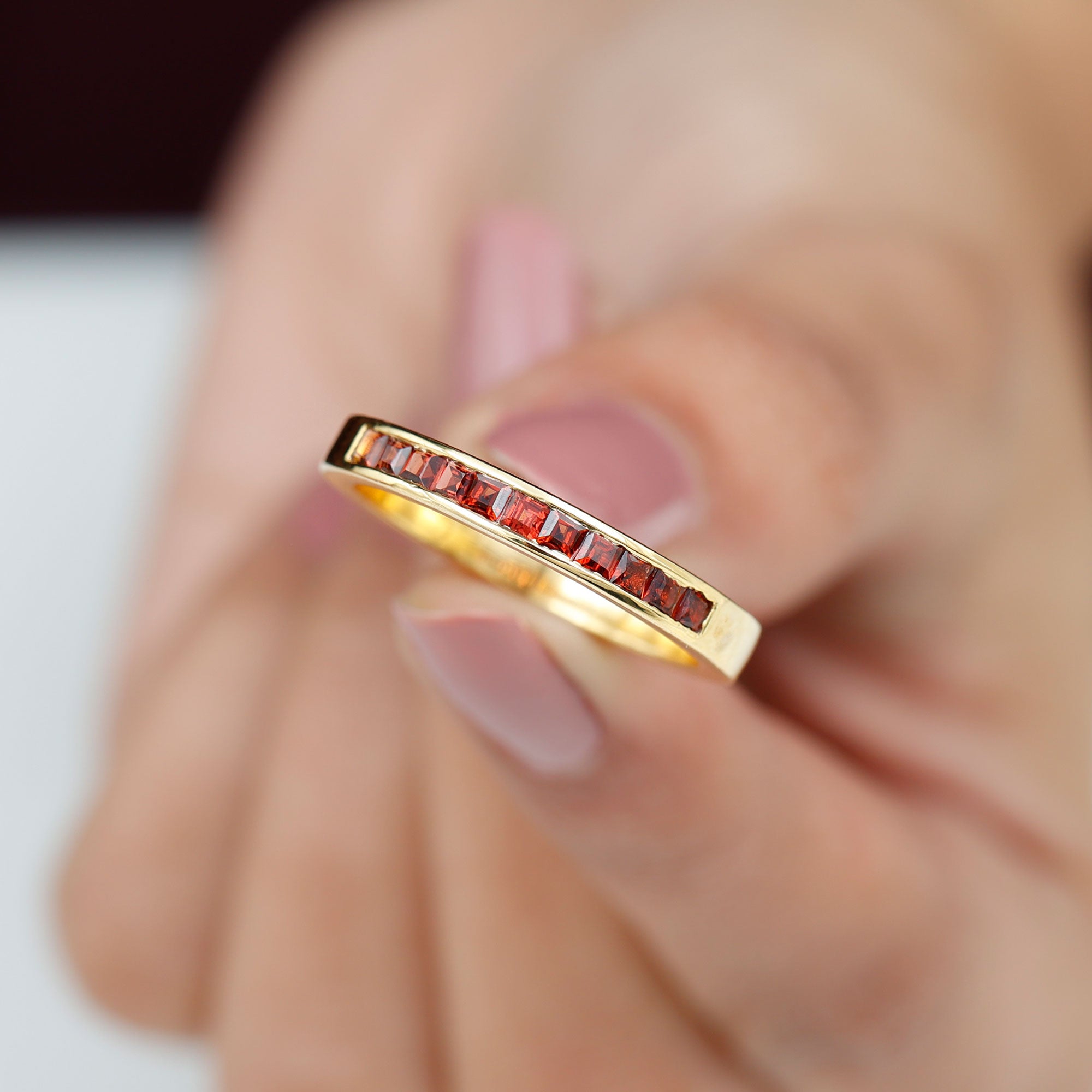 • Garnet Eternity Rings: - An eternity ring showcases a continuous circle of garnets, providing a vibrant burst of color for those seeking more than a solitaire style. With its bold red hue, a garnet eternity ring becomes a classic yet striking accessory in your jewelry collection. Moreover, a garnet and diamond ring in an eternity style offers a unique blend of color and sparkle, making it a truly exotic choice. Beyond its aesthetic appeal, this style symbolizes a love that transcends boundaries, making it a meaningful option for a garnet wedding ring.