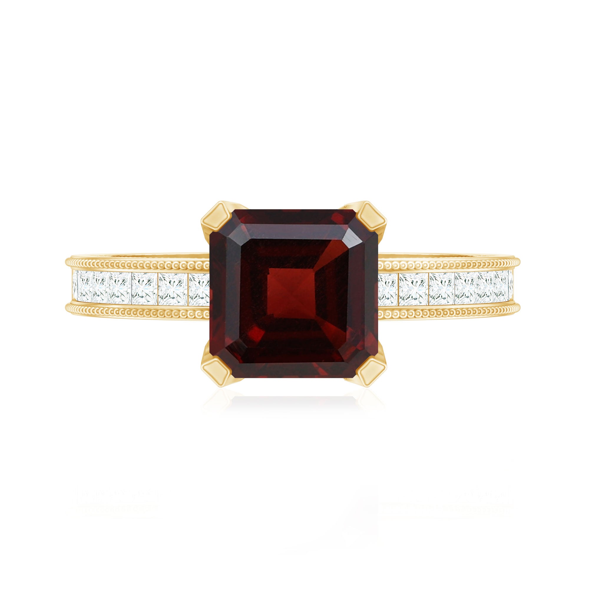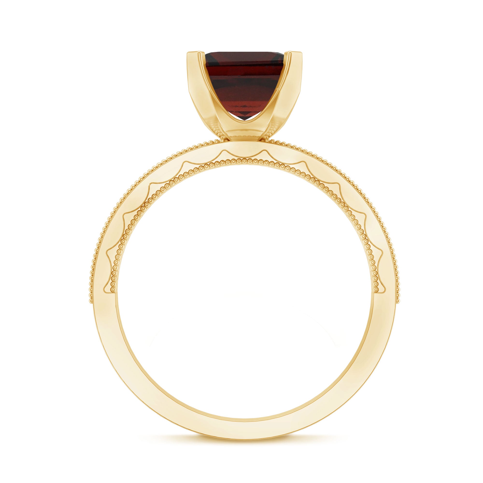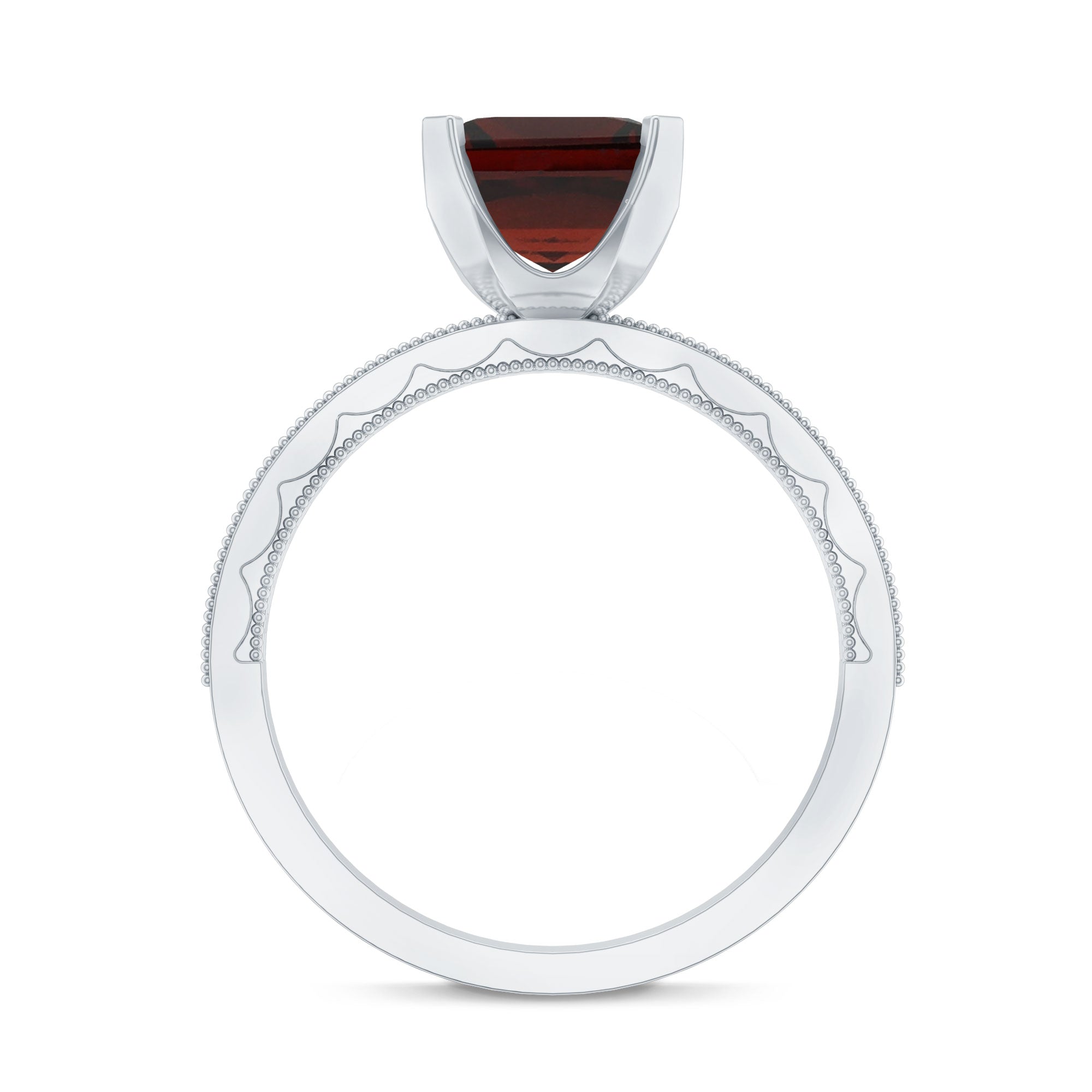 • Garnet Solitaire Rings: - Truly the most traditional option for a garnet engagement rings, the Solitaire Style emphasizes the singular centerpiece of garnet. What's great about this style is its versatility, appealing to various aesthetics. While a round cut garnet solitaire ring might be the classic choice. You can also opt for fancier cuts such as marquise, pear, or princess shapes to add a contemporary touch. For those seeking a vintage vibe then an asscher, cushion, or emerald cut garnet engagement ring will be the ideal choice.