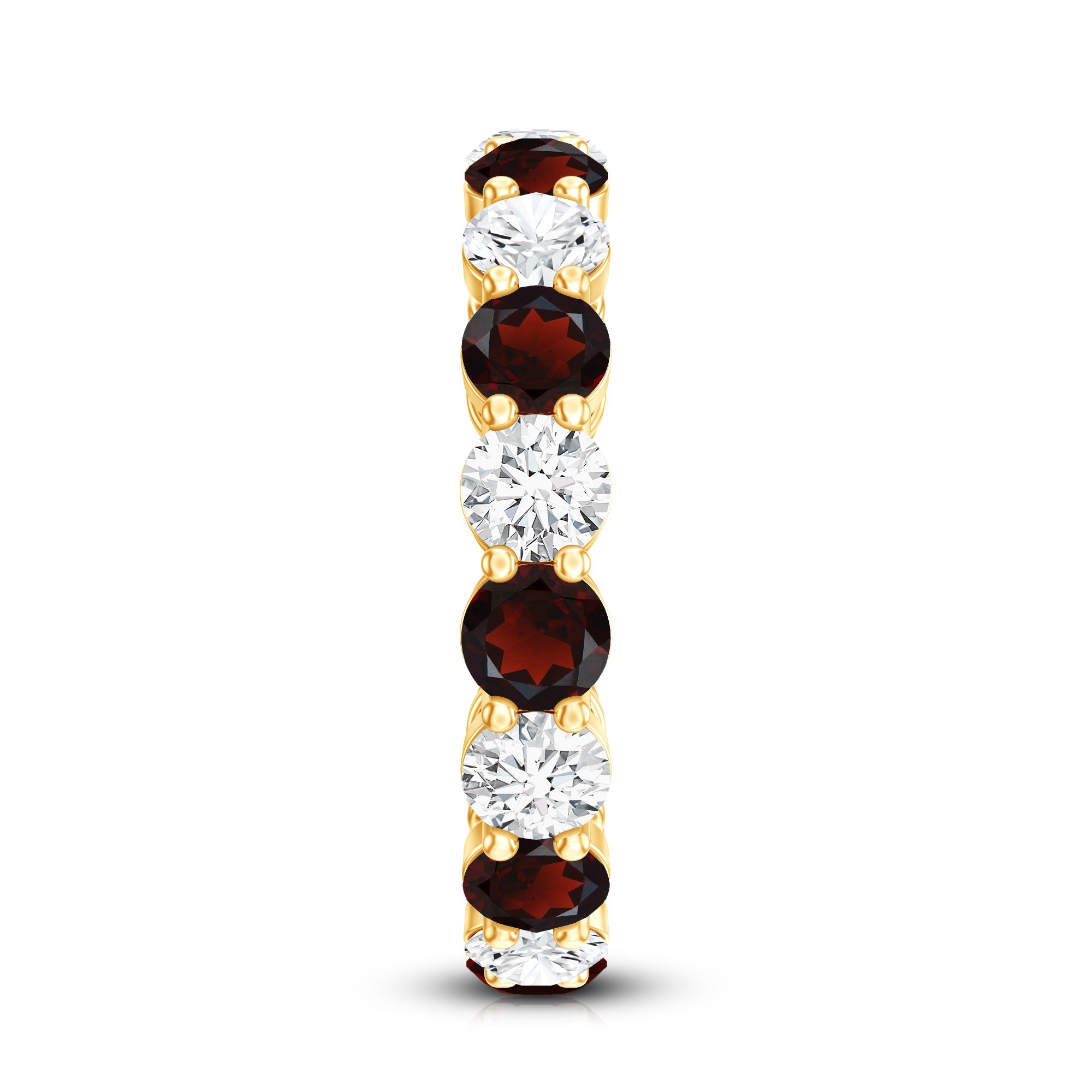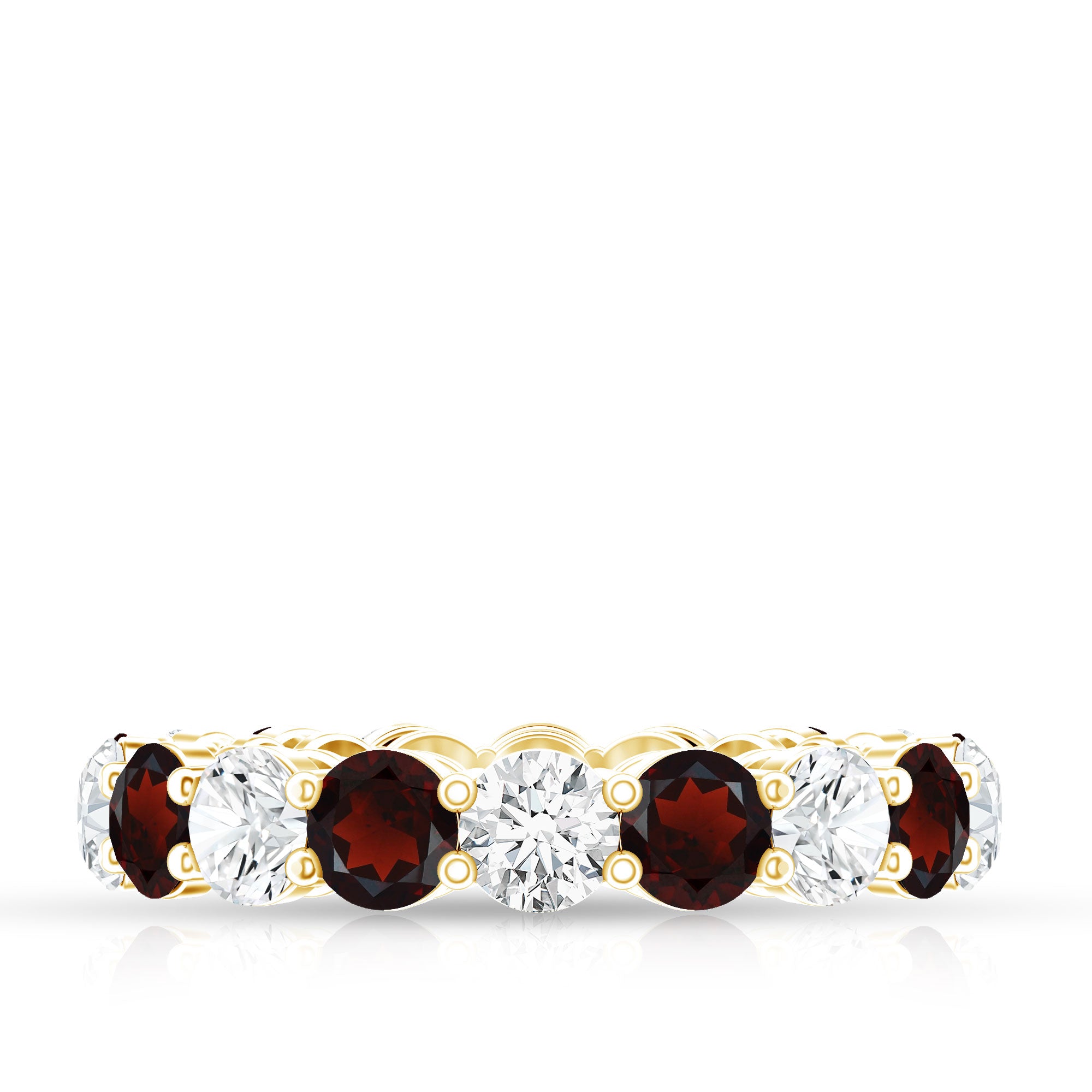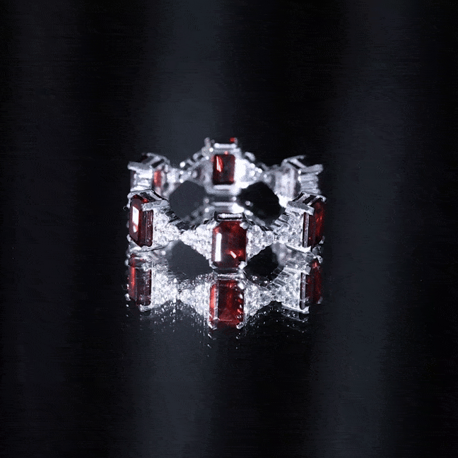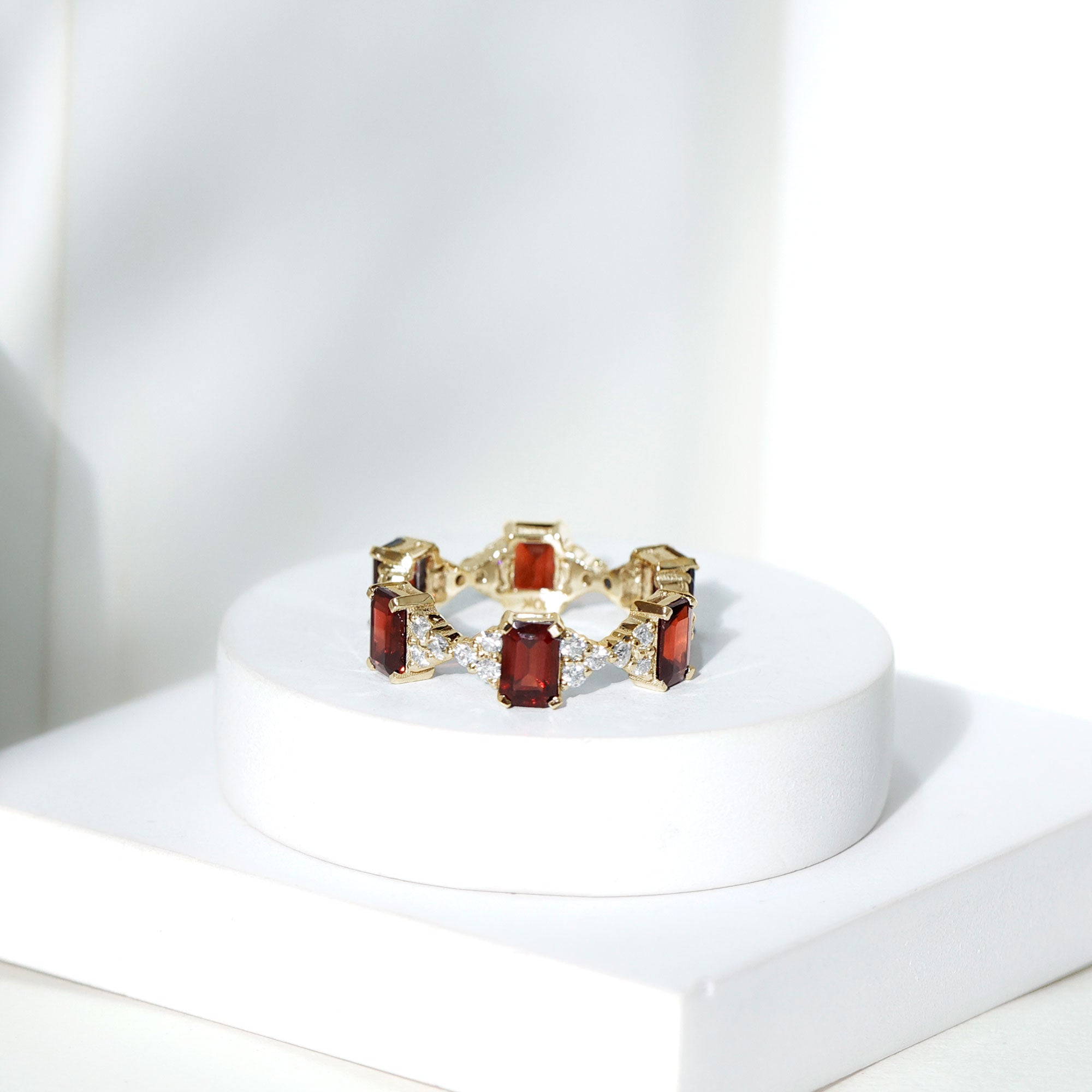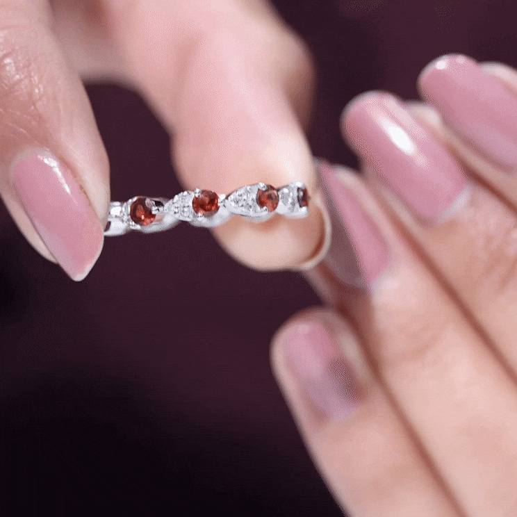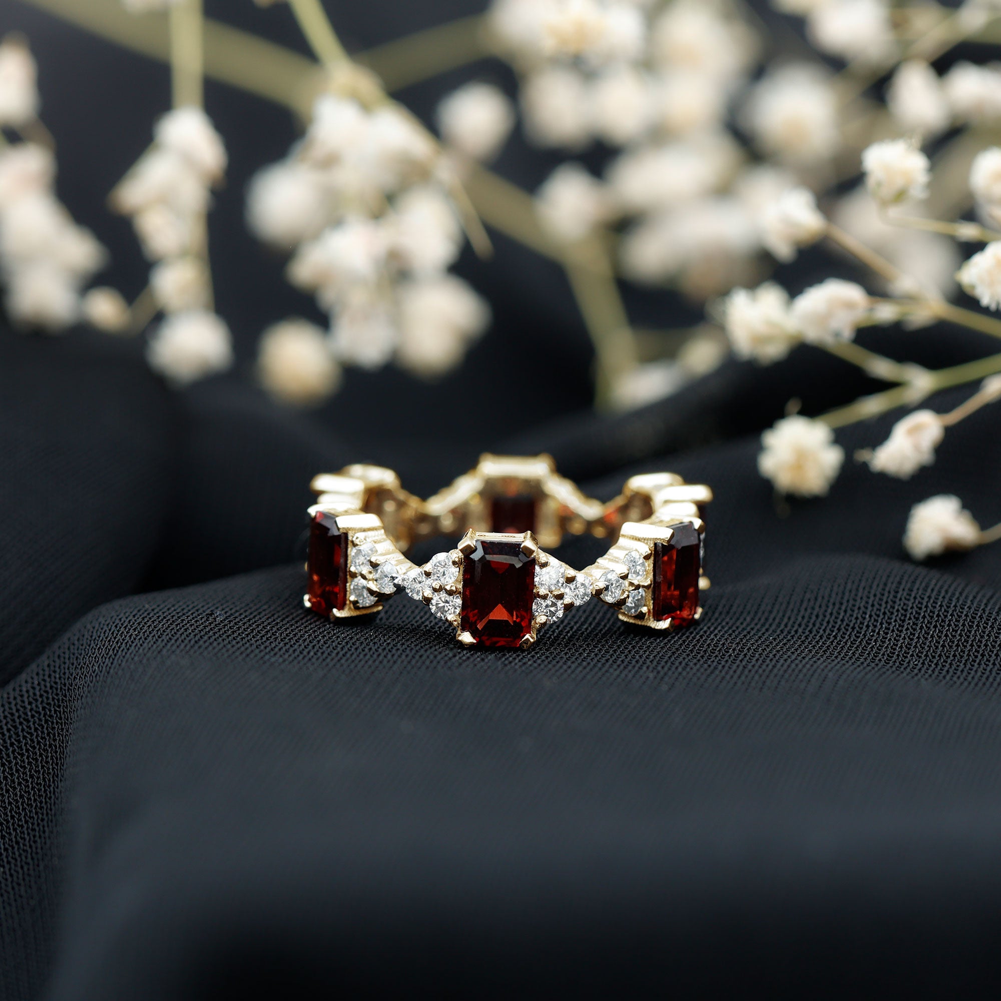 Garnet Eternity Rings: - An eternity ring showcases a continuous circle of garnets, providing a vibrant burst of color for those seeking more than a solitaire style. With its bold red hue, a garnet eternity ring becomes a classic yet striking accessory in your jewelry collection. Moreover, a garnet and diamond ring in an eternity style offers a unique blend of color and sparkle, making it a truly exotic choice. Beyond its aesthetic appeal, this style symbolizes a love that transcends boundaries, making it a meaningful option for a garnet wedding ring.
