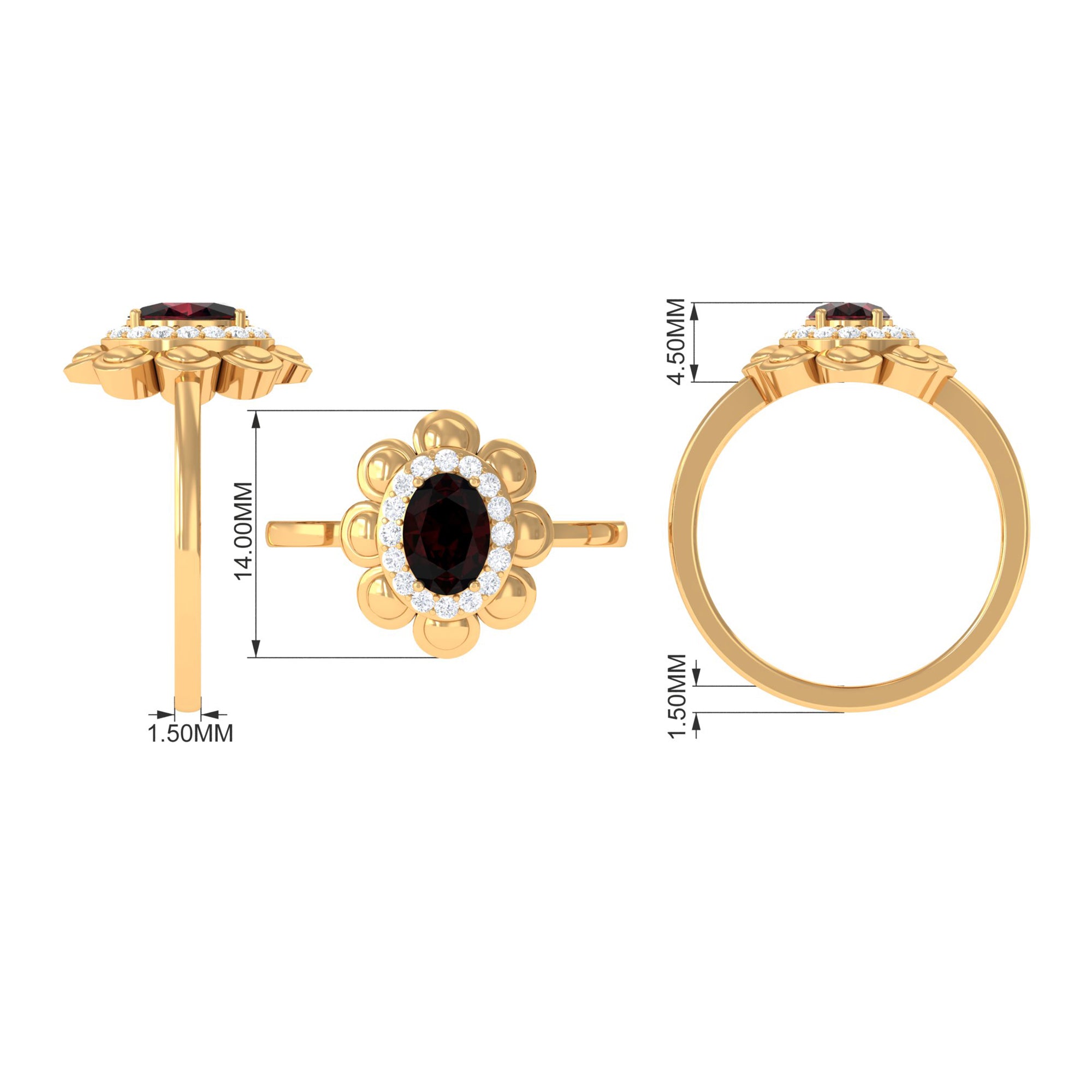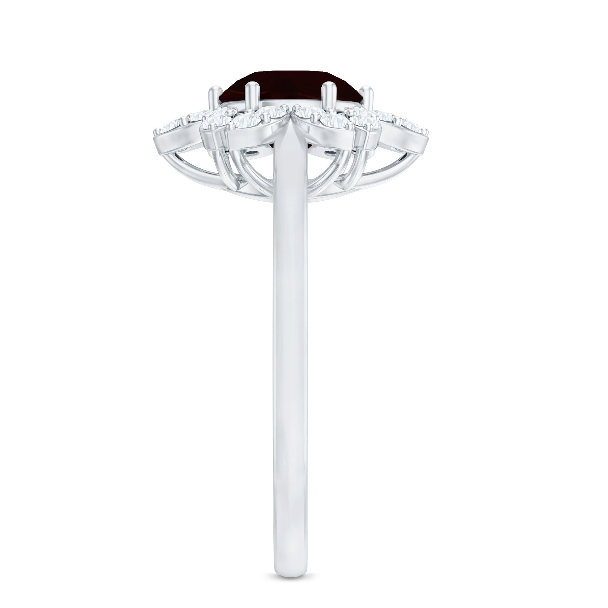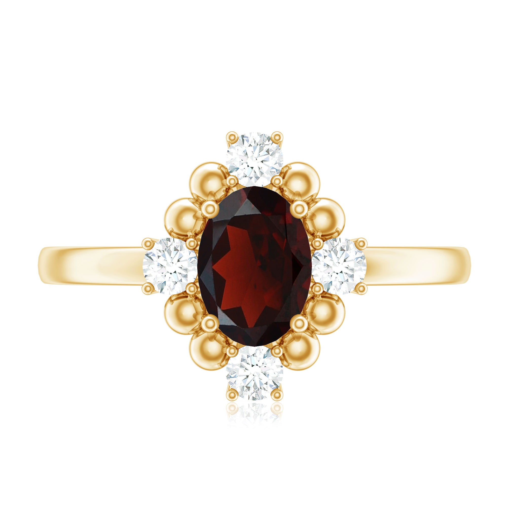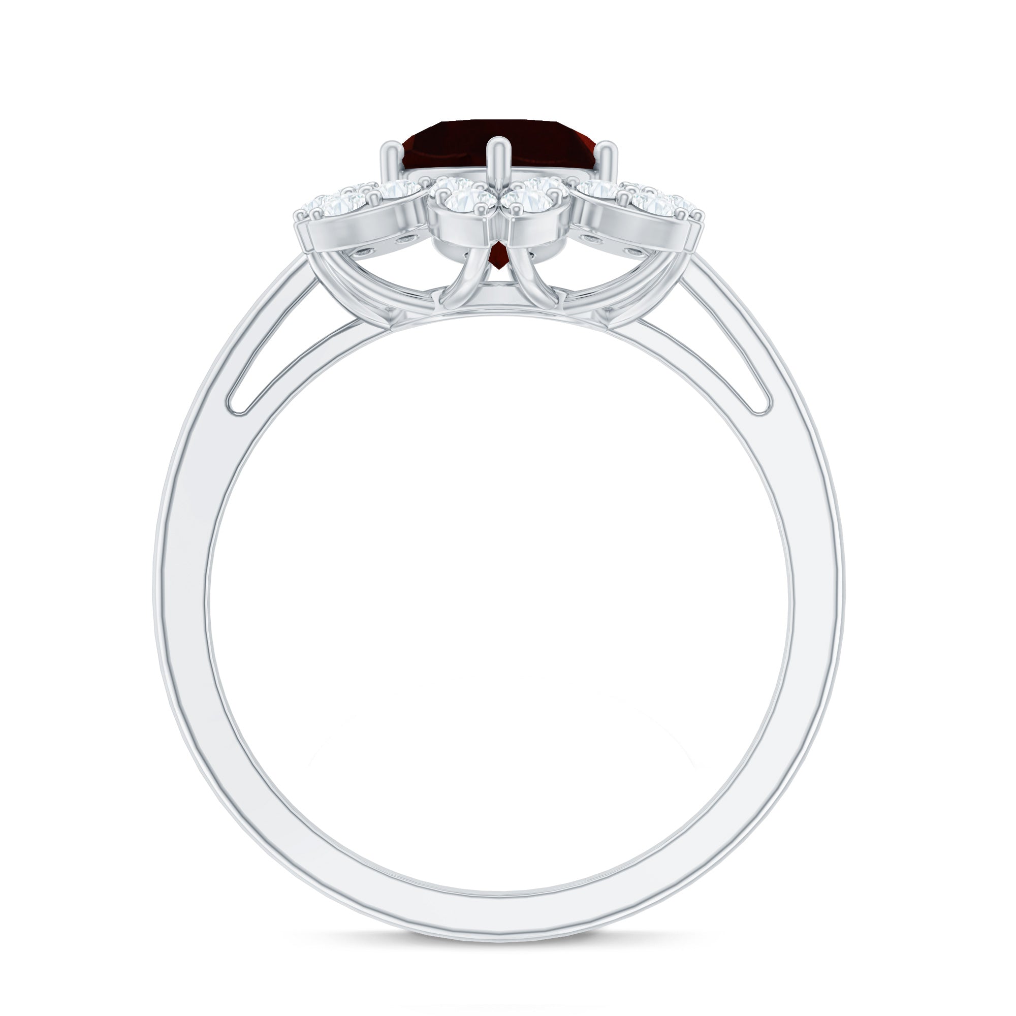 Garnet Halo Rings: - A fascinating twist on the traditional Solitaire Ring is the “halo ring”, which features a circle of diamond or moissanite surrounding the garnet solitaire. The Halo isn't just about adding sparkle; it adds versatility to the ring. Furthermore, it draws more focus to the garnet, creating the illusion of a larger stone. The halo style makes the ring more unique and attractive.