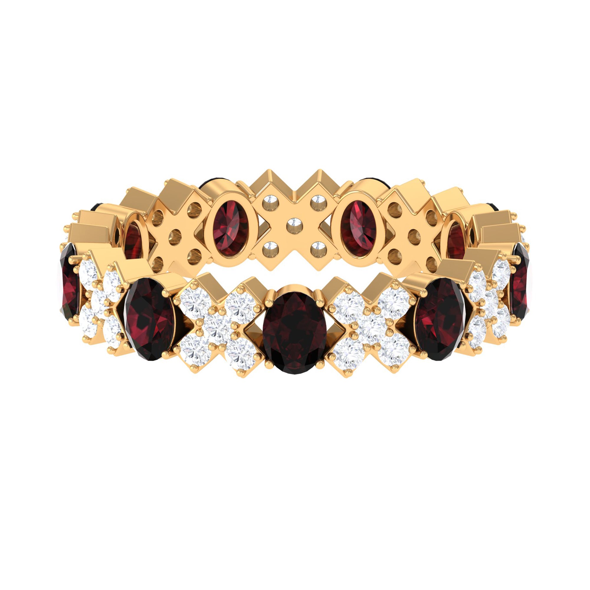 Garnet Eternity Rings: - An eternity ring showcases a continuous circle of garnets, providing a vibrant burst of color for those seeking more than a solitaire style. With its bold red hue, a garnet eternity ring becomes a classic yet striking accessory in your jewelry collection. Moreover, a garnet and diamond ring in an eternity style offers a unique blend of color and sparkle, making it a truly exotic choice. Beyond its aesthetic appeal, this style symbolizes a love that transcends boundaries, making it a meaningful option for a garnet wedding ring.