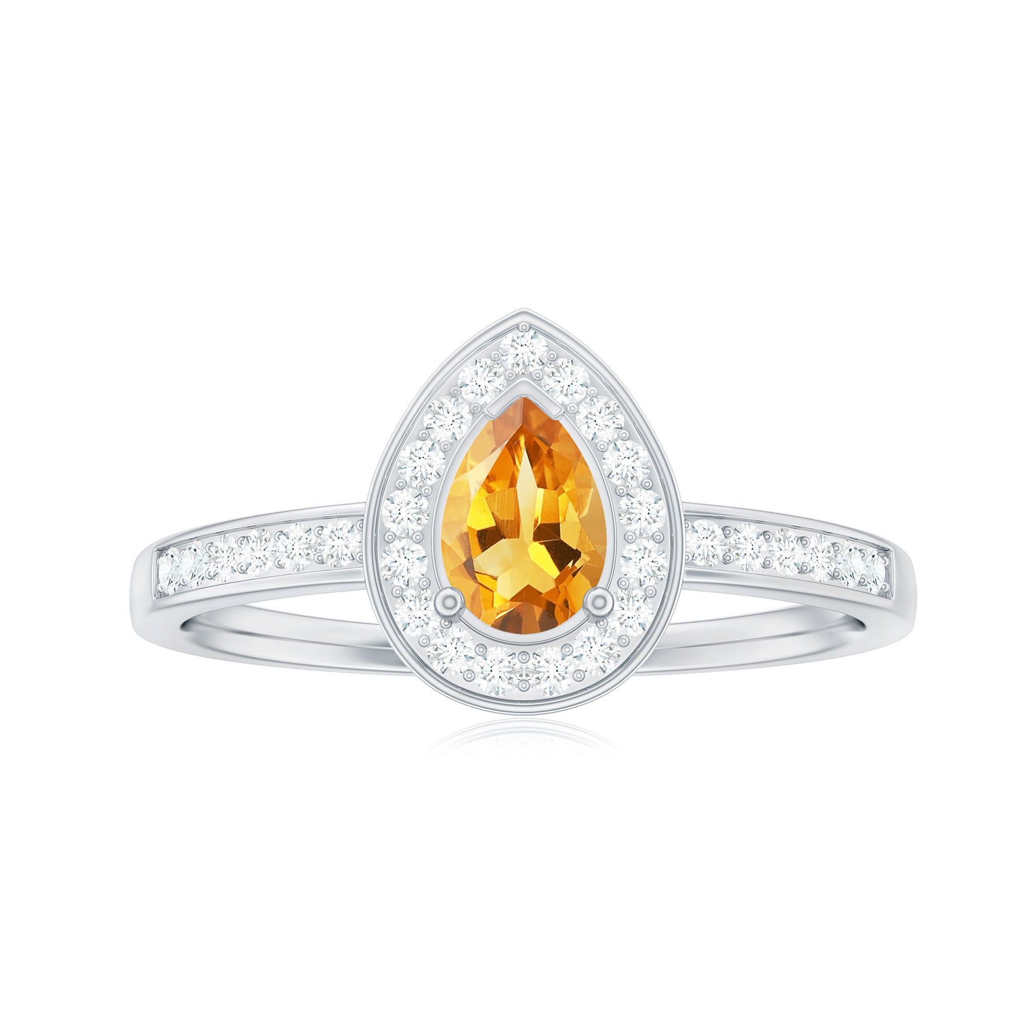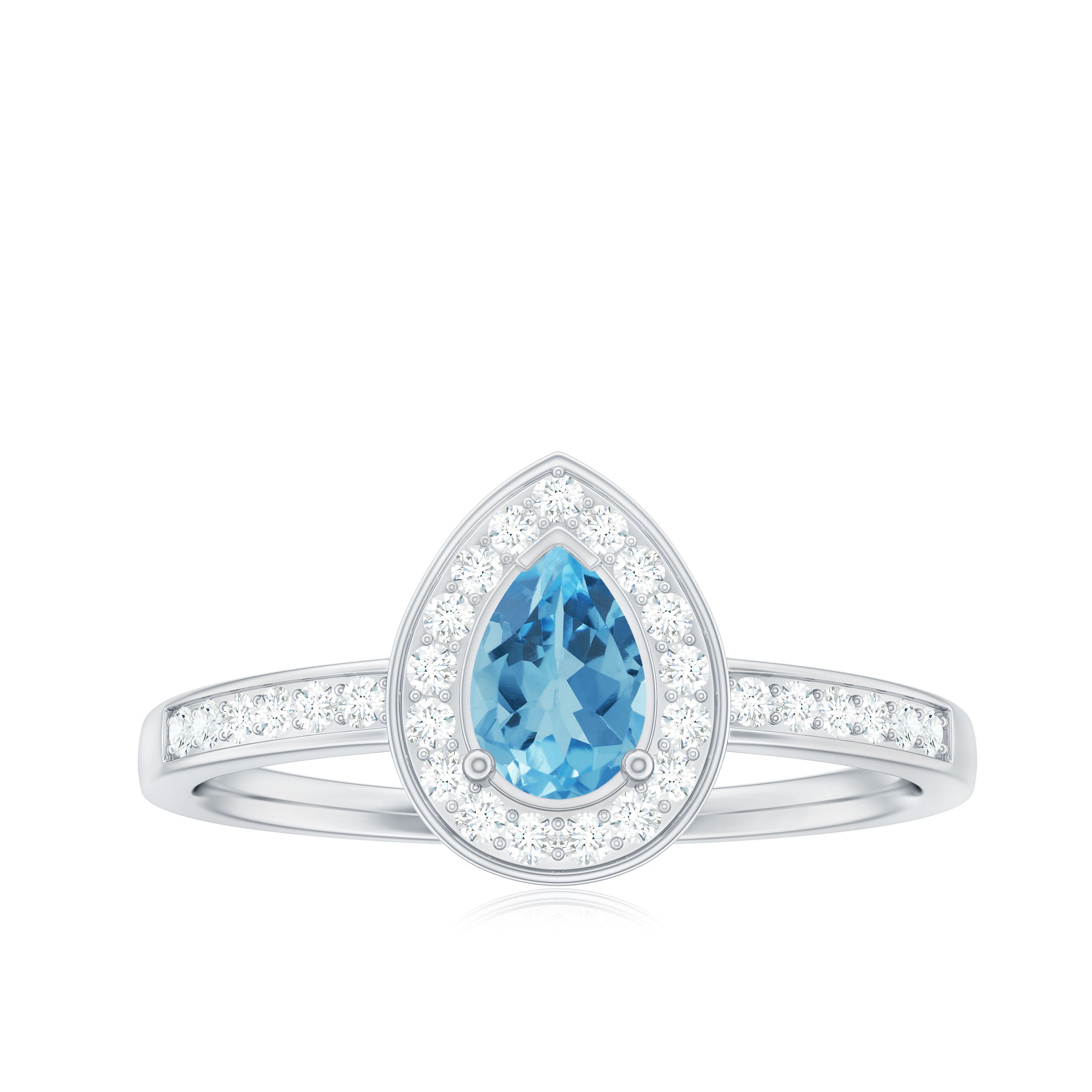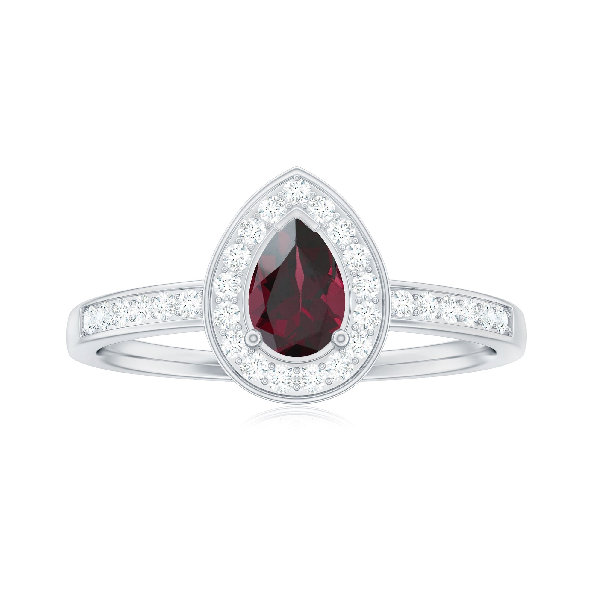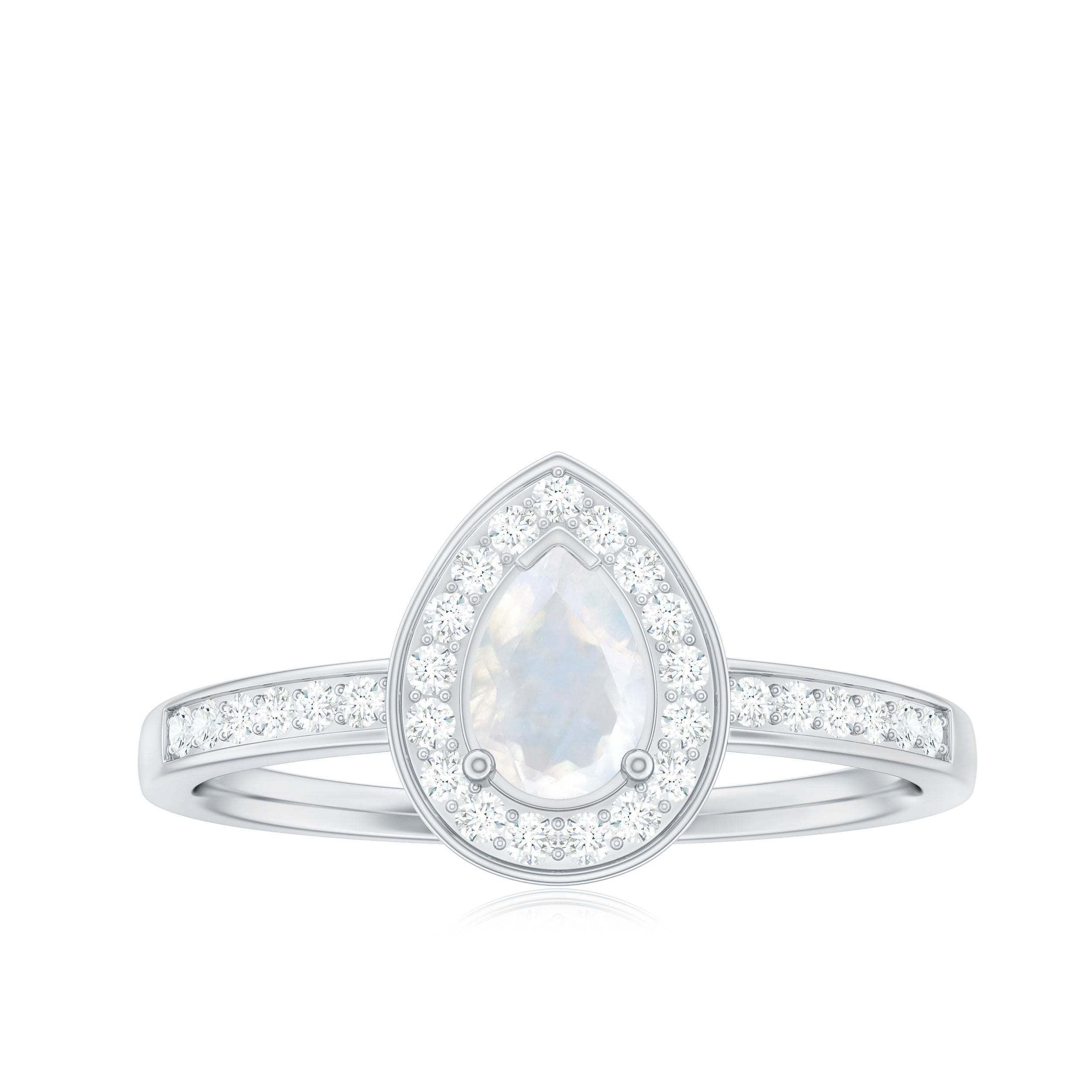 The halo highlights the pear-shaped diamond or gemstone's distinctive shape. In contrast, the diamond or gemstone oozes grace and timeless beauty, creating a beautiful ring.
