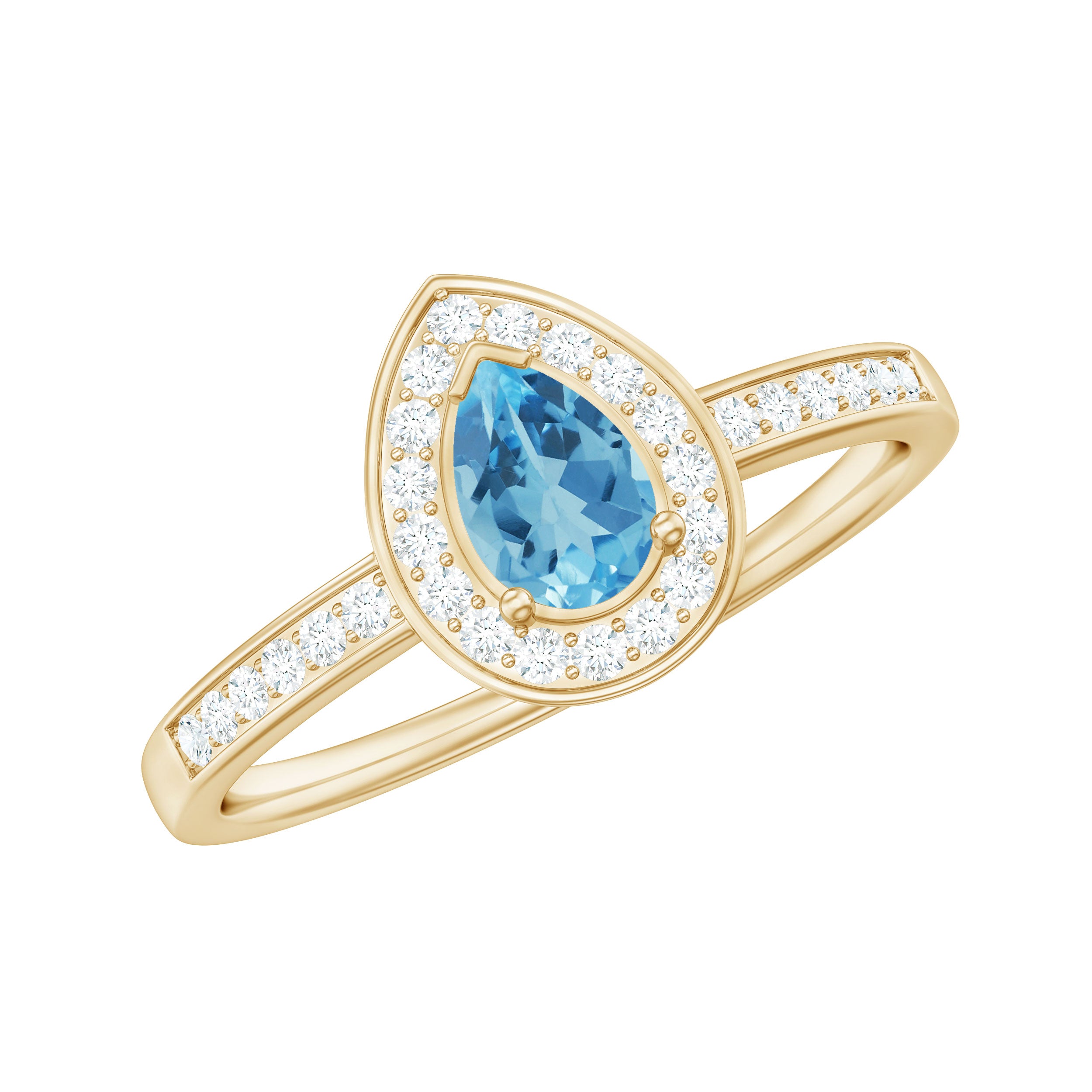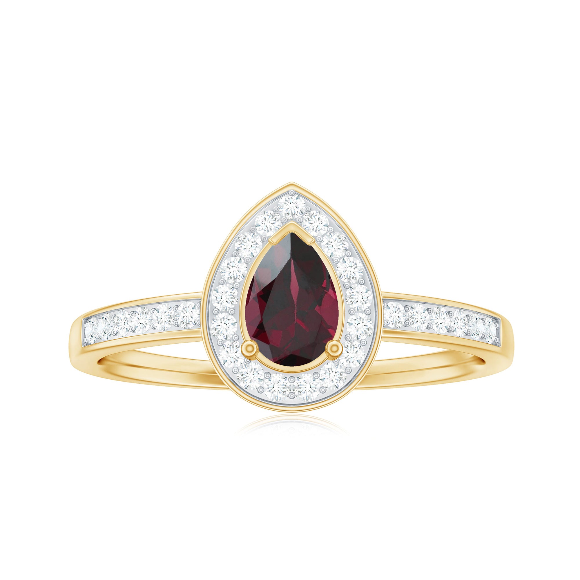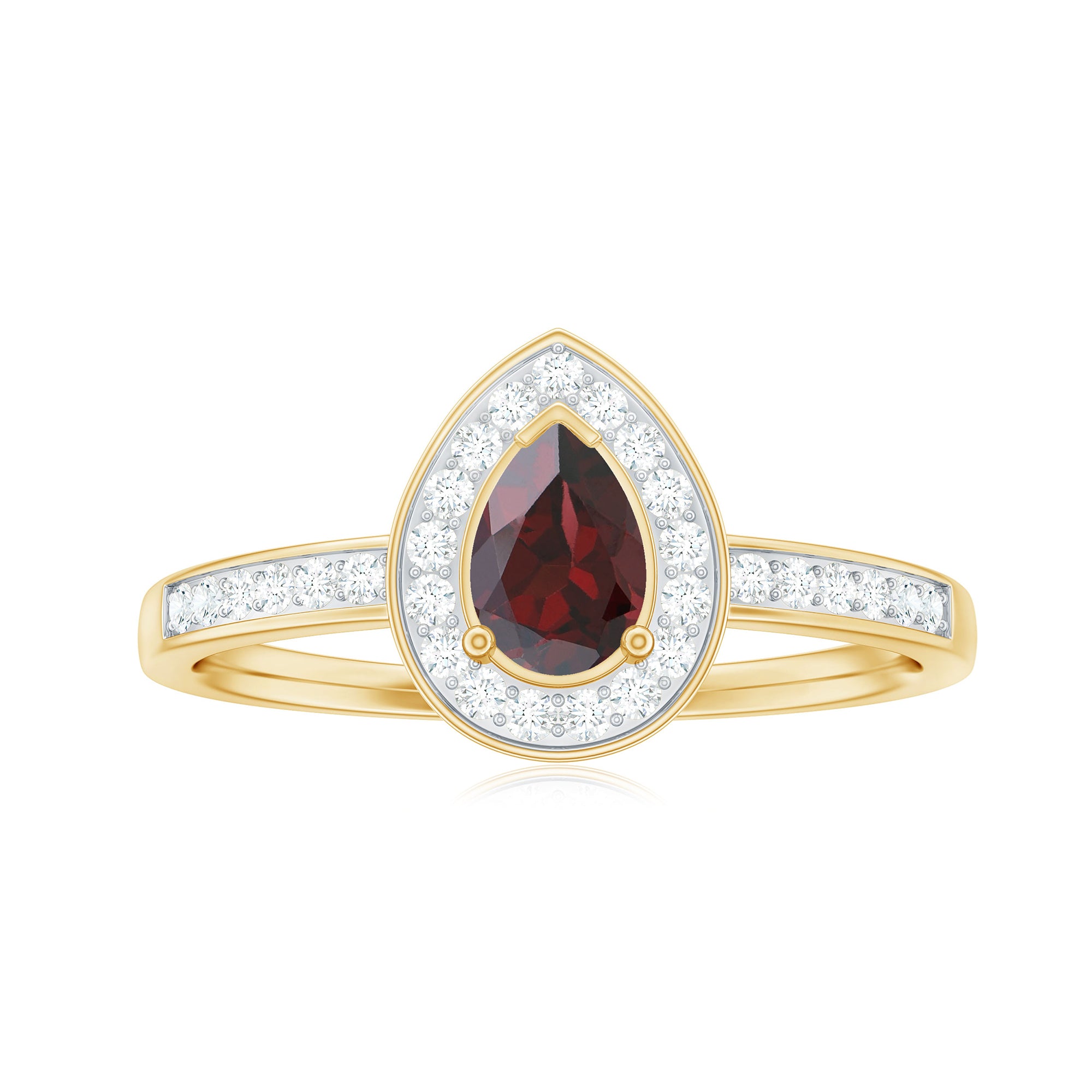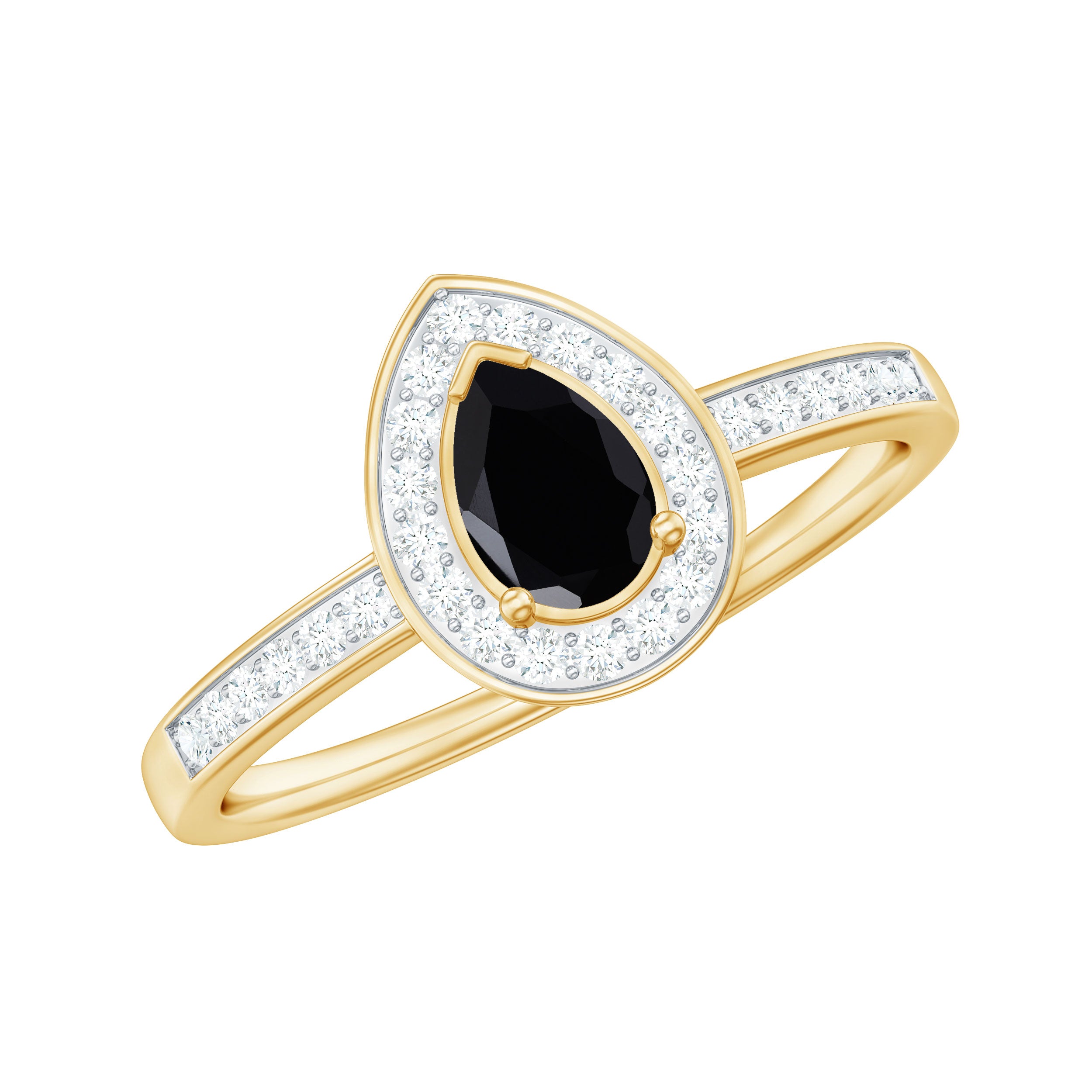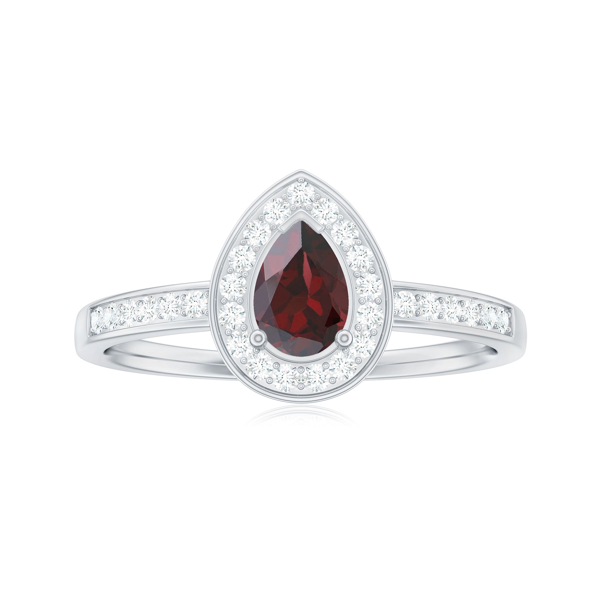 The halo highlights the pear-shaped diamond or gemstone's distinctive shape. In contrast, the diamond or gemstone oozes grace and timeless beauty, creating a beautiful ring.