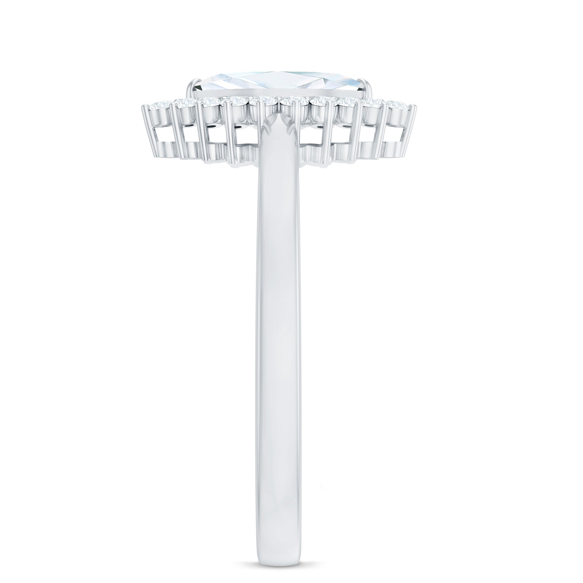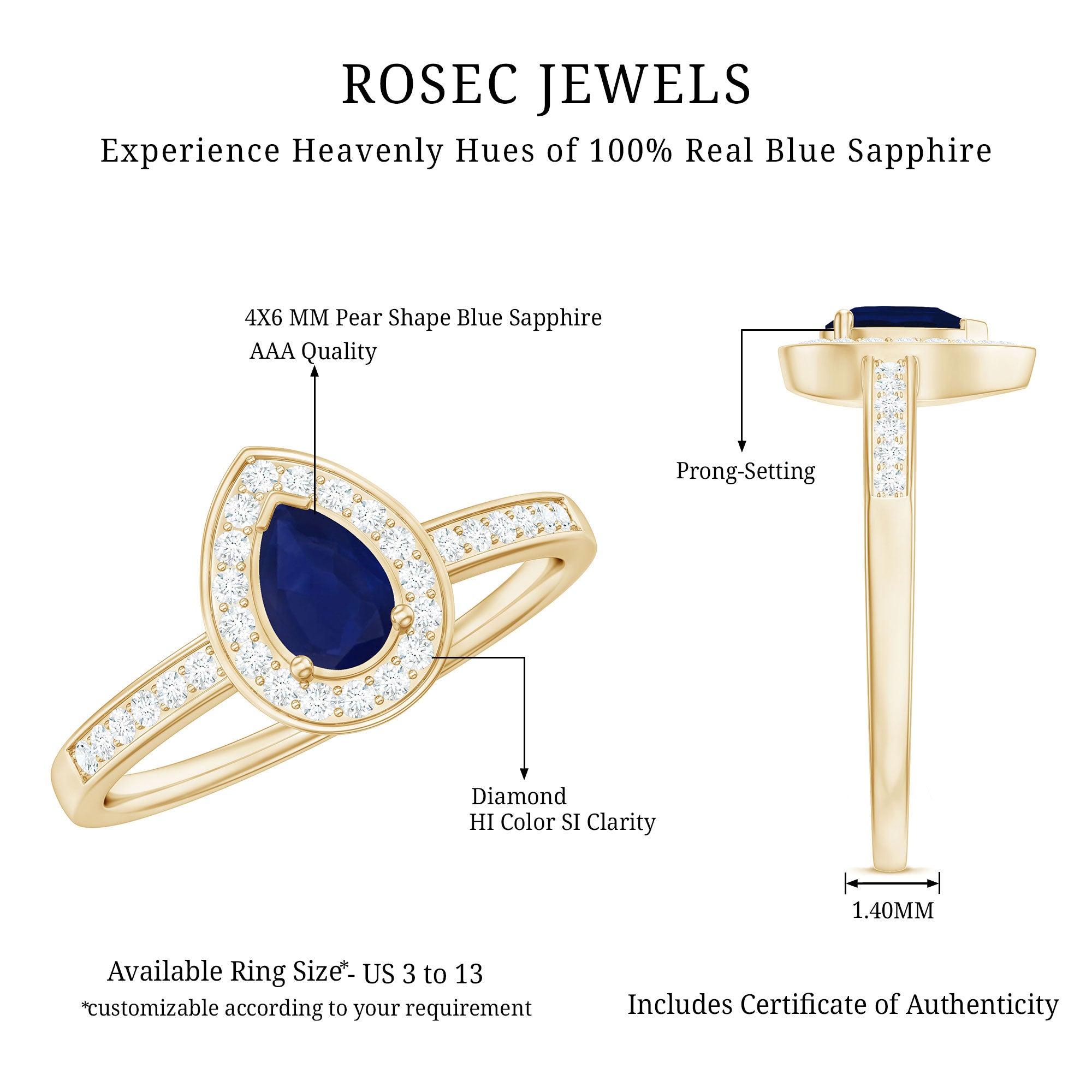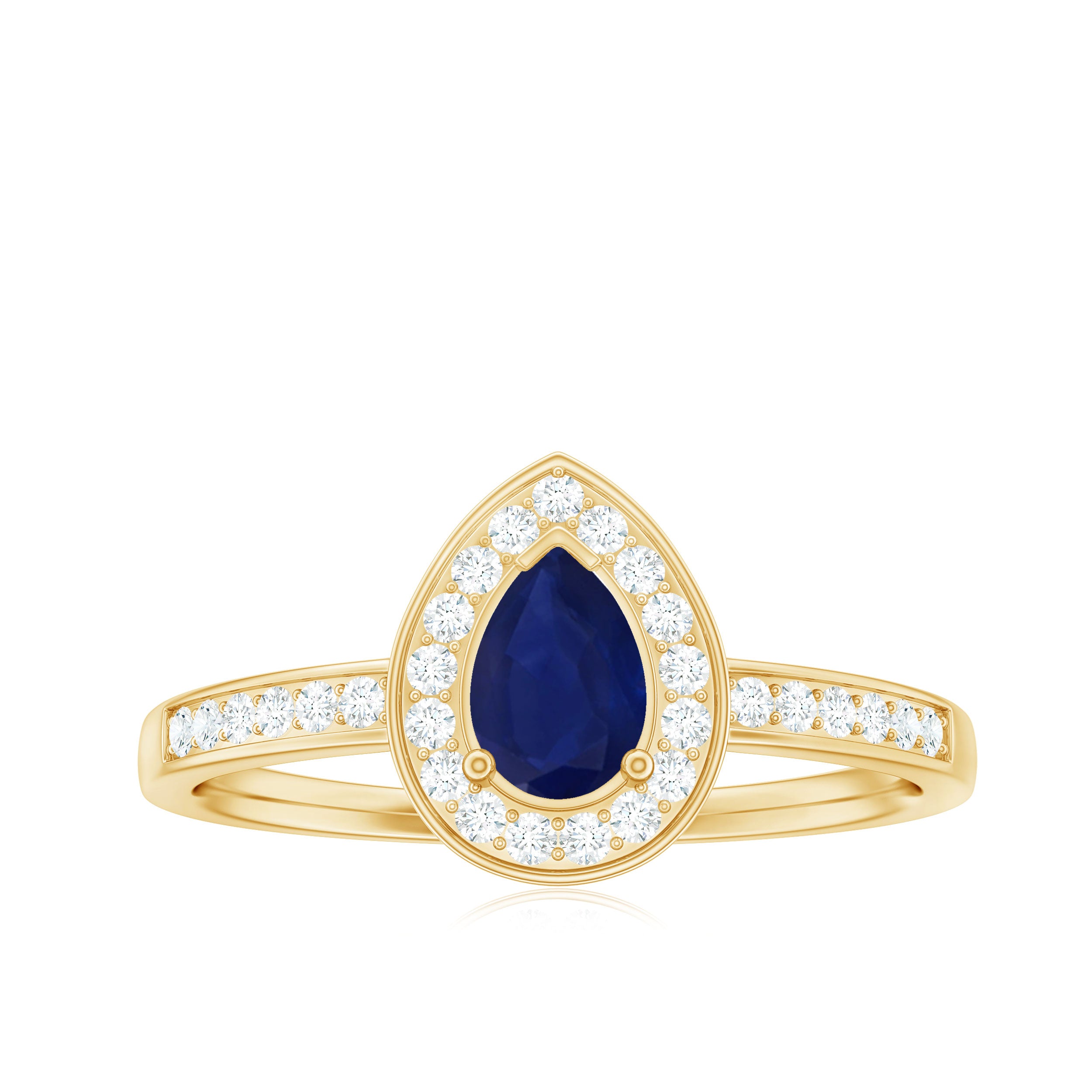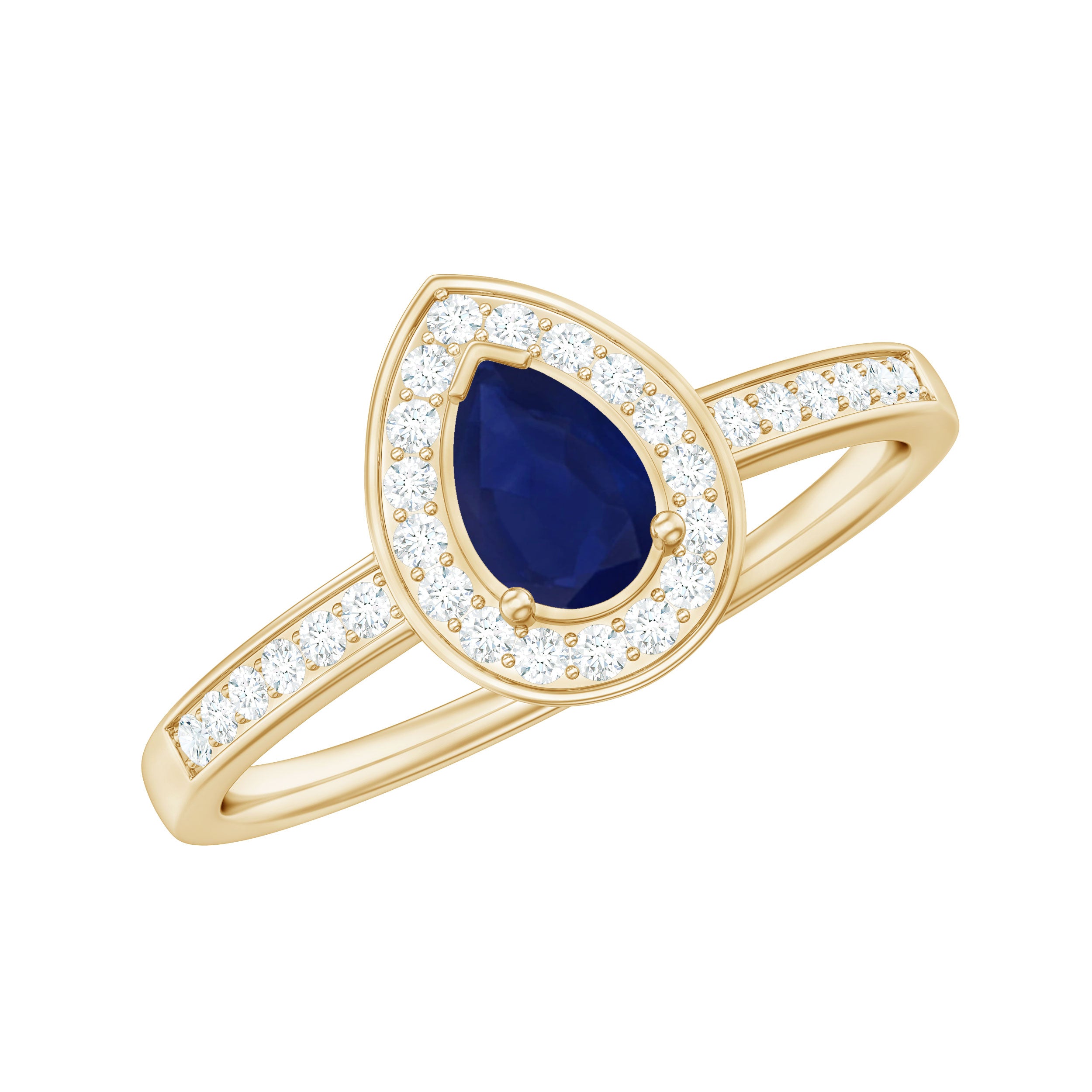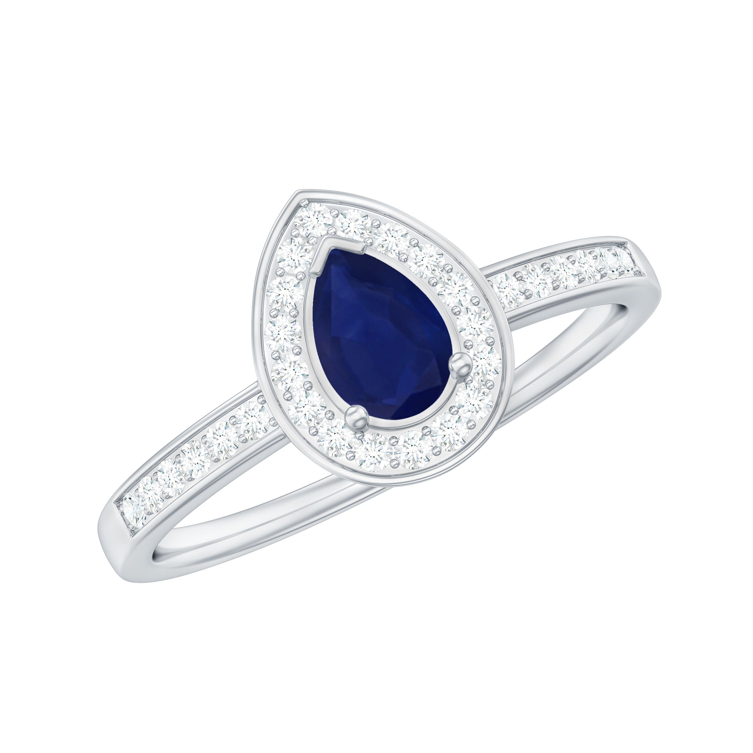 The halo highlights the pear-shaped diamond or gemstone's distinctive shape. In contrast, the diamond or gemstone oozes grace and timeless beauty, creating a beautiful ring.