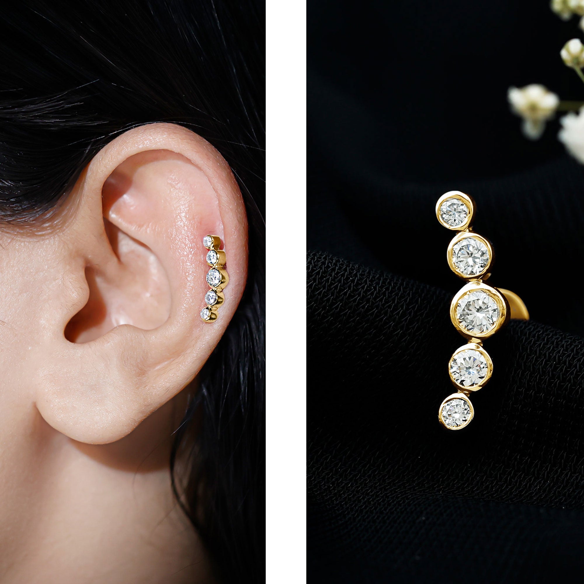 Climber Earrings: - they are precisely made to flaunt on the earlobe. These type of earrings has a curved shape, elegantly showing off the curve of the ear elegantly, and create a classic look. The earrings look like you get multiple piercings without the actual need. They're ideal for individuals seeking a classy and stylish appearance without enduring the discomfort of additional piercings.