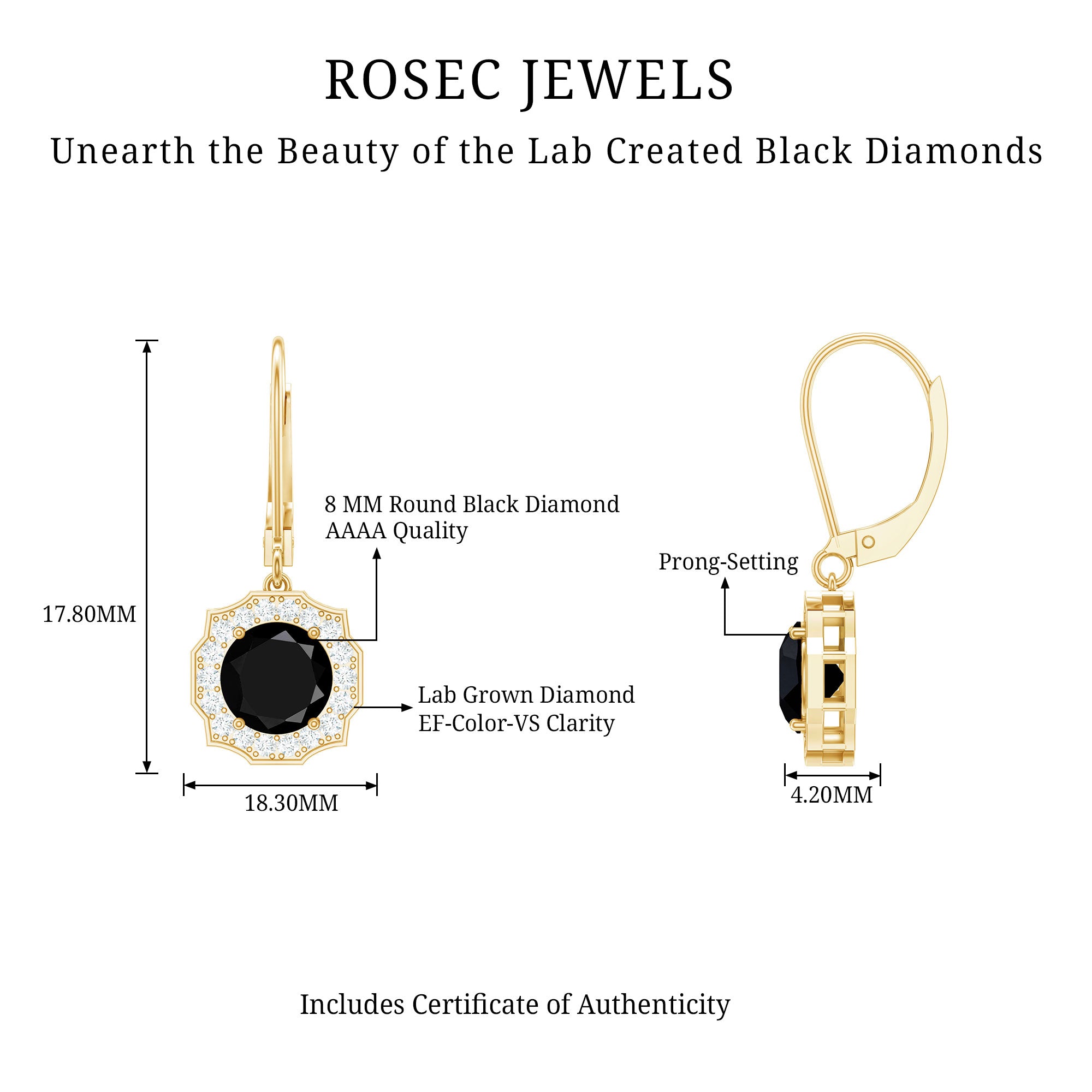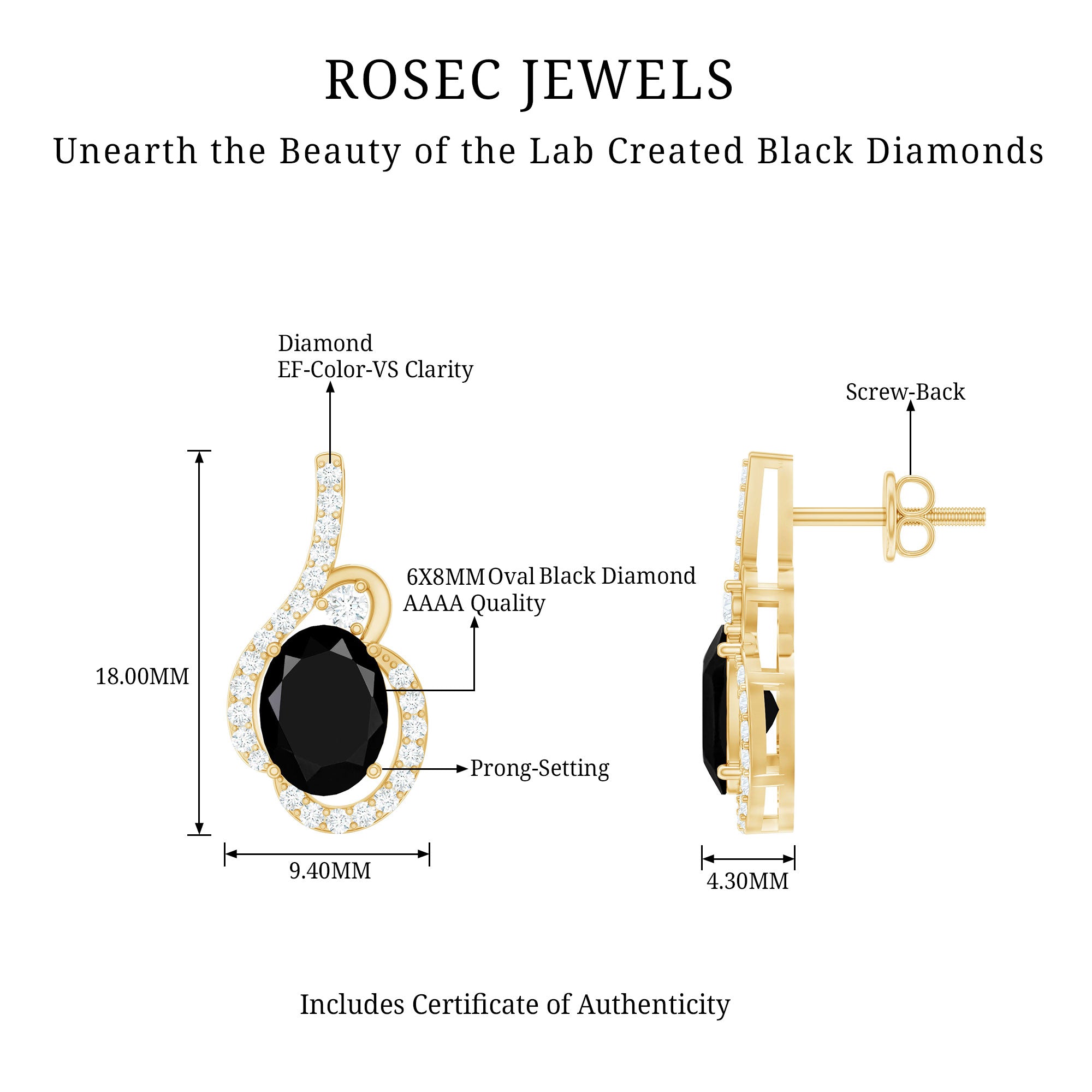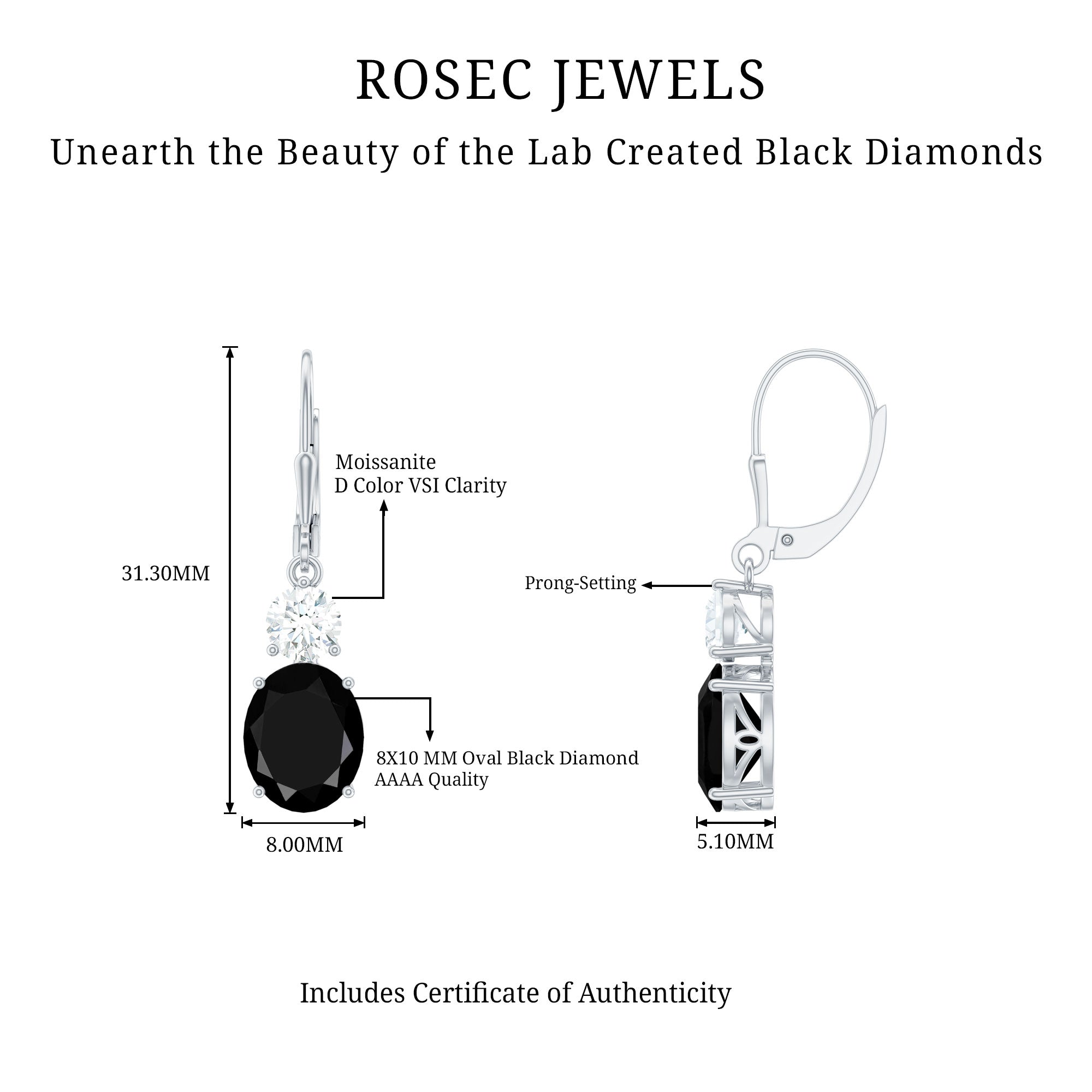 At Rosec Jewels, we offer a diverse collection of lab-grown black diamond earrings featuring AAAA quality gemstones. These earrings are molded in precious hallmarked metal like white gold, yellow gold, rose gold, and sterling silver. Some styles of earrings are enough to enhance your everyday or dressy attires for a touch of extra edge and sparkle to your looks.