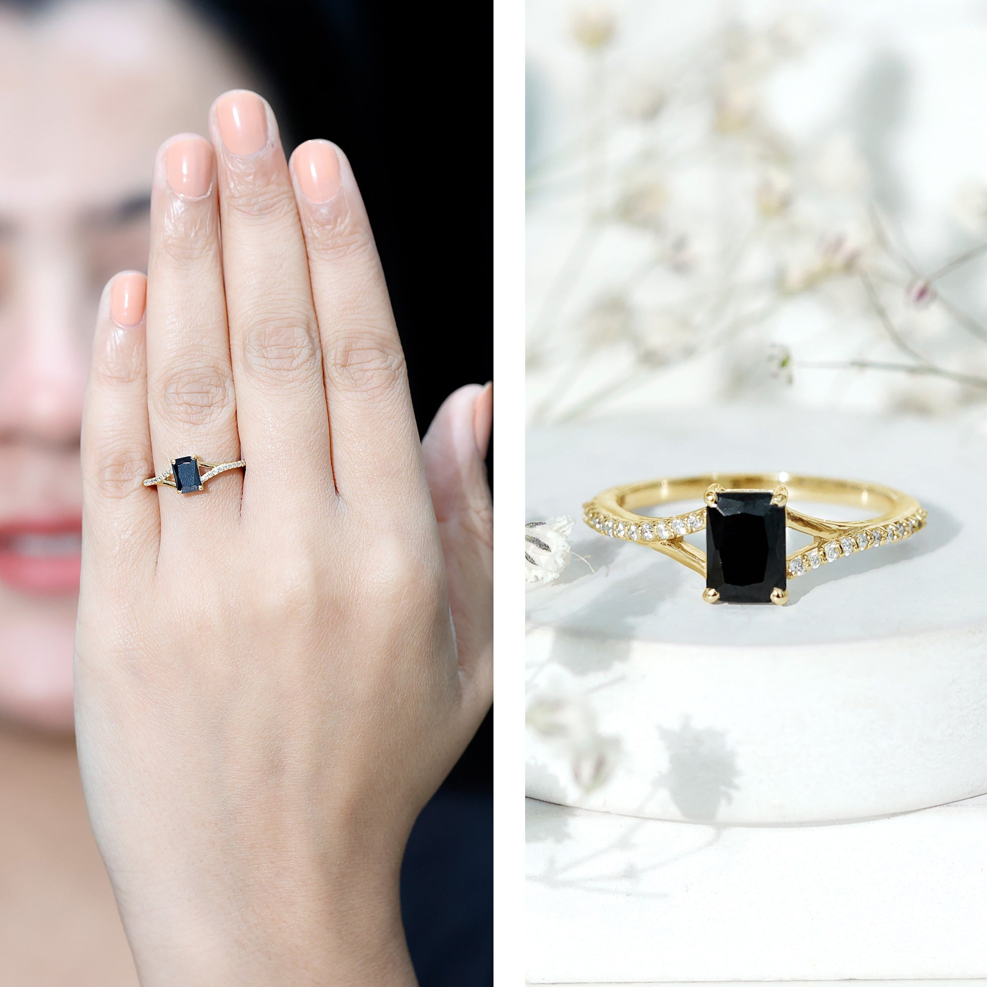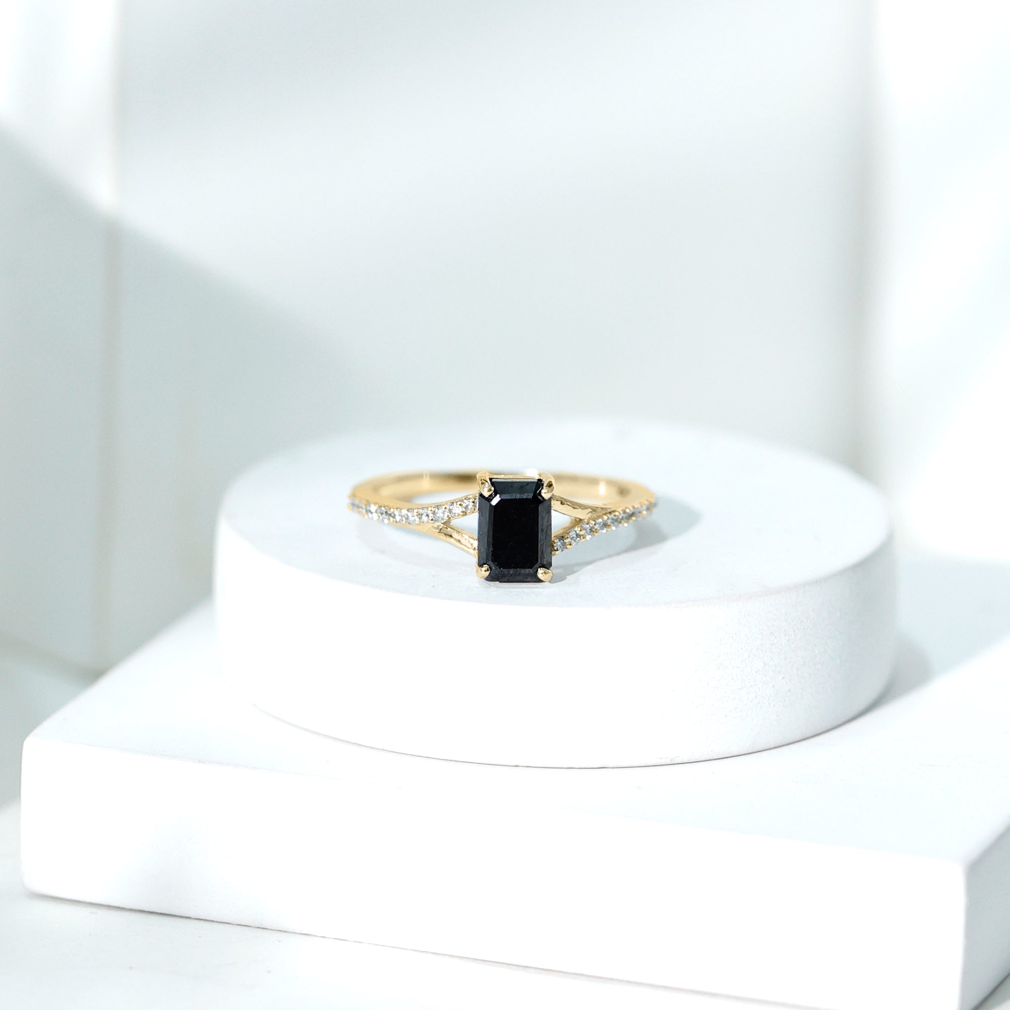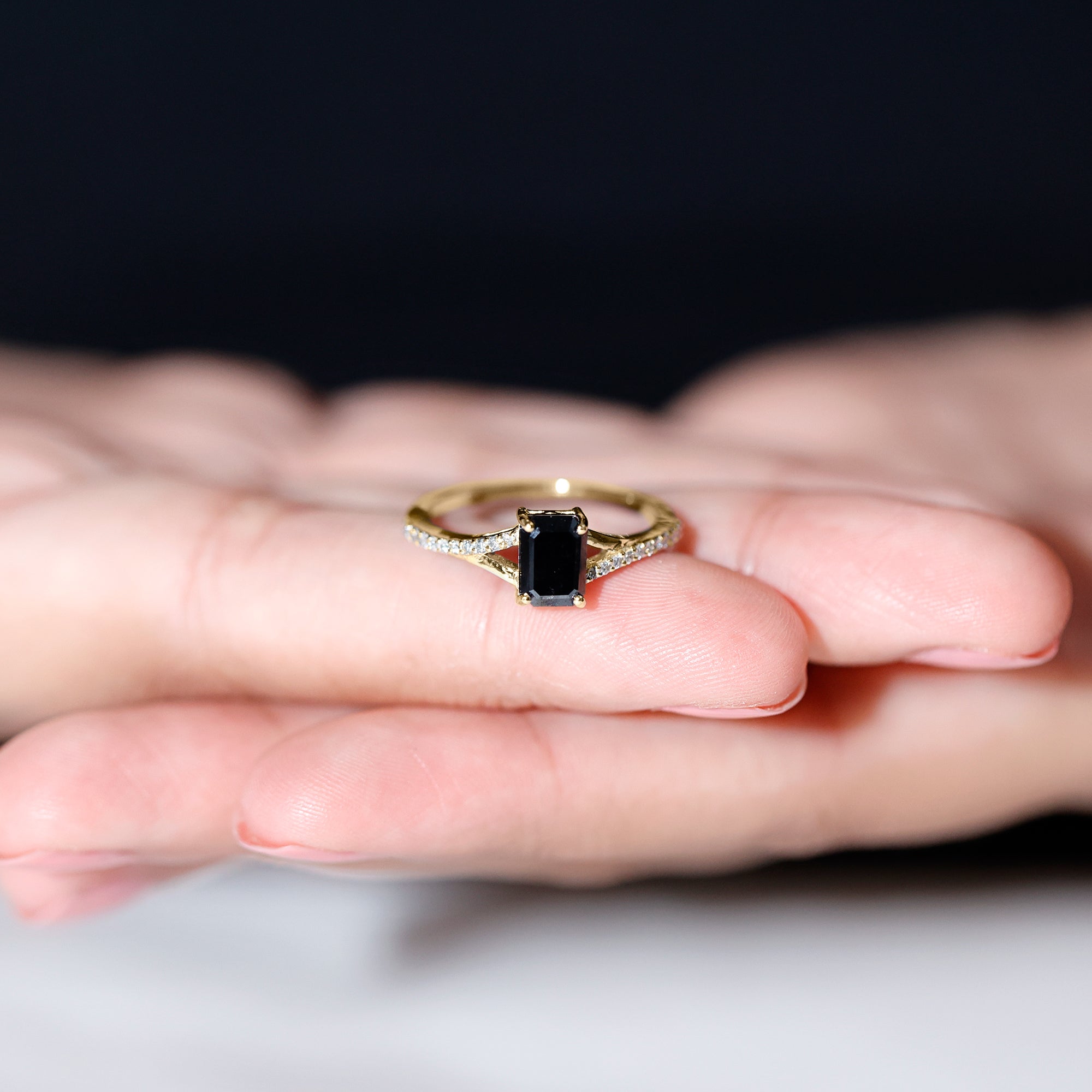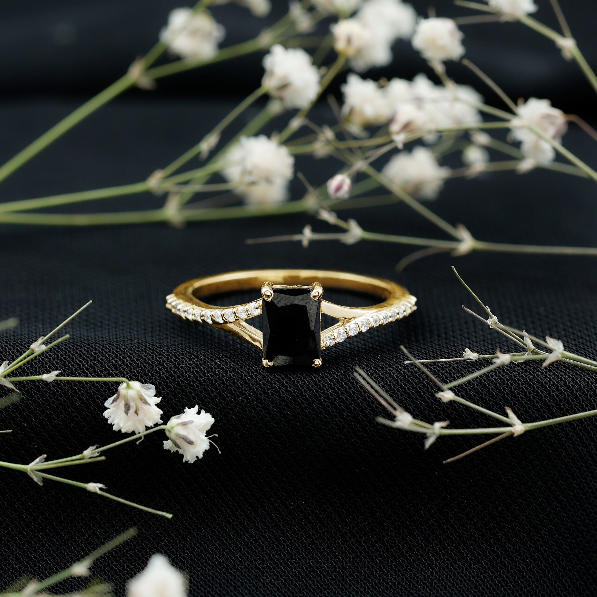 This ring style showcases a shimmering black diamond with dainty round diamonds or moissanites all around the centerpiece. It helps lend more character to the ring, adding an extra layer of sparkle (known as a halo).