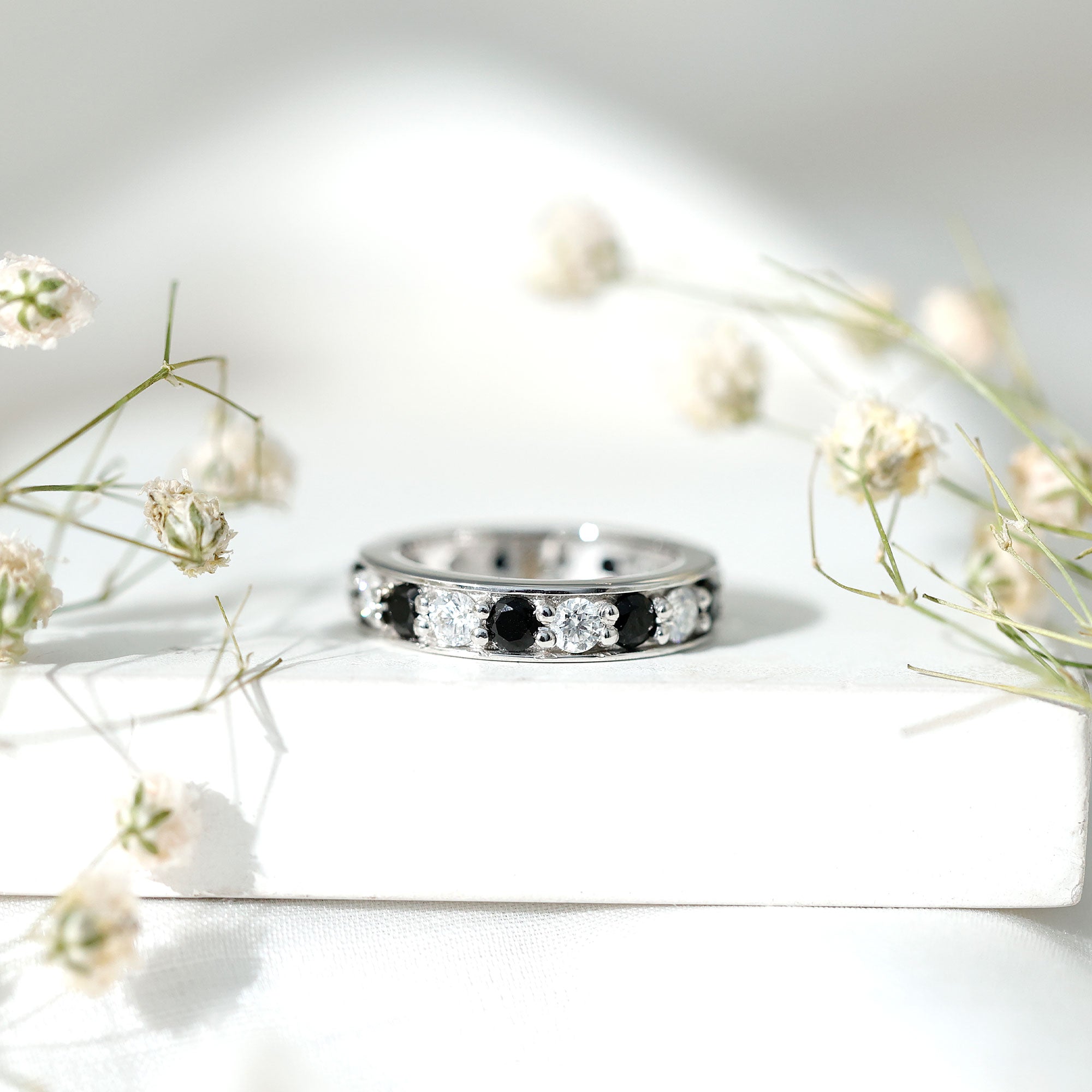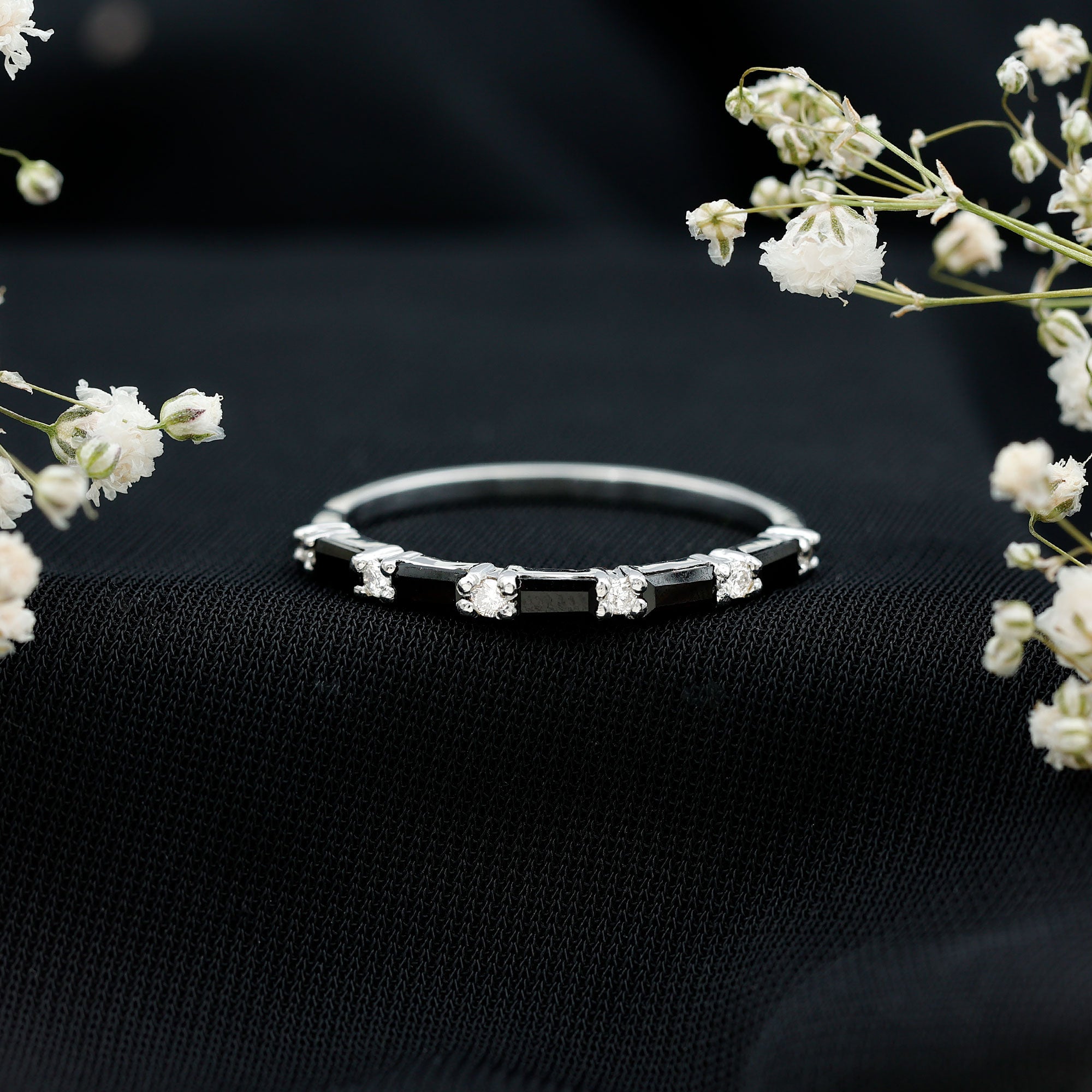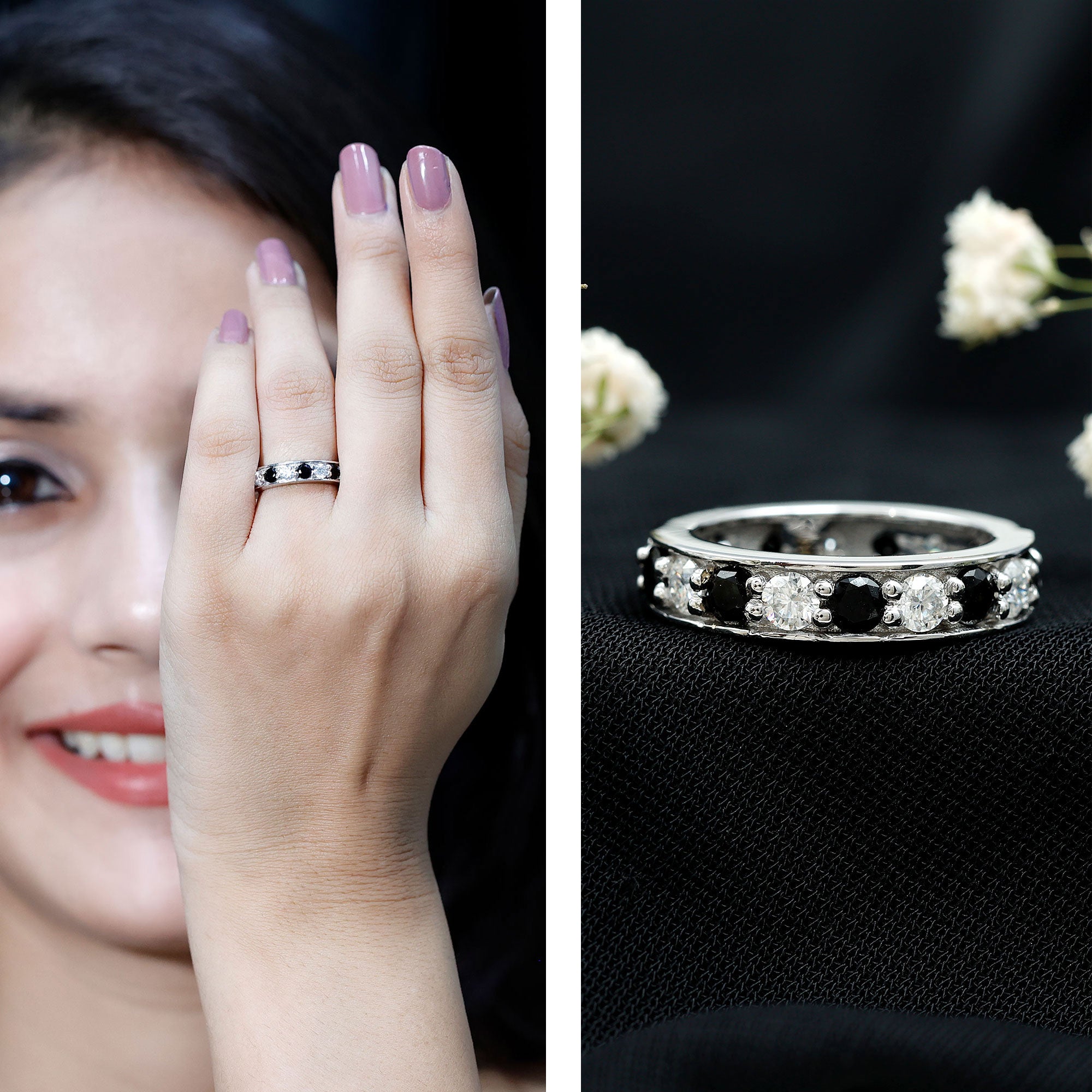 Celebrate your anniversary or special occasion with a lab black diamond eternity ring. This ring has a band of stunning black diamonds. It helps you stand out and enhances any other ring next to it. This includes wedding bands and engagement rings.