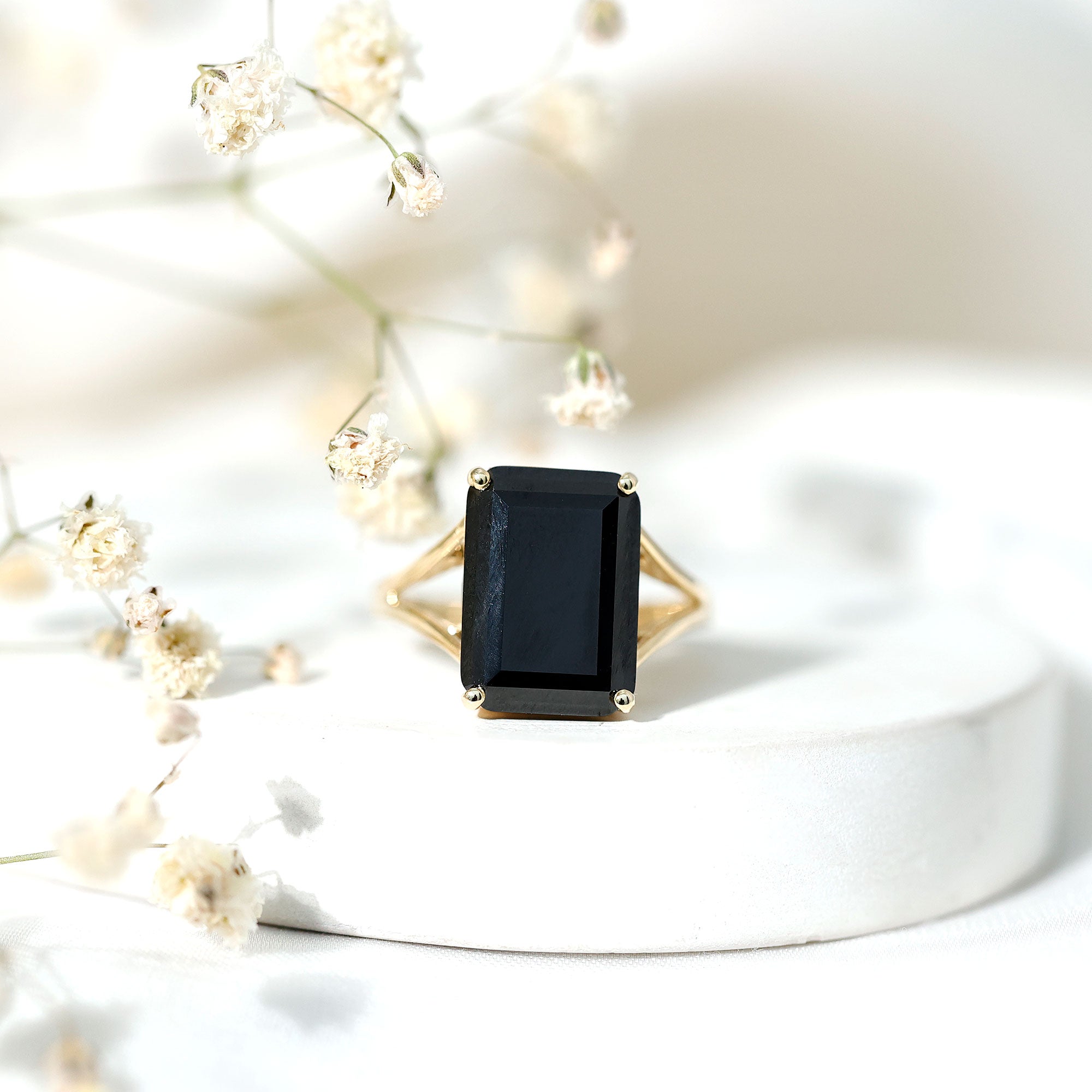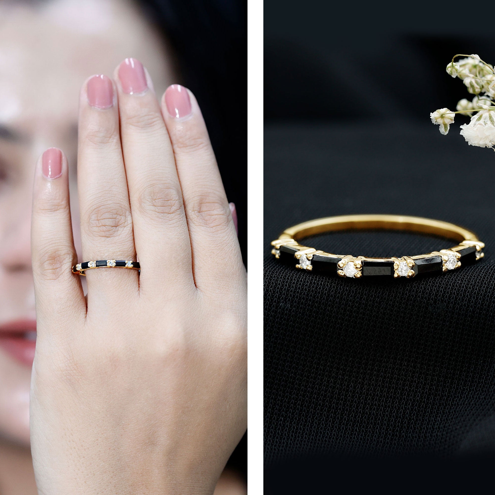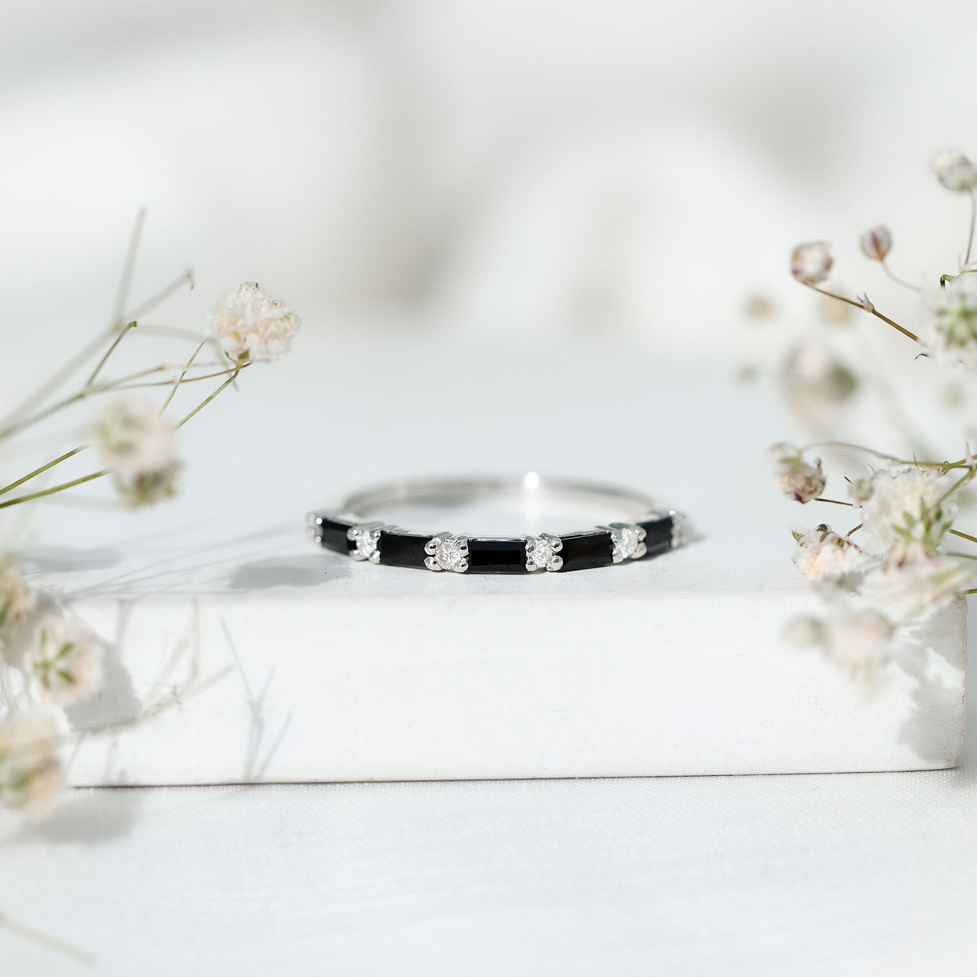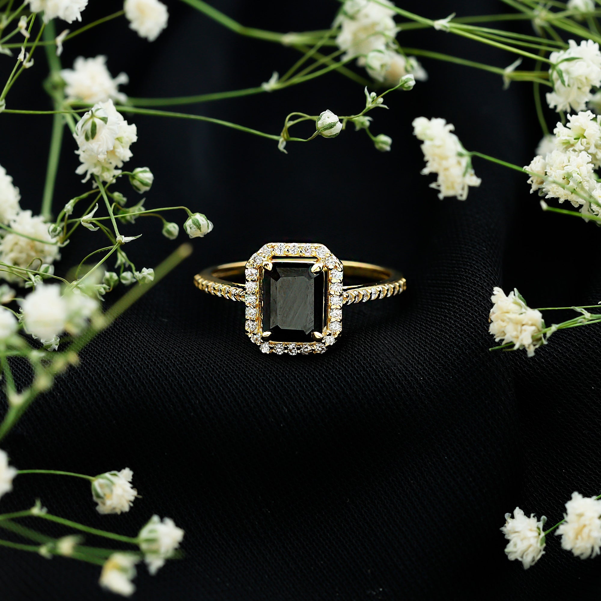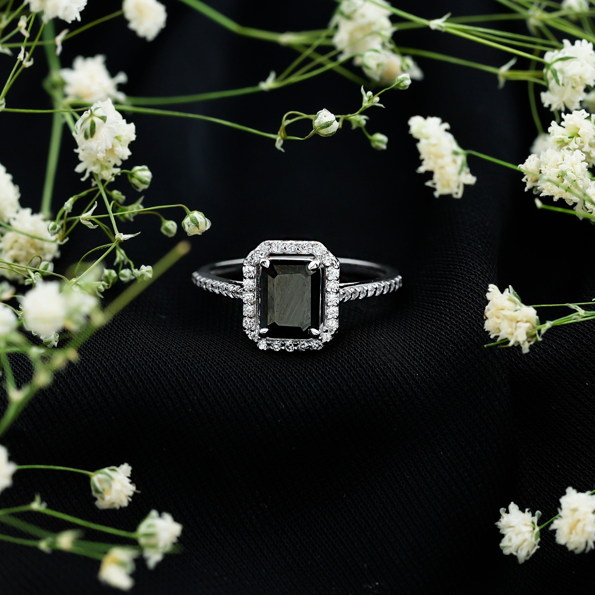 This ring style showcases a shimmering black diamond with dainty round diamonds or moissanites all around the centerpiece. It helps lend more character to the ring, adding an extra layer of sparkle (known as a halo).
