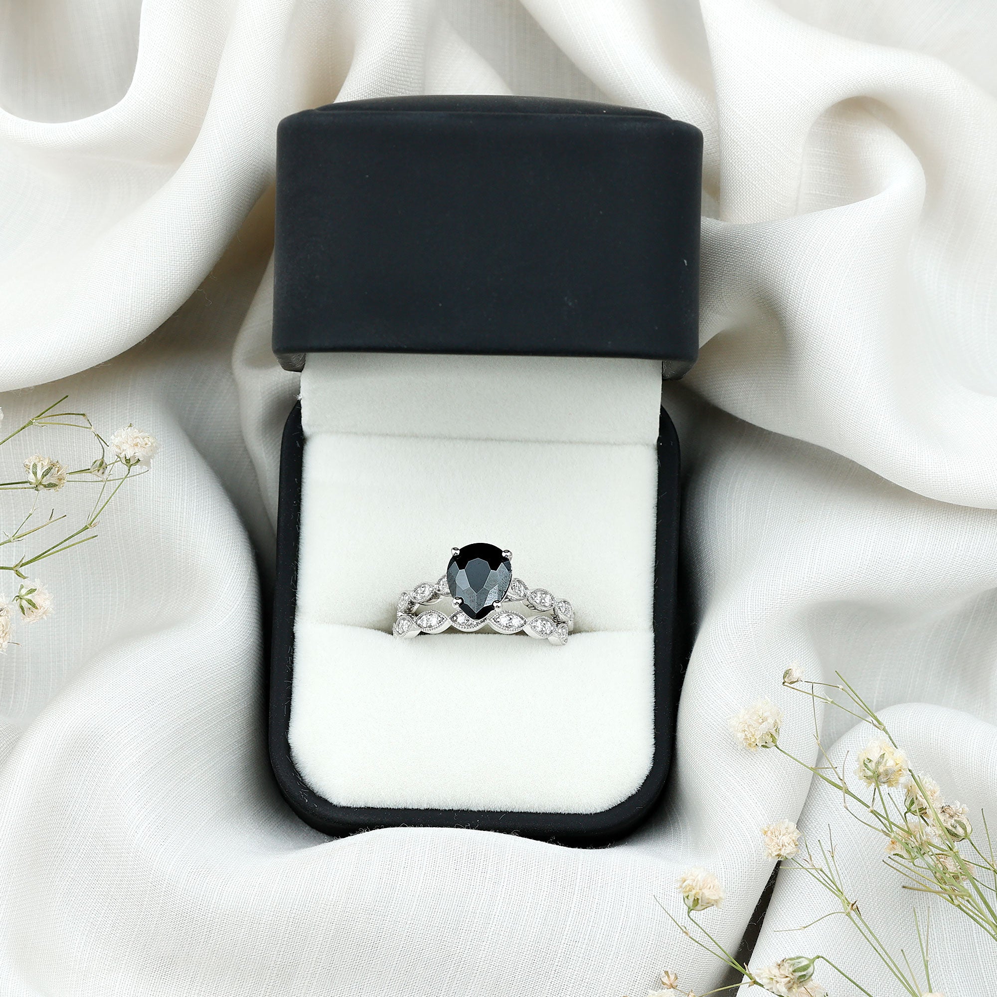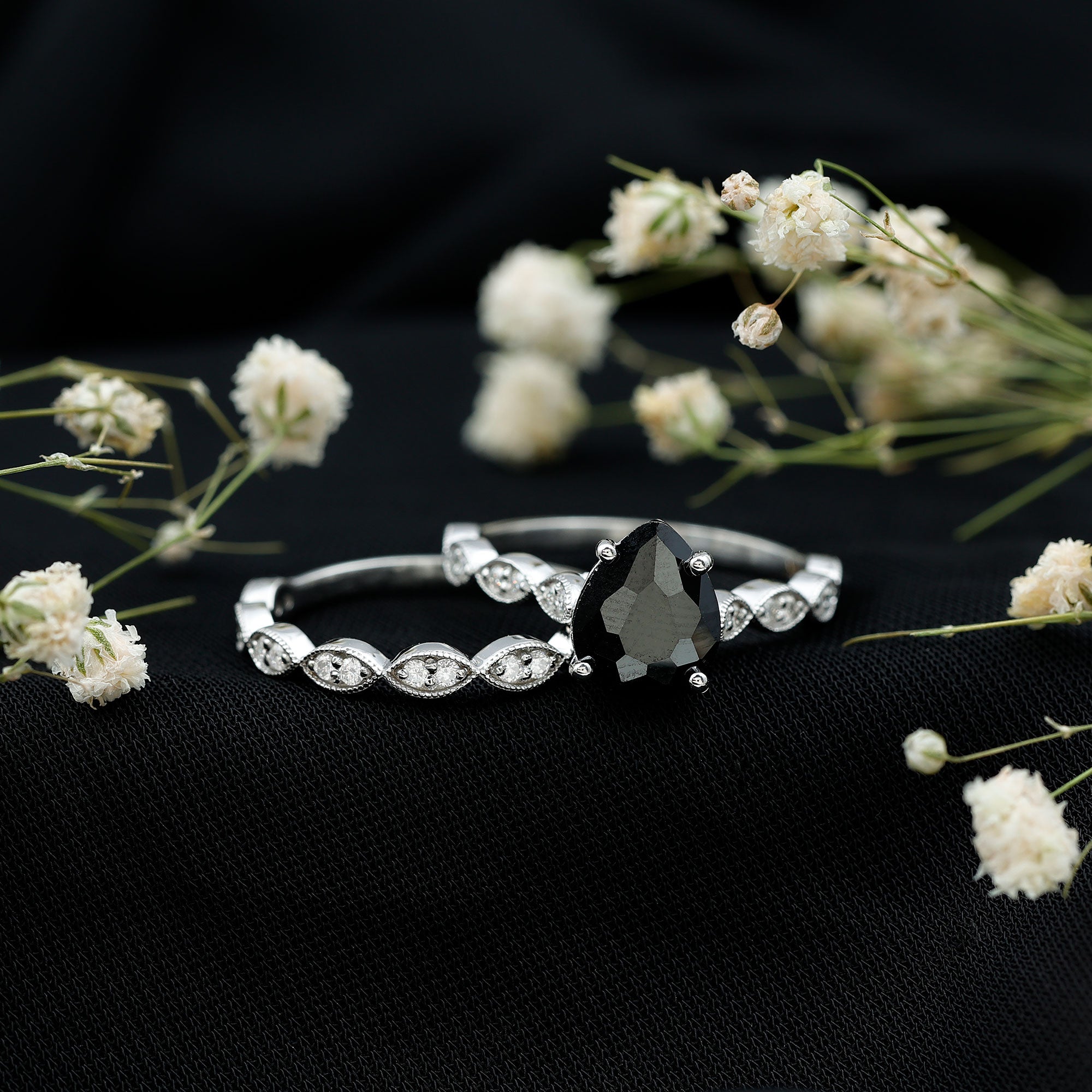 This style of ring is meant to speak old school couples, vintage style rings feature ornate designs that are symbolic of the Art Deco, Edwardian, and Victorian Eras. You’ll most likely come across antique designs that incorporate milgrain and filigree details, geometric patterns, or floral motifs that complement the exotic hue of lab black diamonds.