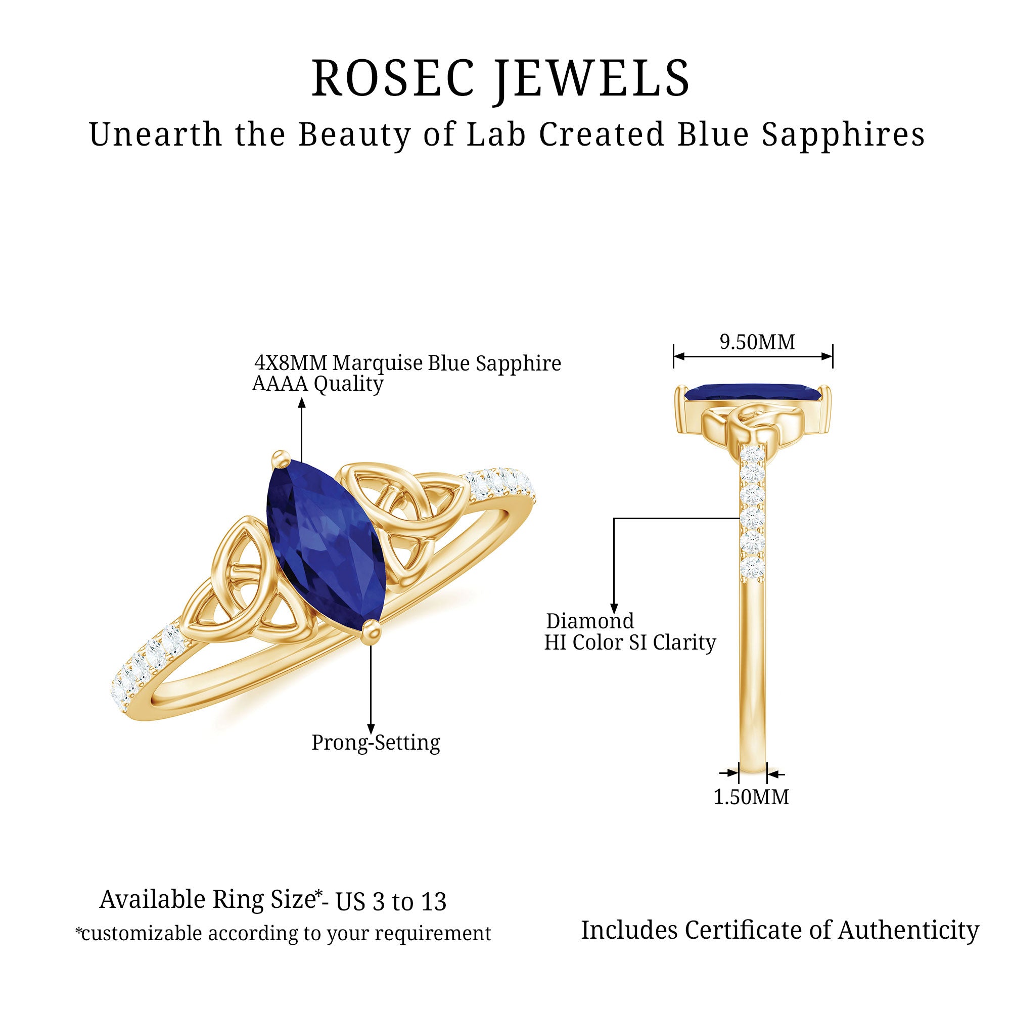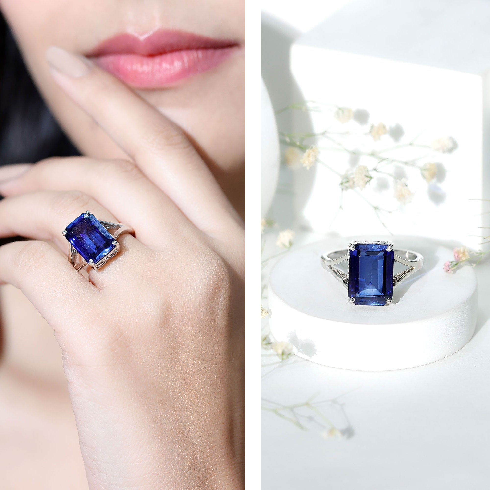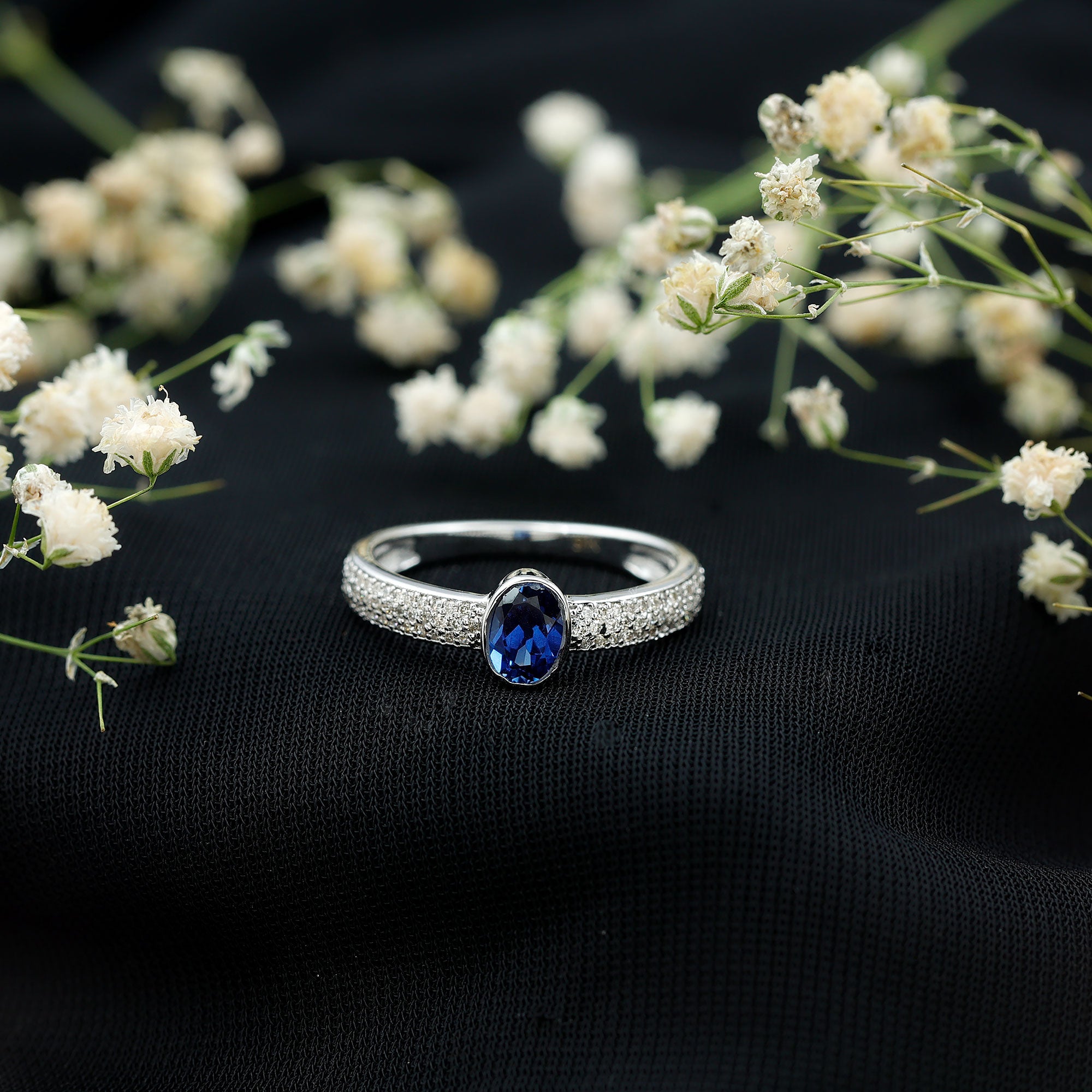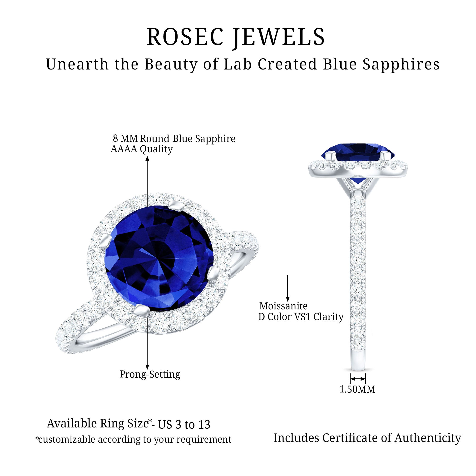 Our Lab Grown Blue Sapphire Rings are certified with AAAA quality gemstone, paired along with other precious stones such as Moissanite. These Lab Grown Blue Sapphire Rings are eco-friendly as they are grown in a lab instead of being extracted from the mines. Our rings are available in two precious metals, silver and gold (with two color choices available in gold only; white and yellow). Know more about our blue gemstone rings: