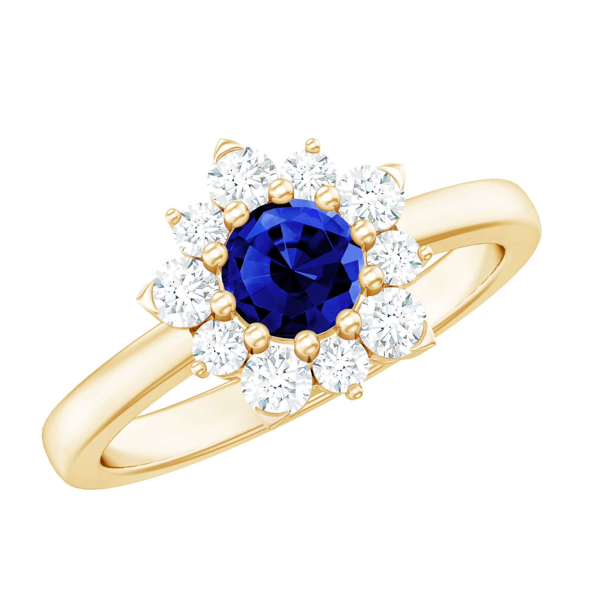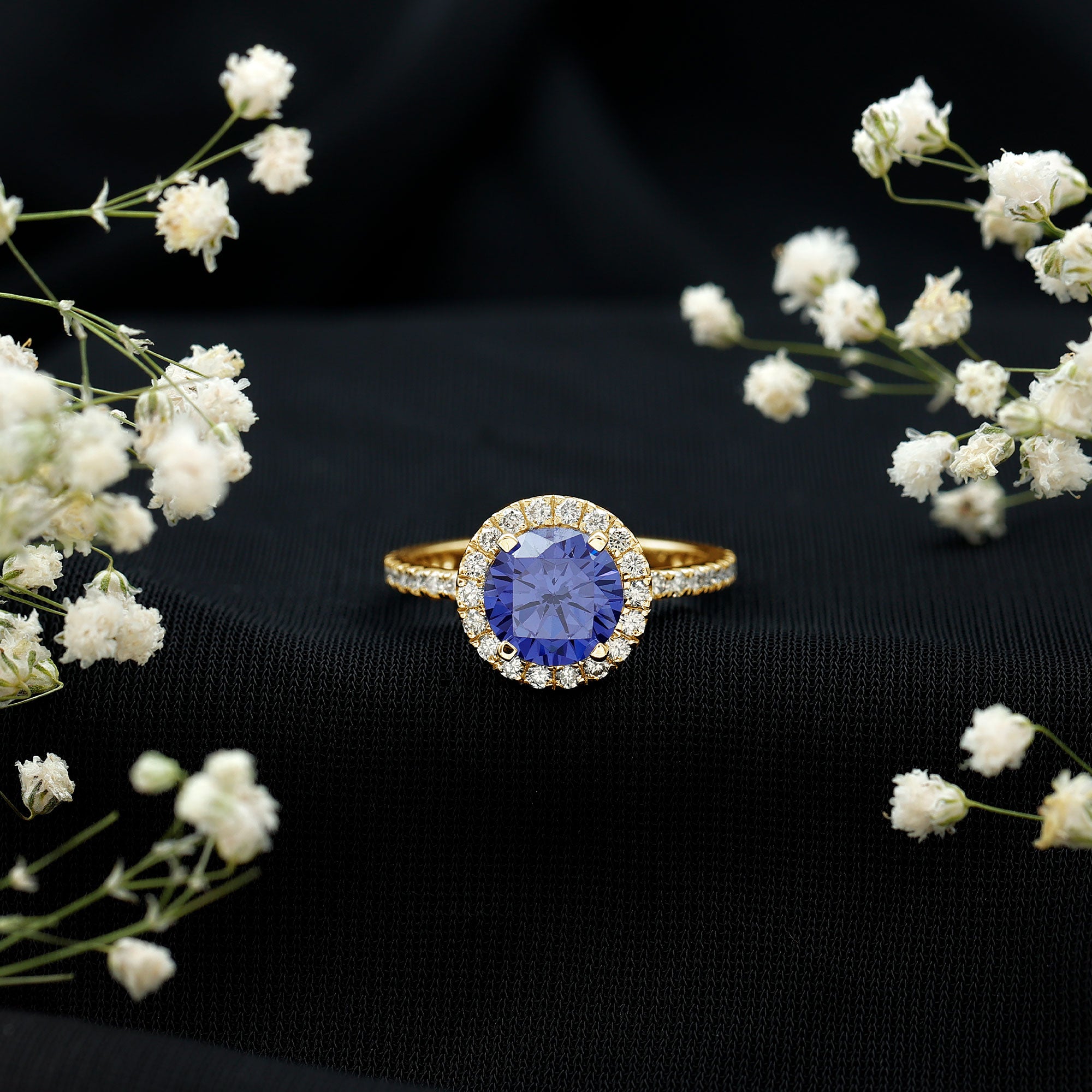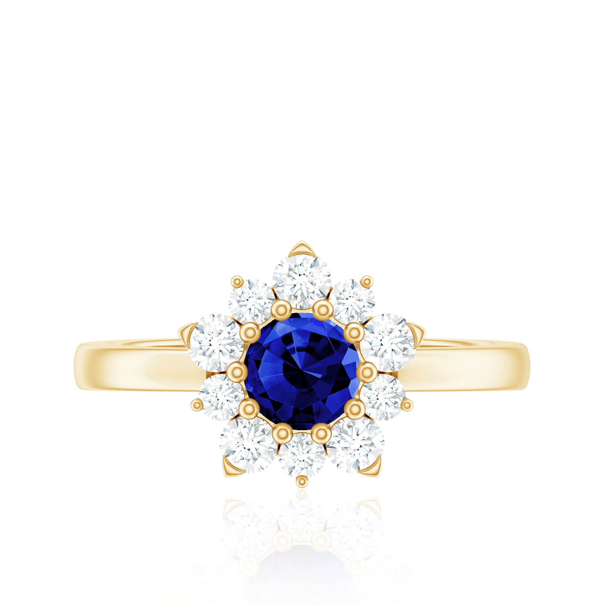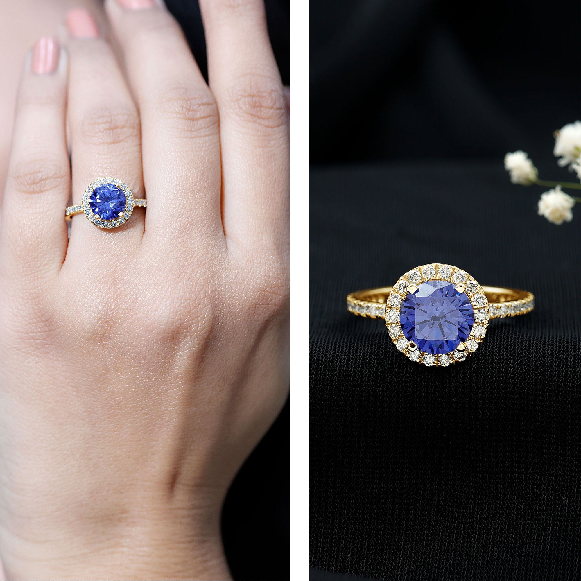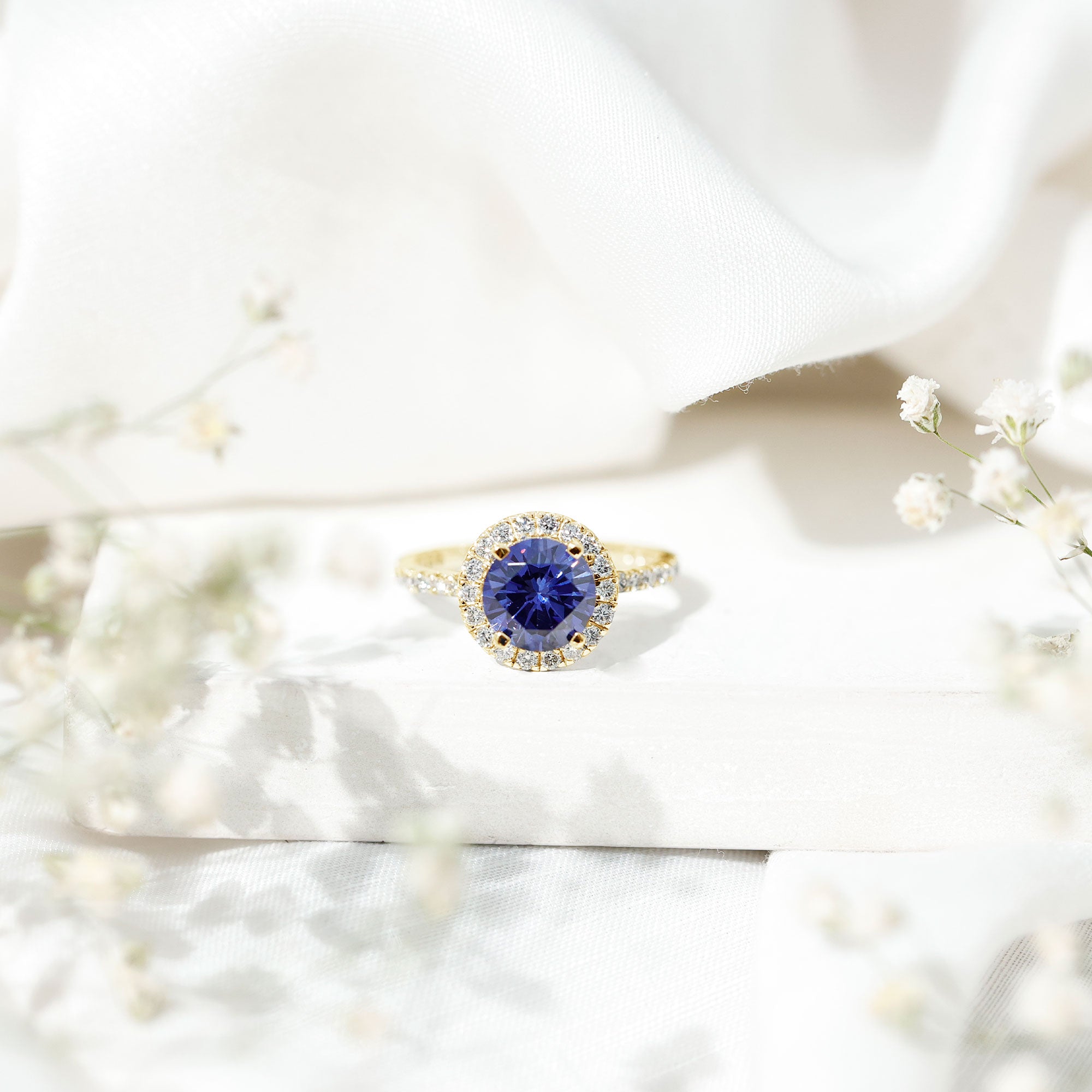 Halo Rings: Begin your new chapter of life with our Blue Sapphire Halo rings. Our eye-catching Blue Sapphire placed in the center and surrounded by small Moissanite stones giving it a magnified look. It fits perfectly with all your occasions as an ultimate symbol of elegance and luxury.