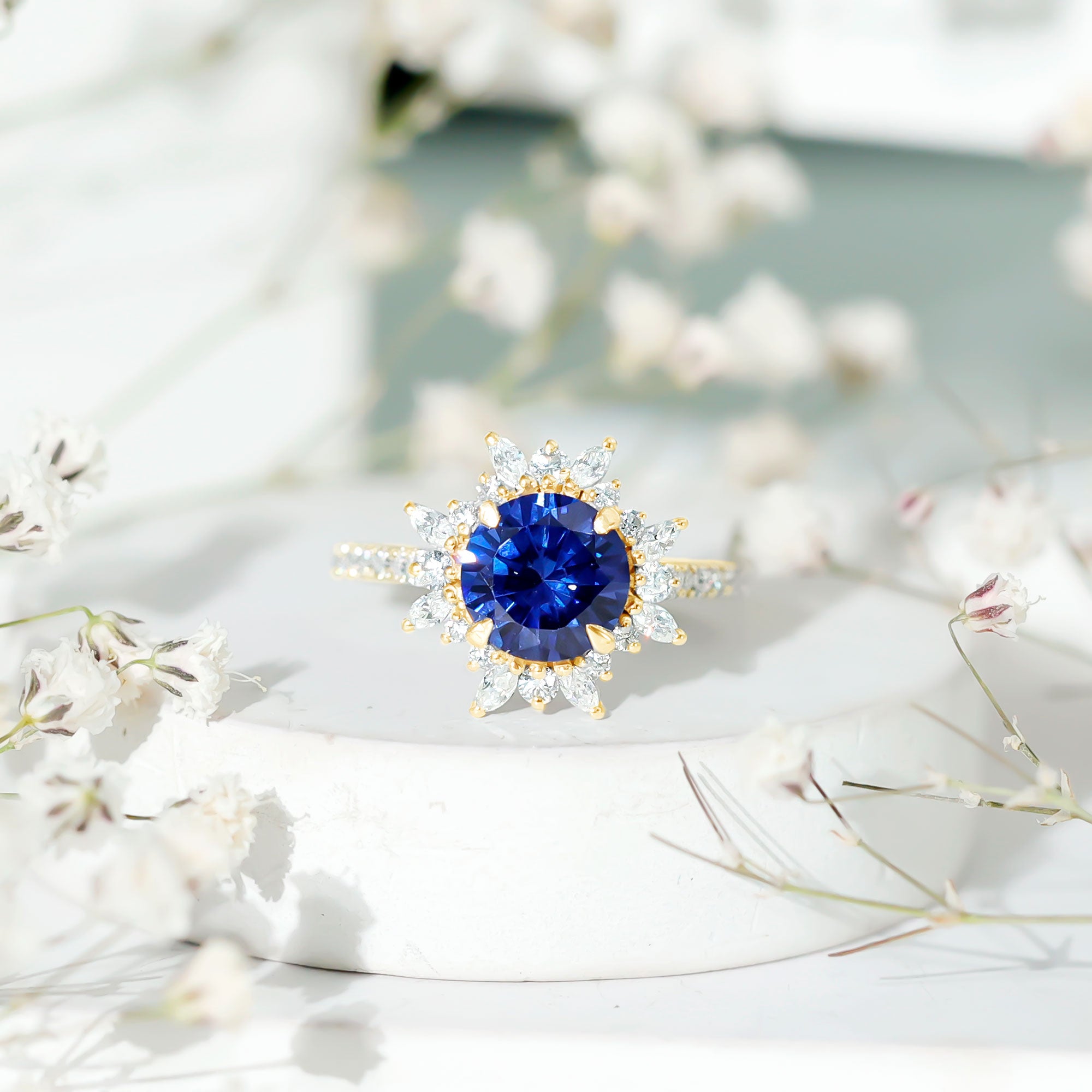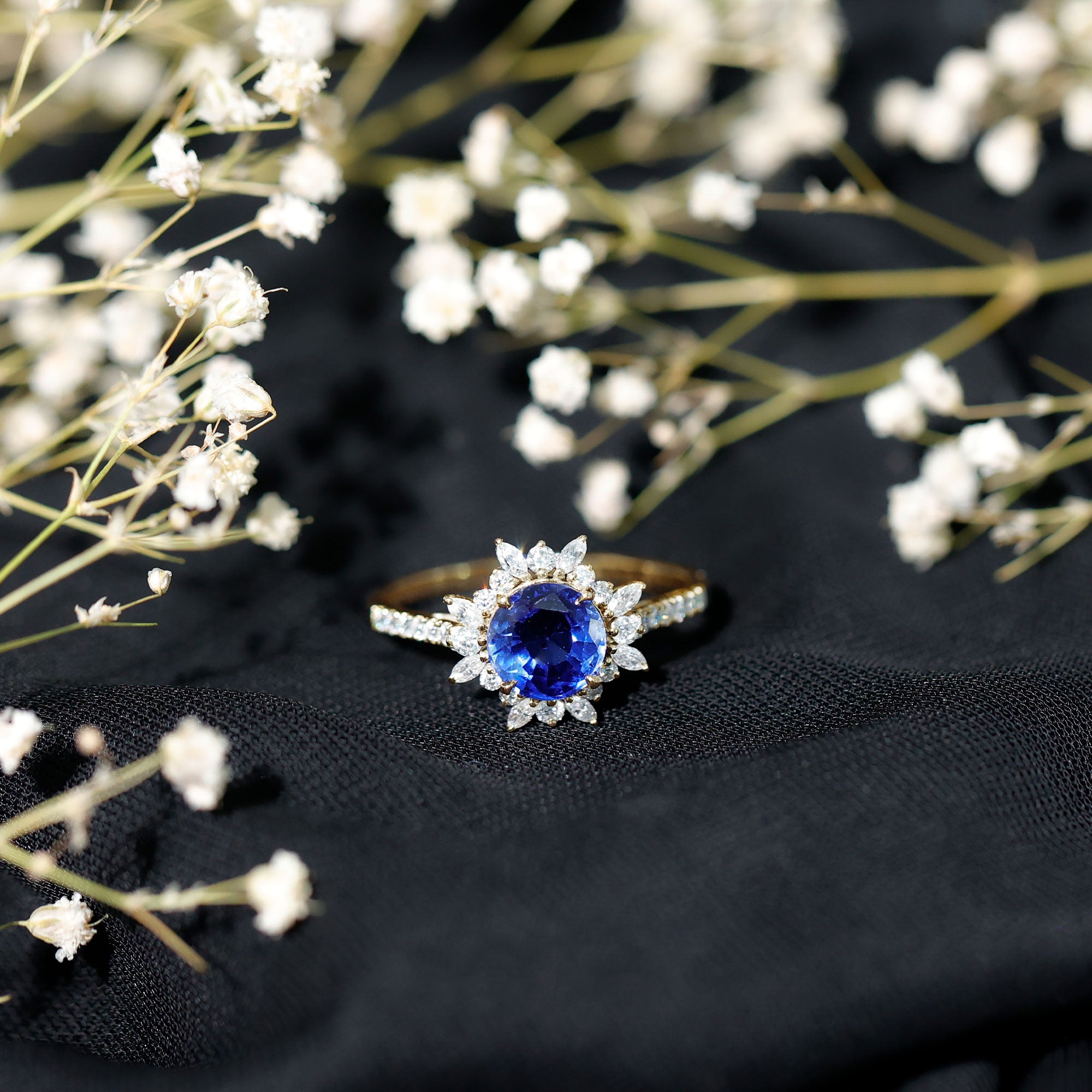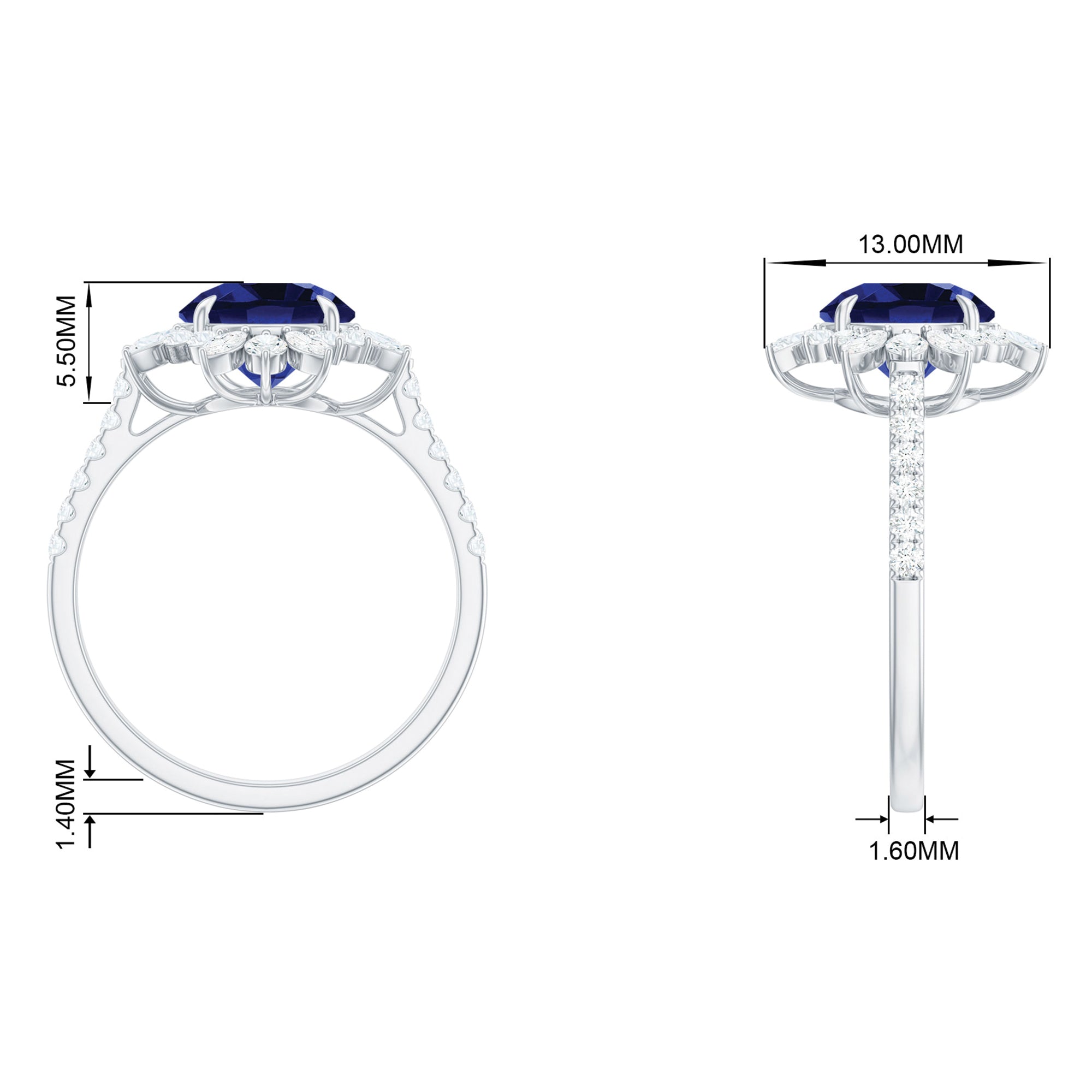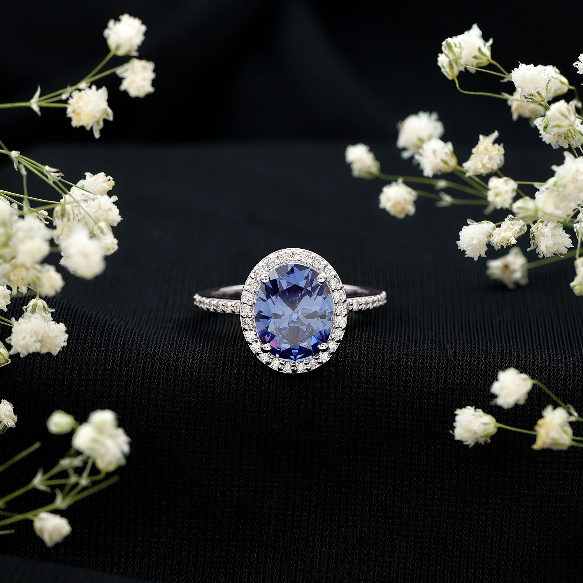 Halo Rings: Begin your new chapter of life with our Blue Sapphire Halo rings. Our eye-catching Blue Sapphire placed in the center and surrounded by small Moissanite stones giving it a magnified look. It fits perfectly with all your occasions as an ultimate symbol of elegance and luxury.