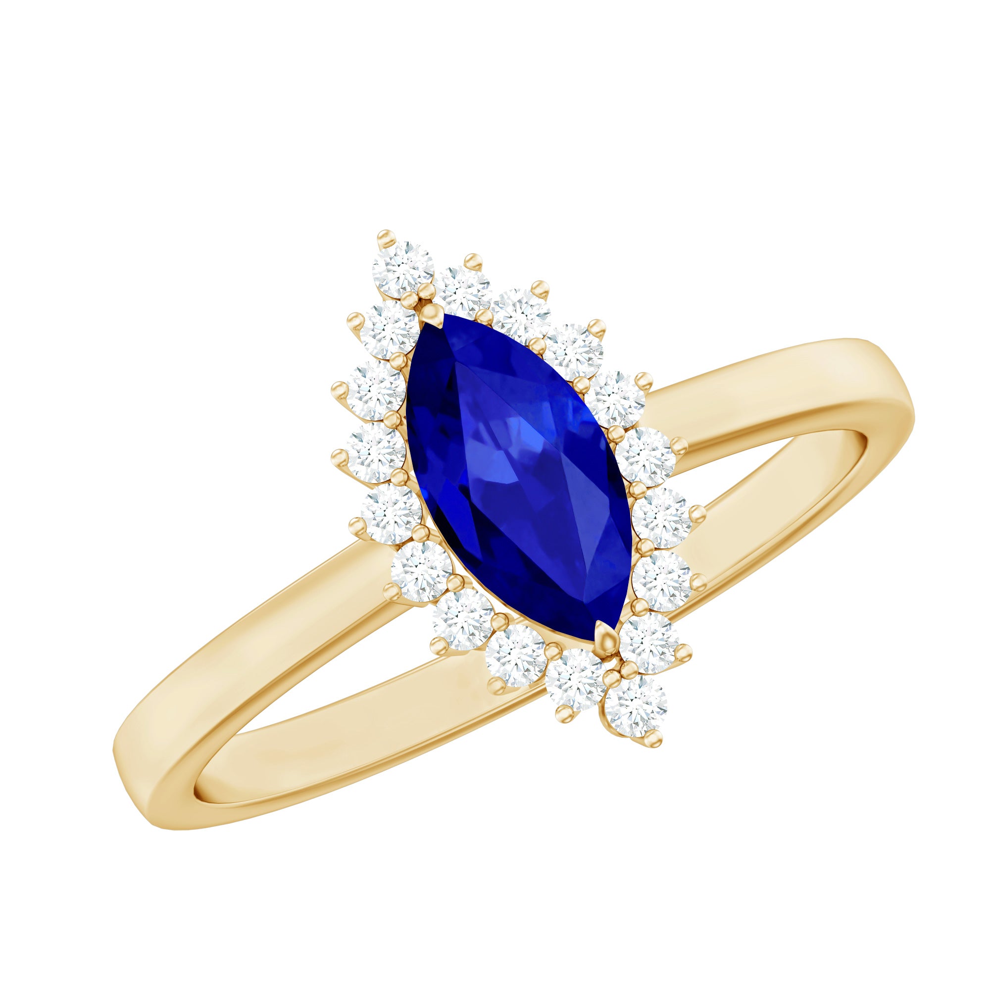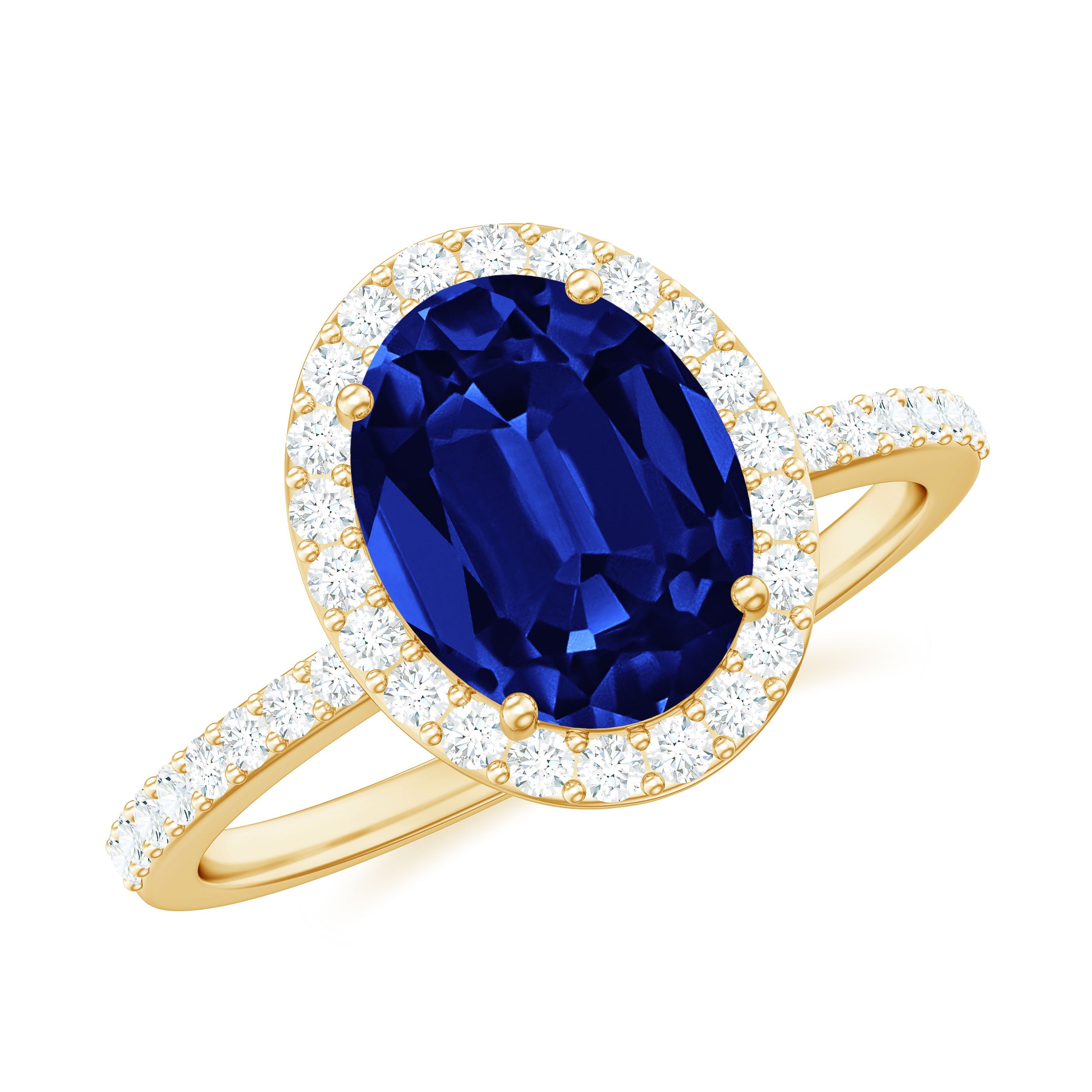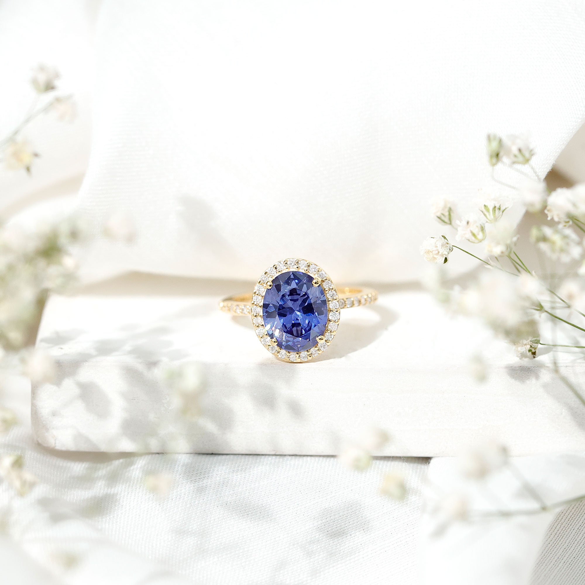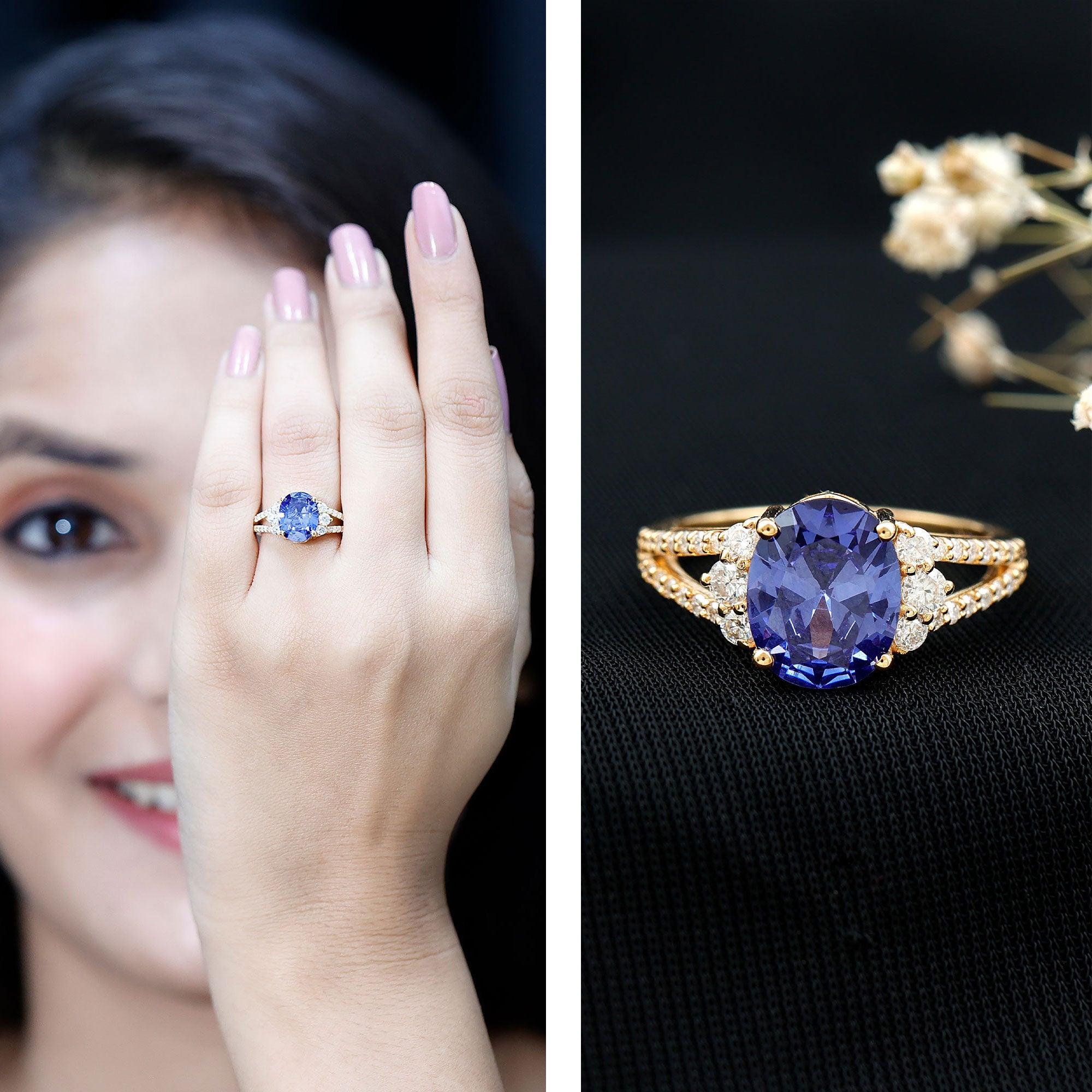 Halo Rings: Begin your new chapter of life with our Blue Sapphire Halo rings. Our eye-catching Blue Sapphire placed in the center and surrounded by small Moissanite stones giving it a magnified look. It fits perfectly with all your occasions as an ultimate symbol of elegance and luxury.