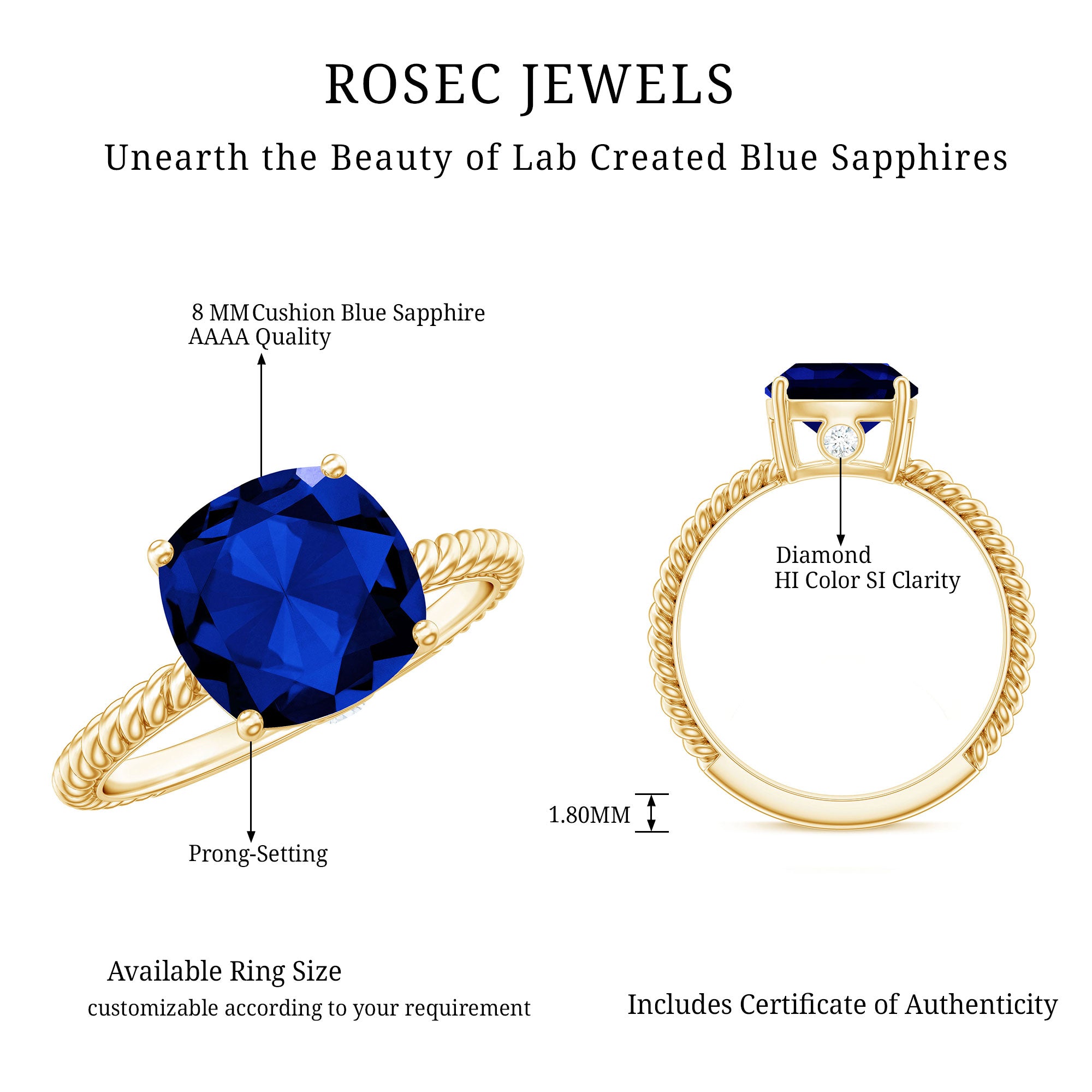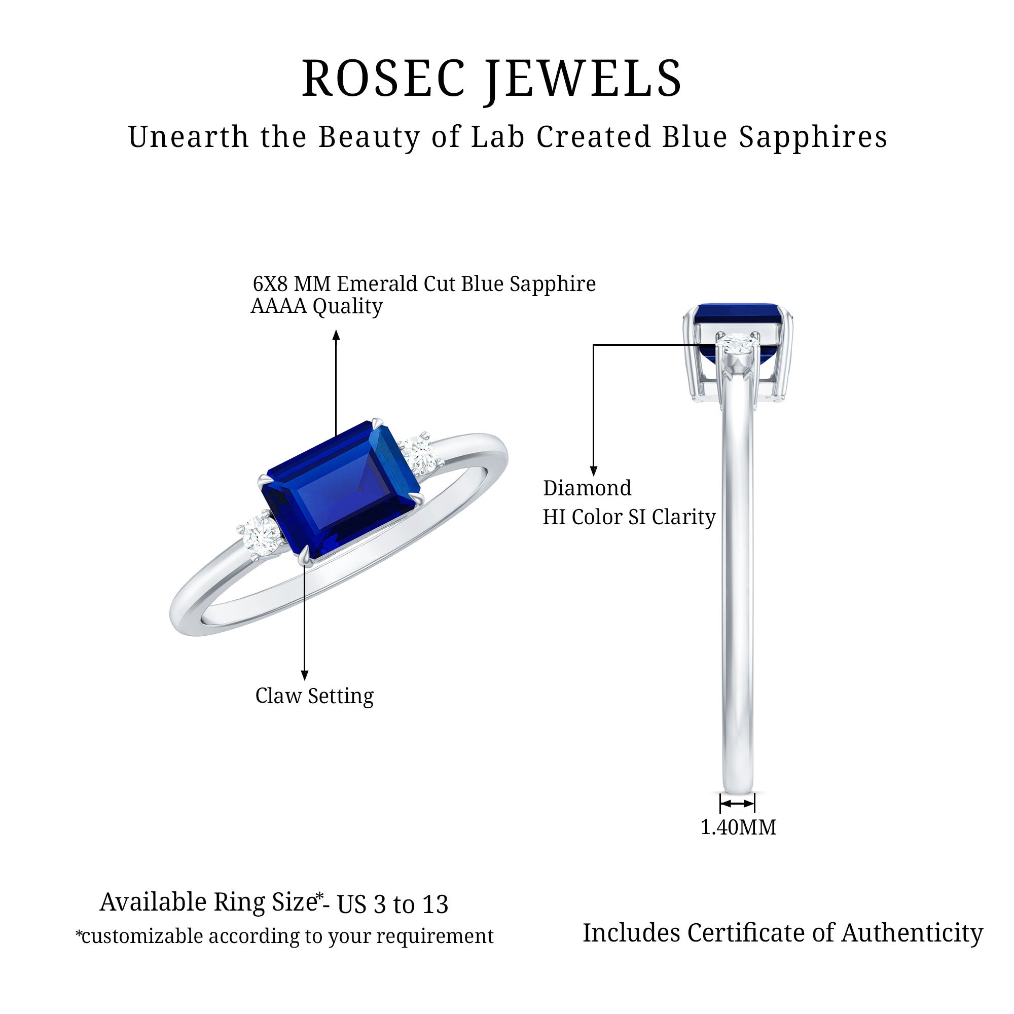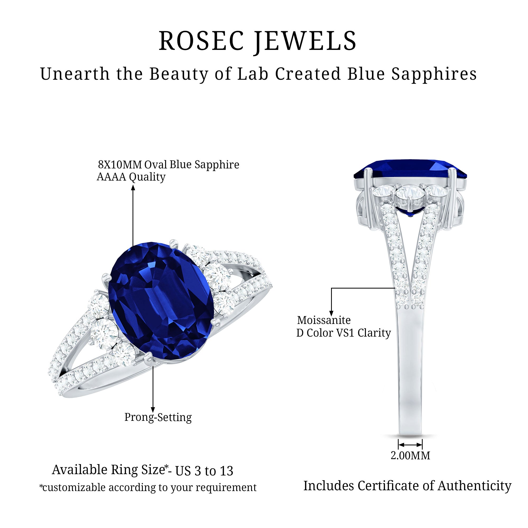 Our Lab Grown Blue Sapphire Rings are certified with AAAA quality gemstone, paired along with other precious stones such as Moissanite. These Lab Grown Blue Sapphire Rings are eco-friendly as they are grown in a lab instead of being extracted from the mines. Our rings are available in two precious metals, silver and gold (with two color choices available in gold only; white and yellow). Know more about our blue gemstone rings: