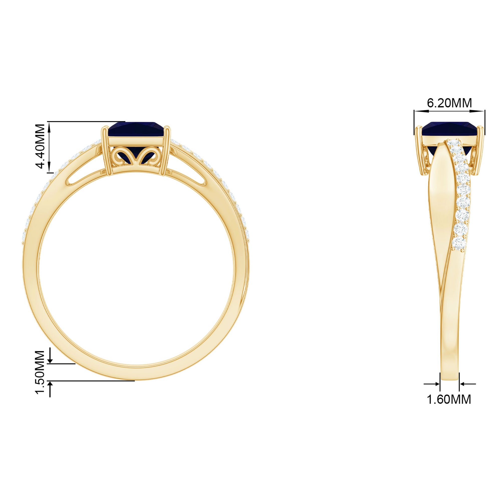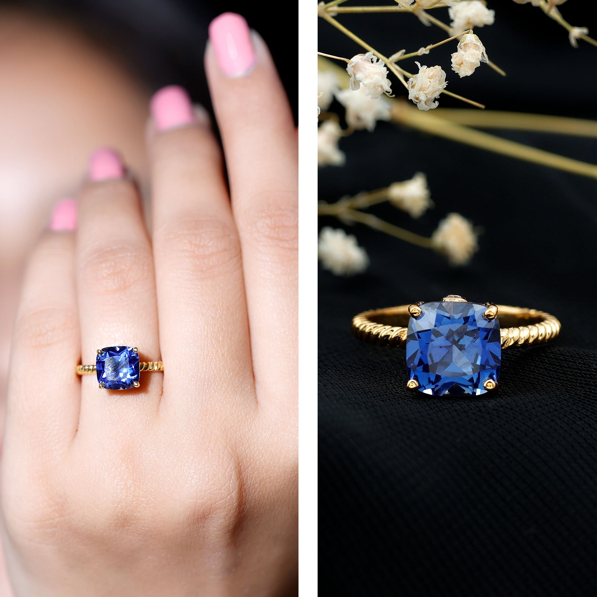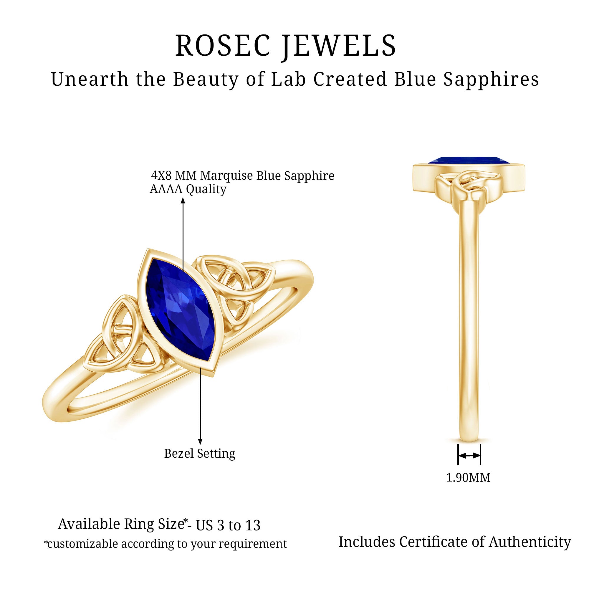 Our Lab Grown Blue Sapphire Rings are certified with AAAA quality gemstone, paired along with other precious stones such as Moissanite. These Lab Grown Blue Sapphire Rings are eco-friendly as they are grown in a lab instead of being extracted from the mines. Our rings are available in two precious metals, silver and gold (with two color choices available in gold only; white and yellow). Know more about our blue gemstone rings: