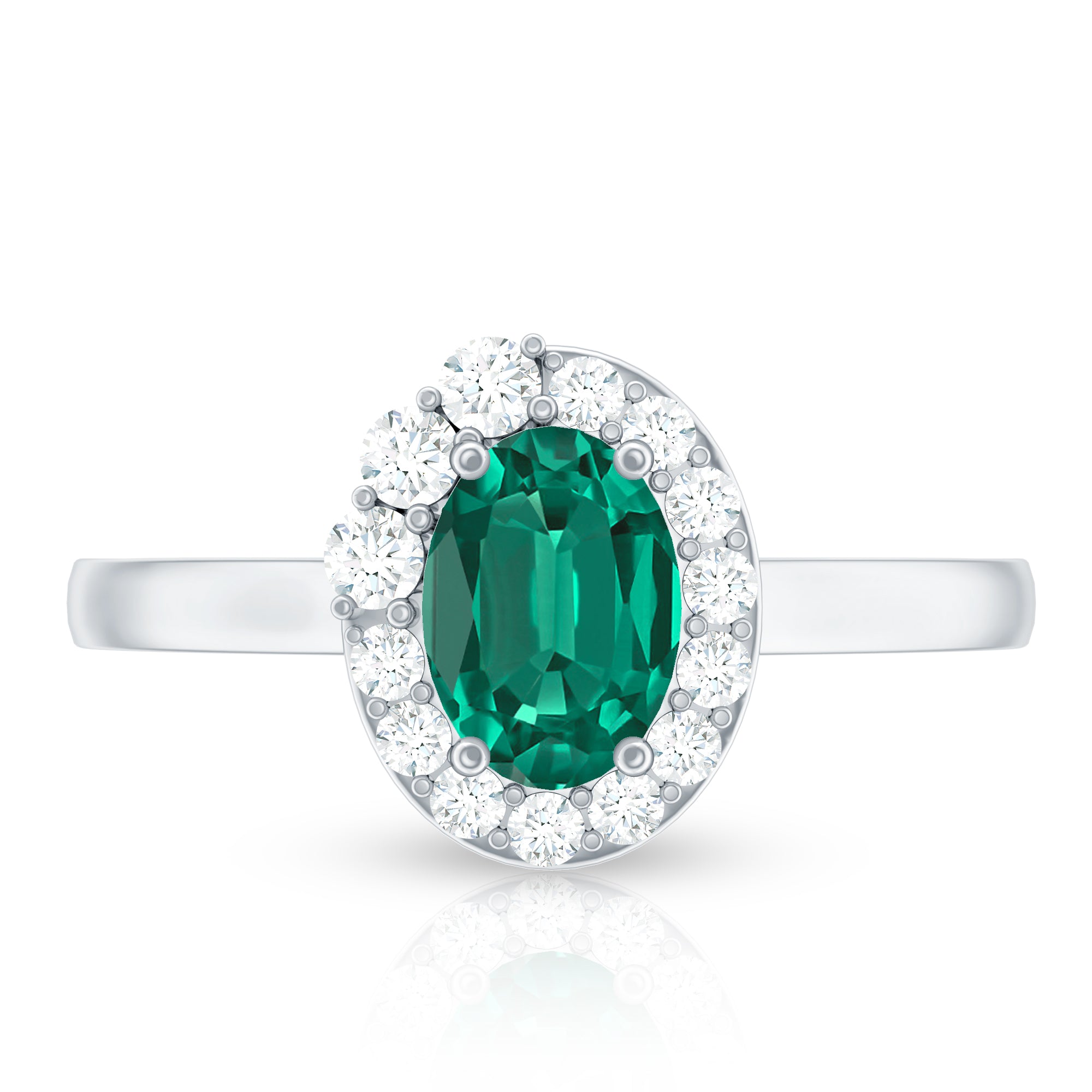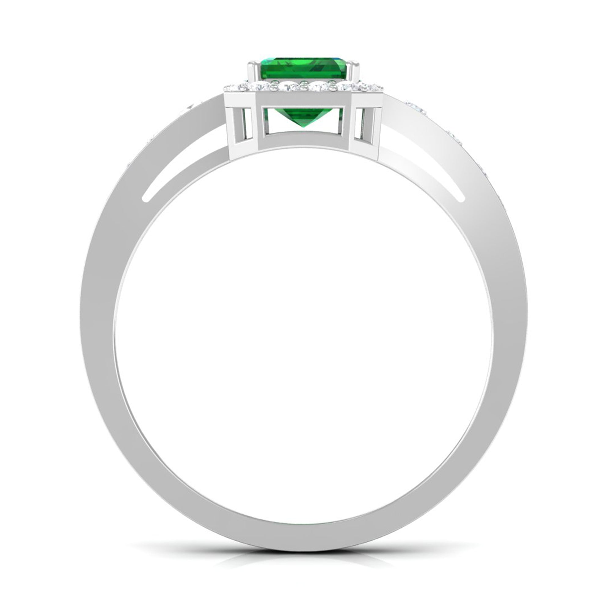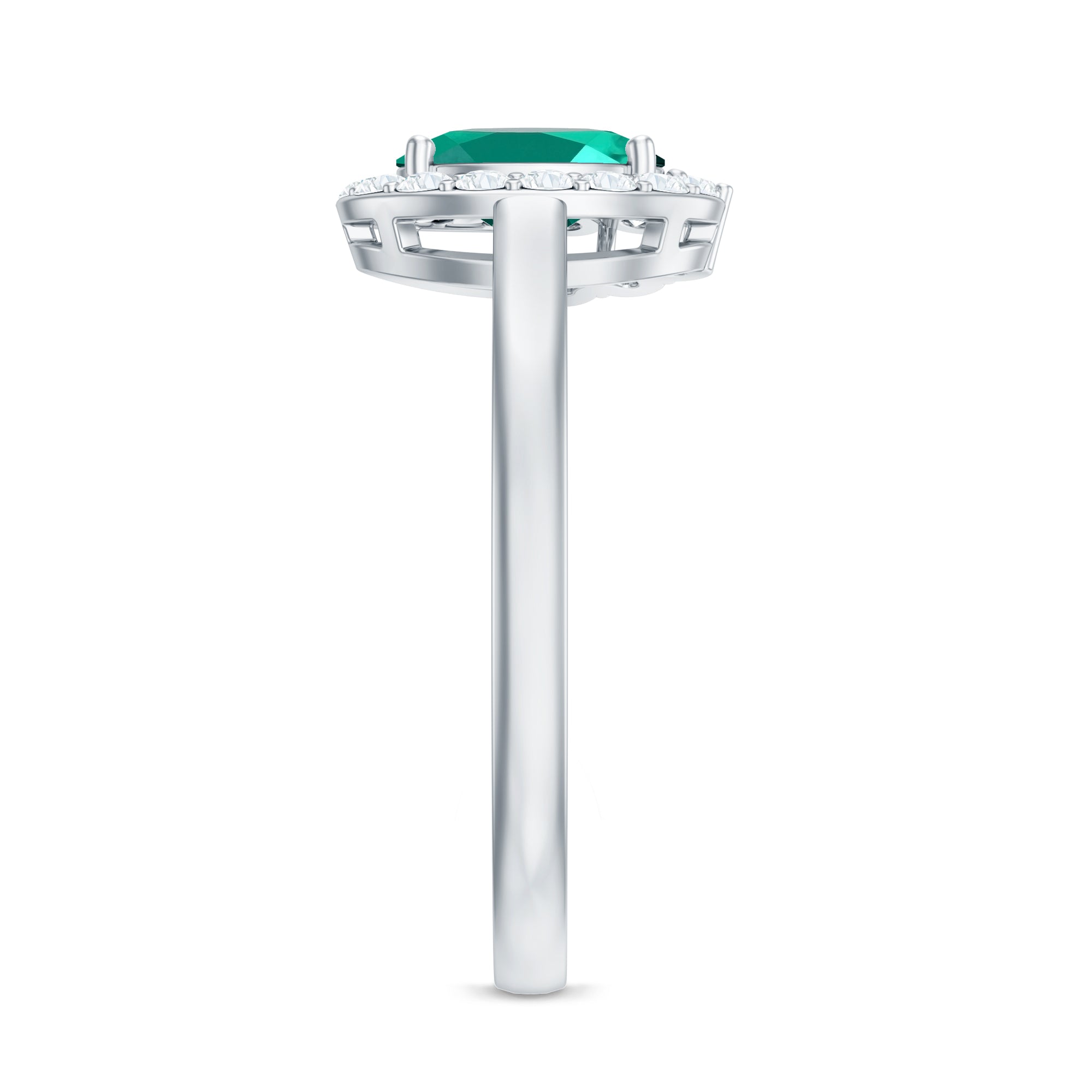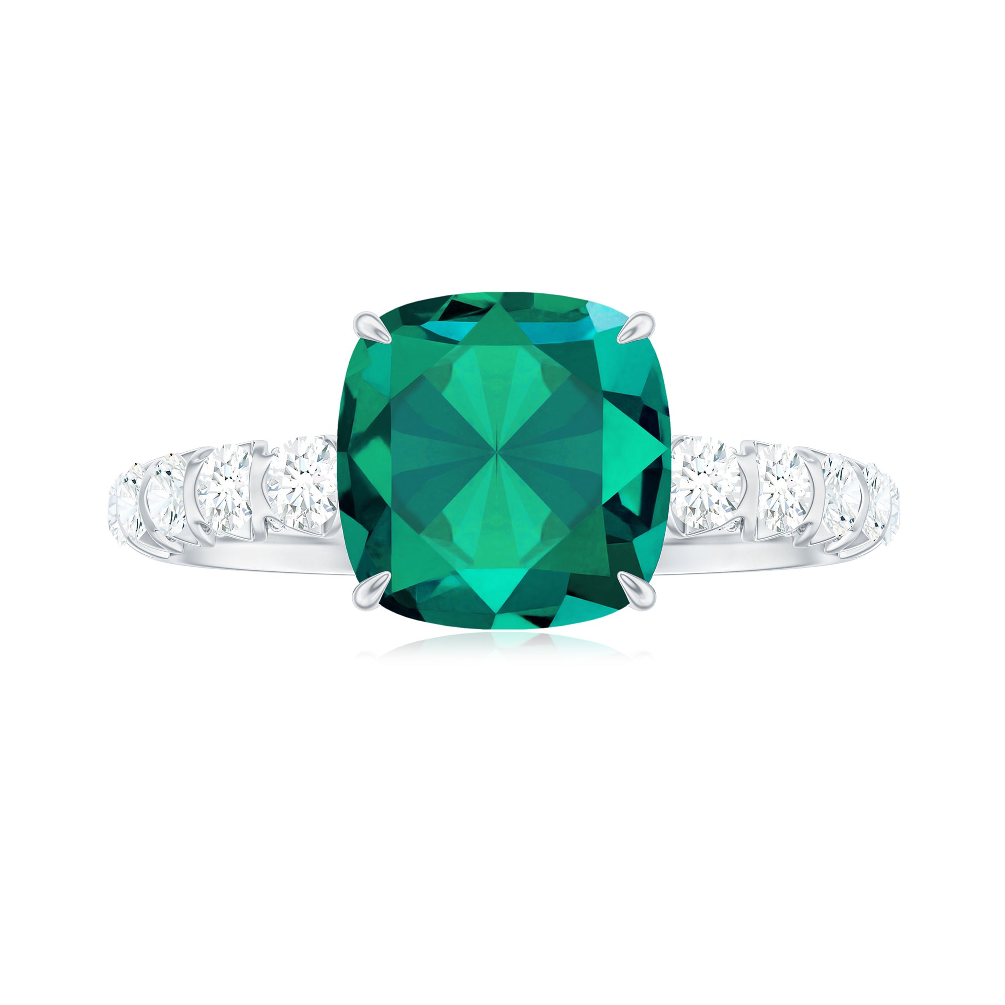 Lab Grown Emerald Rings when set in yellow gold metal, give a luxurious appearance. This metal type is extremely beautiful and gives a classic charm, ideal for any piece of jewelry. This warm metal type brings out the best vibrant green hue of the lab grown emerald.Lab Created Emerald Ring White Gold: