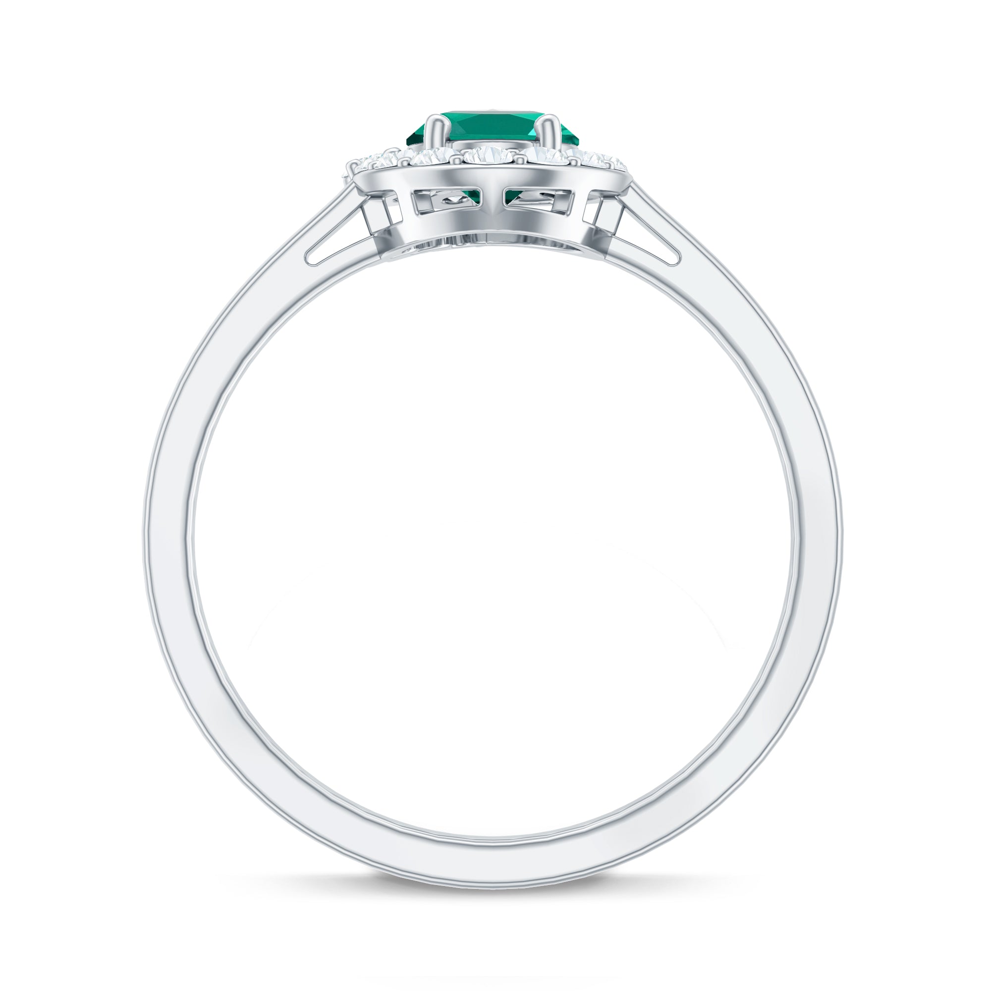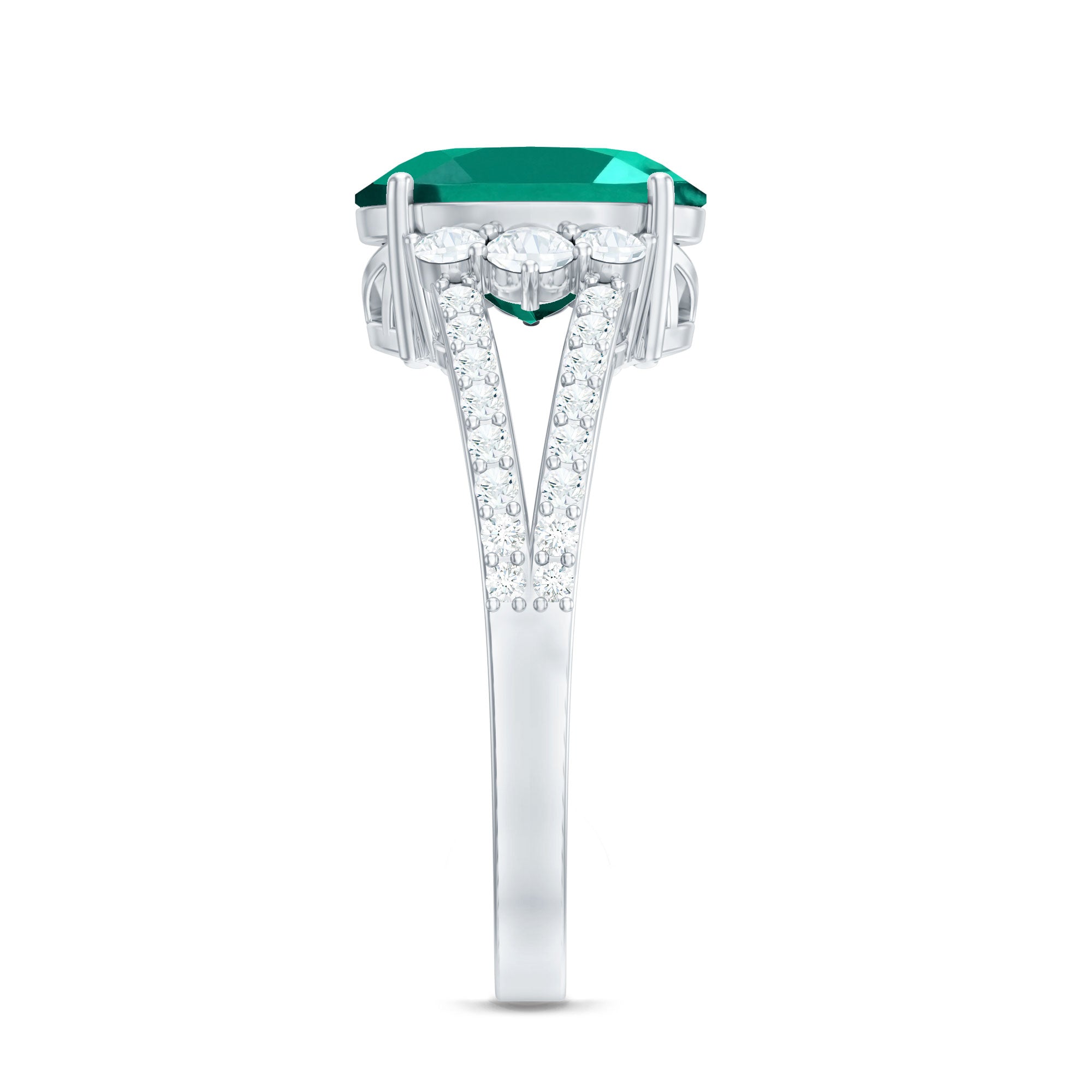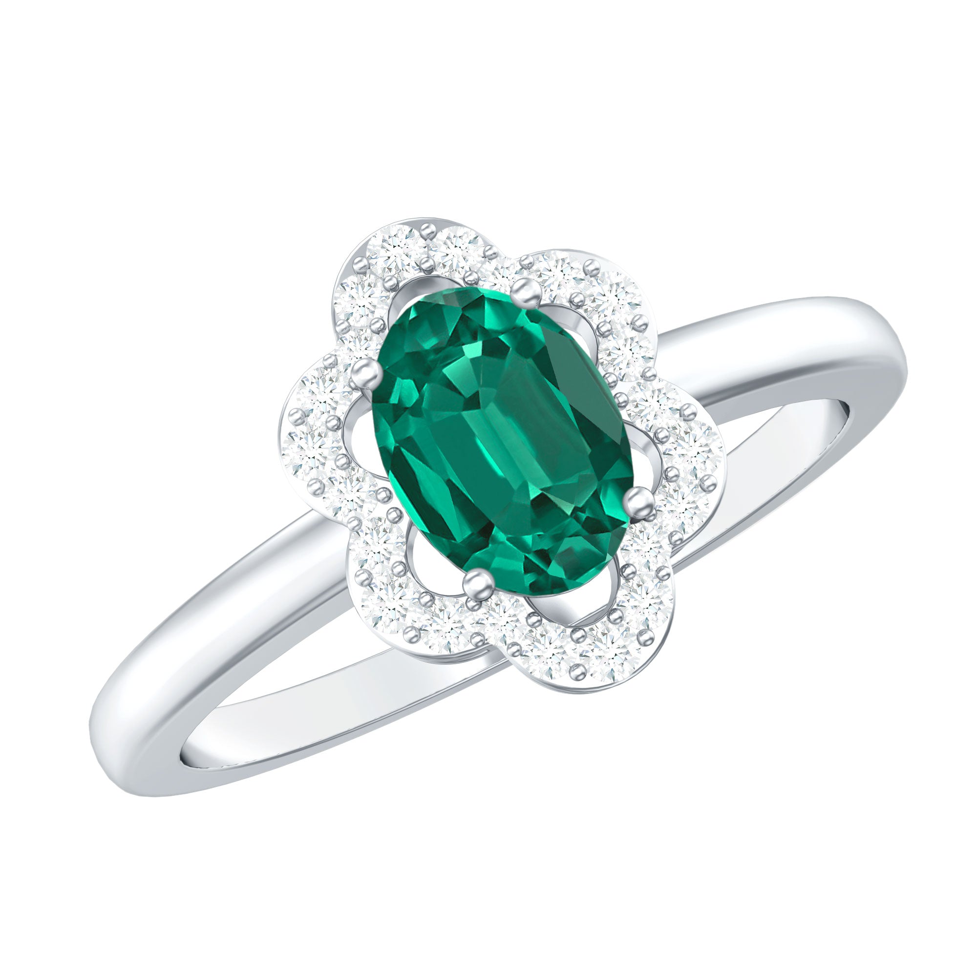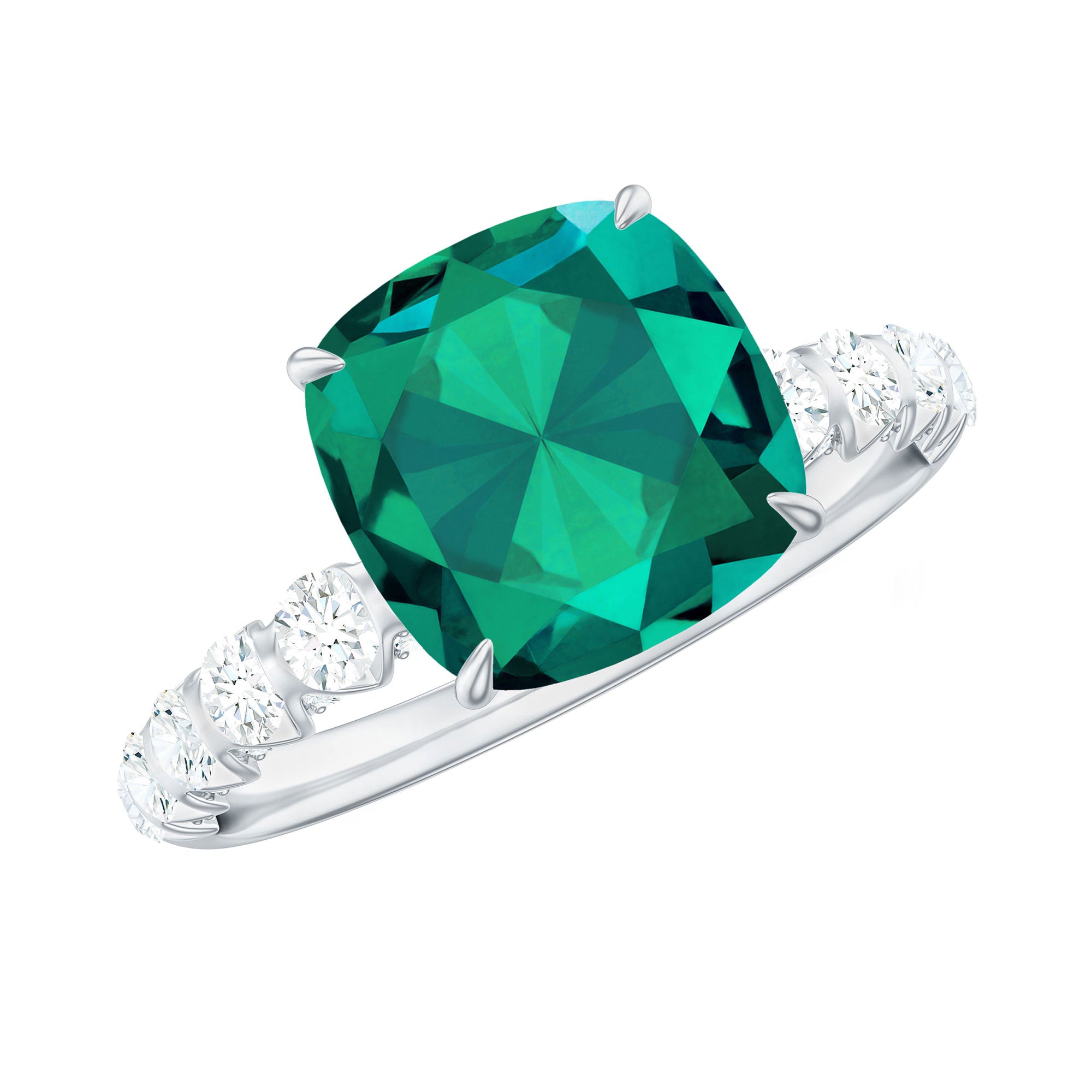 Lab Grown Emerald Rings when set in yellow gold metal, give a luxurious appearance. This metal type is extremely beautiful and gives a classic charm, ideal for any piece of jewelry. This warm metal type brings out the best vibrant green hue of the lab grown emerald.Lab Created Emerald Ring White Gold:
