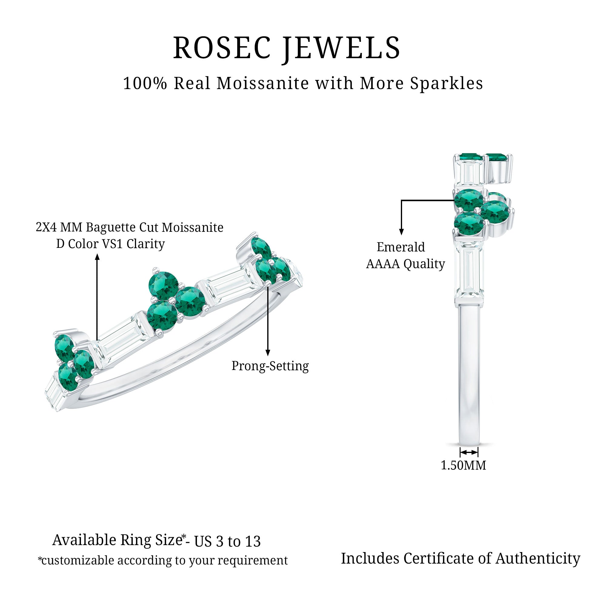 Explore certified lab grown emerald rings for women at Rosec Jewels today! You can simply choose from a variety of styles such as halo, solitaire, minimal, nature inspired, classic, three stone, and more.