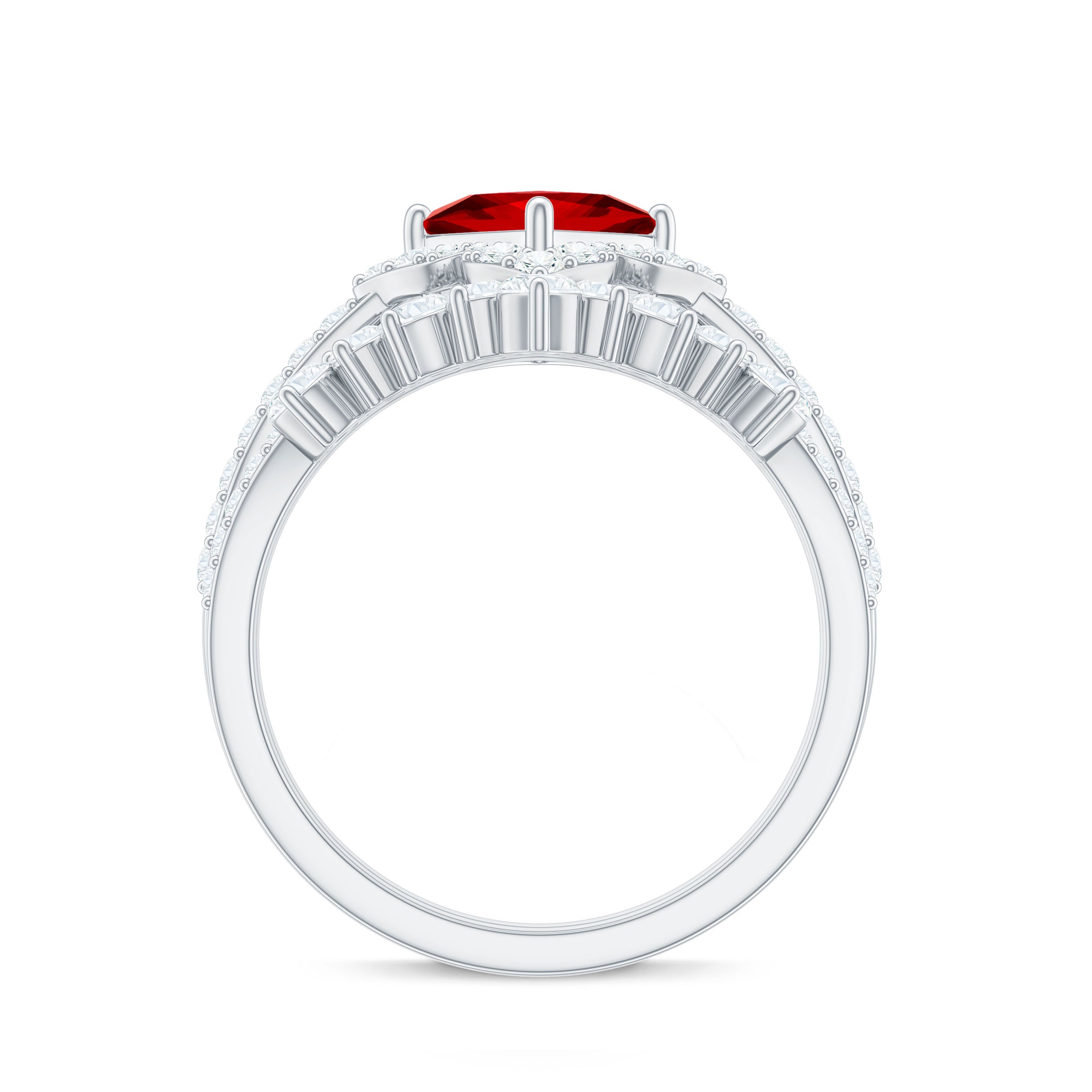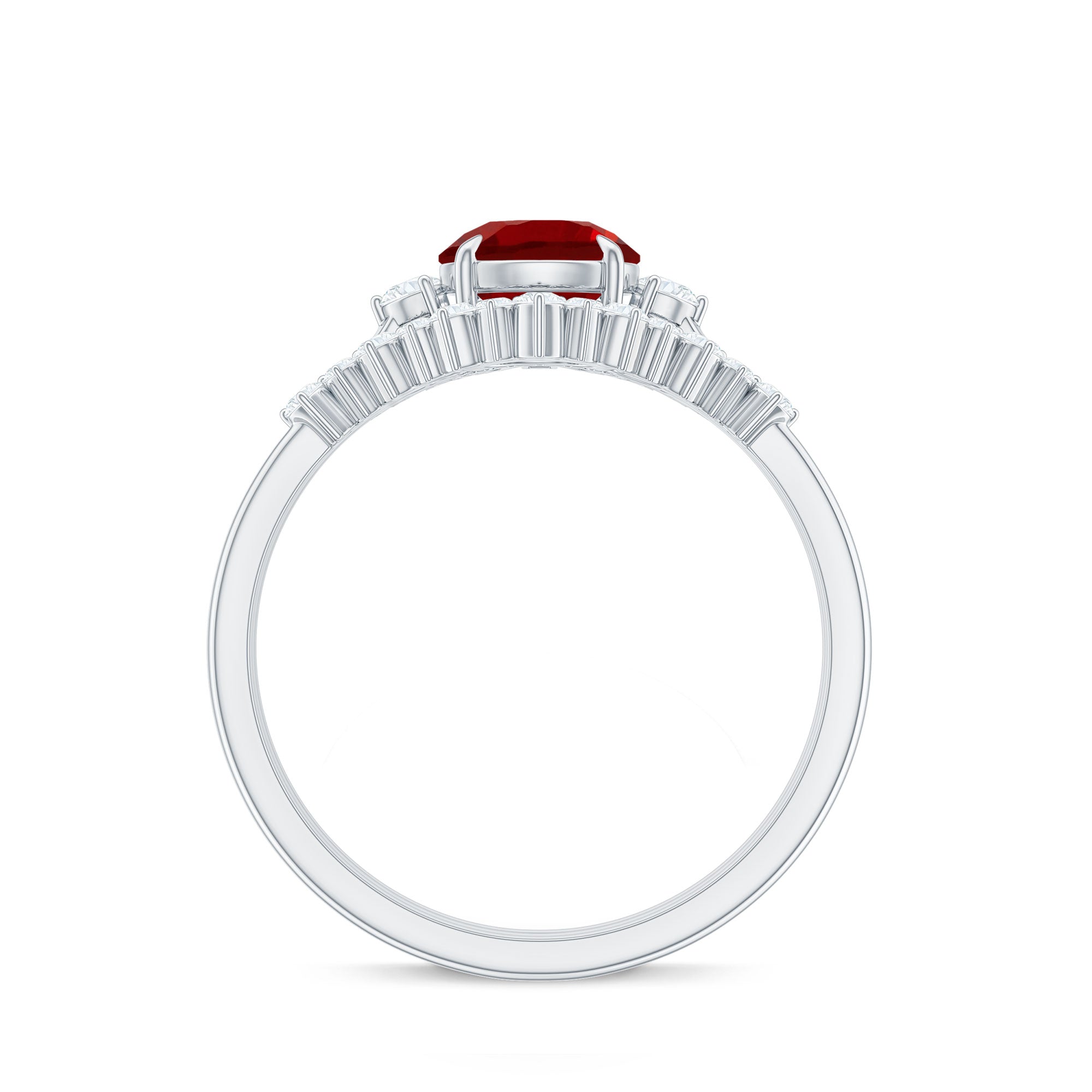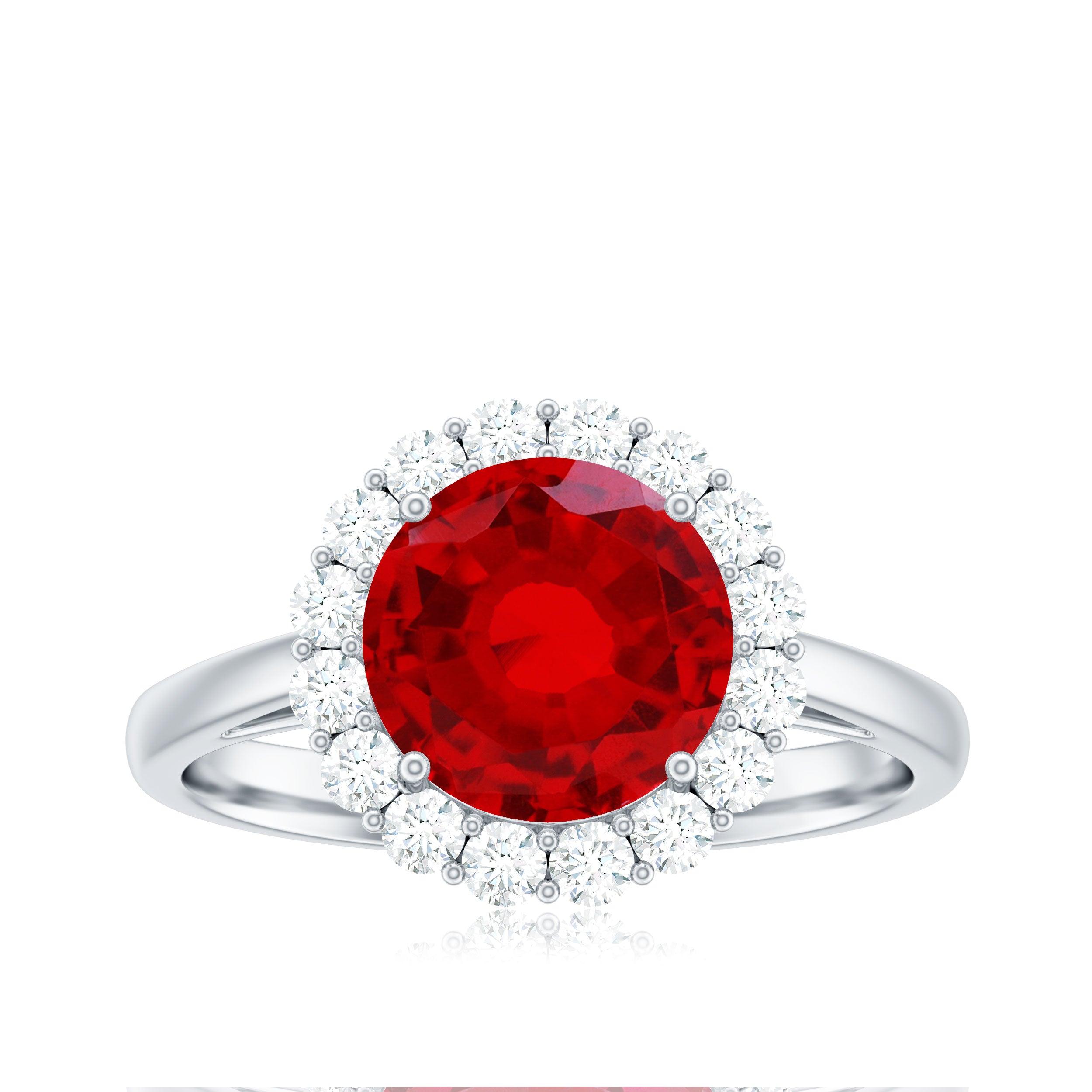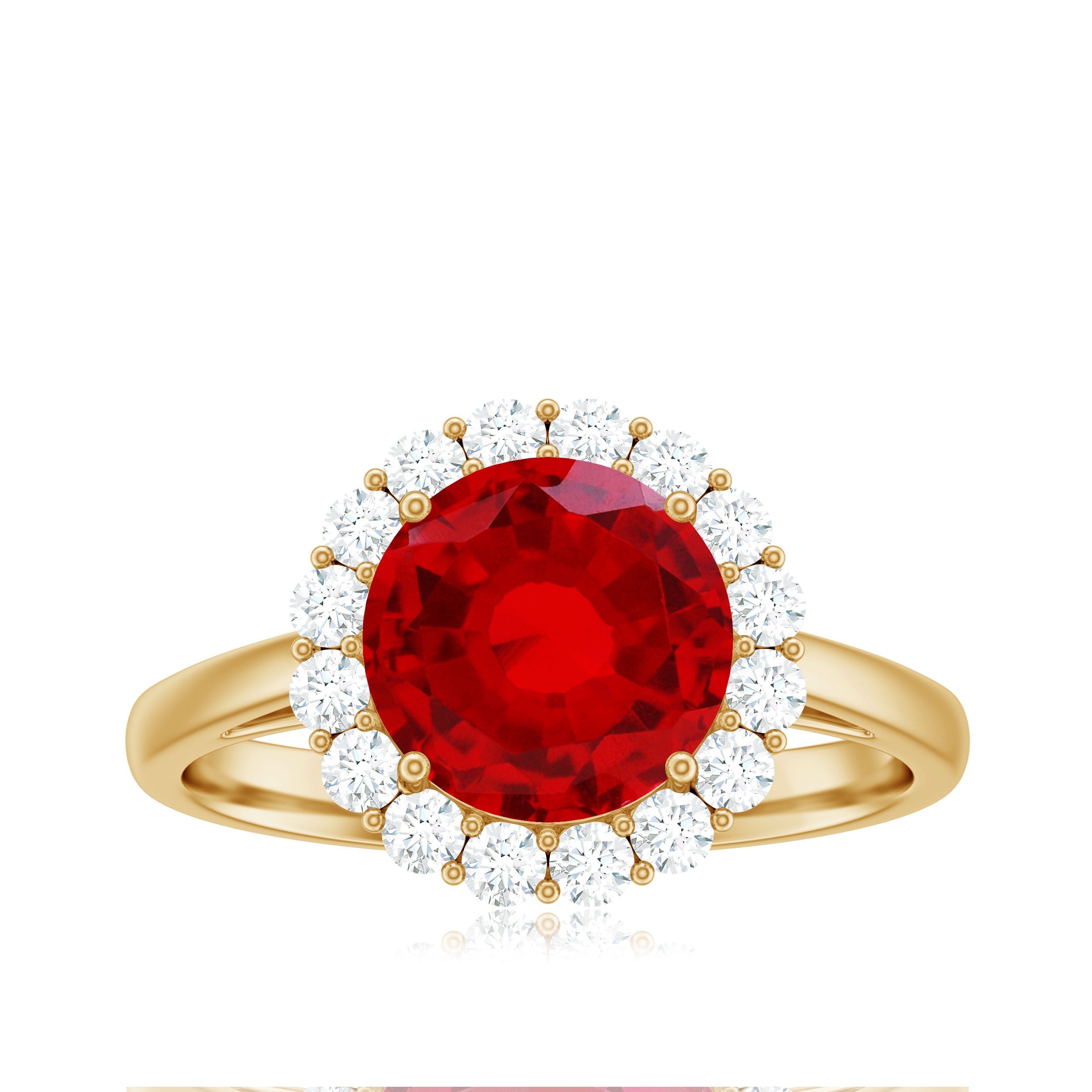 2. Halo Ruby Rings: A lab ruby surrounded by a circle of smaller diamonds or other colored gemstones for adding sparkle and brilliance. The halo makes the ruby gemstone stone appear larger and dazzling in a lab created ruby and diamond ring.