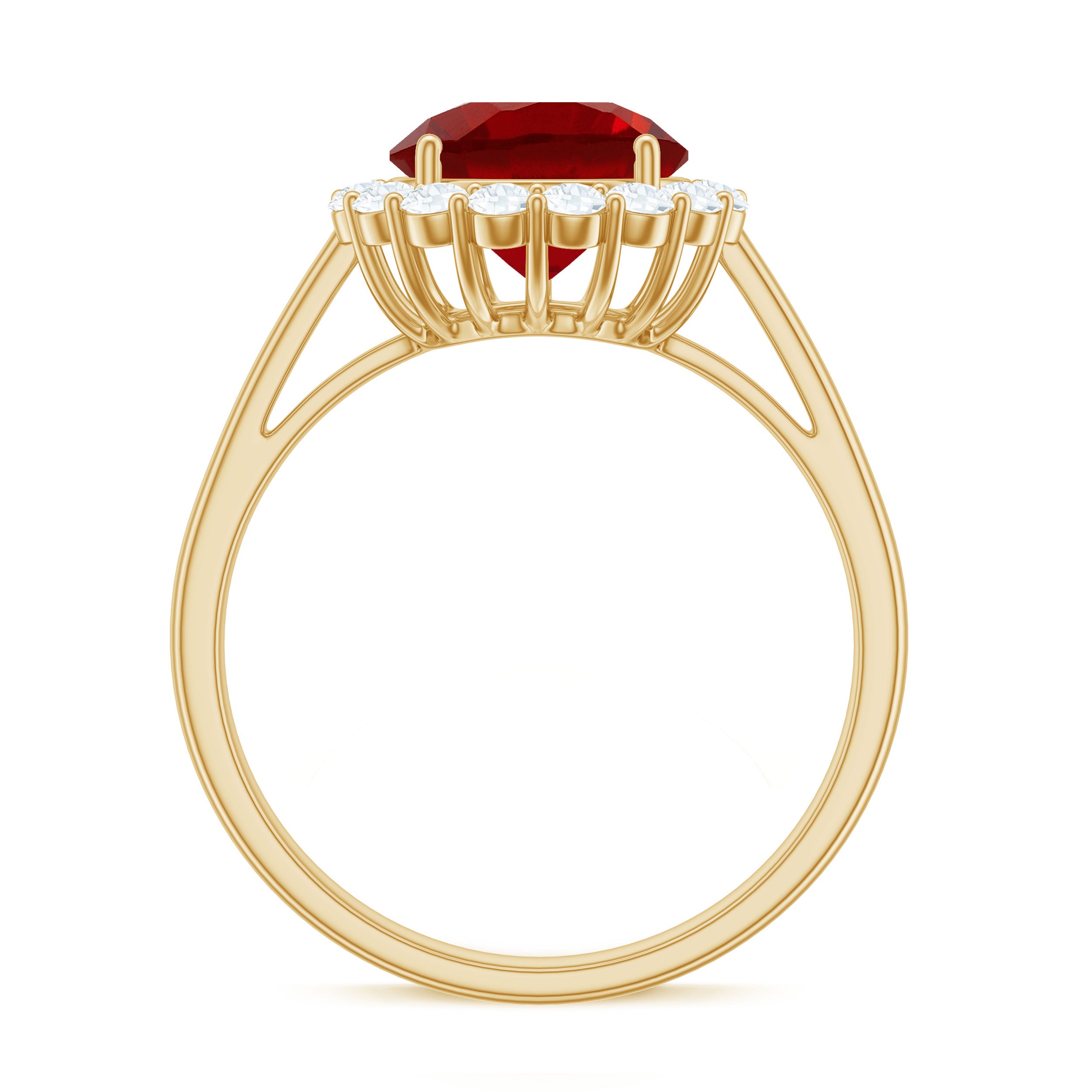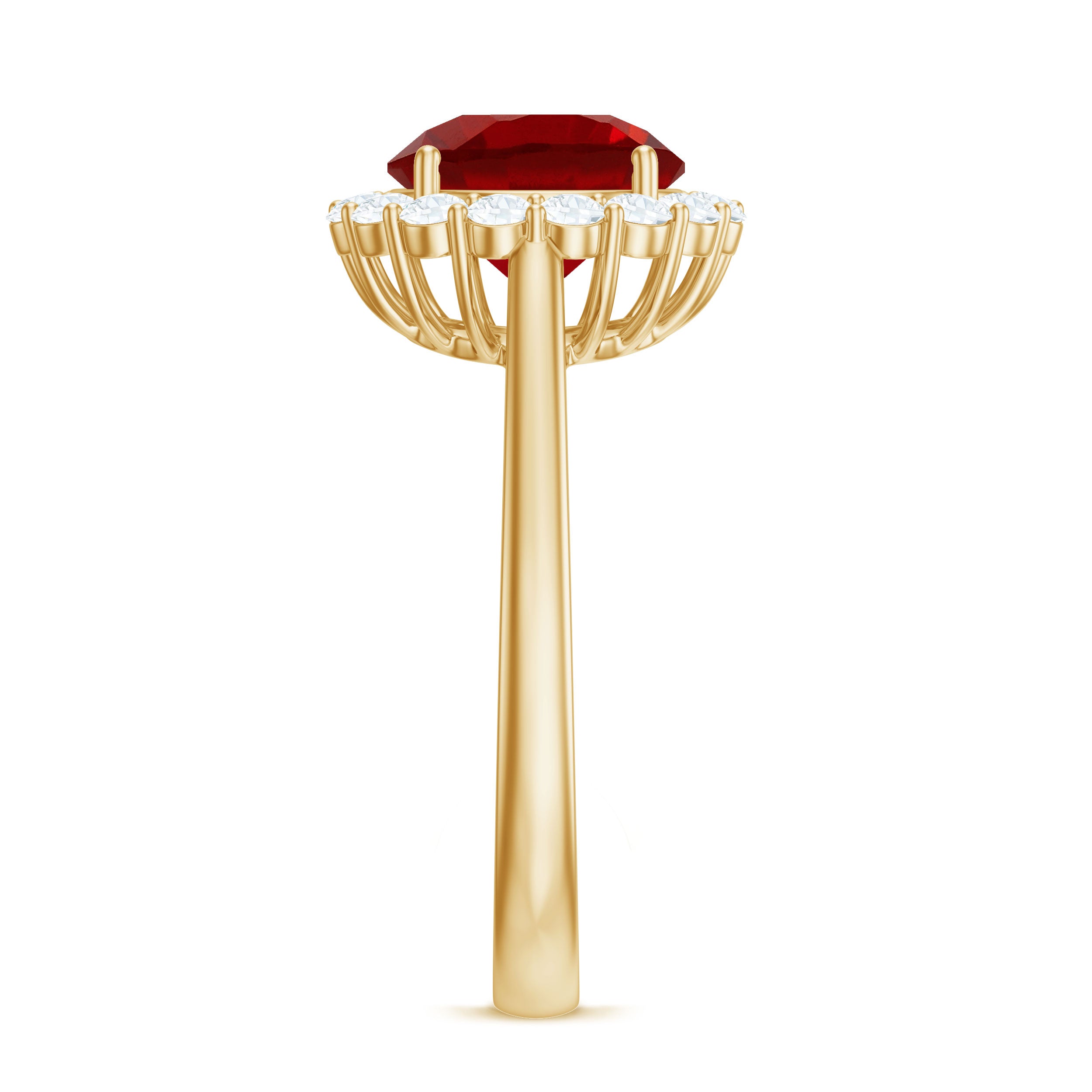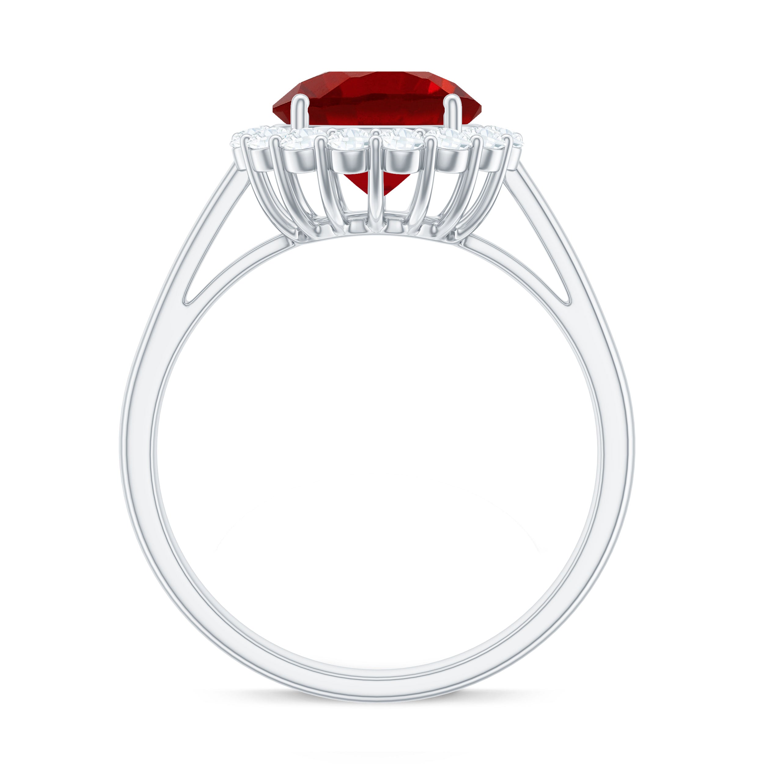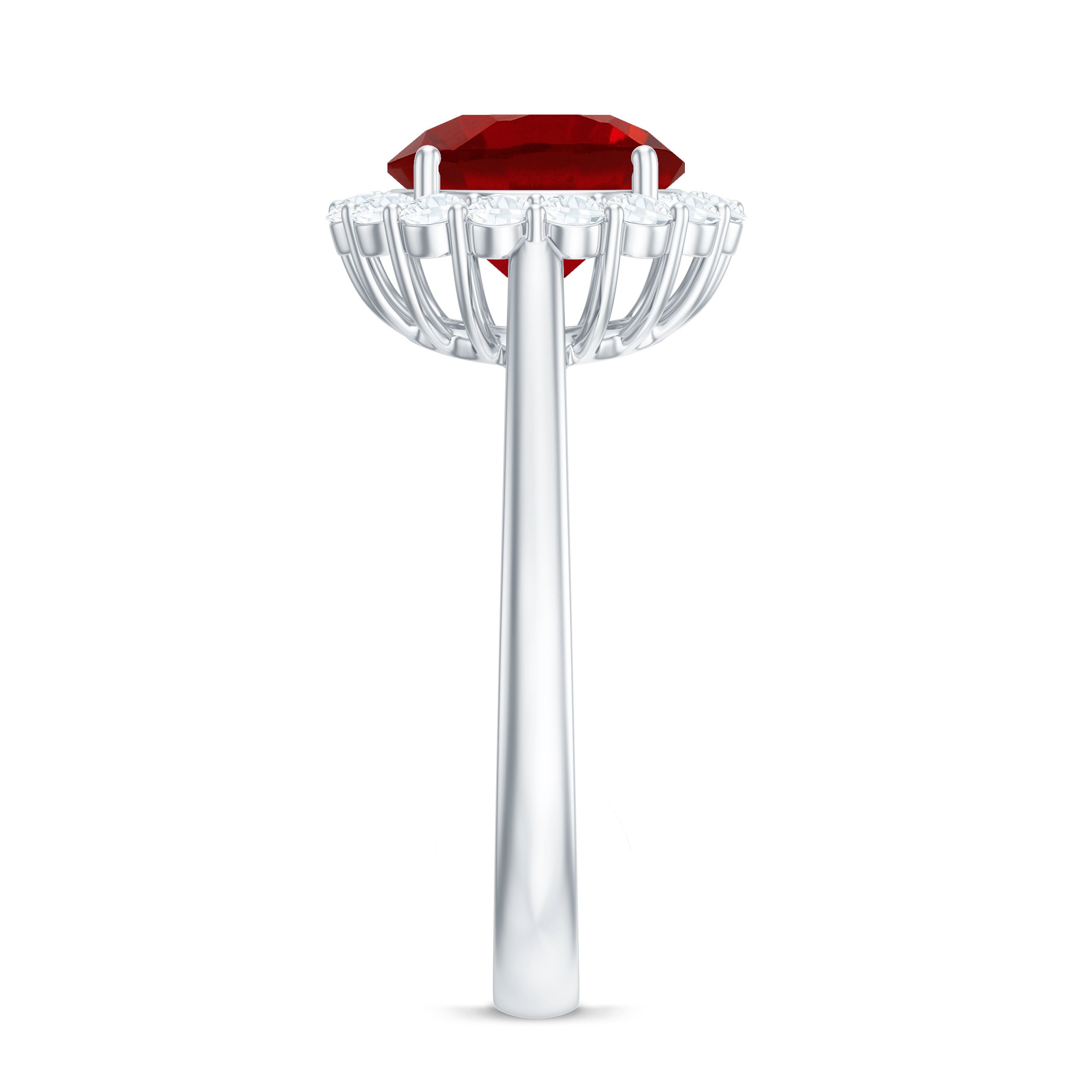 2. Halo Ruby Rings: A lab ruby surrounded by a circle of smaller diamonds or other colored gemstones for adding sparkle and brilliance. The halo makes the ruby gemstone stone appear larger and dazzling in a lab created ruby and diamond ring.