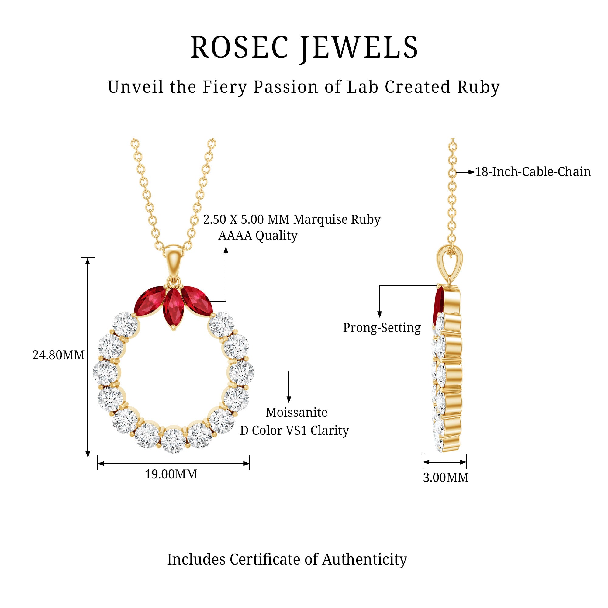Experience Craftsmanship: We are dedicated to providing the most exquisite lab-grown ruby necklaces that sparkle with a unique fire and hue. Our lab-grown necklaces are captivating and eco-friendly alternatives to mined ones. We are happy with our dedication to excellence in craftsmanship. Each Rosec Jewels piece is meticulously crafted to achieve the greatest level of quality.