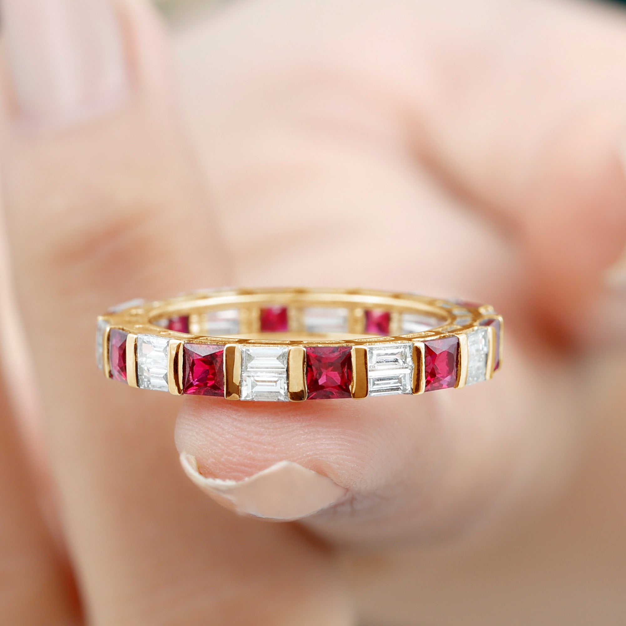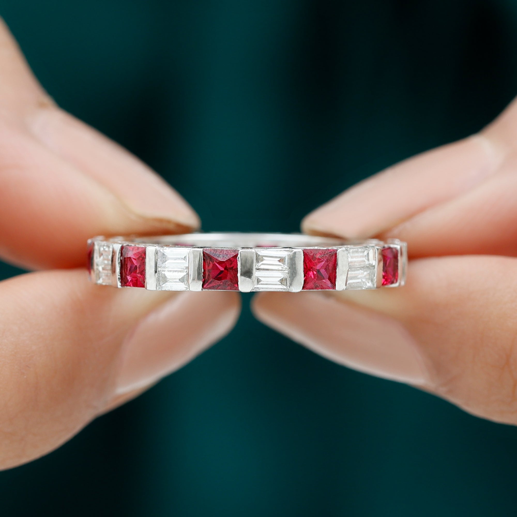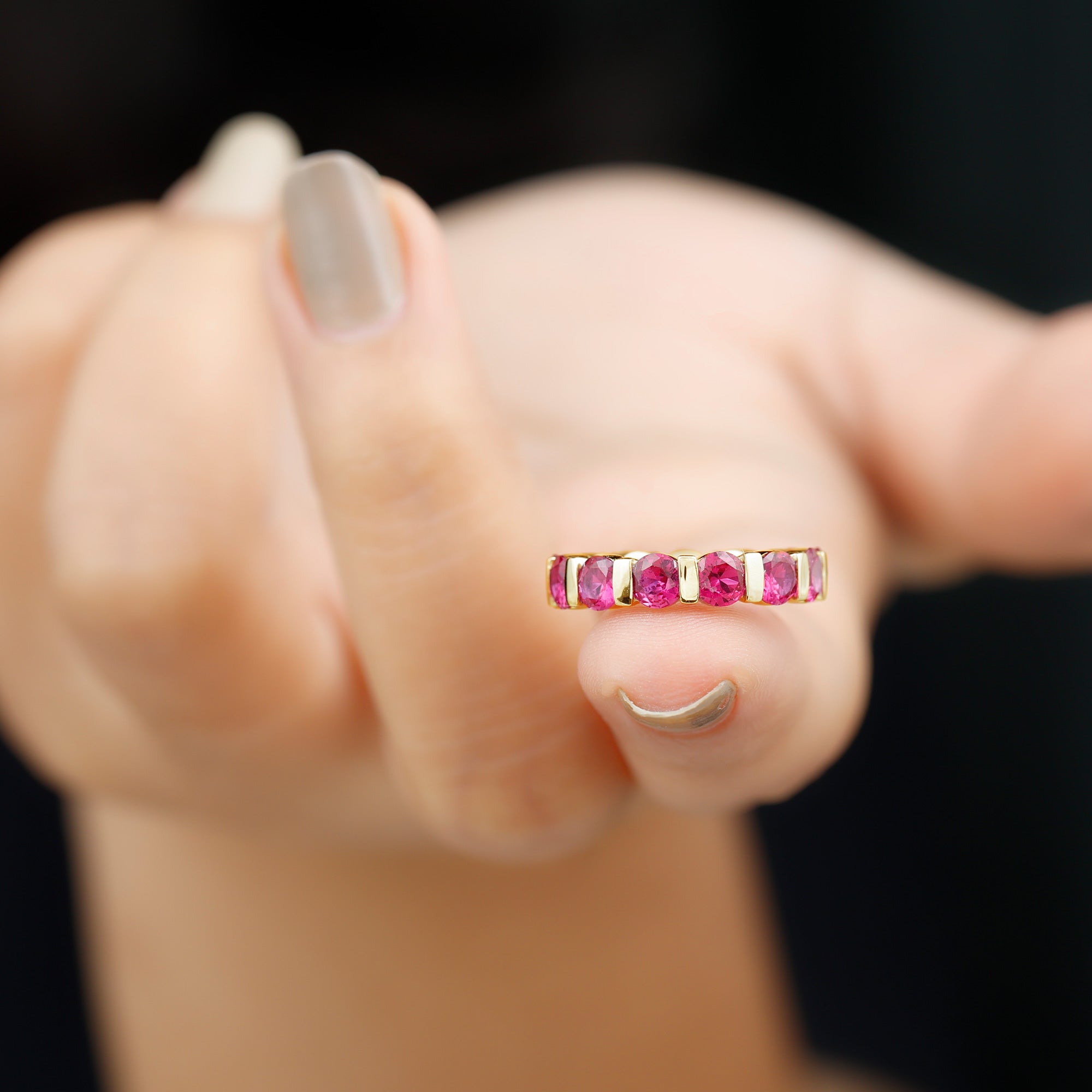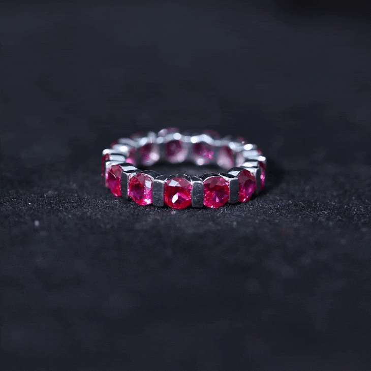 Eternity Rings: Eternity rings are complete circles of precious metals and lab-grown rubies without any endpoints. Eternity rings are popular choices for major milestones like anniversaries and weddings. the presence of lab-grown ruby all the way round to synthetic ruby ring with identical shape looks appealing.
