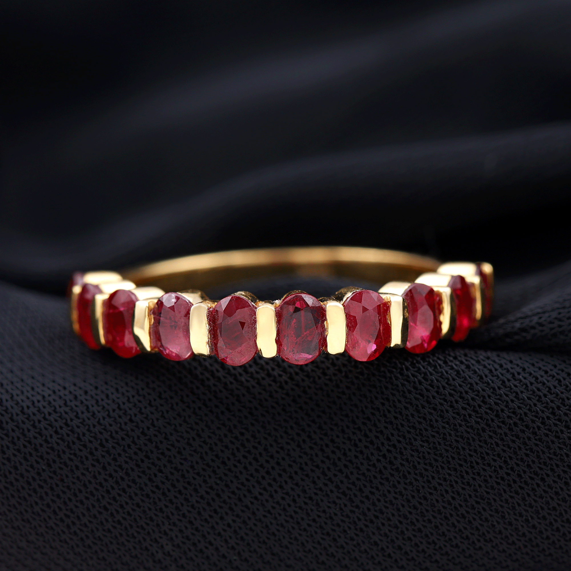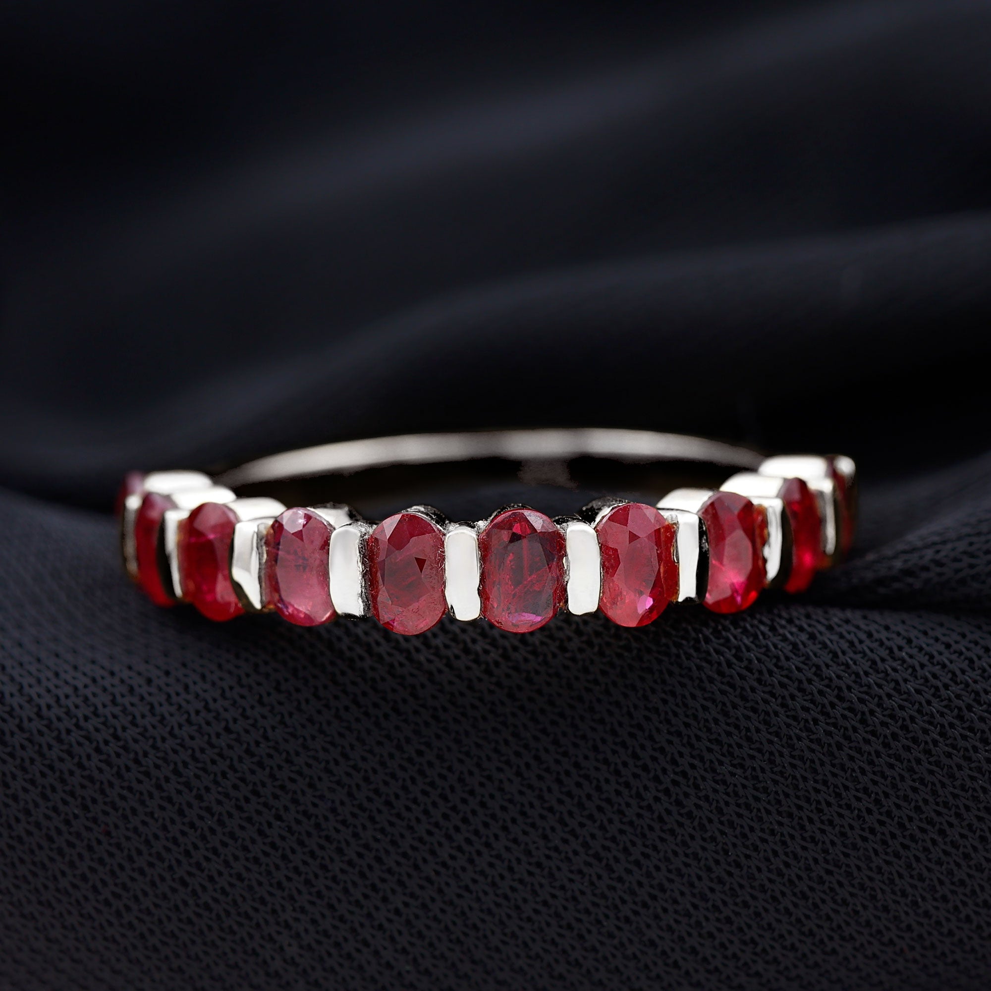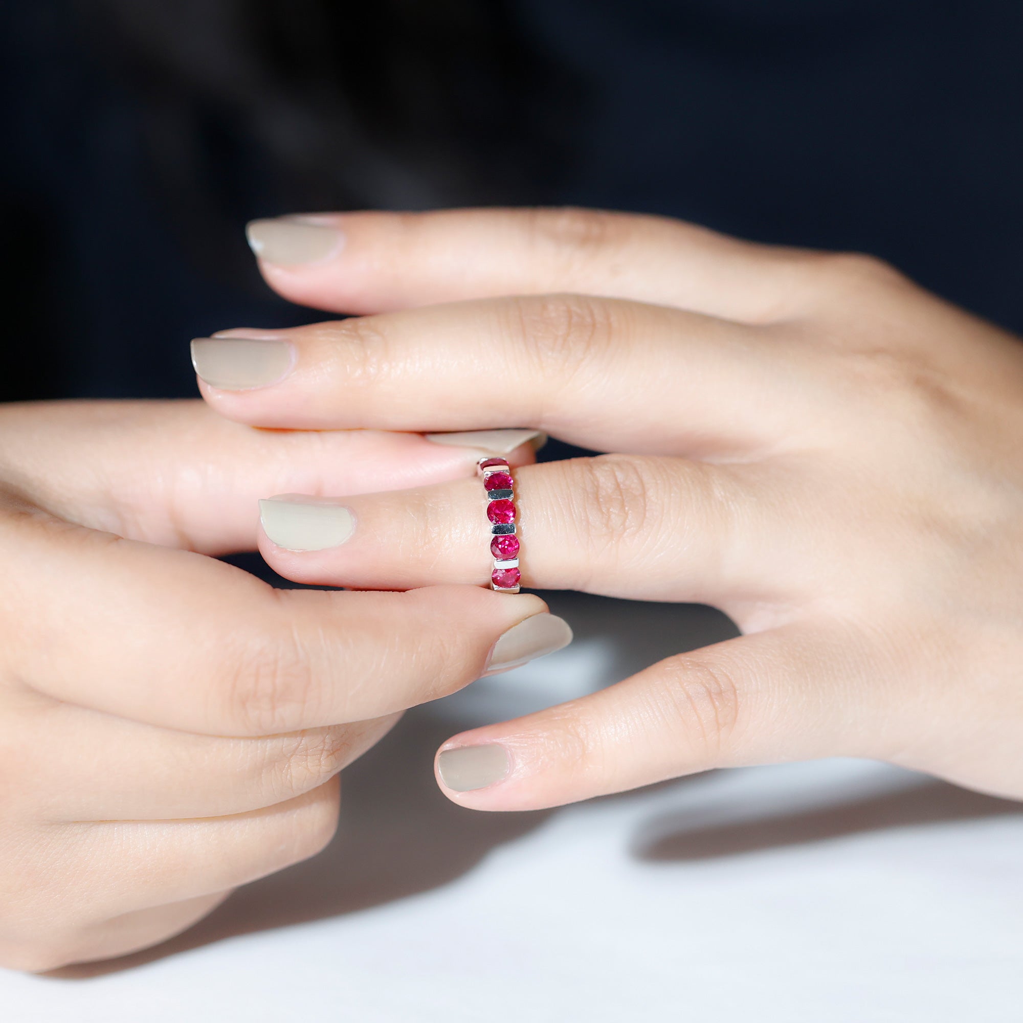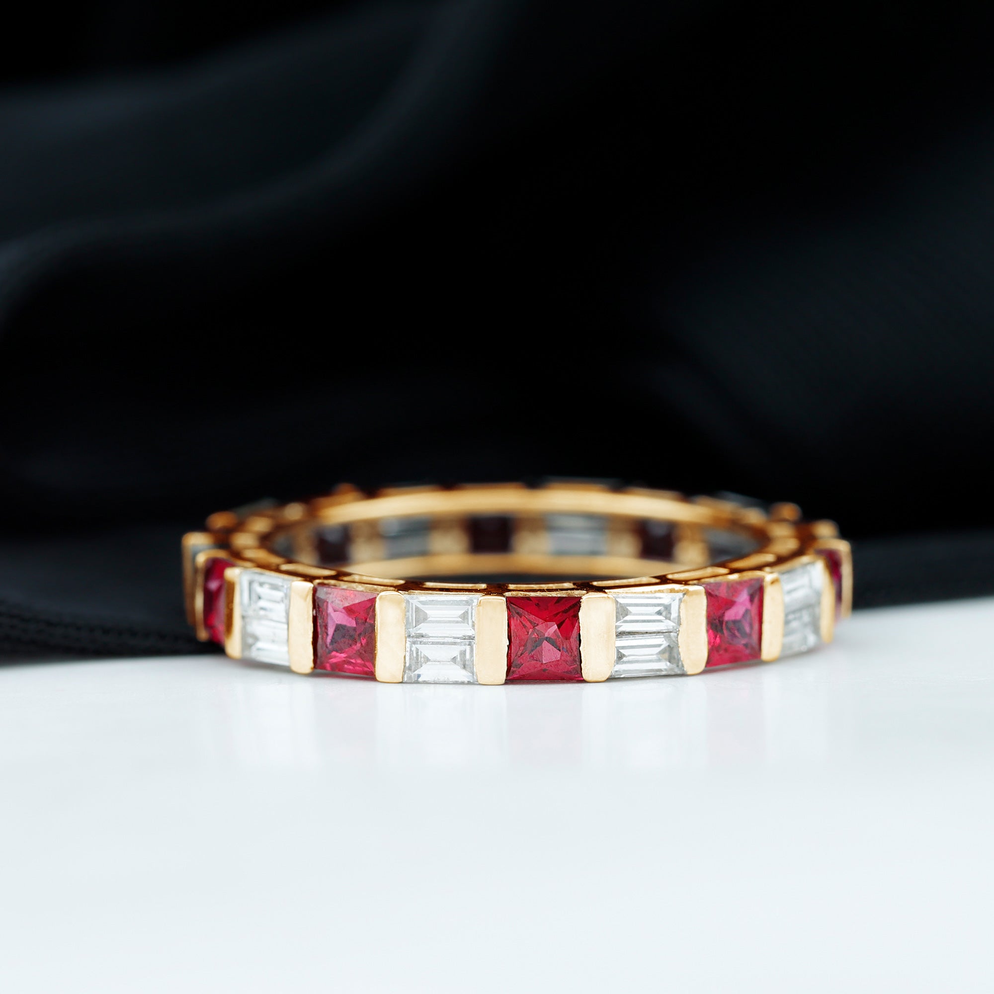 Eternity Rings: Eternity rings are complete circles of precious metals and lab-grown rubies without any endpoints. Eternity rings are popular choices for major milestones like anniversaries and weddings. the presence of lab-grown ruby all the way round to synthetic ruby ring with identical shape looks appealing.