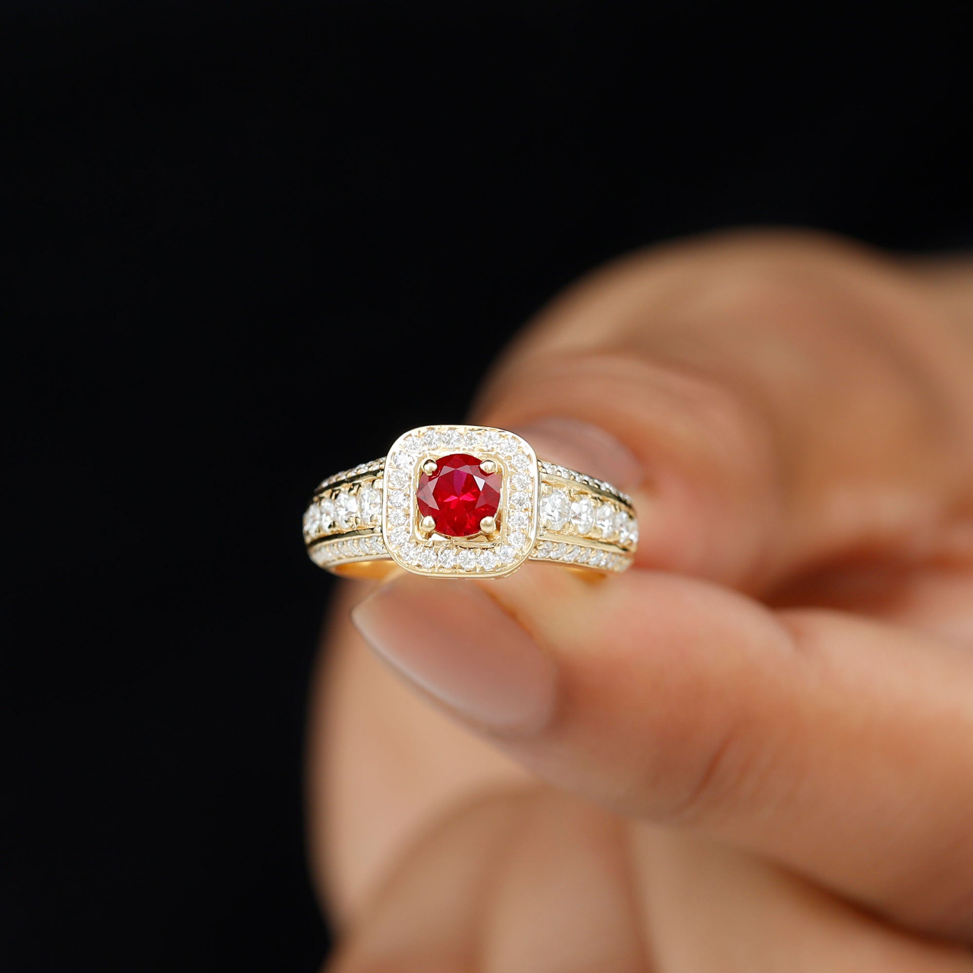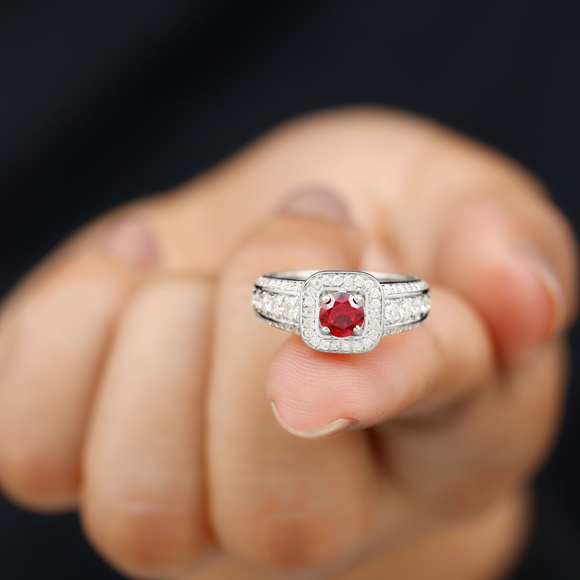 Halo Engagement Rings are beautiful designs for those looking for an affordable alternative to solitaire rings. Small solitaire ruby gemstones are placed between a circle of small gemstones, creating beautiful designs. The side stones may be rubies, diamond accents, or other gemstones, opening design options in artificial ruby rings.