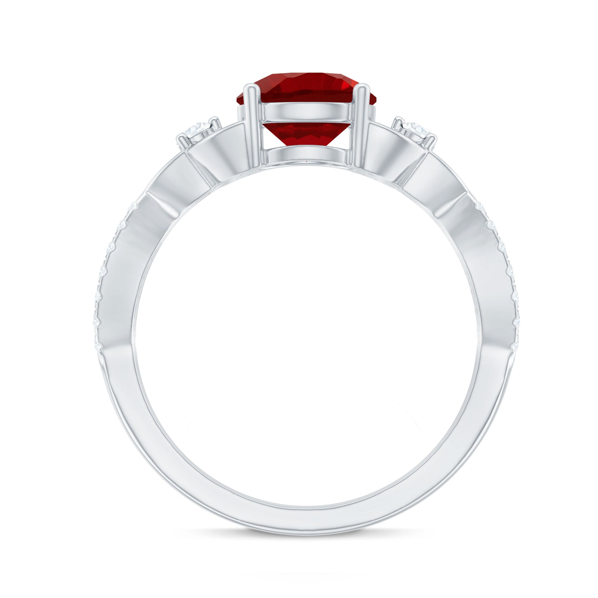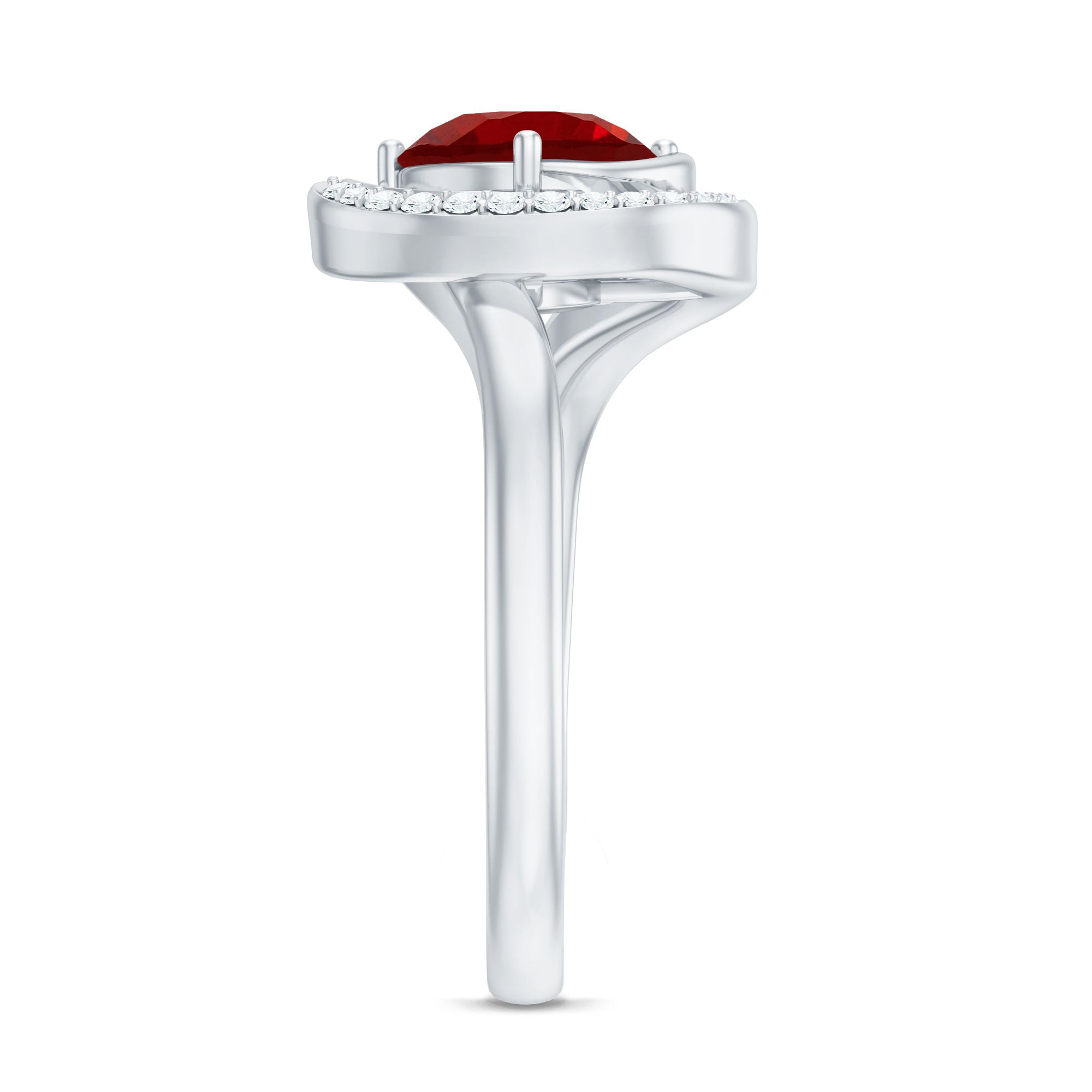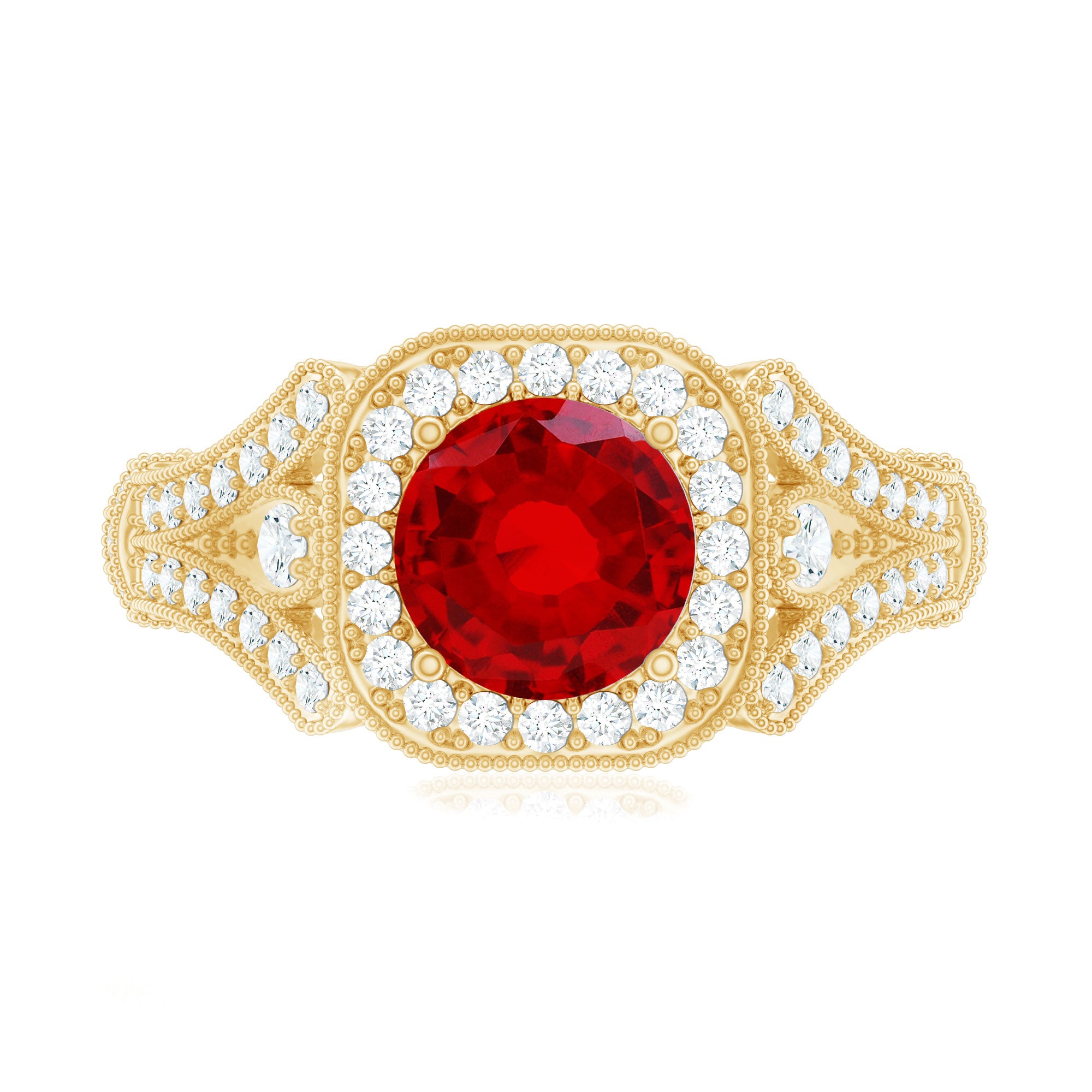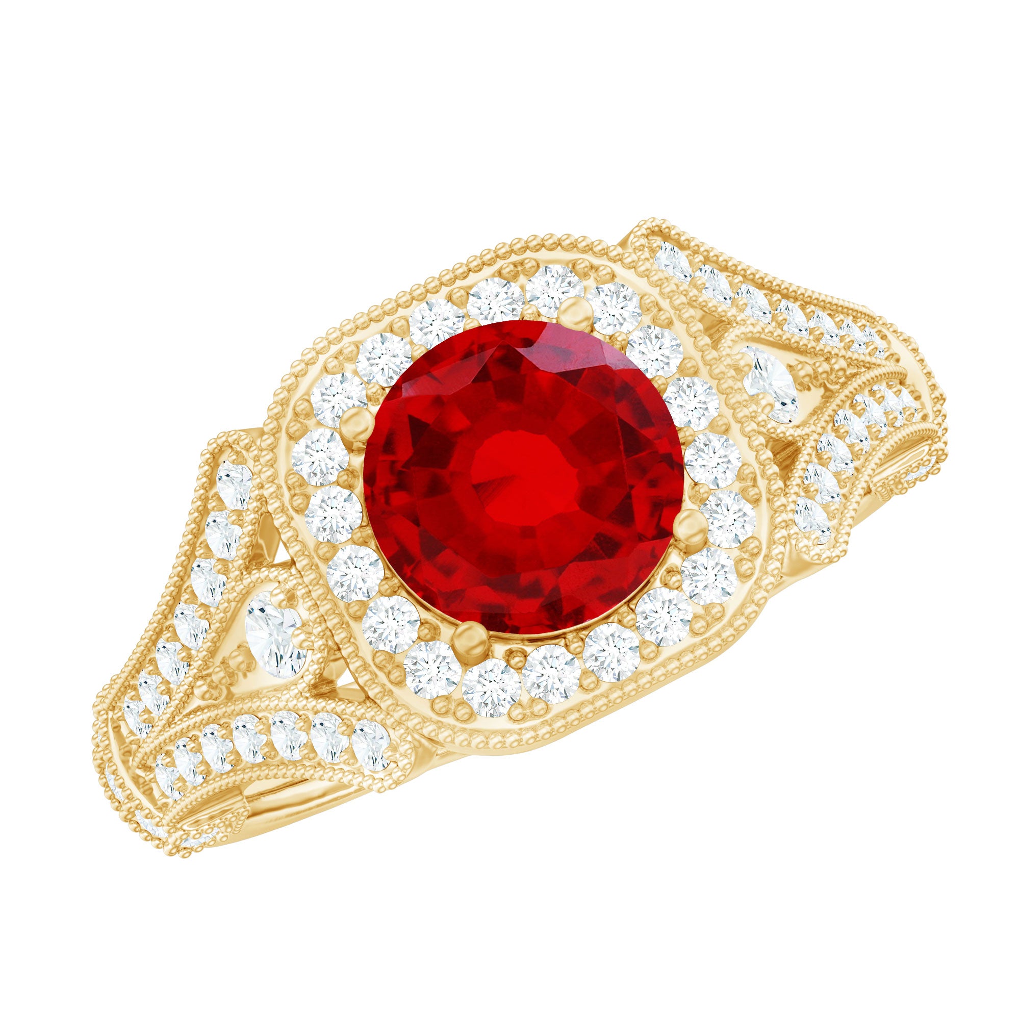 Halo Engagement Rings are beautiful designs for those looking for an affordable alternative to solitaire rings. Small solitaire ruby gemstones are placed between a circle of small gemstones, creating beautiful designs. The side stones may be rubies, diamond accents, or other gemstones, opening design options in artificial ruby rings.