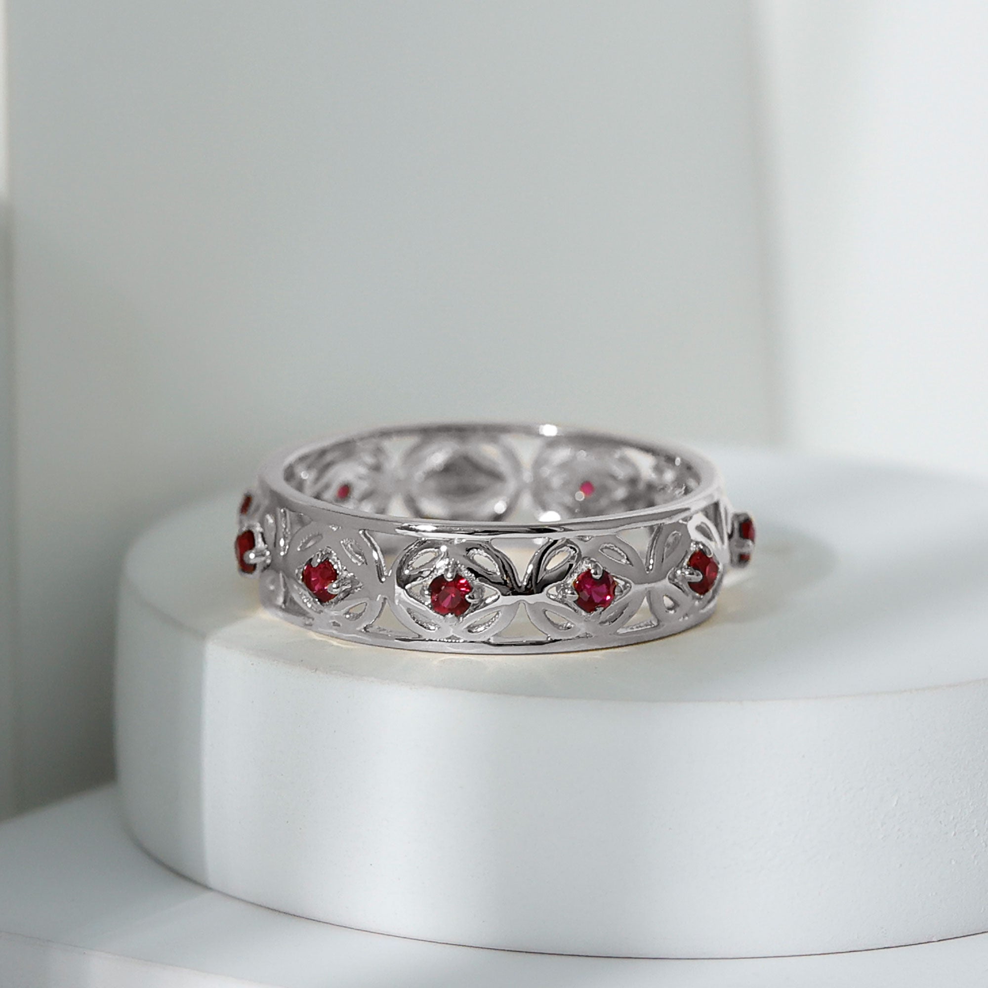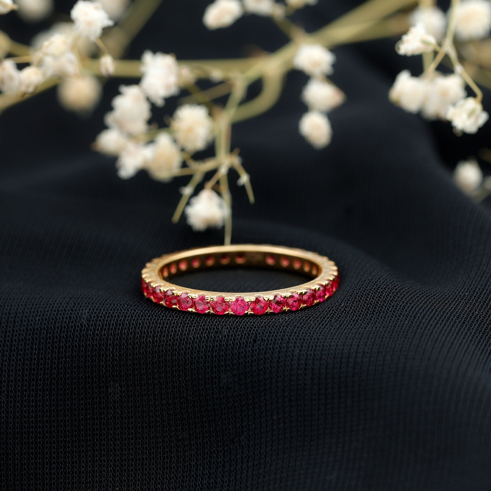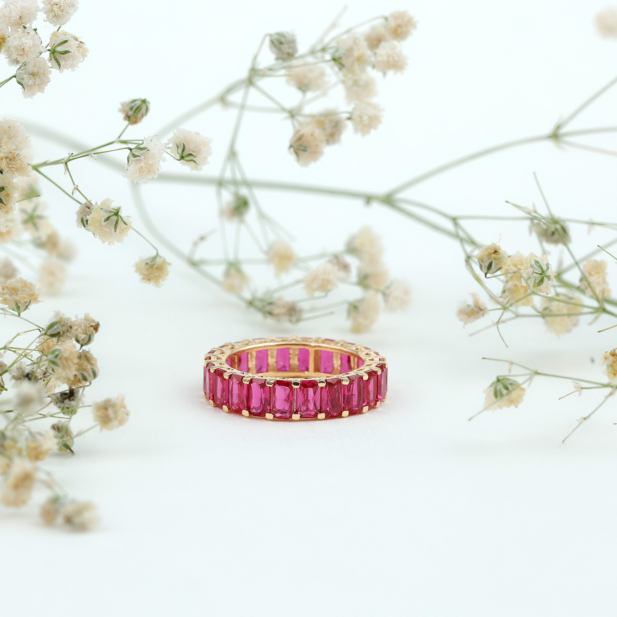 Eternity Rings: Eternity rings are complete circles of precious metals and lab-grown rubies without any endpoints. Eternity rings are popular choices for major milestones like anniversaries and weddings. the presence of lab-grown ruby all the way round to synthetic ruby ring with identical shape looks appealing.