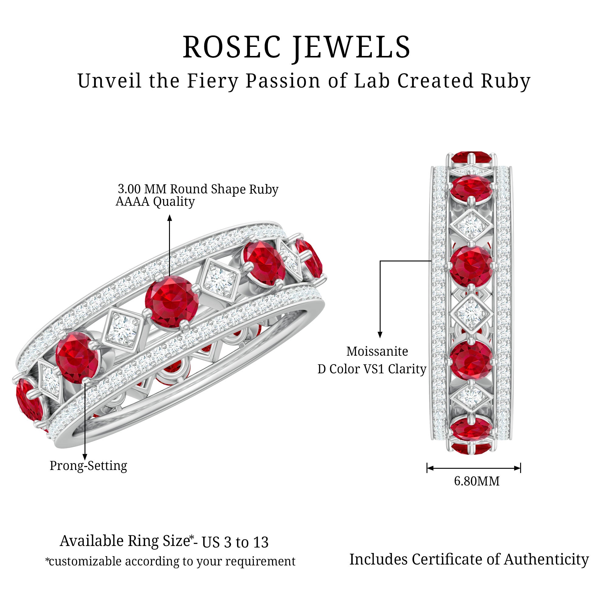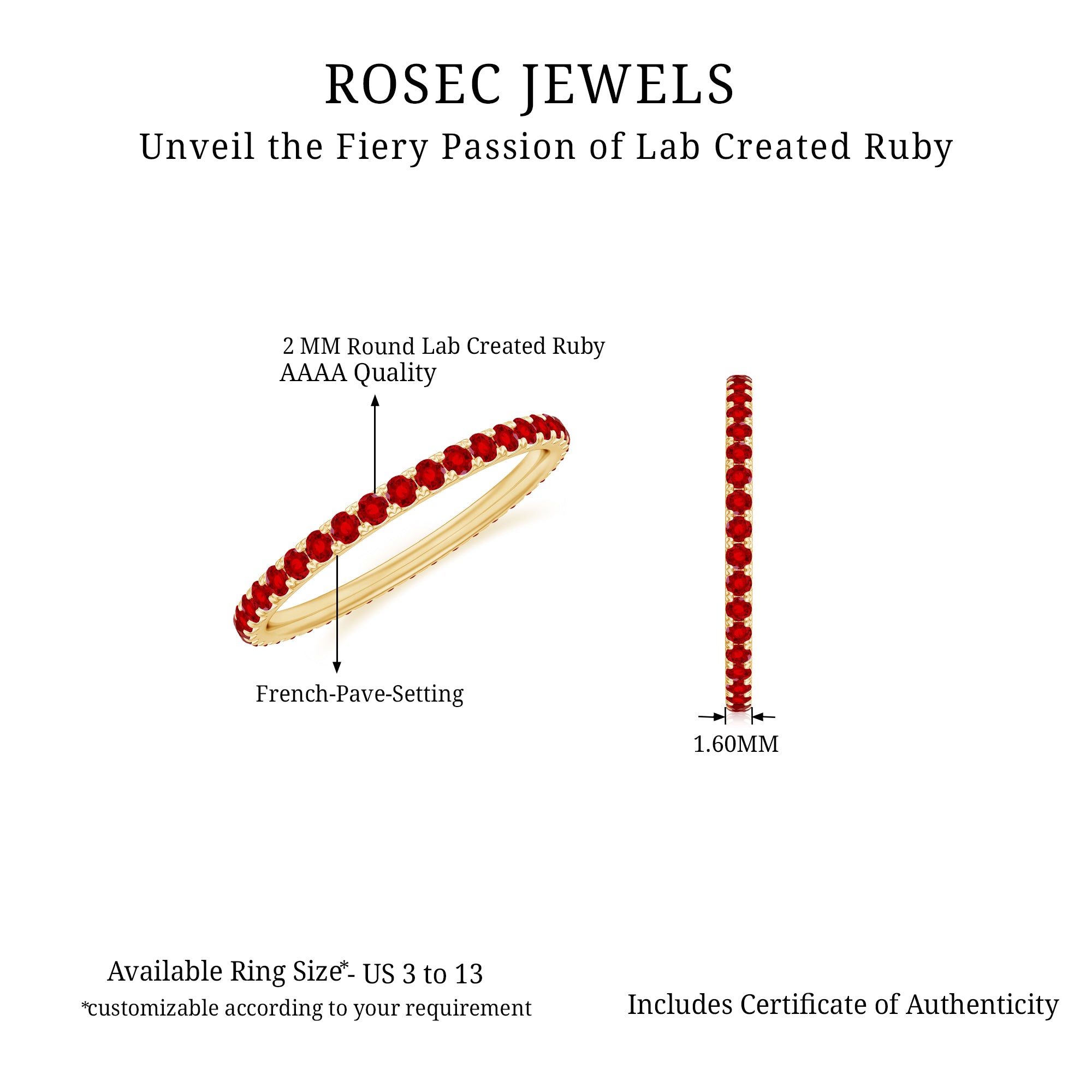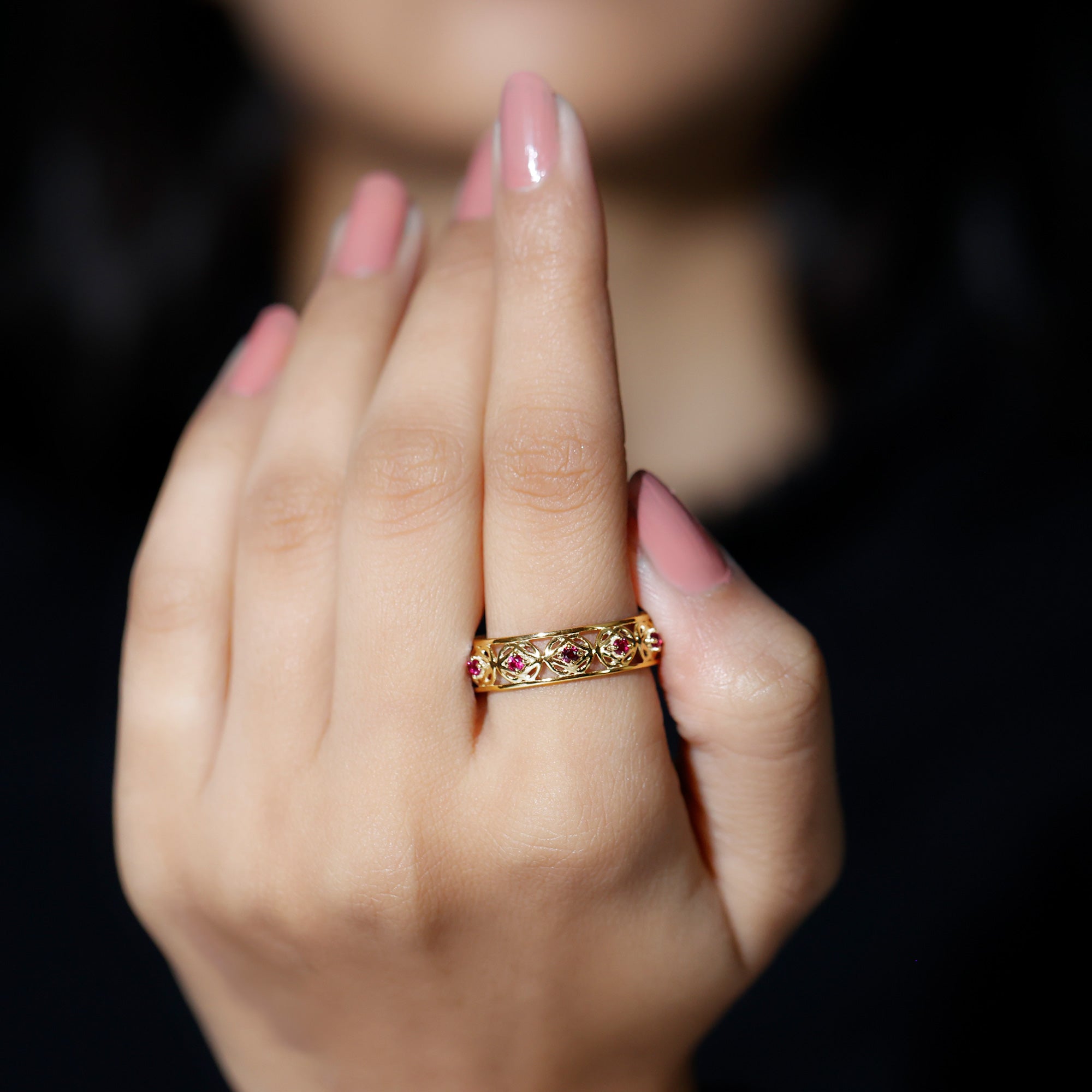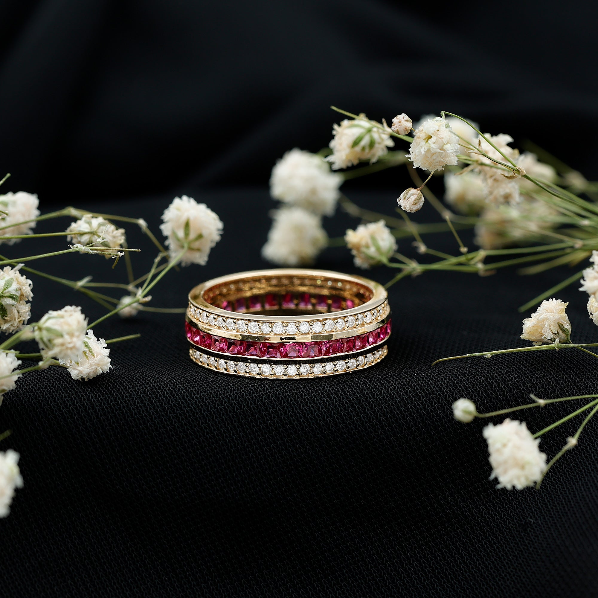 Eternity Rings: Eternity rings are complete circles of precious metals and lab-grown rubies without any endpoints. Eternity rings are popular choices for major milestones like anniversaries and weddings. the presence of lab-grown ruby all the way round to synthetic ruby ring with identical shape looks appealing.