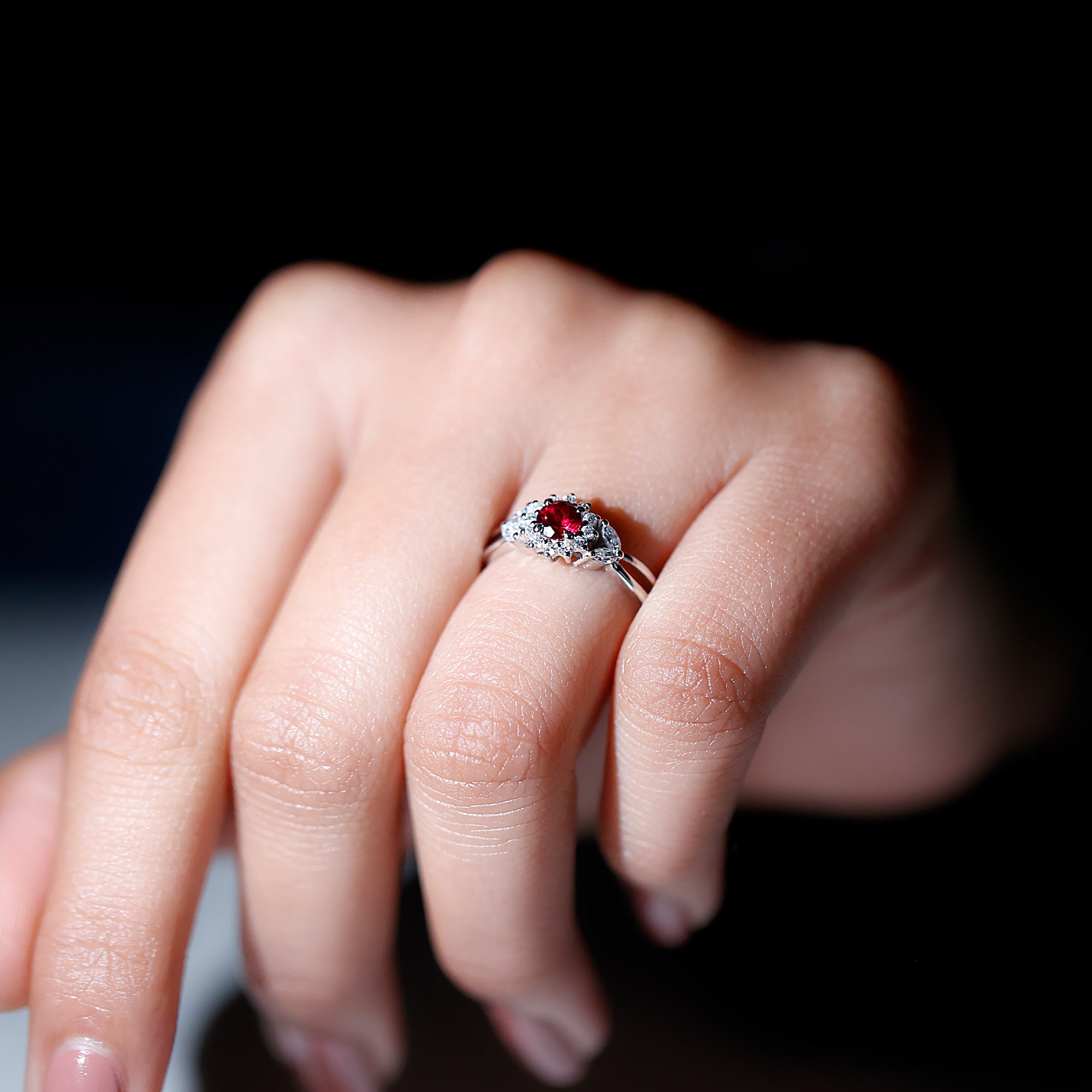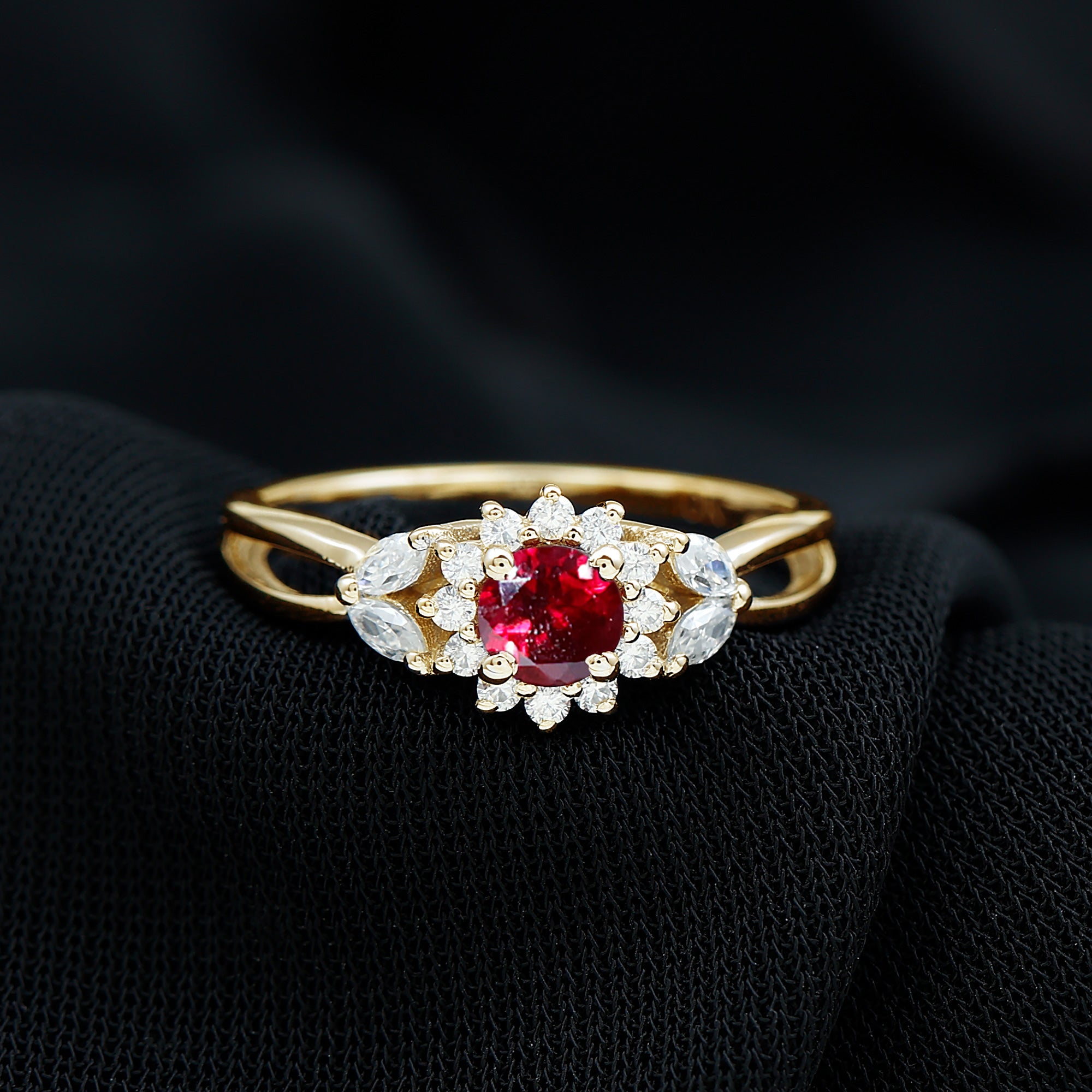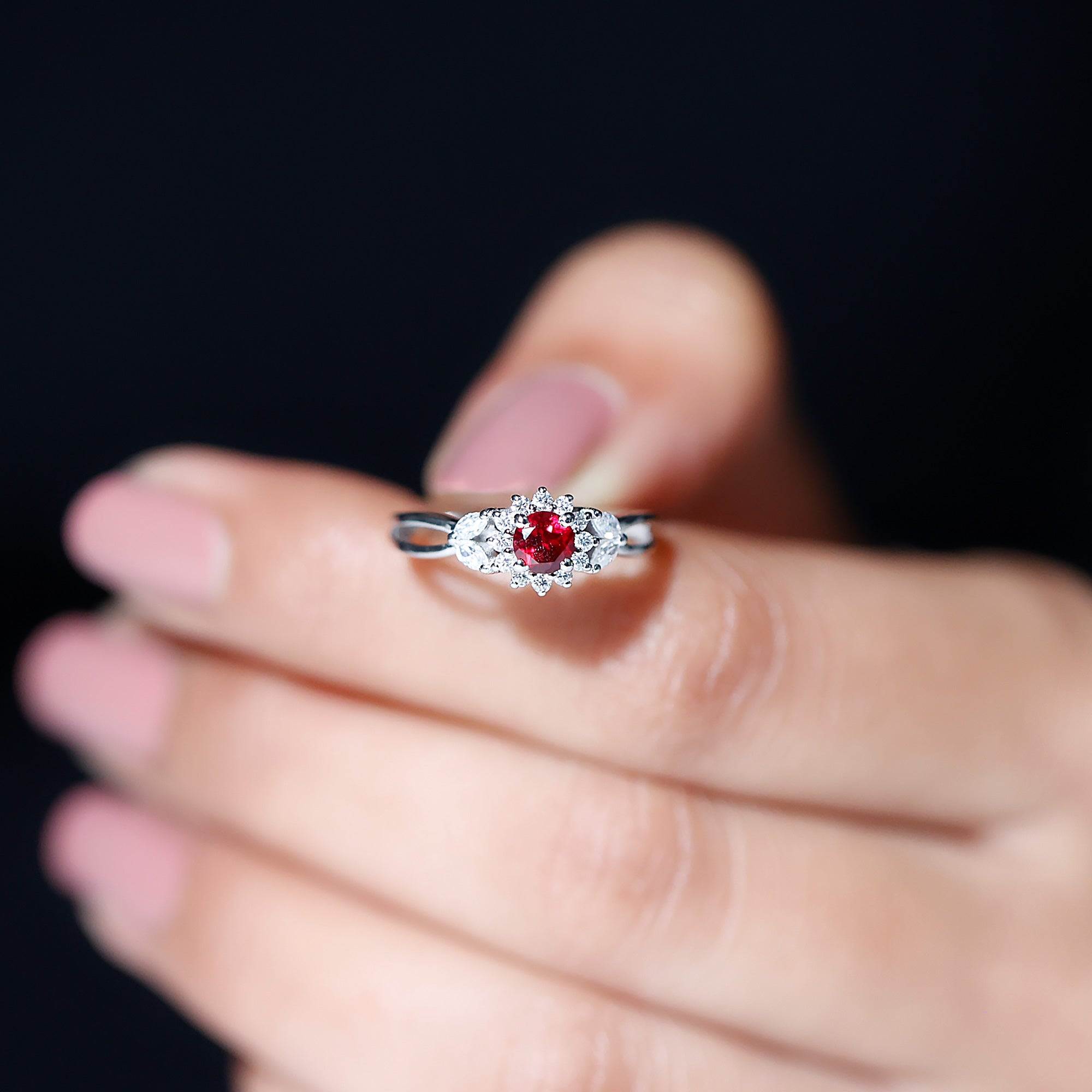 Halo Engagement Rings are beautiful designs for those looking for an affordable alternative to solitaire rings. Small solitaire ruby gemstones are placed between a circle of small gemstones, creating beautiful designs. The side stones may be rubies, diamond accents, or other gemstones, opening design options in artificial ruby rings.