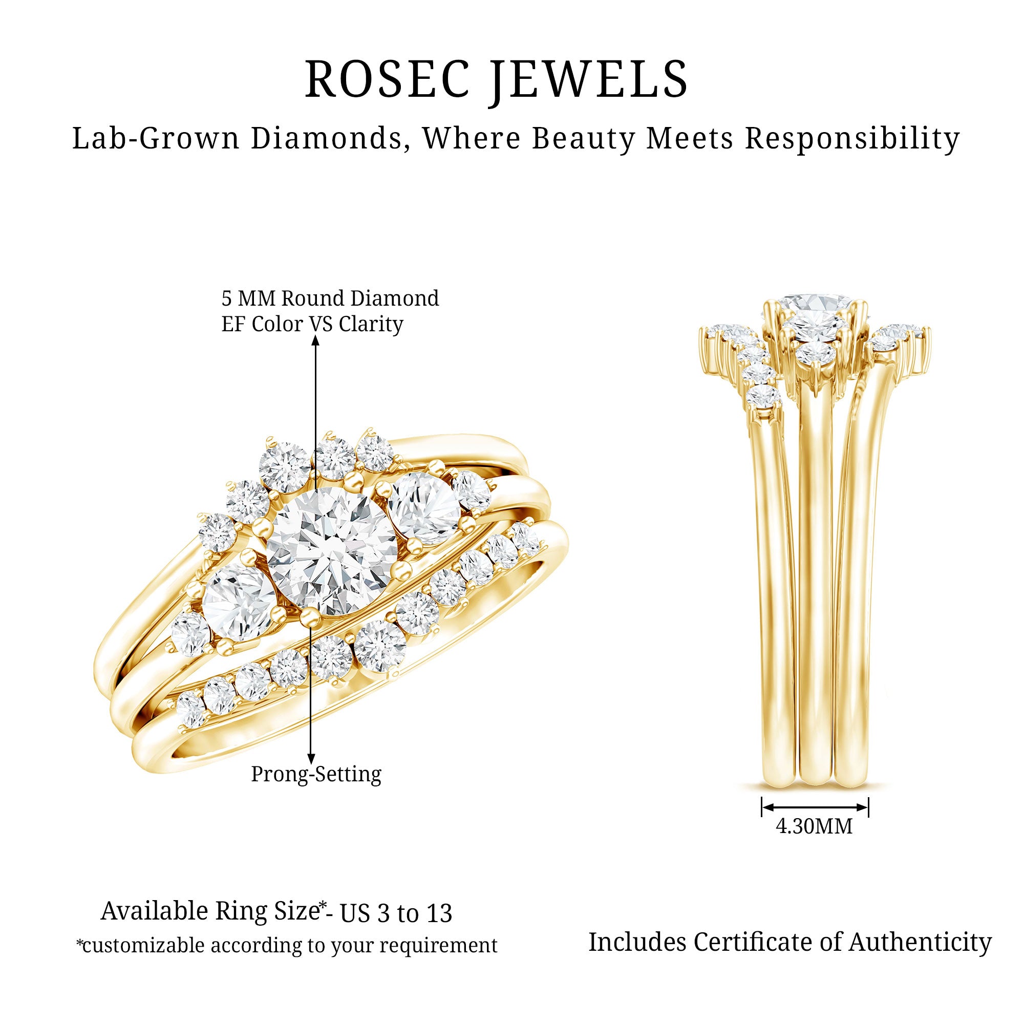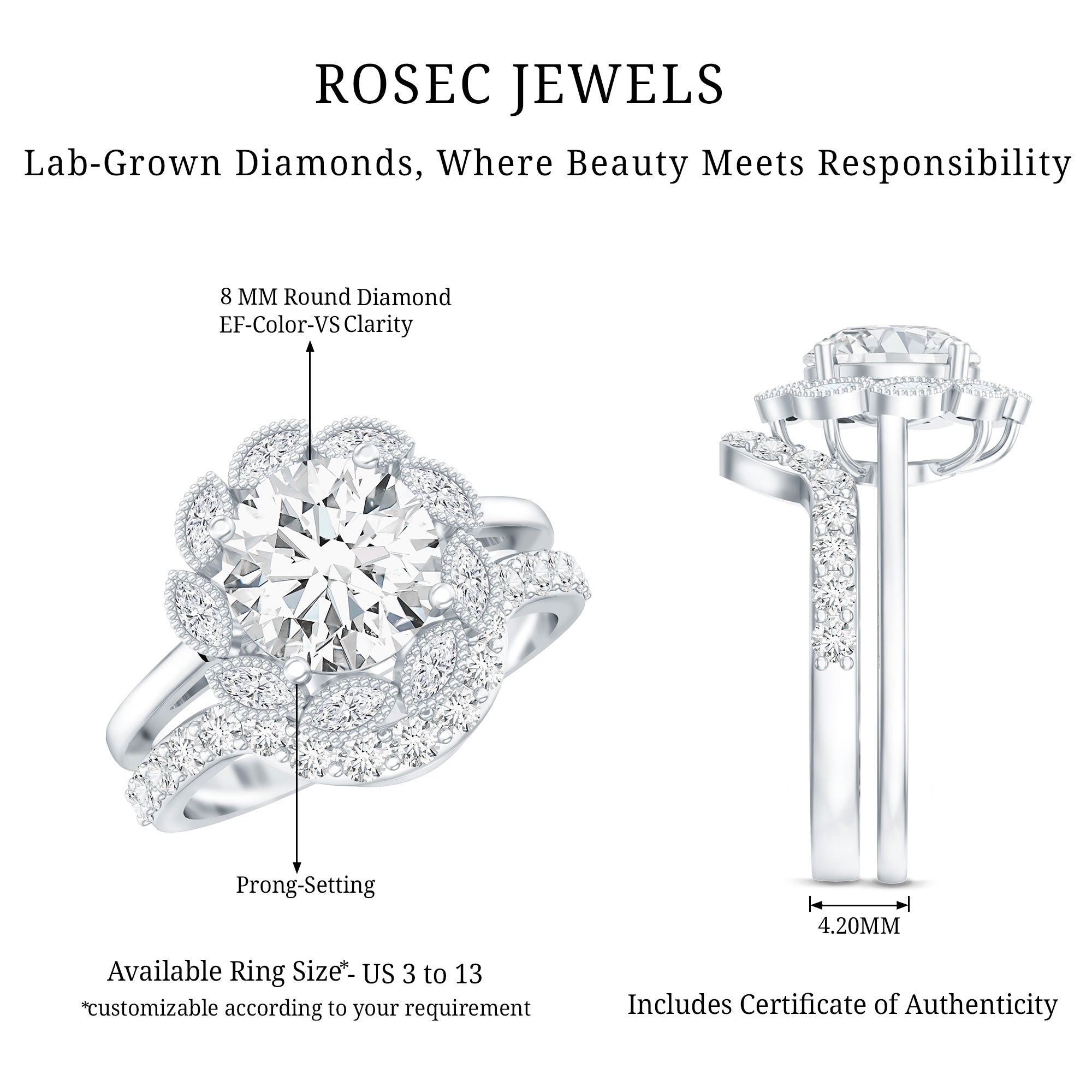 Instantly upgrades the center ring with a framed look. | Match center stone shape/size and the engagement ring profile. |